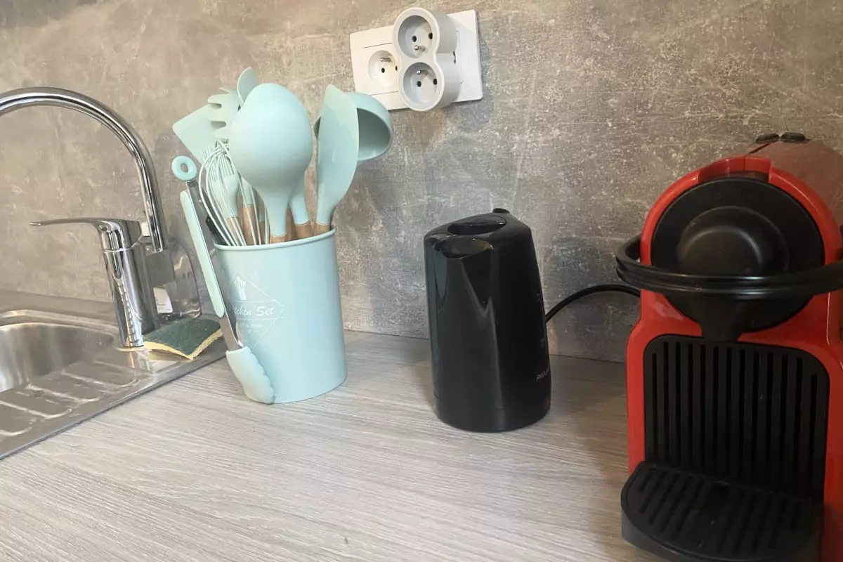 L’appartement se compose d’une pièce à vivre, d'un coin cuisine (four micro-onde, cafetière Nespresso, bouilloire, plaques, petit réfrigérateur, éléments de base ). Et pour vous relaxer, profitez d'un canapé. Retrouvez une salle de douche avec des WC.