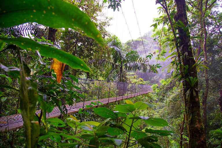 Après un petit-déjeuner nourrissant à l'hôtel, vous partez faire une randonnée dans la réserve de la forêt de nuages de Monteverde. Fondée en 1972, celle-ci est célèbre dans le monde entier pour sa biodiversité exceptionnelle, ses actions et contributions en matière de conservation, ainsi que pour ses recherches scientifiques. La réserve abrite 2,5% de la biodiversité mondiale et constitue l'une des réserves privées les plus importantes, non seulement au Costa Rica, mais dans le monde entier. Elle abrite des centaines d'espèces de mammifères, d'oiseaux, de papillons, d'amphibiens, de reptiles, d'insectes et d'arachnides, ainsi qu'une grande variété de flore, comme les mousses, les lianes ou les arbres autochtones de la forêt nuageuse.