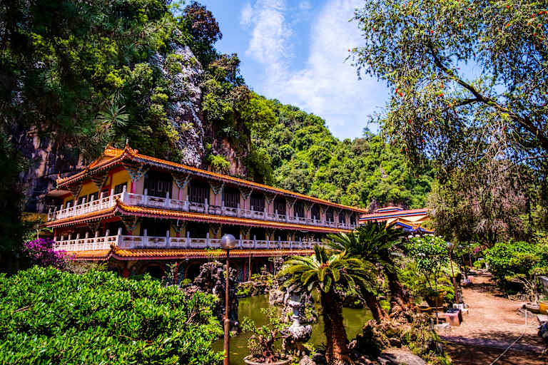 Arrivée à Ipoh et visite des temples troglodytes Sam Poh Tong et Kek Lok Tong, nichés dans les collines calcaires.