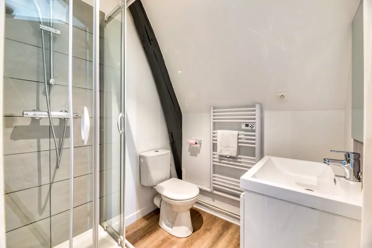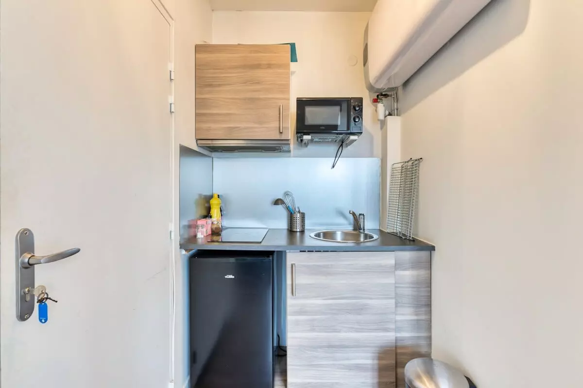 Salle de douche : meuble lavabo, porte-serviette, douche et WC. Cuisine aménagée et équipée : petit réfrigérateur, micro-ondes-grill, deux plaques vitrocéramiques, bouilloire et nécessaire de cuisine. Coin salon : table basse relevable et transformable en table haute. Chambre séparée : lit double (140x200) et commode pour vos vêtements. Le logement est équipé de la fibre optique et d’une smart TV, offrant un accès facile à vos applications préférées (Canal+, Netflix, Deezer, YouTube, etc.). Pour les séjours moyens et longs, l’immeuble met à votre disposition une machine à laver et un sèche-linge gratuitement, ainsi qu’une table et un fer à repasser sur simple demande.