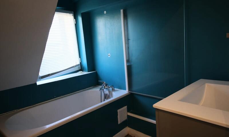 Vous trouverez également une salle de bain avec une baignoire, un lavabo, un miroir, un lave-linge et WC.