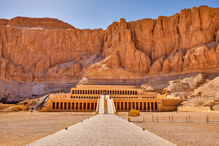 Vous serez ébahi par l'immense complexe de Deir el-Bahari qui inclut Le Temple de la reine Hateshpsout unique en Egypte, car il est en partie creusé dans le roc et s’élève sur trois terrasses reliées par des rampes centrales. un édifice unique situé dans le creux de la montagne.