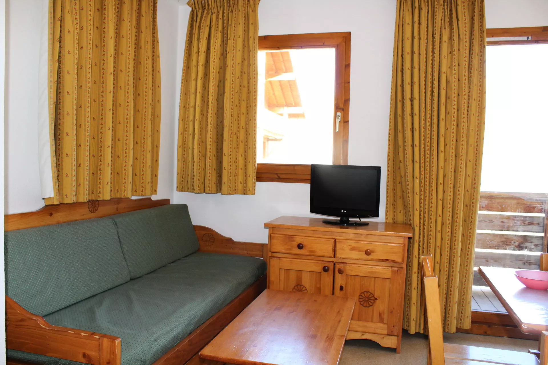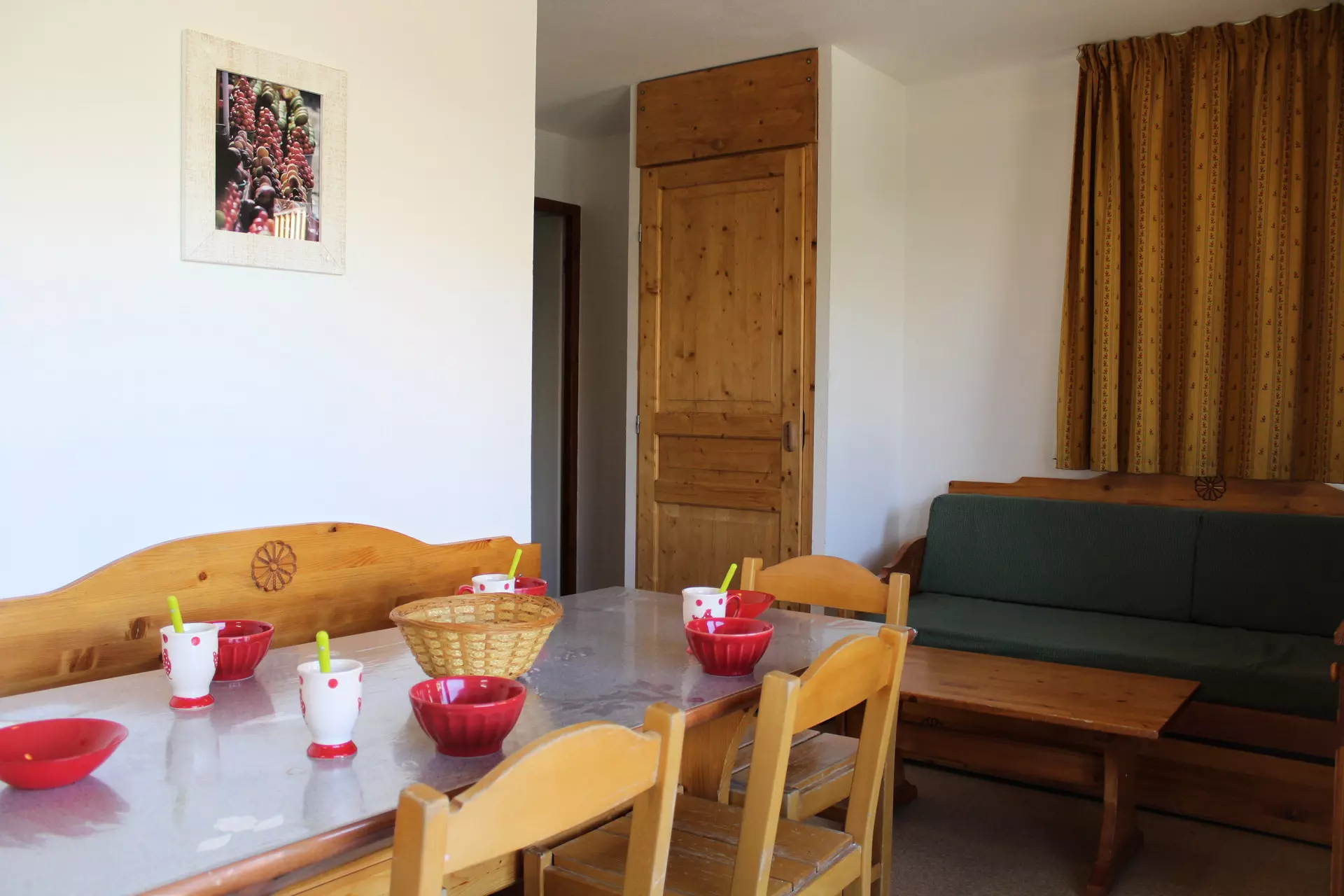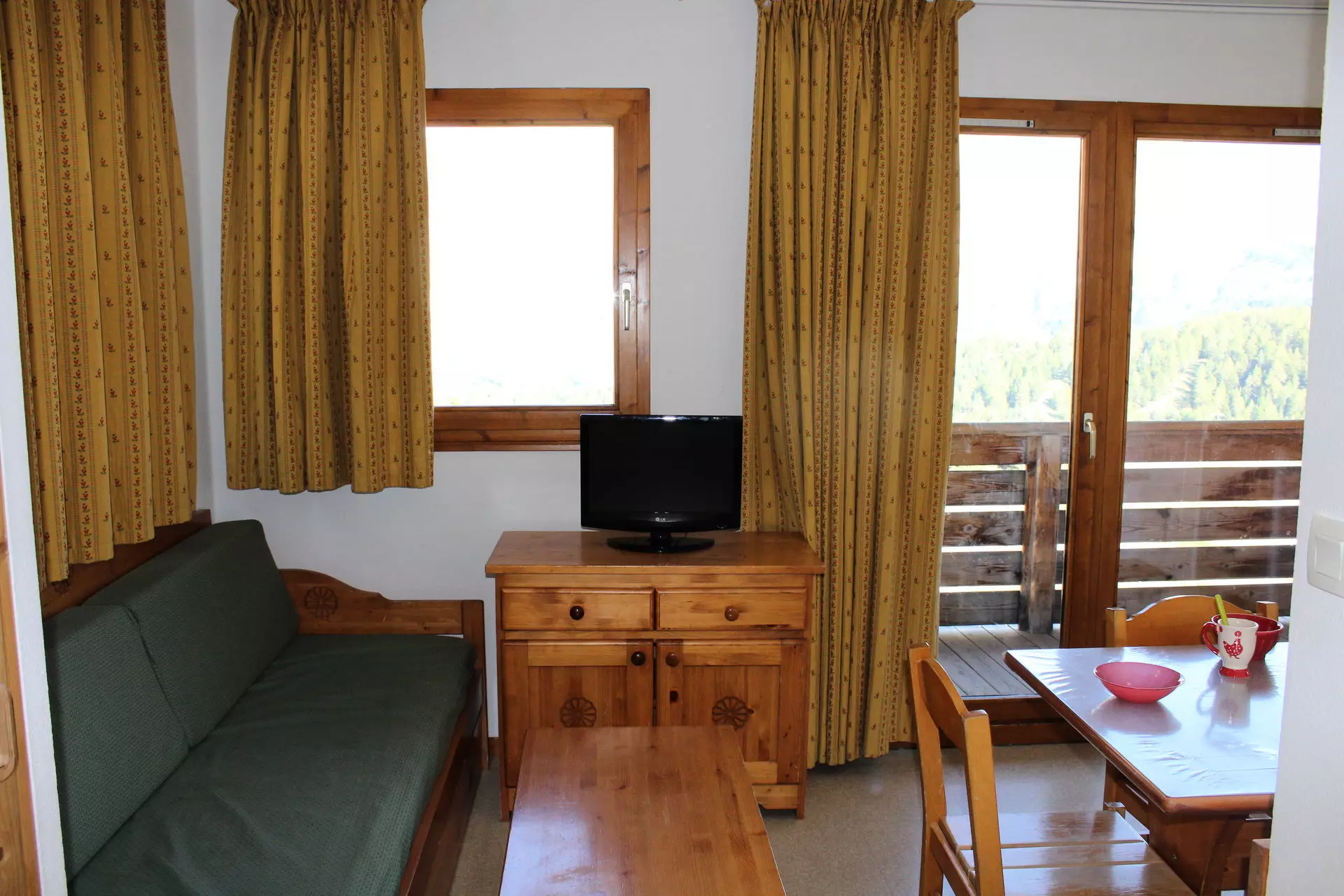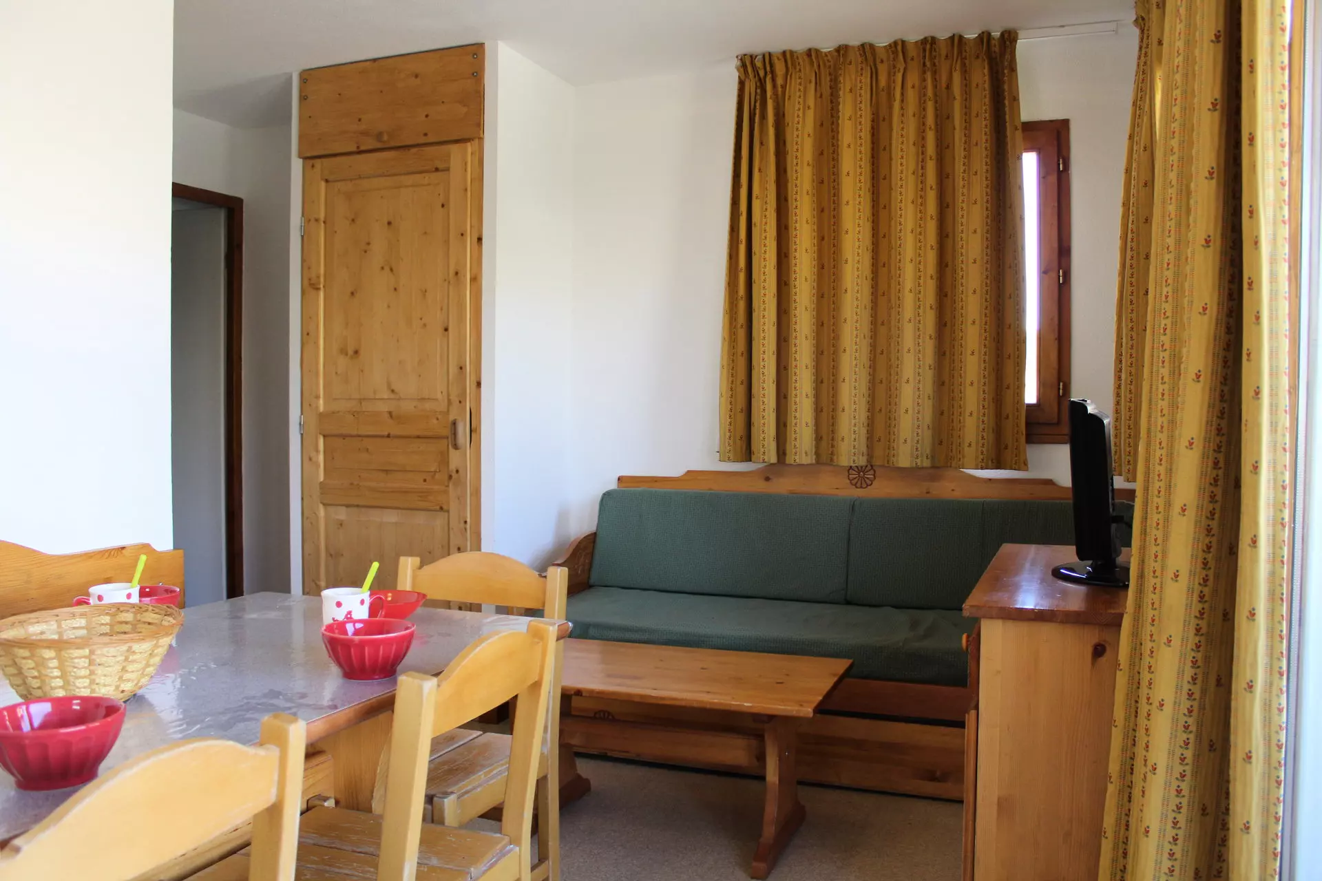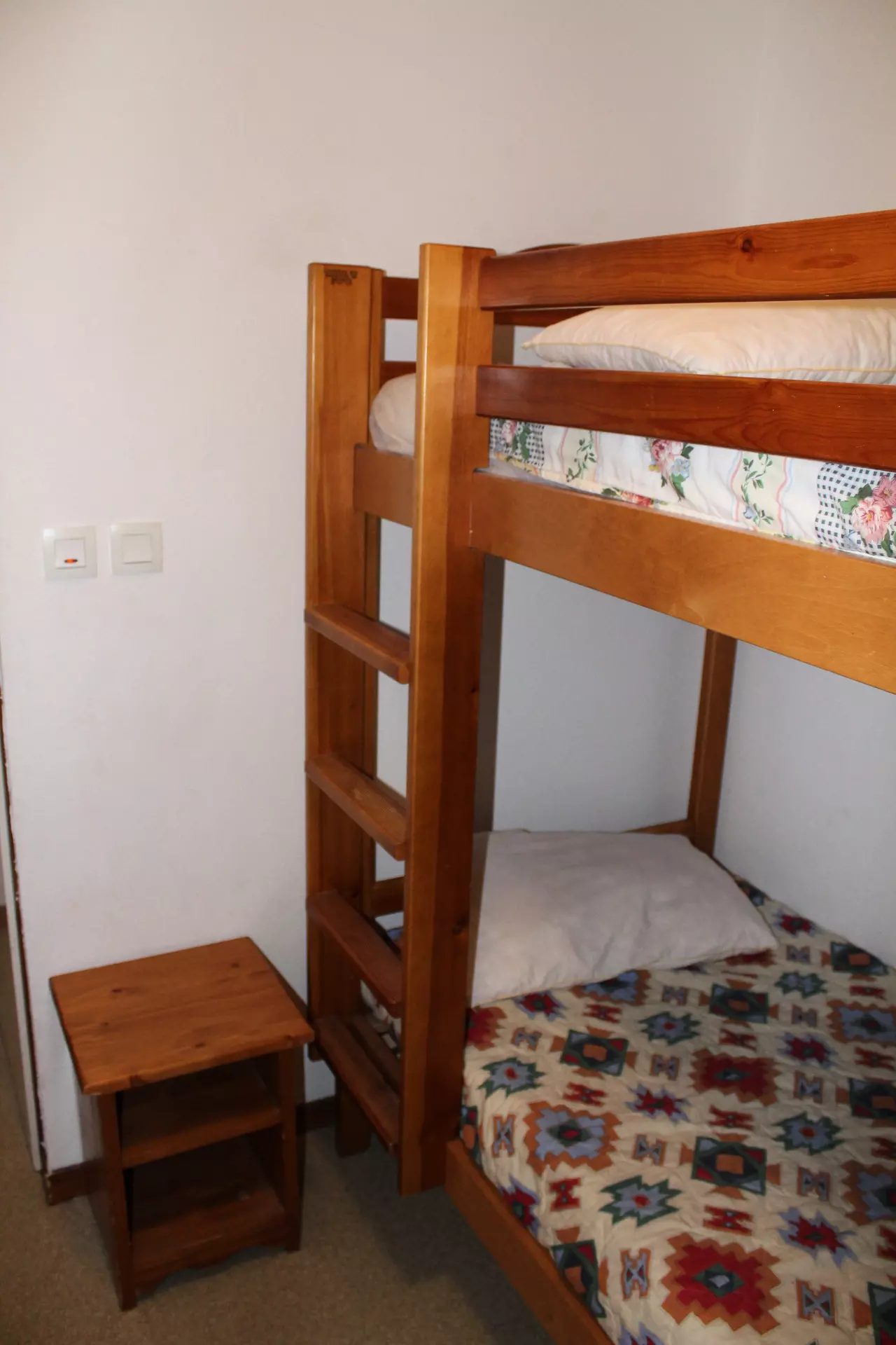 Séjour avec 1 lit gigogne 2 couchages, 1 chambre avec lit deux personnes. Coin montagne avec lit superposé.