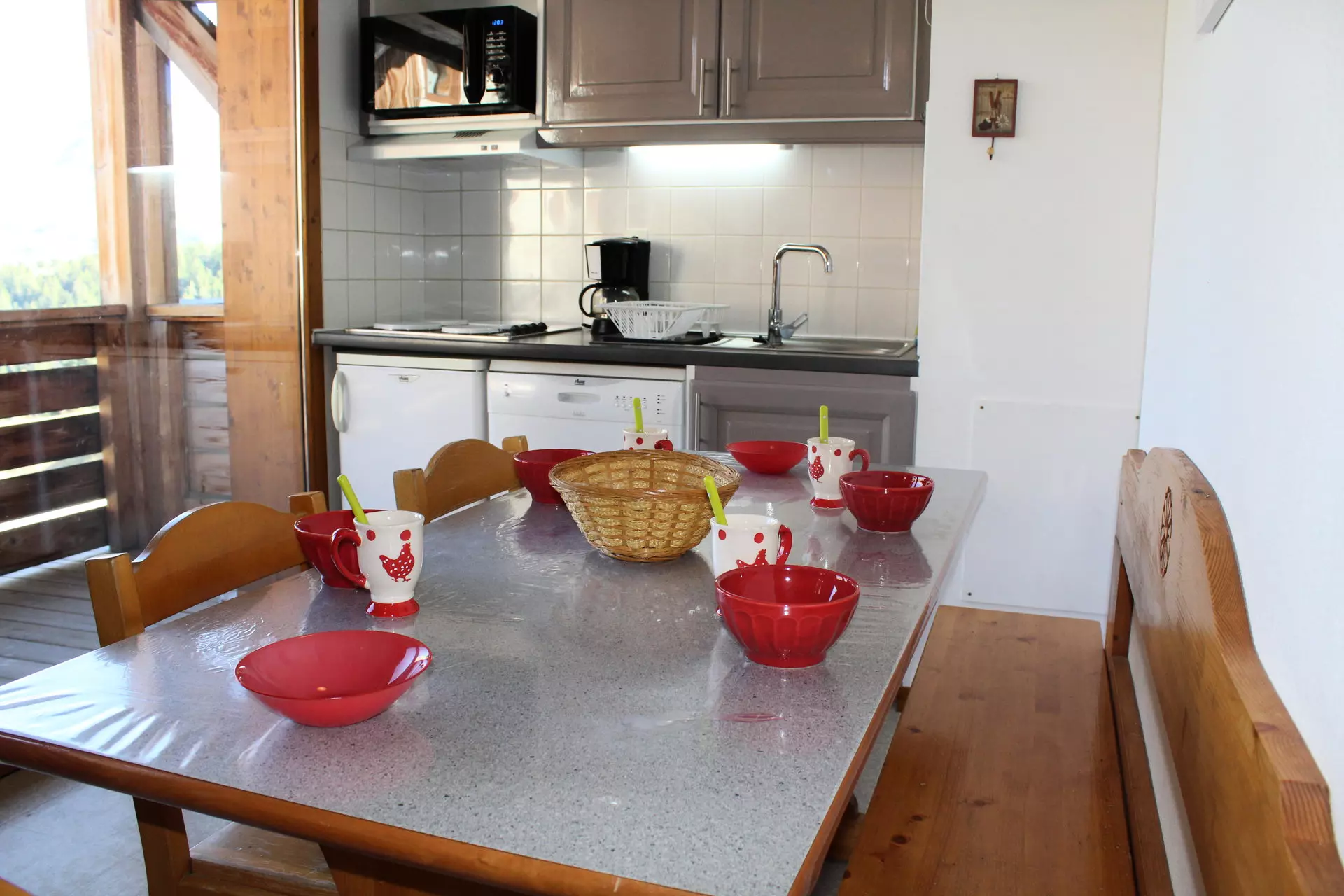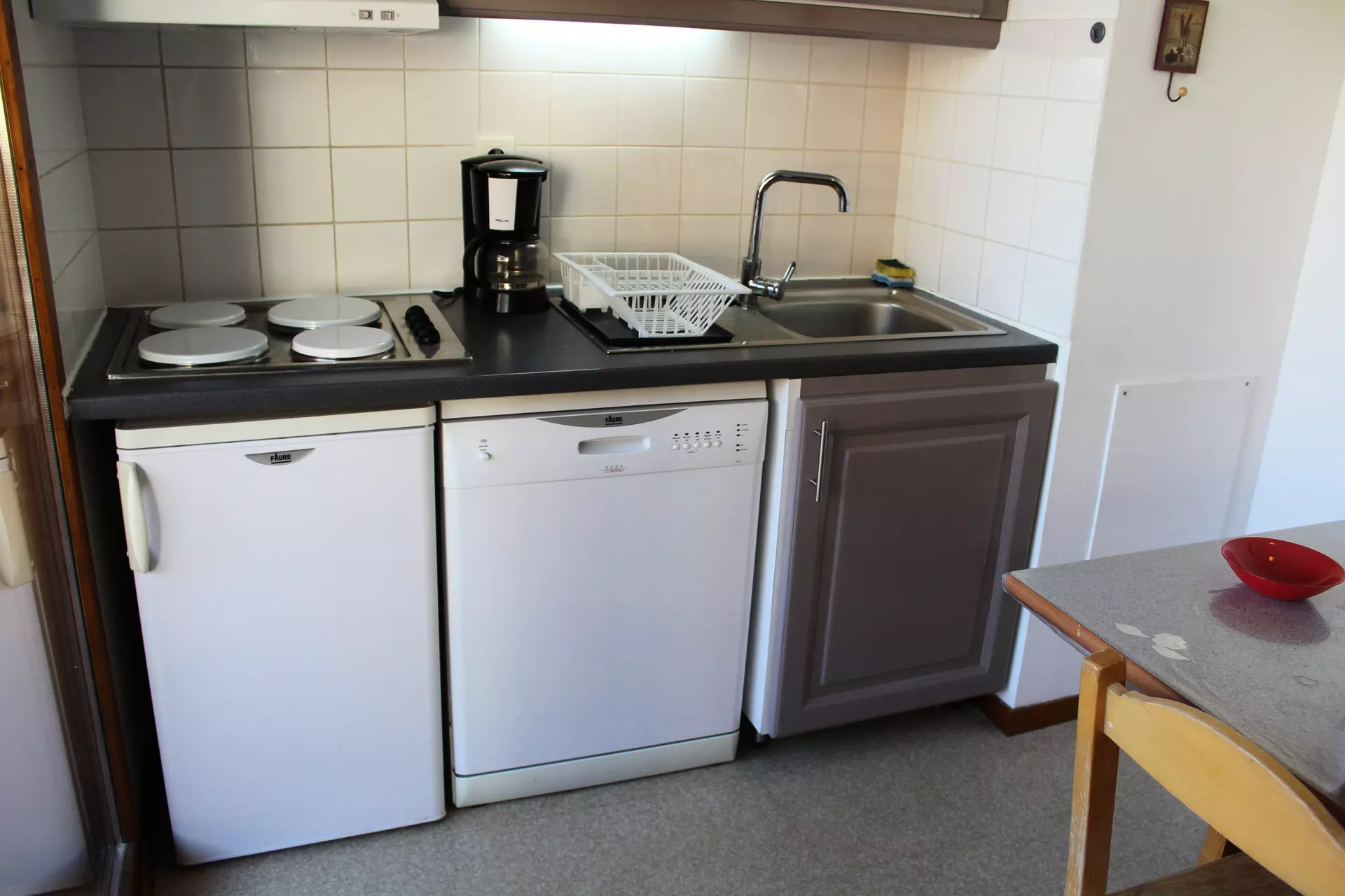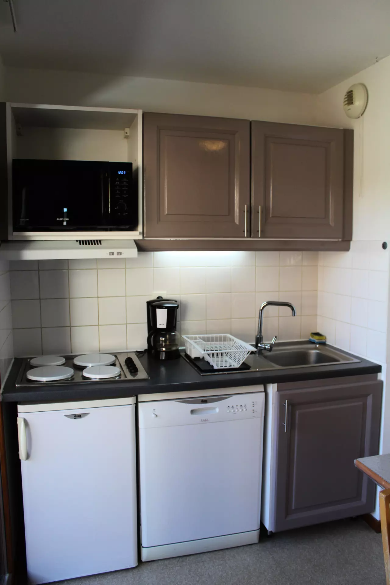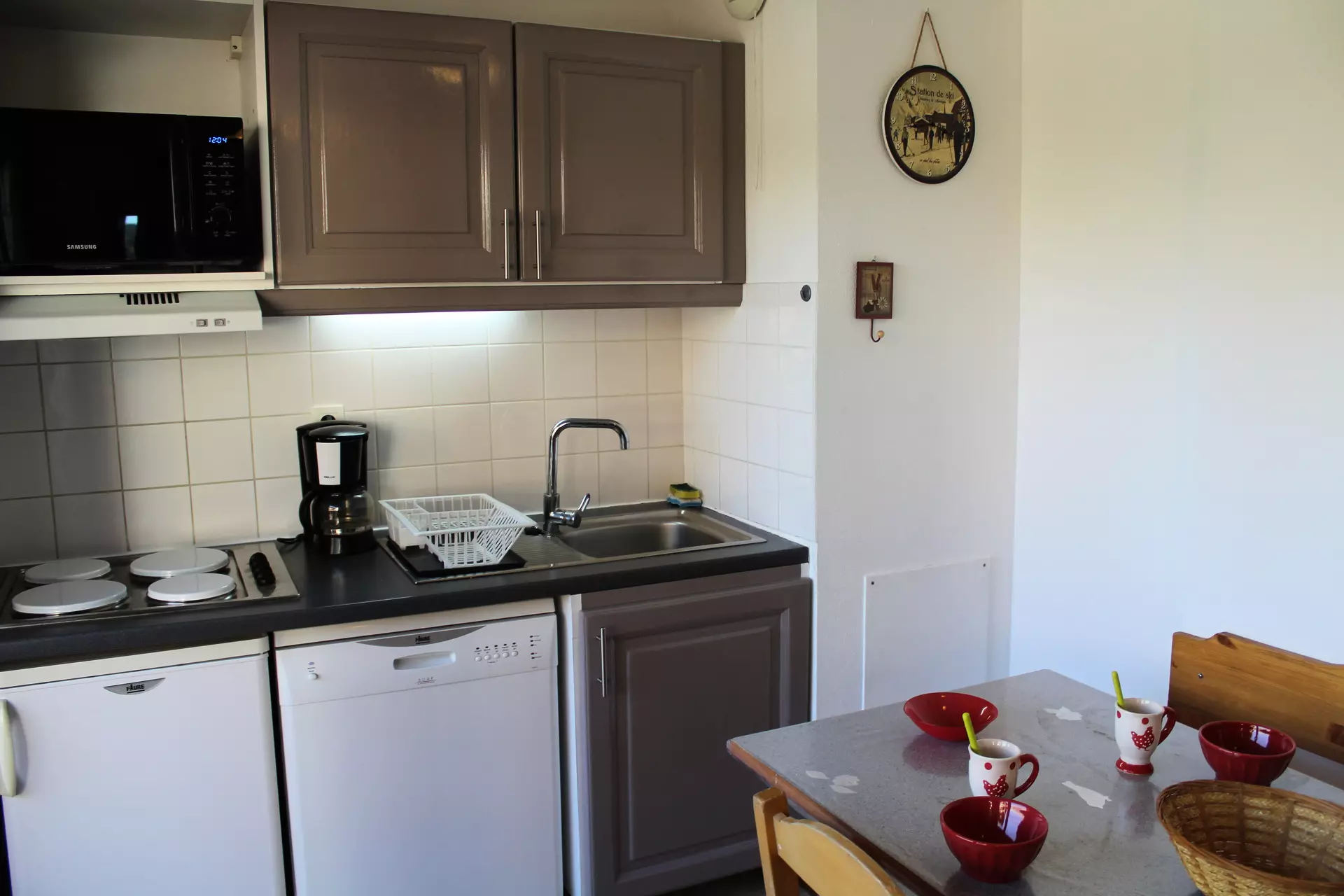Kitchenette équipée, lave vaisselle,micro ondes, cafetière filtre, micro-ondes, bouilloire électrique, grille-pain.