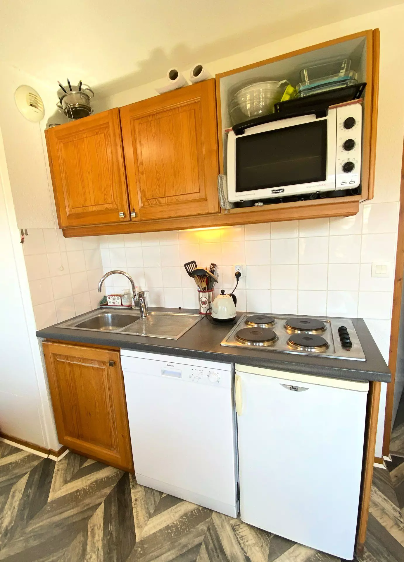 Kitchenette entièrement équipée. Lave vaisselle, mini four, cafetière filtre, grille-pain, bouilloire électrique.