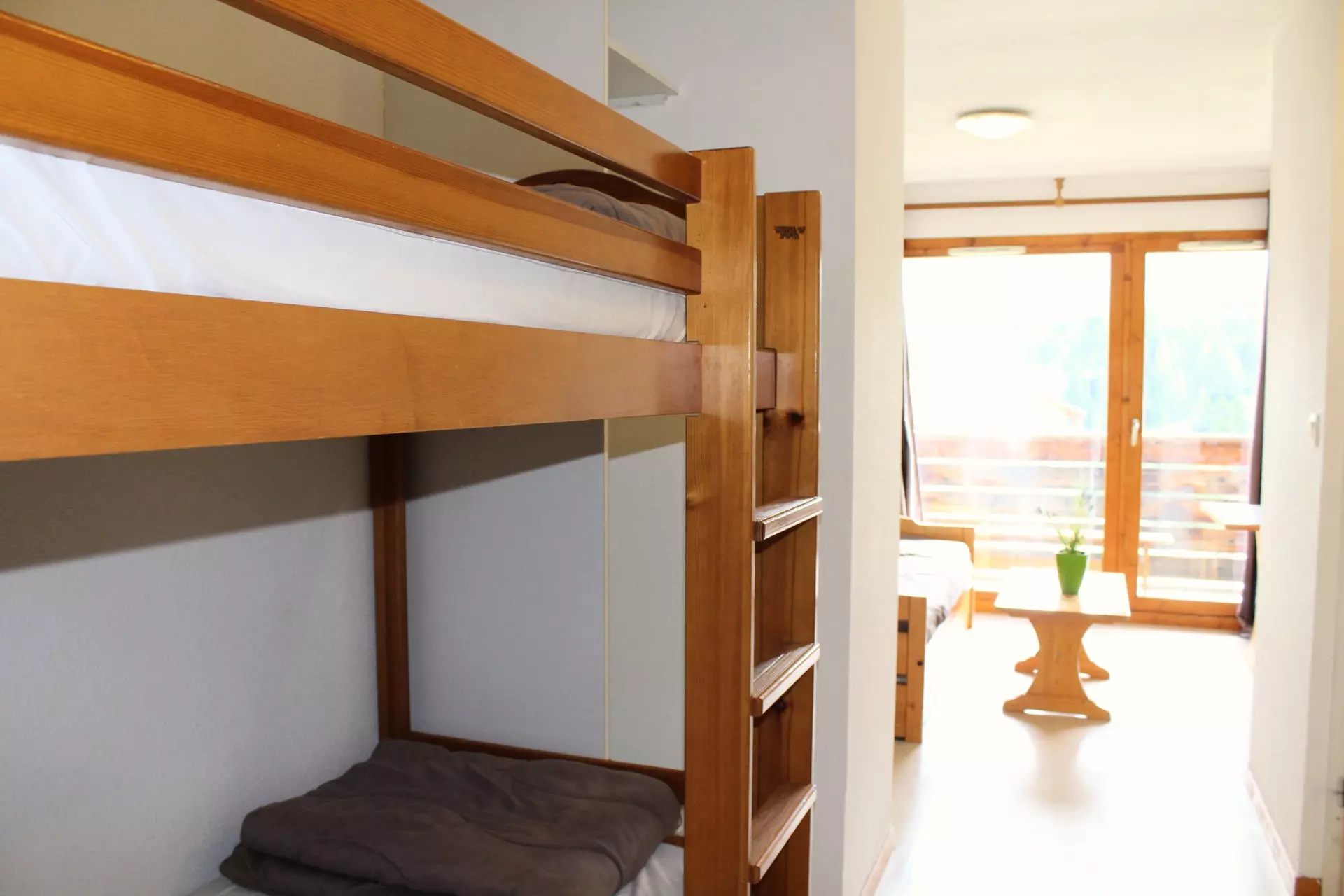 Séjour avec lit gigogne 2 personnes. Coin montagne avec 2 lits superposés. Chambre avec 1 lit deux personnes.