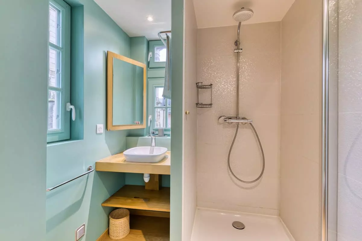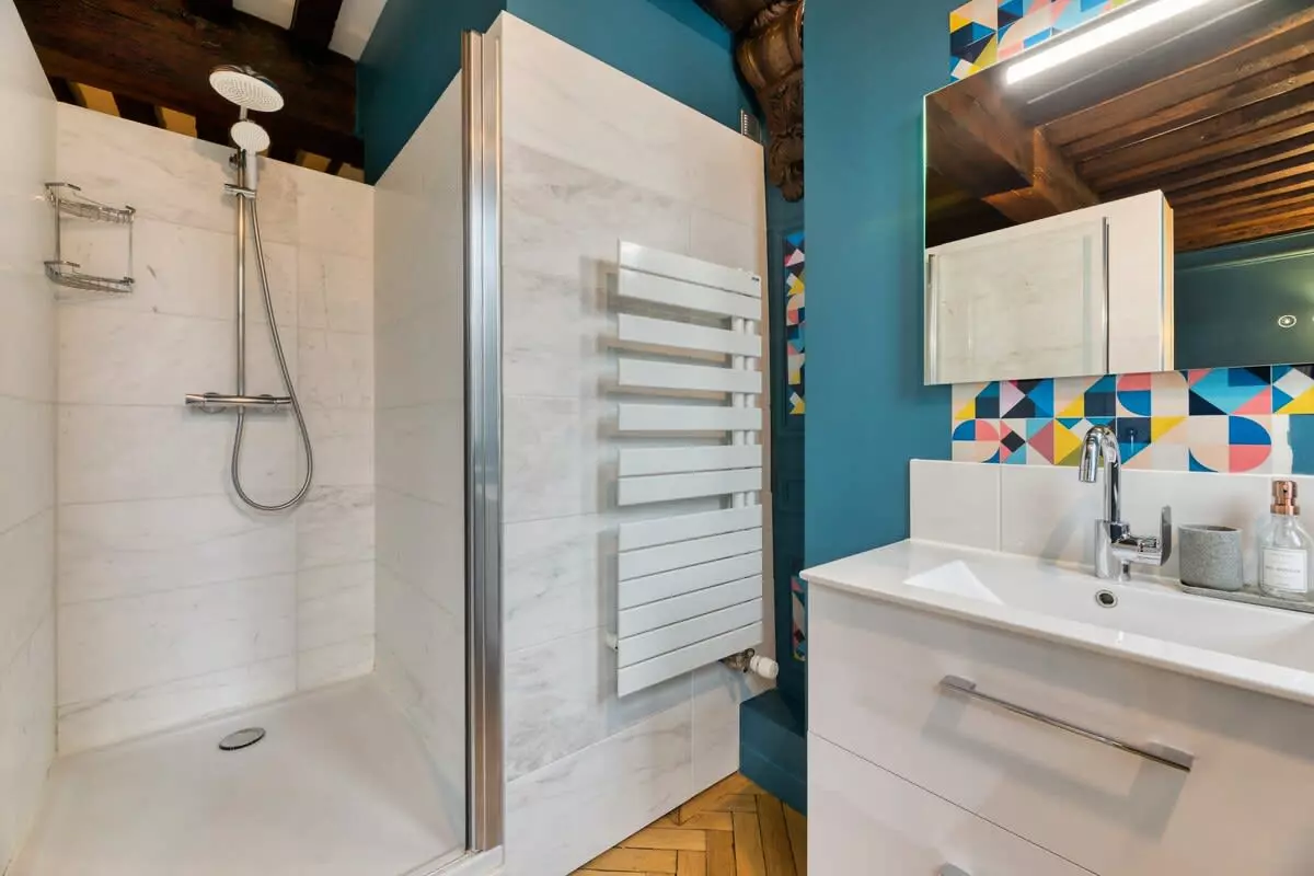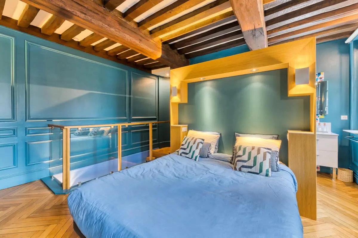 Cet appartement en duplex plein de caractère comprend deux cuisines aménagées et équipées ouverte sur les séjours respectifs, deux salle de douche, trois chambres et WC.