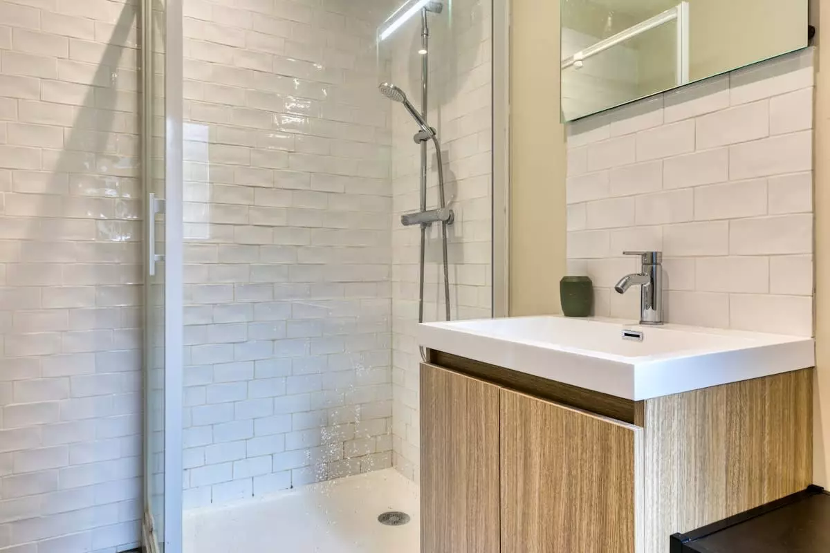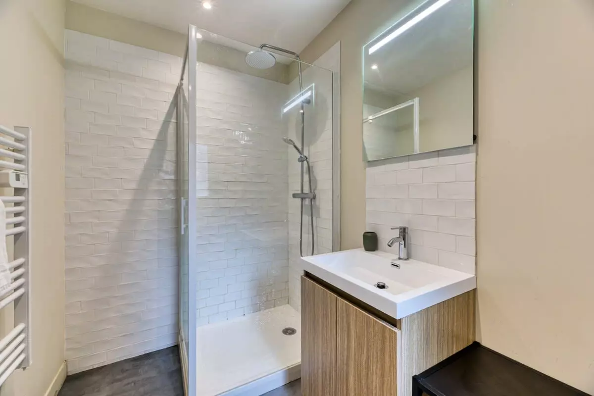 Profitez également d’une salle de douche offrant un meuble lavabo, un porte serviette, un sèche-cheveux, fer à repasser, et une douche.