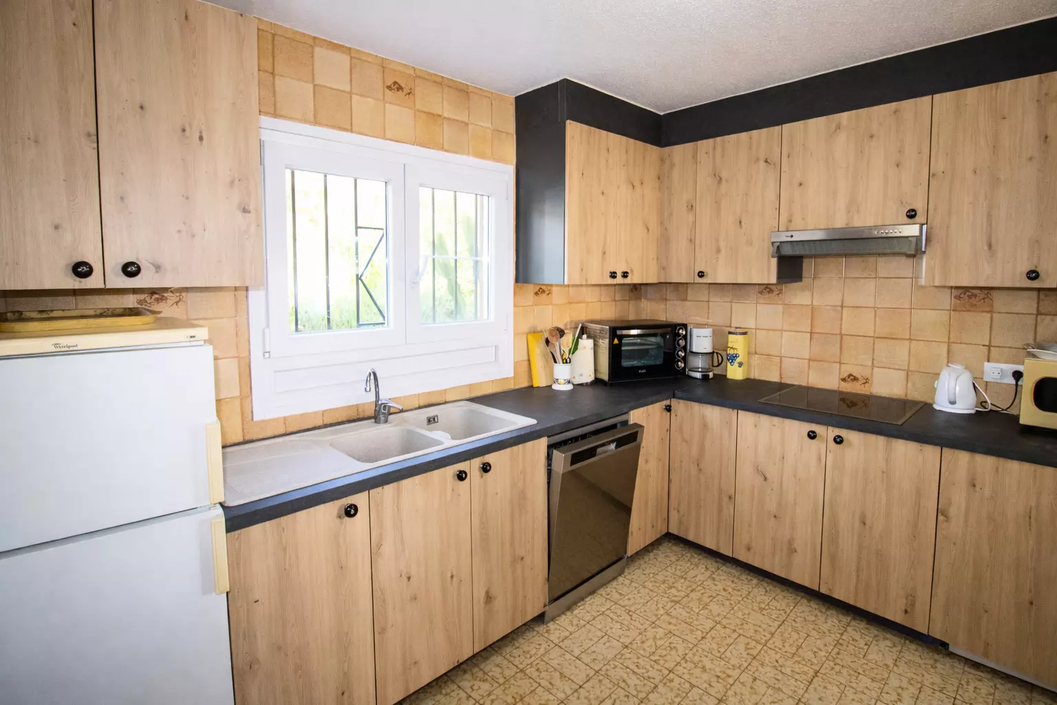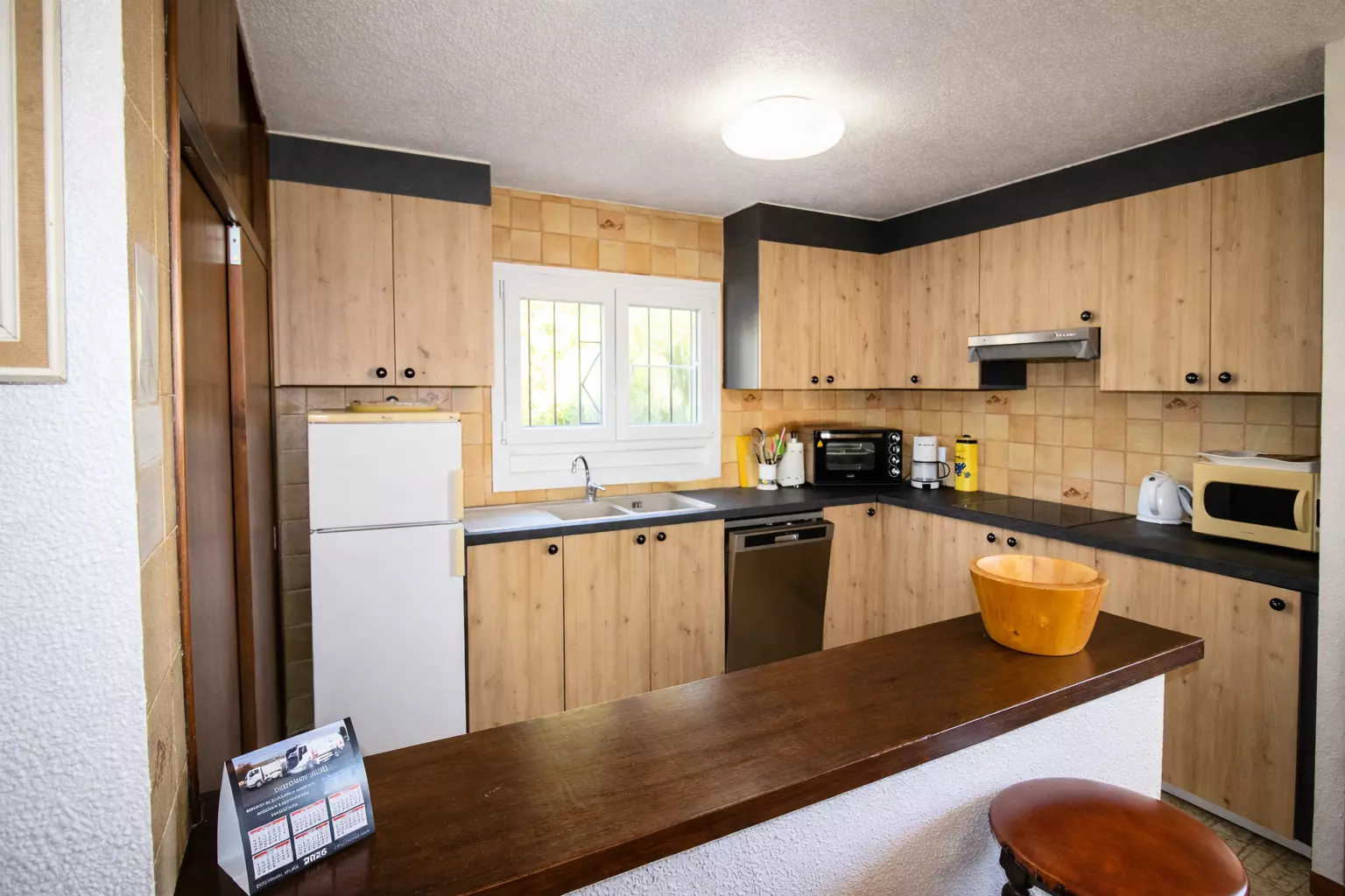 La cuisine américaine, à vitrocéramique, est équipée avec réfrigérateur, micro-ondes, four, congélateur, lave-vaisselle, vaisselle/couverts, ustensiles/cuisine, cafetière et grille pain.