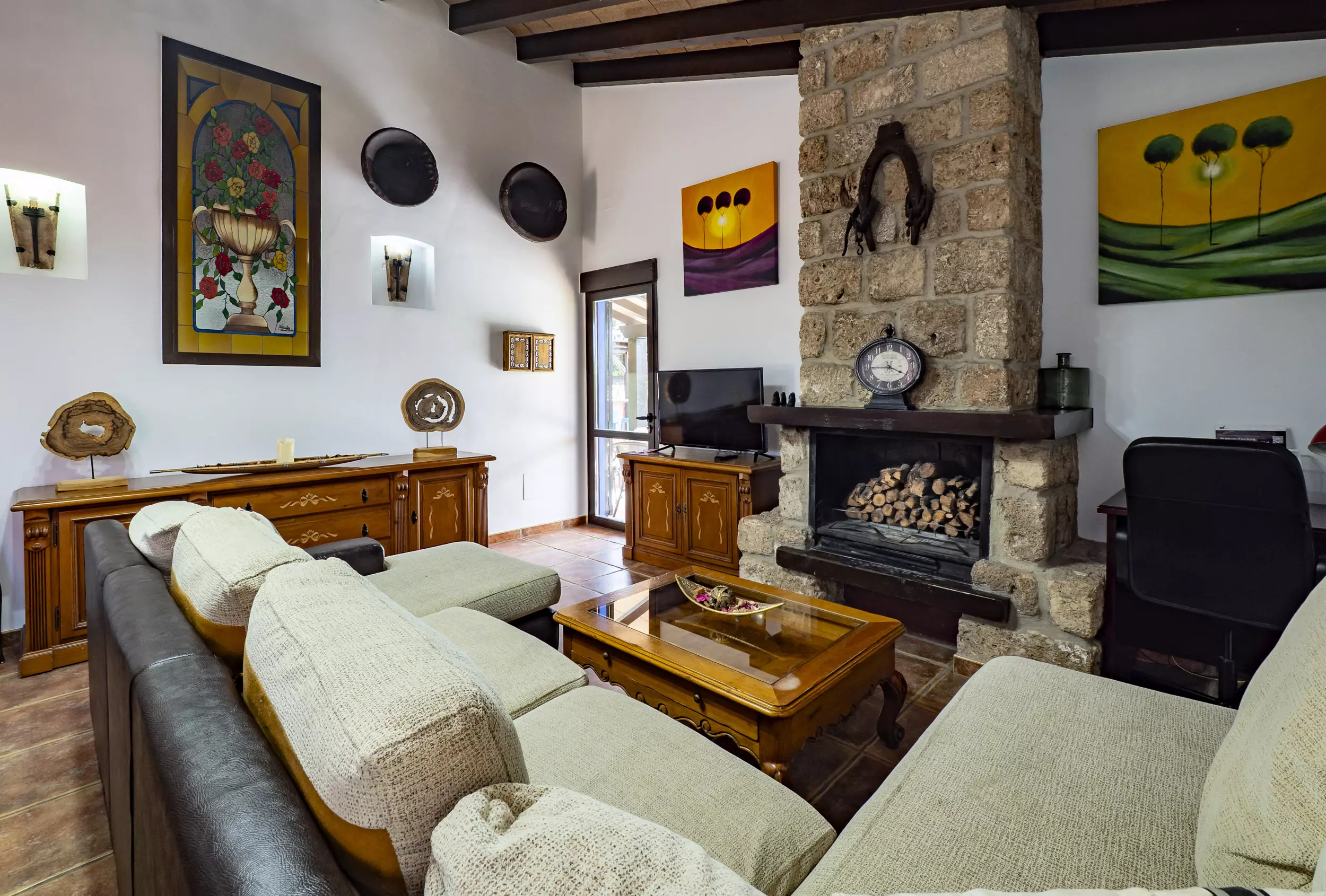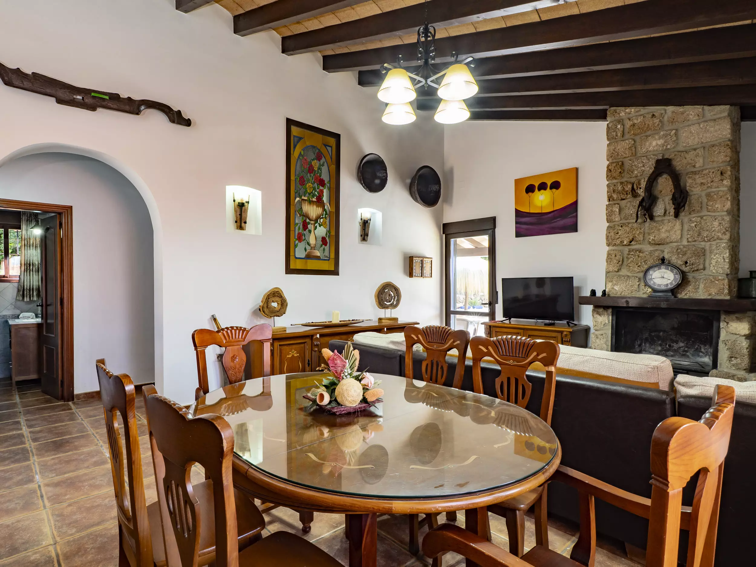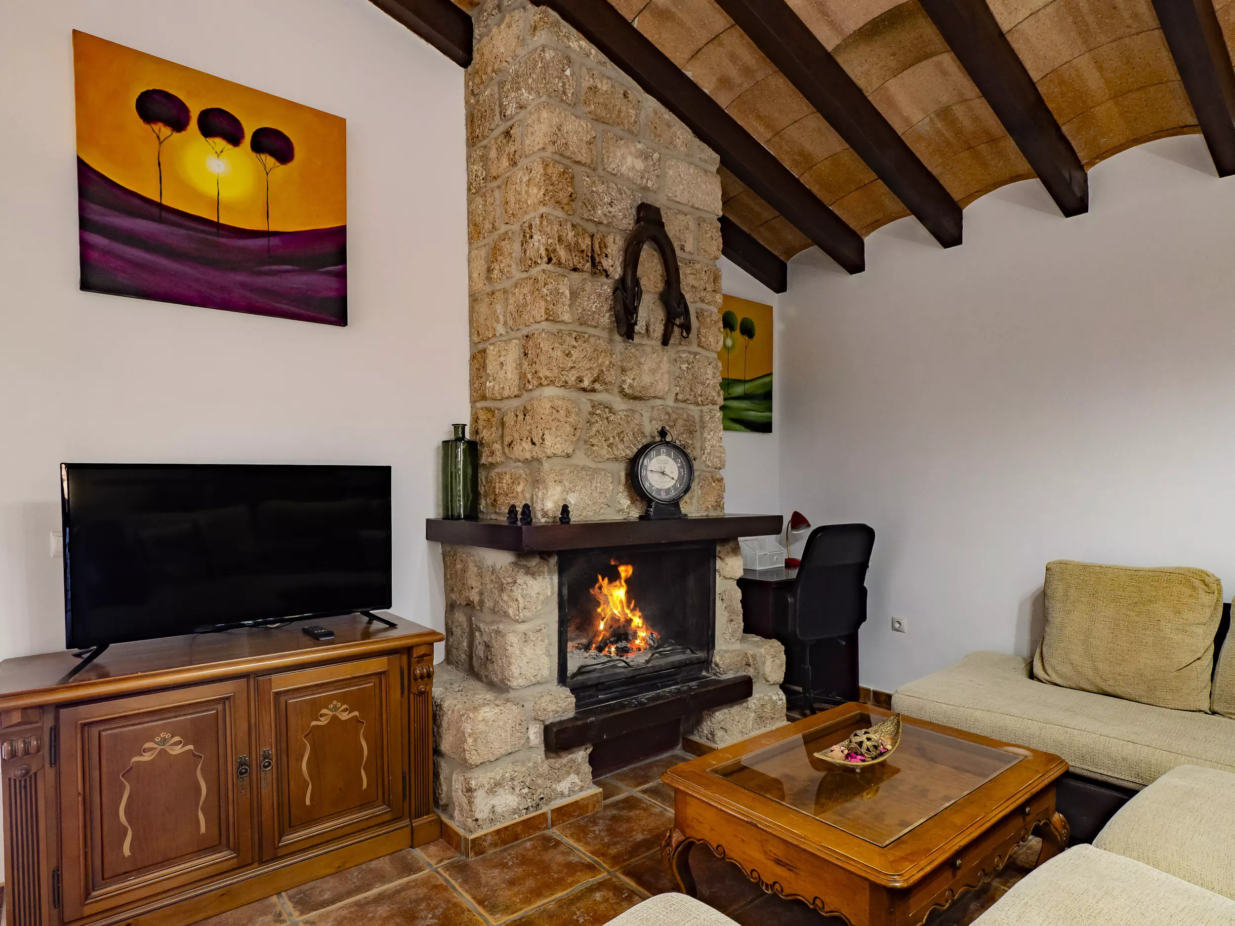 L'intérieur de la maison, avec 120 m², combine design moderne et confort. Elle dispose de trois chambres ? deux avec des lits doubles et une avec deux lits individuels ? et deux salles de bains complètes, l'une avec baignoire et l'autre avec douche ??. La cuisine indépendante est équipée d'appareils électroménagers modernes tels que réfrigérateur, four, micro-ondes, lave-vaisselle et plus, facilitant un séjour confortable et pratique. Dans le salon-salle à manger, chaleureux et lumineux, vous trouverez une cheminée, la télévision par satellite avec des chaînes dans plusieurs langues et l'accès à une terrasse couverte avec des canapés et une table extérieure pour profiter de la nature et de la vue sur la montagne ???.