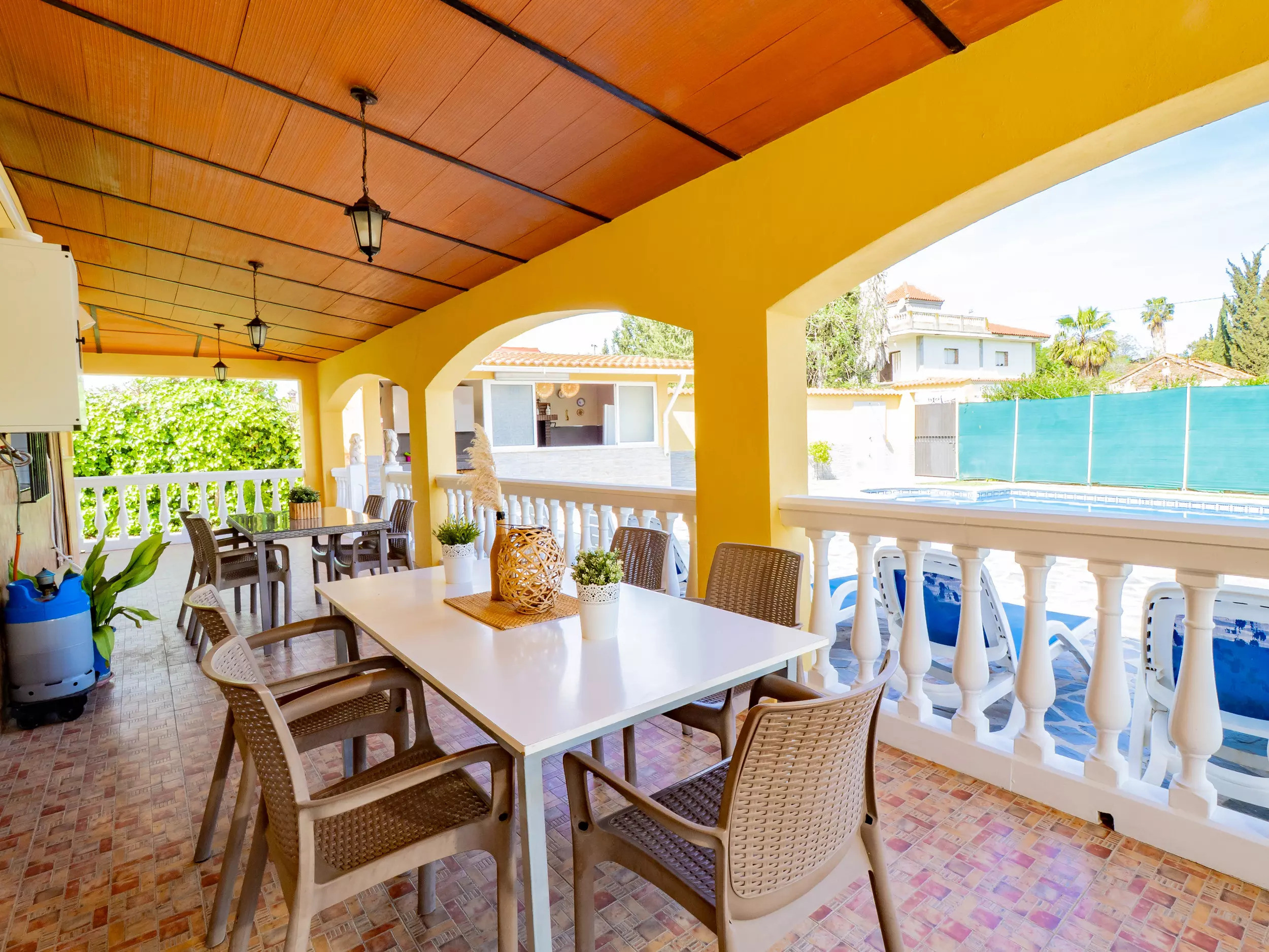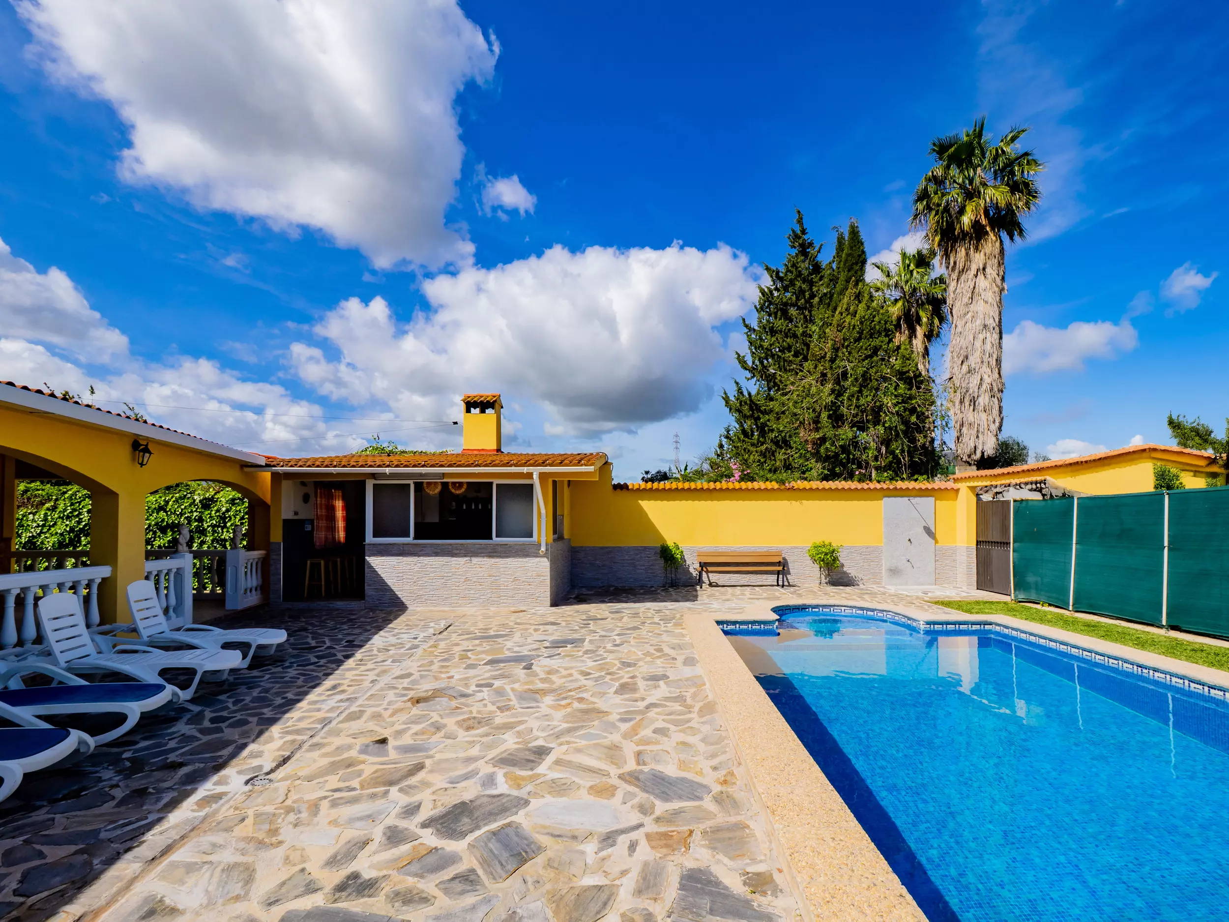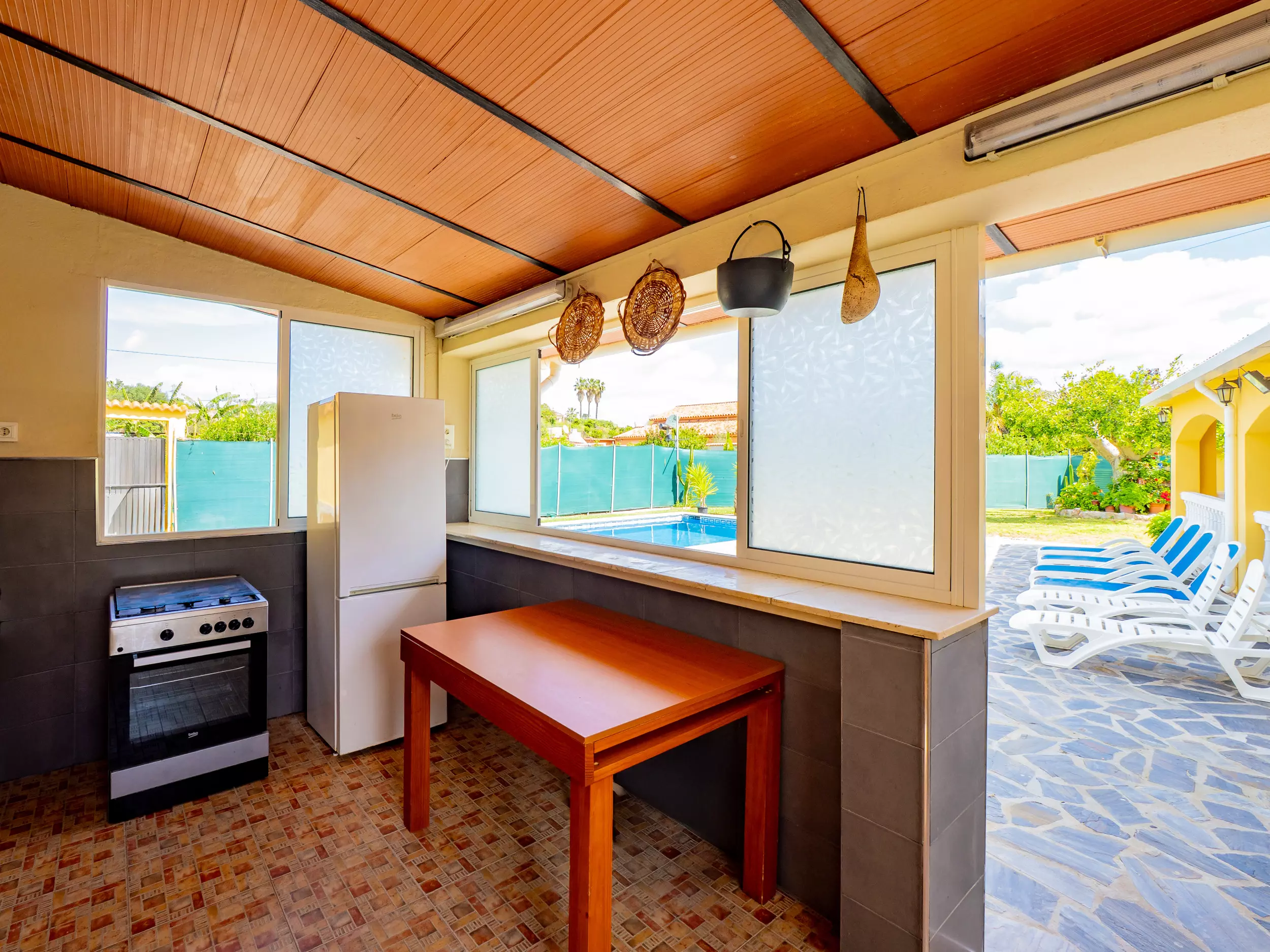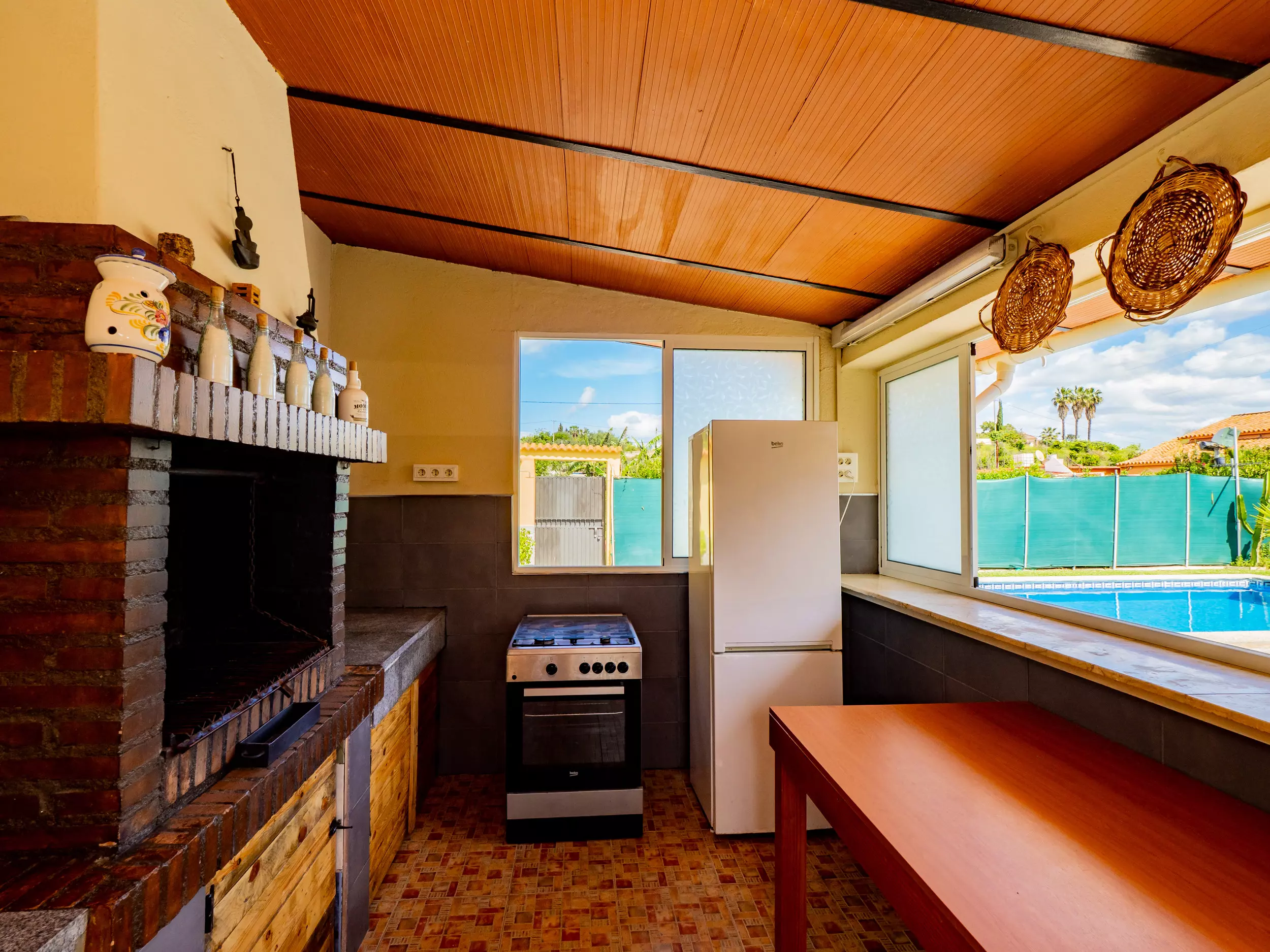 Le salon-salle à manger spacieux se connecte à une cuisine intérieure entièrement équipée, tandis qu'à l'extérieur vous trouverez une cuisine en plein air près du barbecue, parfaite pour des repas en plein air à côté de la piscine privée. La terrasse entoure la maison, offrant un endroit idéal pour les petits-déjeuners ou pour surveiller les enfants pendant qu'ils s'amusent dans la piscine. L'orientation de la maison assure des zones de soleil et d'ombre toute la journée, parfaite pour toutes les saisons.