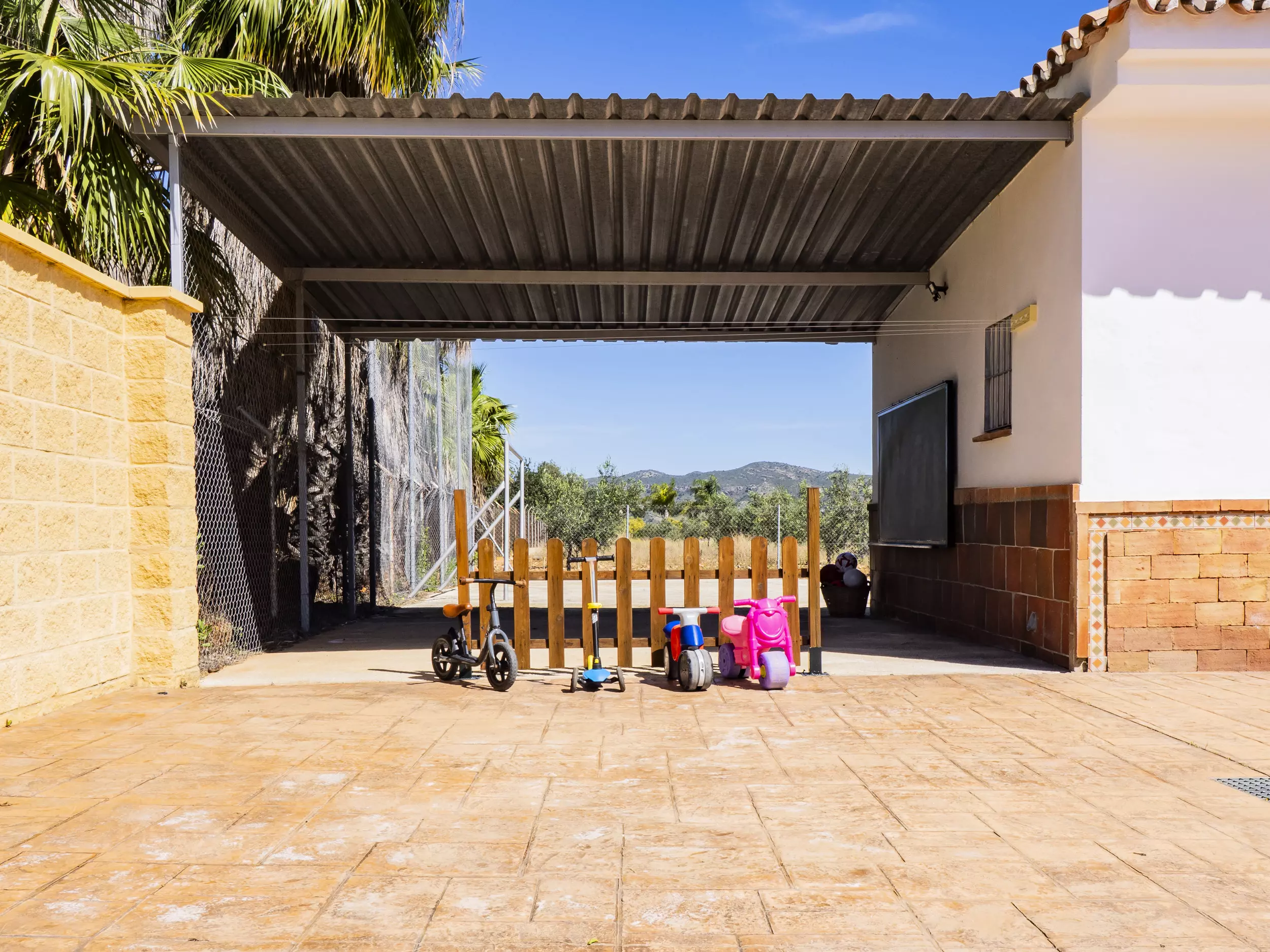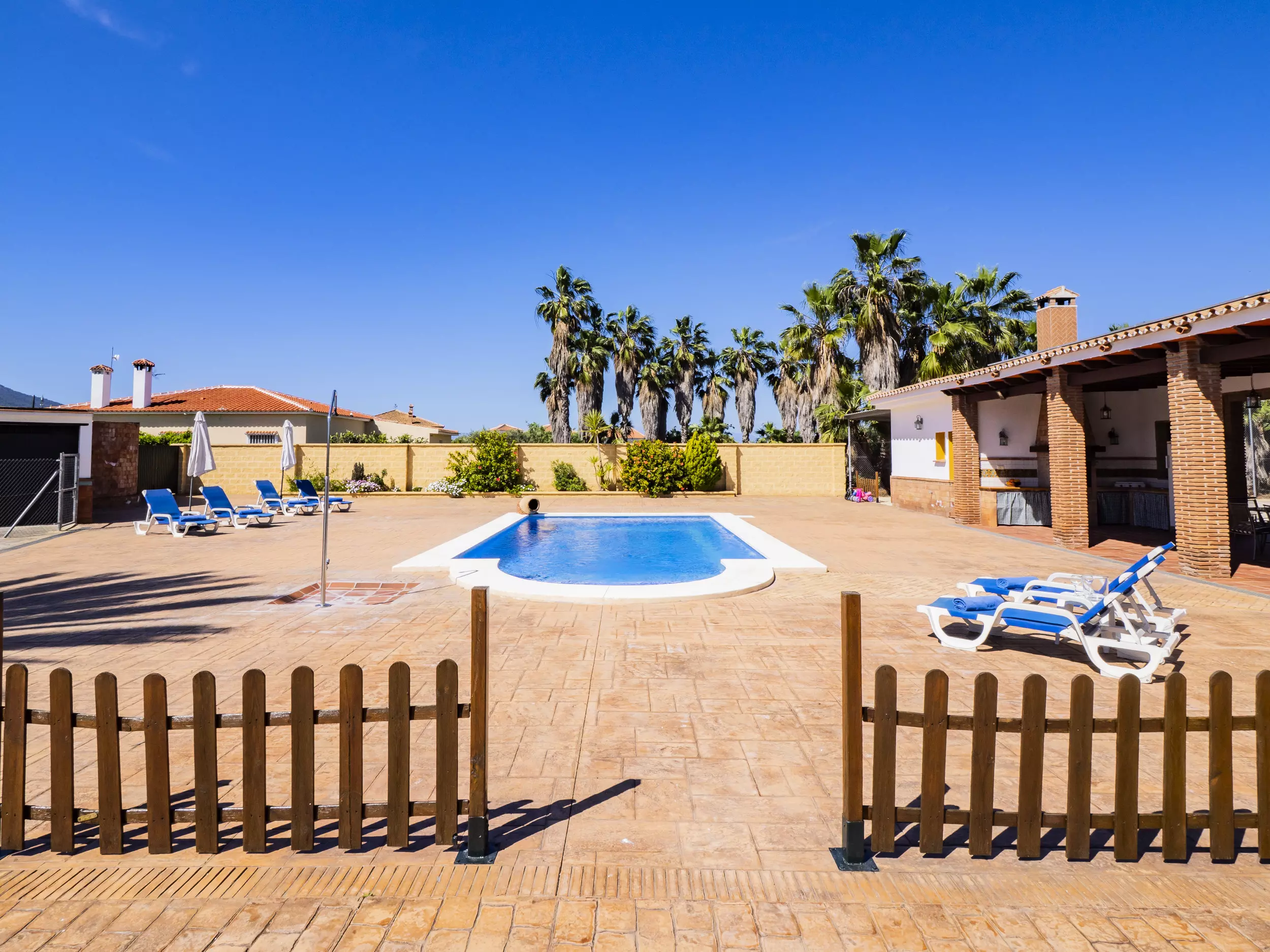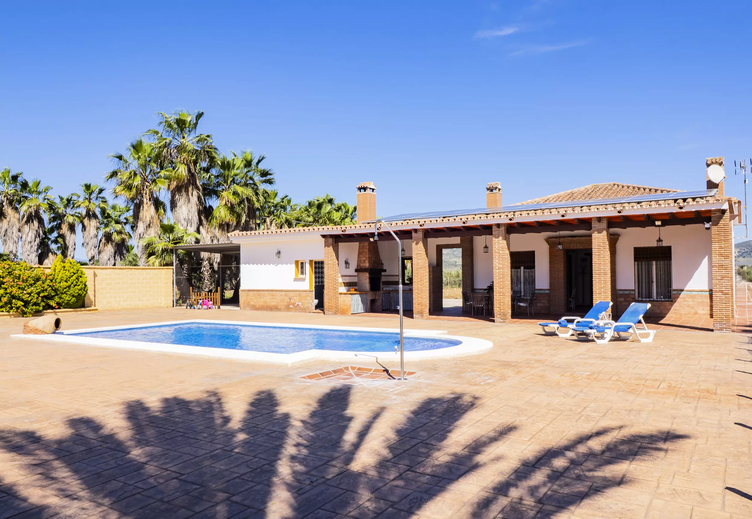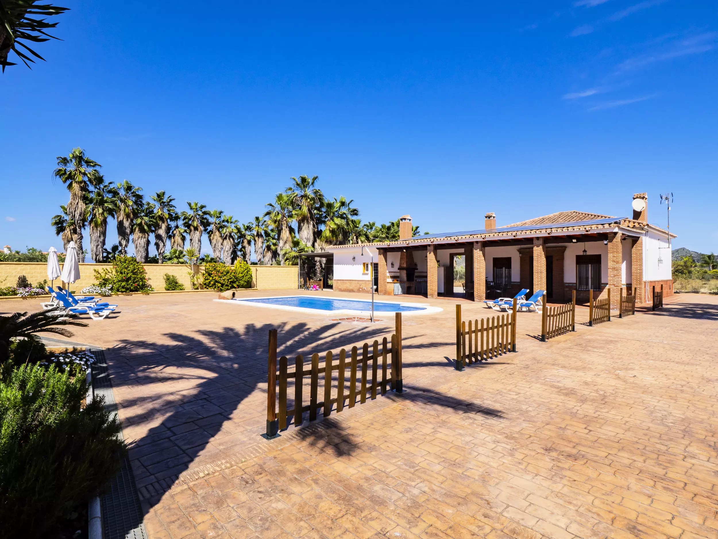 La propriété dispose d'une piscine privée entourée de chaises longues et de parasols pour se rafraîchir lors des journées ensoleillées ?. De plus, elle comprend une zone de barbecue équipée de plaques de cuisson et d'un réfrigérateur, idéale pour de délicieux repas en plein air ?. Pour le repos et la déconnexion, le jardin et la terrasse sont des espaces parfaits, tandis que le terrain de football et les jeux garantissent du divertissement pour les grands et les petits ?. Pour plus de commodité, le logement offre un parking couvert pour trois voitures et une entrée privée avec portail automatique ?.