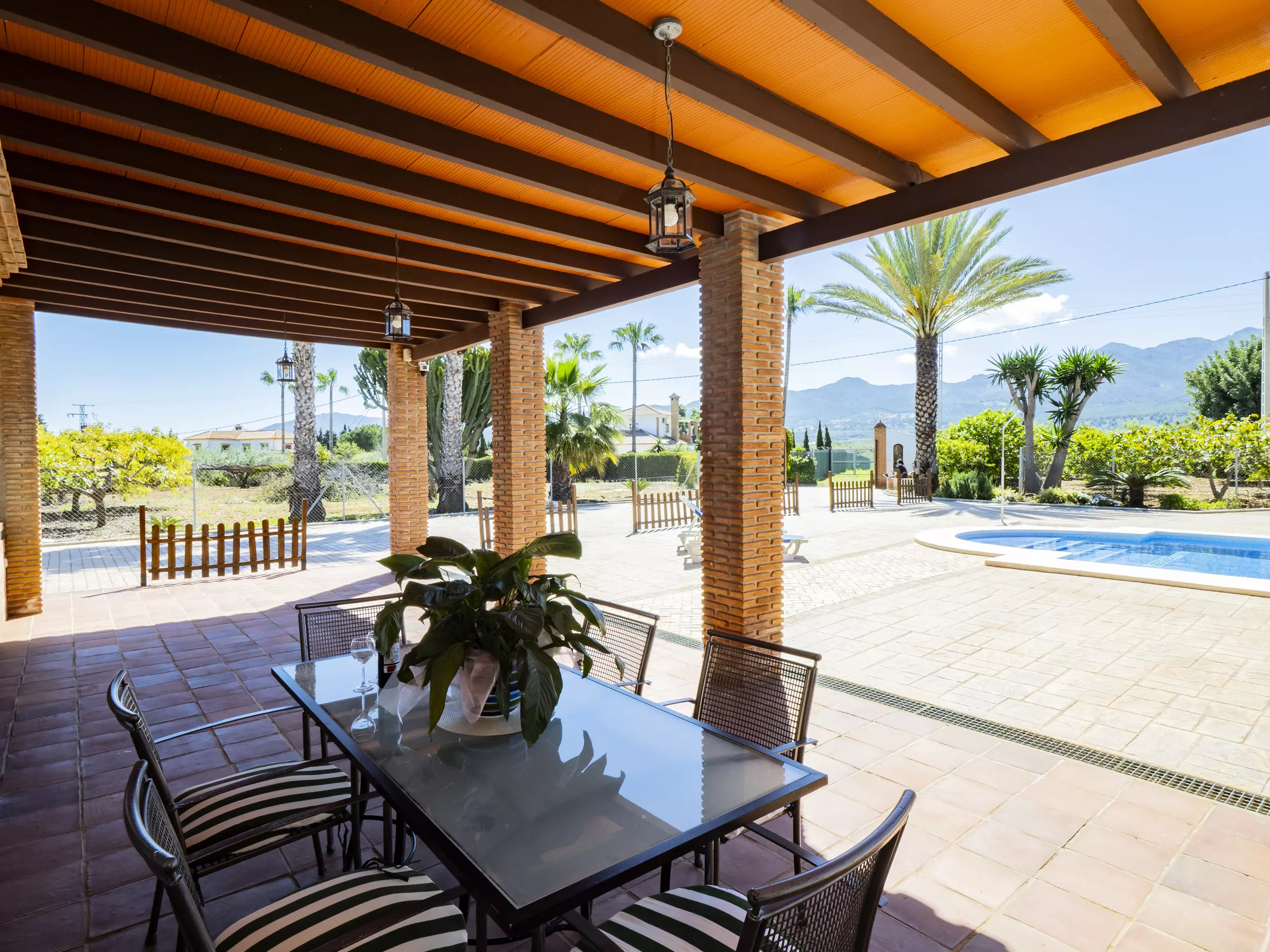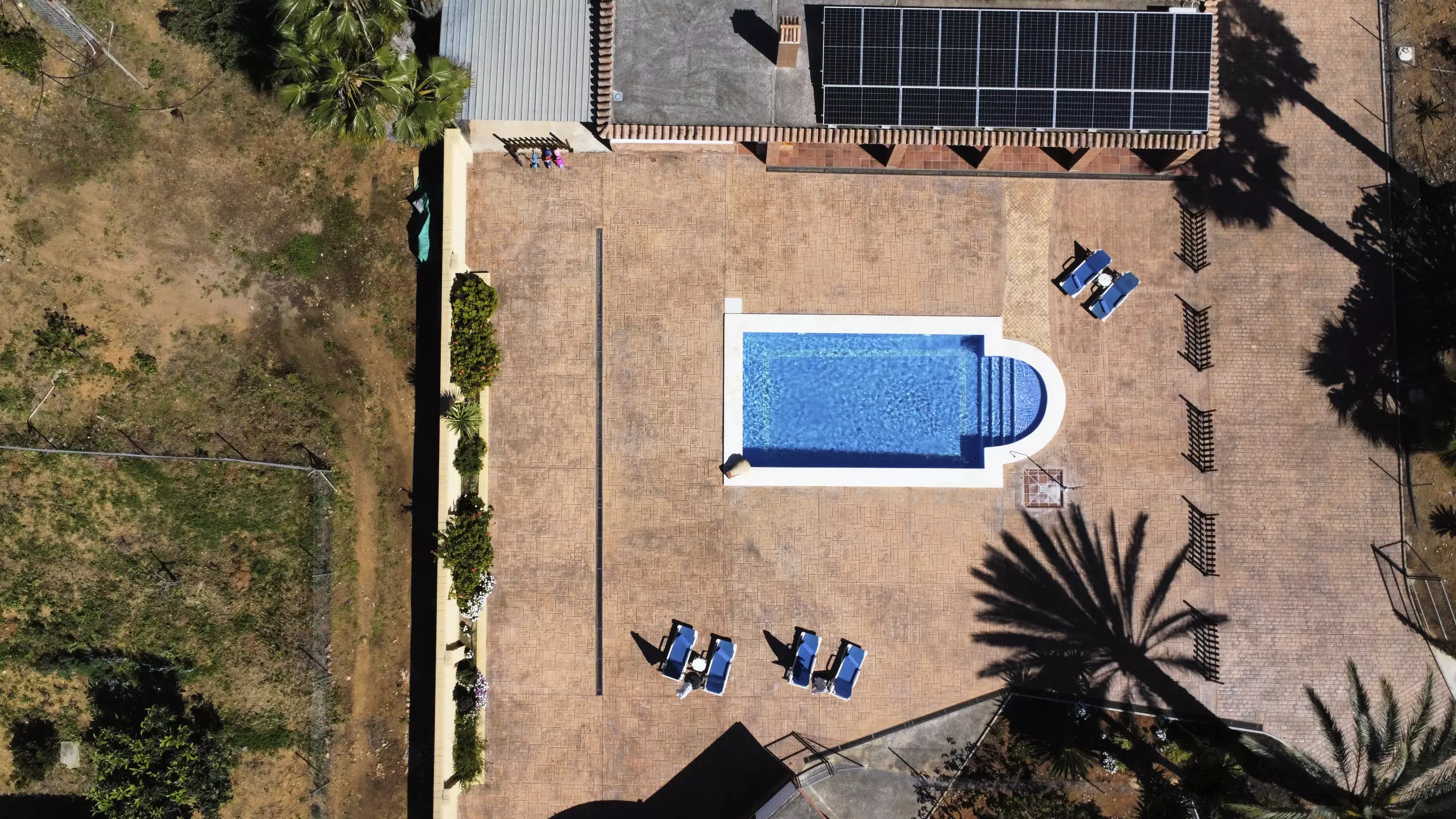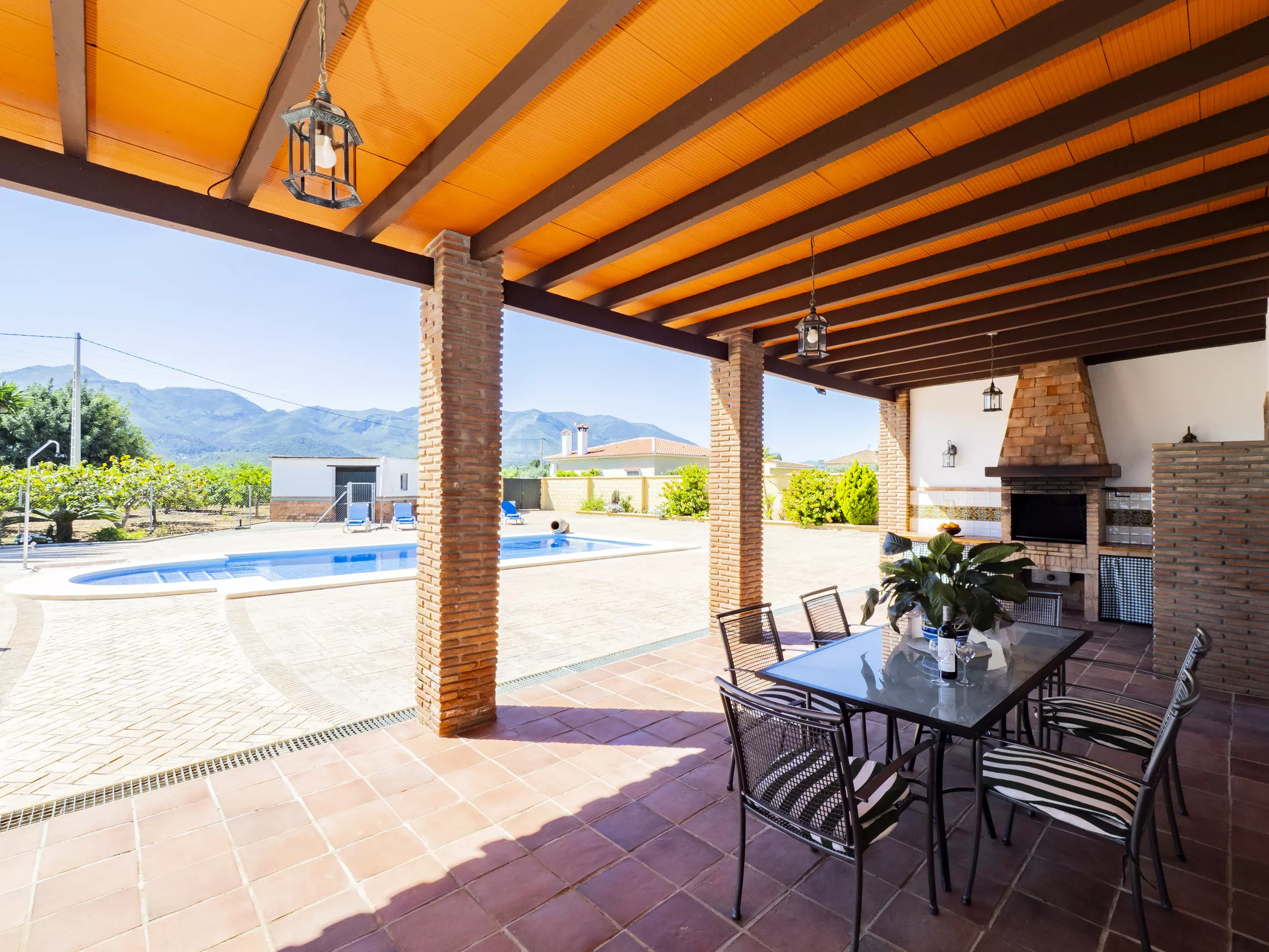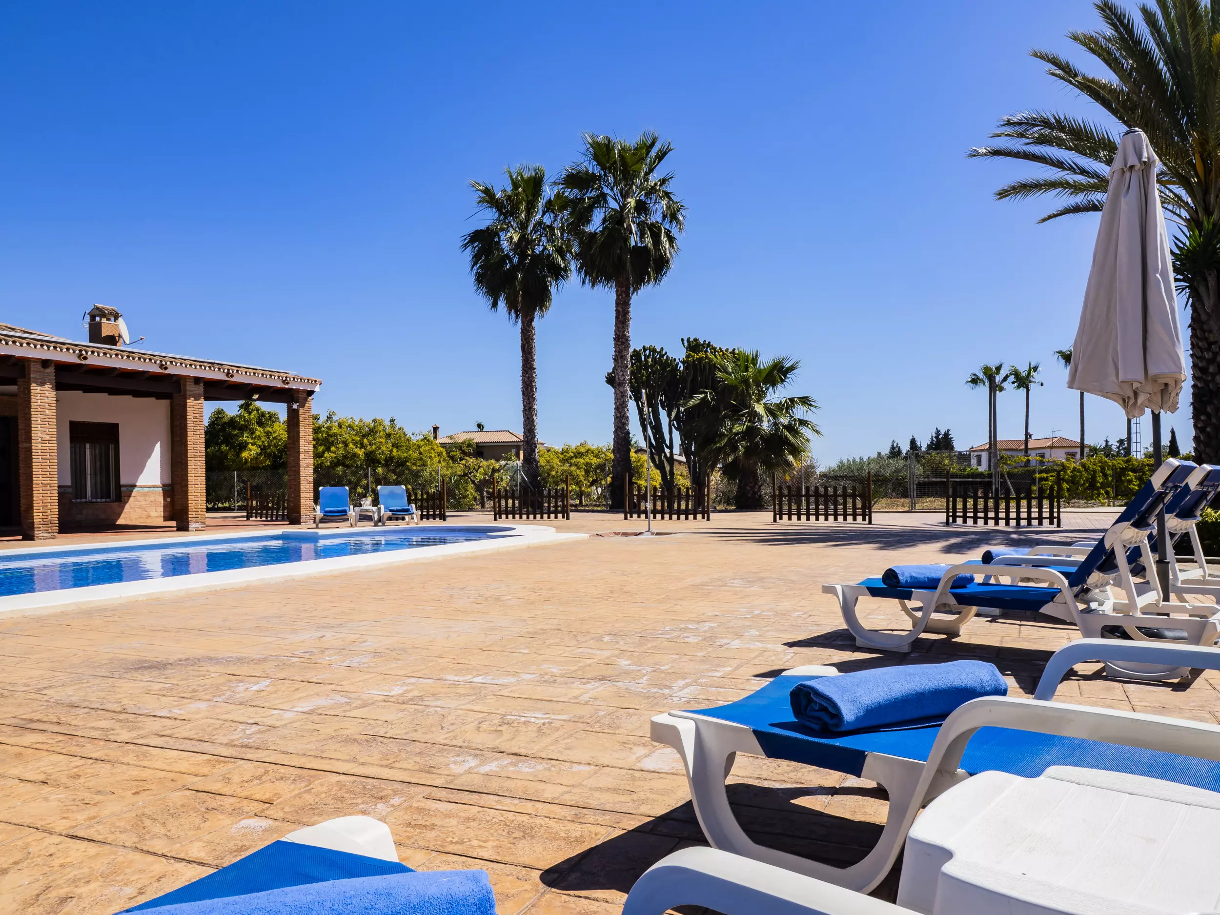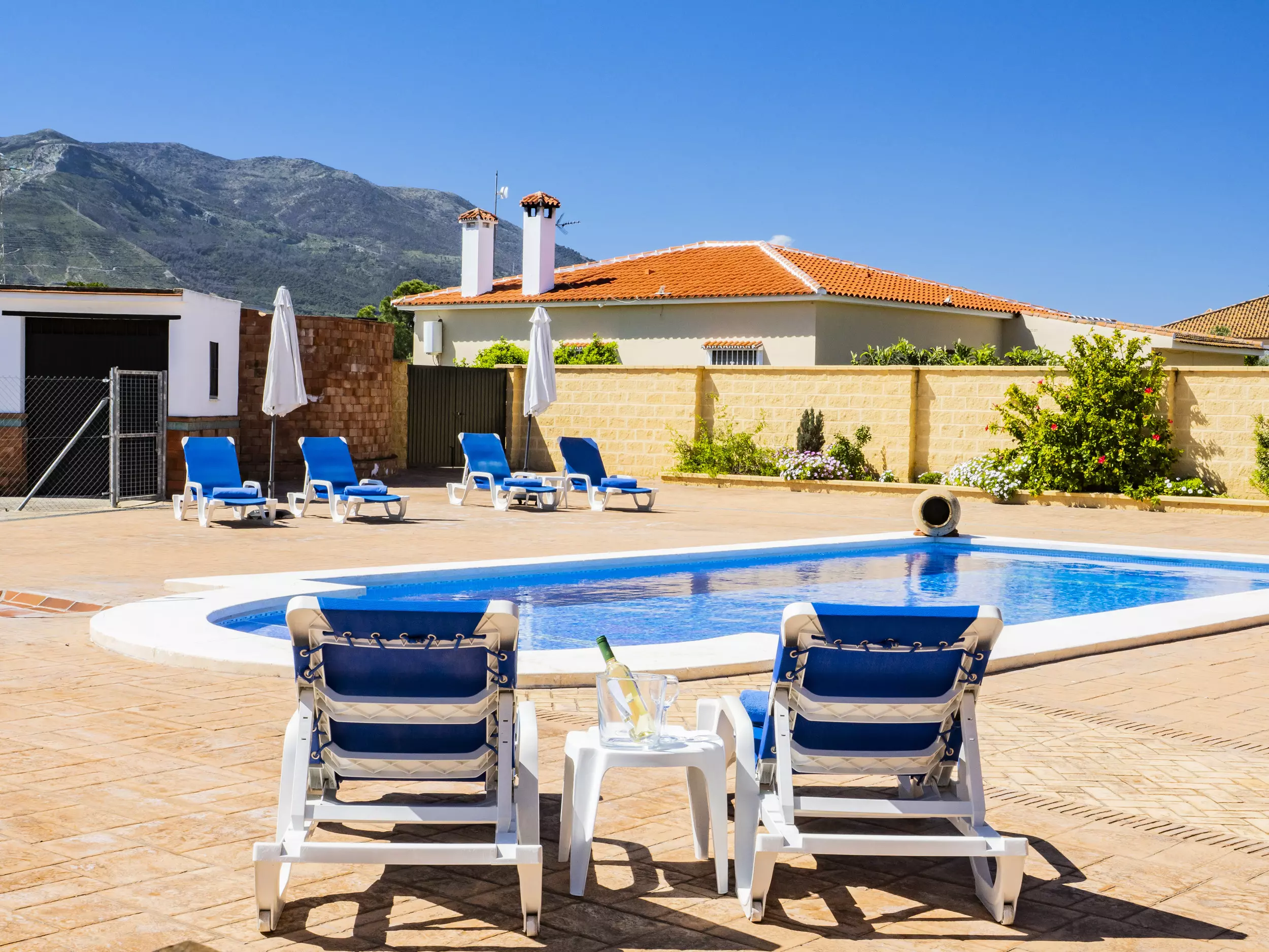La propriété dispose d'une piscine privée entourée de chaises longues et de parasols pour se rafraîchir lors des journées ensoleillées ?. De plus, elle comprend une zone de barbecue équipée de plaques de cuisson et d'un réfrigérateur, idéale pour de délicieux repas en plein air ?. Pour le repos et la déconnexion, le jardin et la terrasse sont des espaces parfaits, tandis que le terrain de football et les jeux garantissent du divertissement pour les grands et les petits ?. Pour plus de commodité, le logement offre un parking couvert pour trois voitures et une entrée privée avec portail automatique ?.