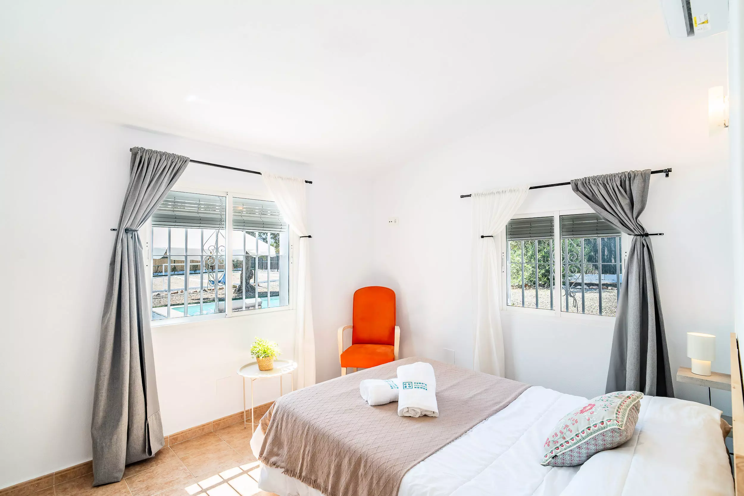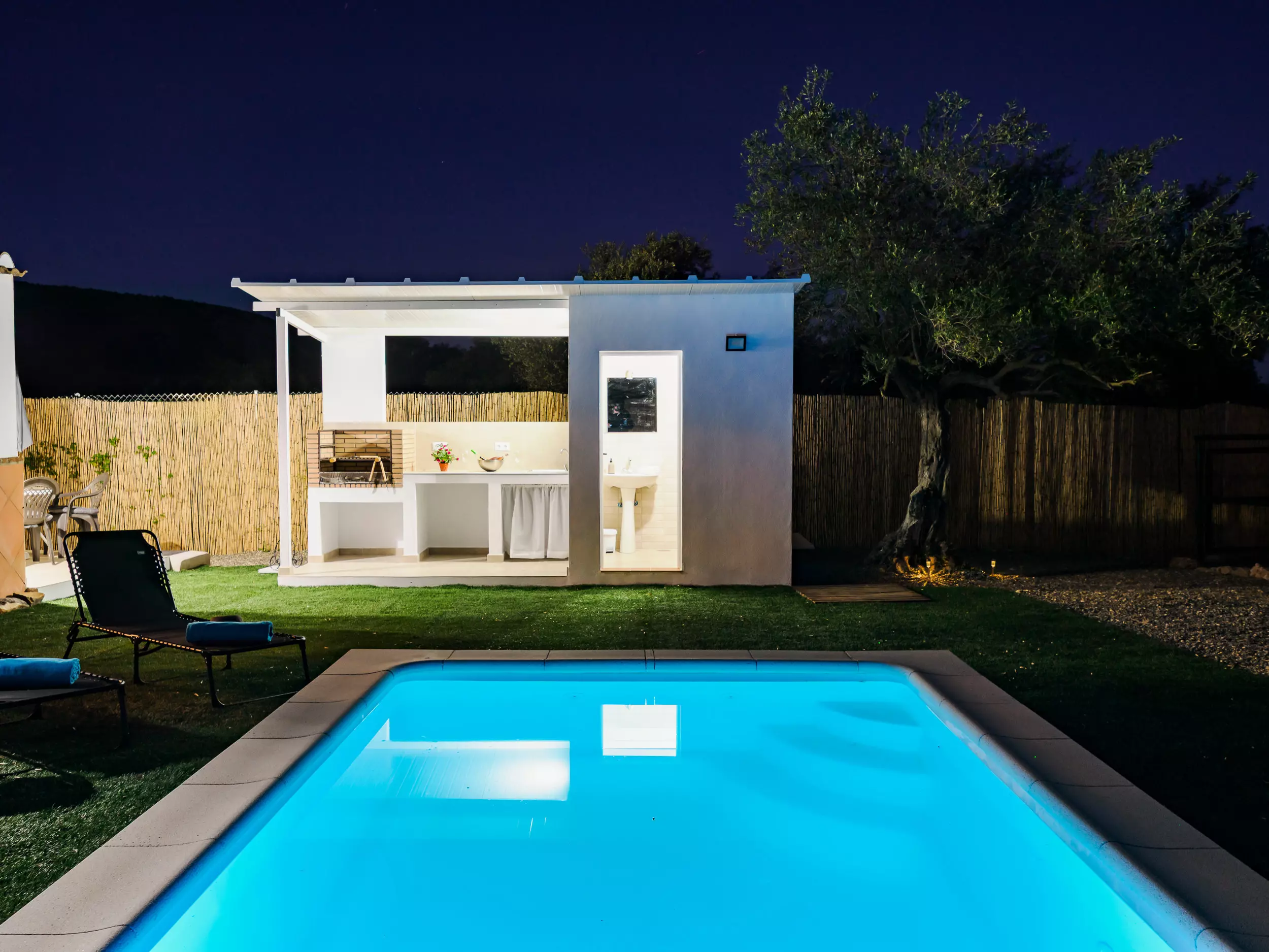 Dispose de deux chambres principales avec des lits doubles et des armoires, ainsi qu'un troisième espace avec un canapé-lit de type clic-clac. Il y a deux salles de bains complètes, une intérieure près de la cuisine et une autre extérieure accessible depuis la piscine, ce qui est très pratique en été ?.