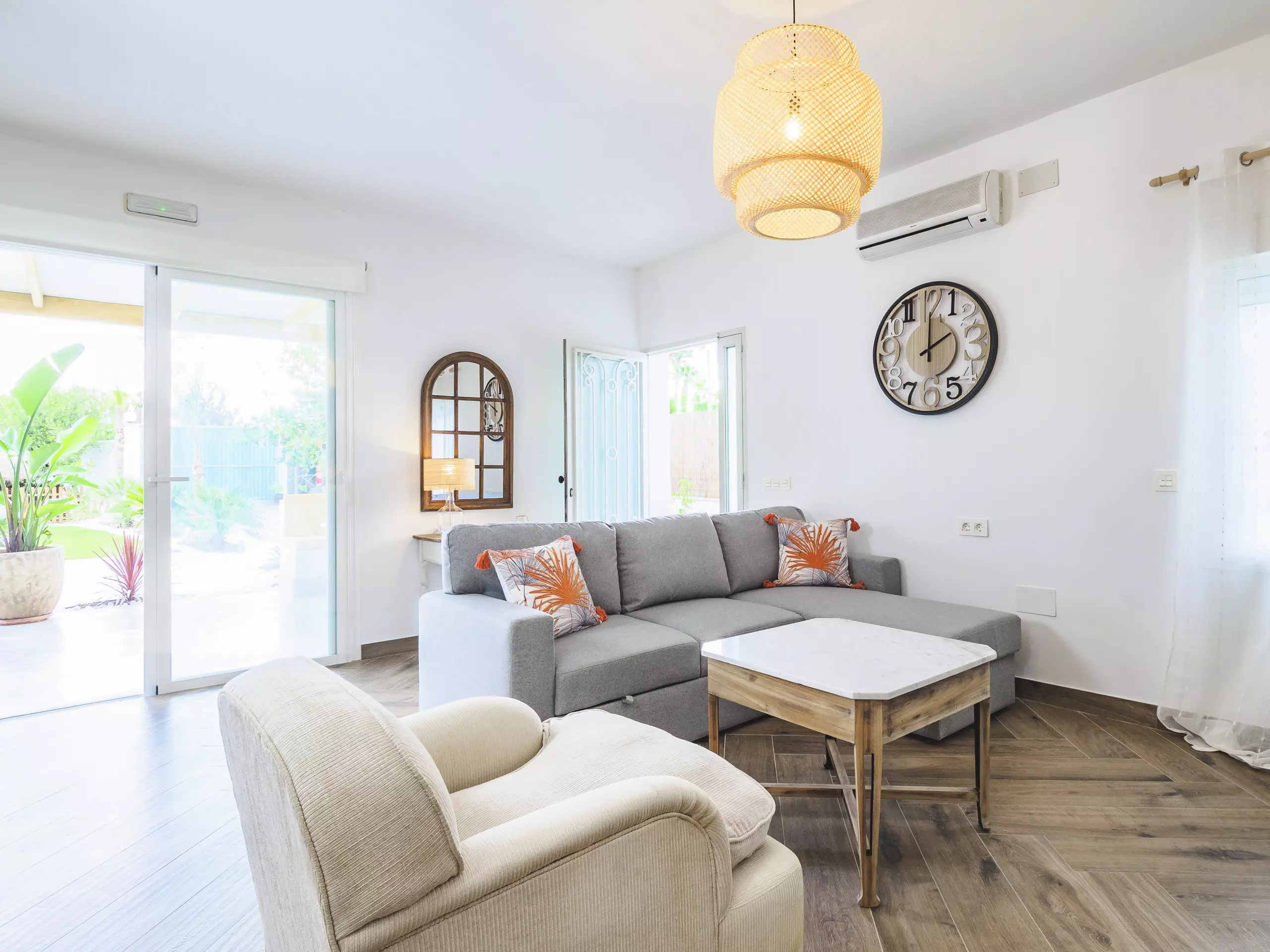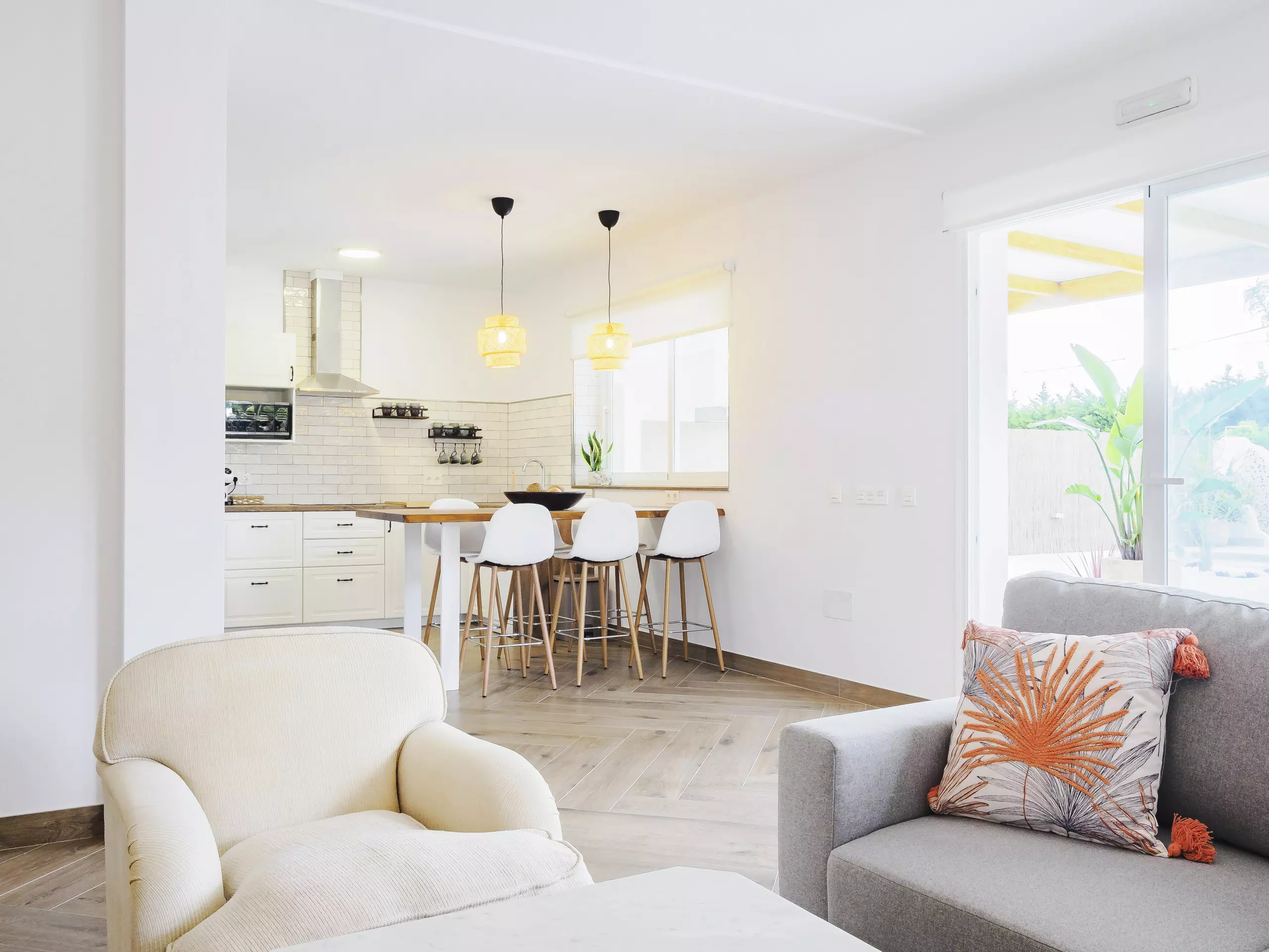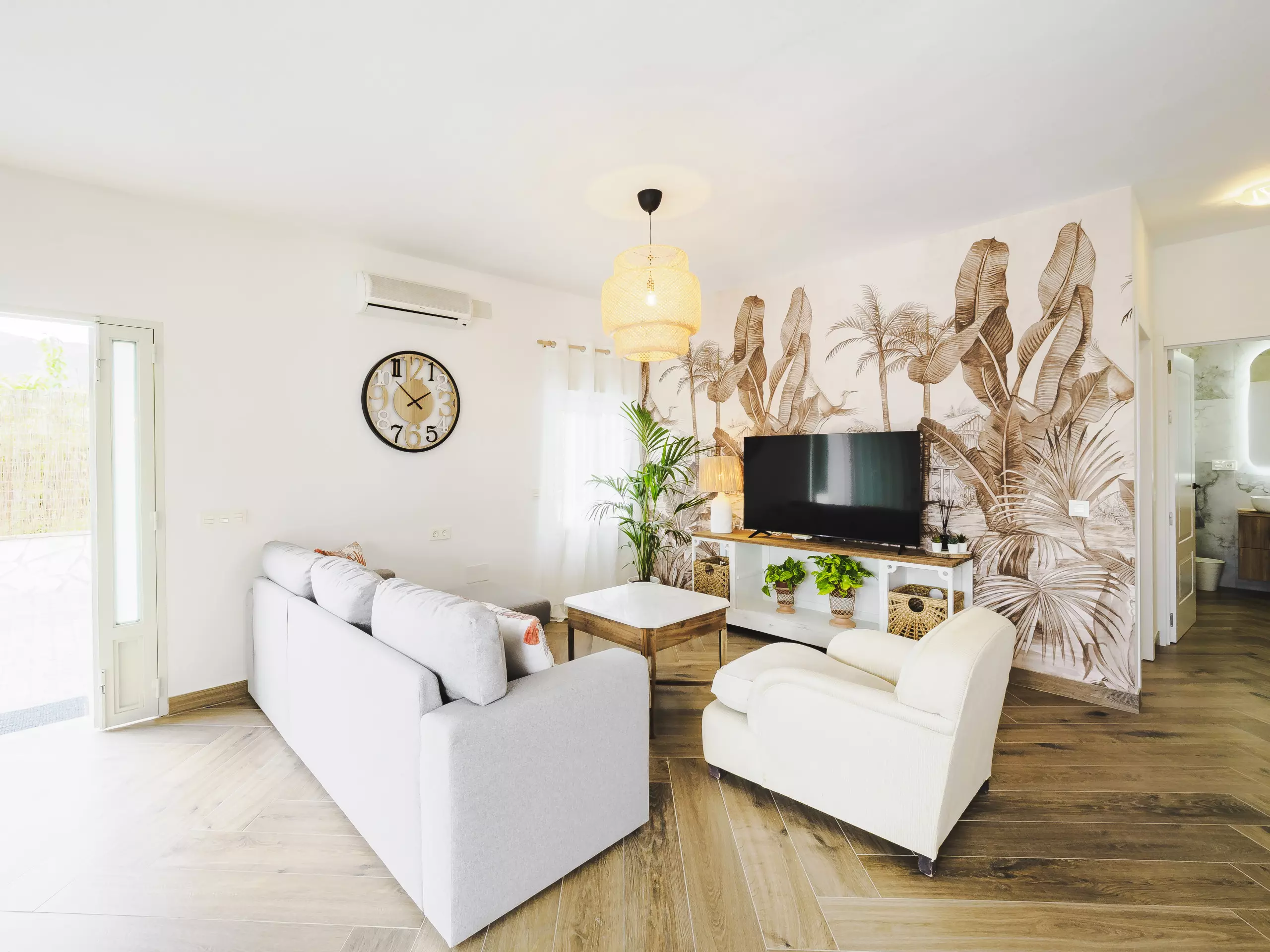 ? À l'intérieur, la maison dispose d'un grand salon-salle à manger avec Smart TV et une cuisine américaine entièrement équipée. Elle possède deux accès, facilitant la connexion entre l'intérieur et l'extérieur.