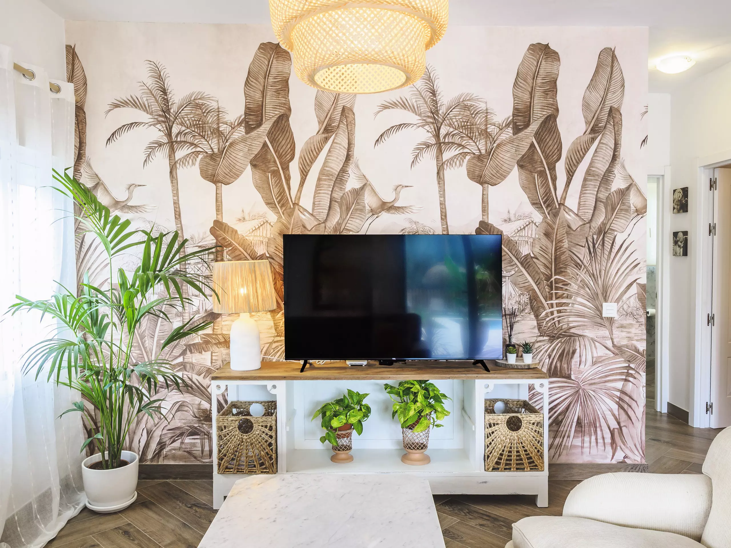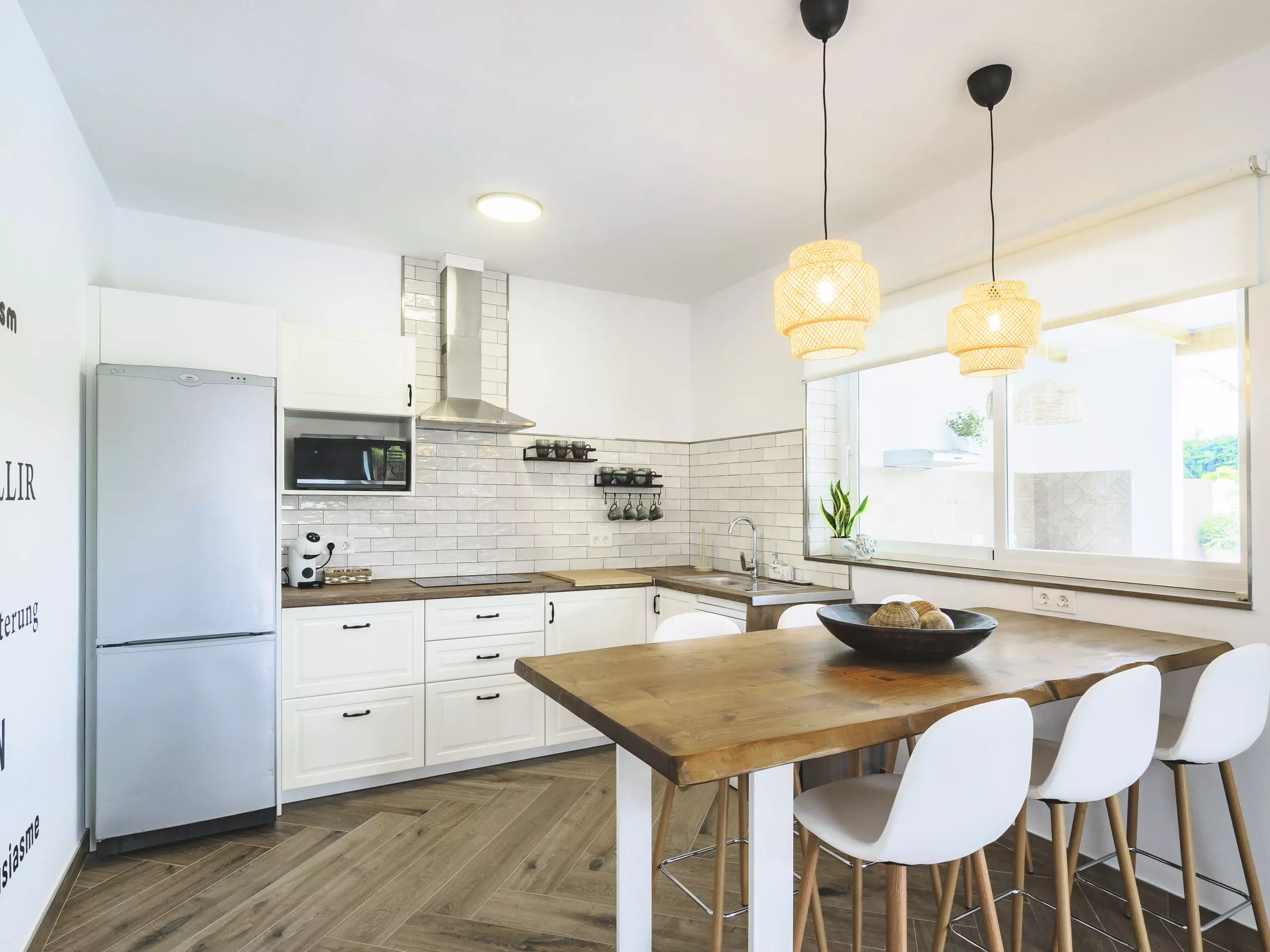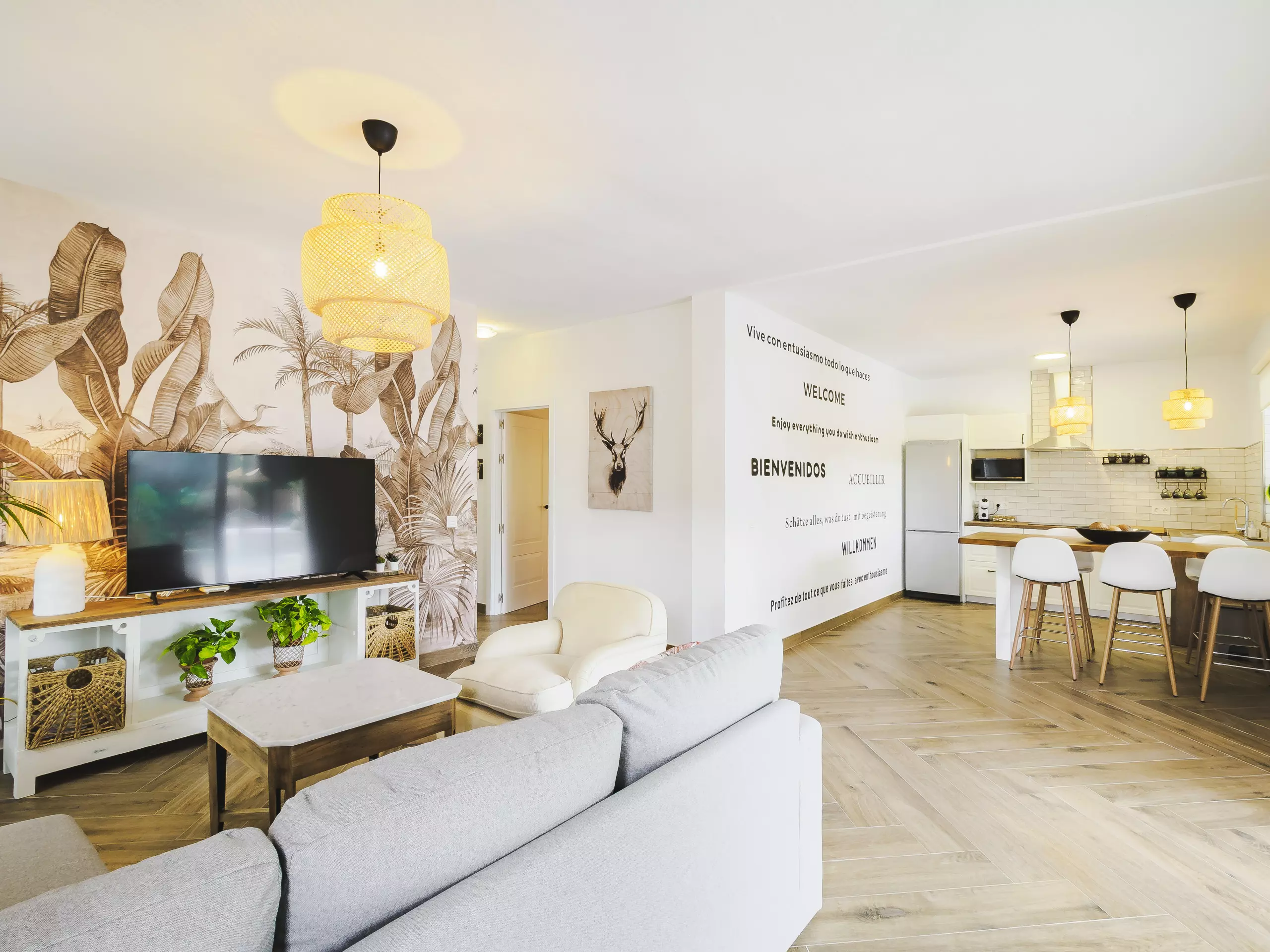 ? À l'intérieur, la maison dispose d'un grand salon-salle à manger avec Smart TV et une cuisine américaine entièrement équipée. Elle possède deux accès, facilitant la connexion entre l'intérieur et l'extérieur.