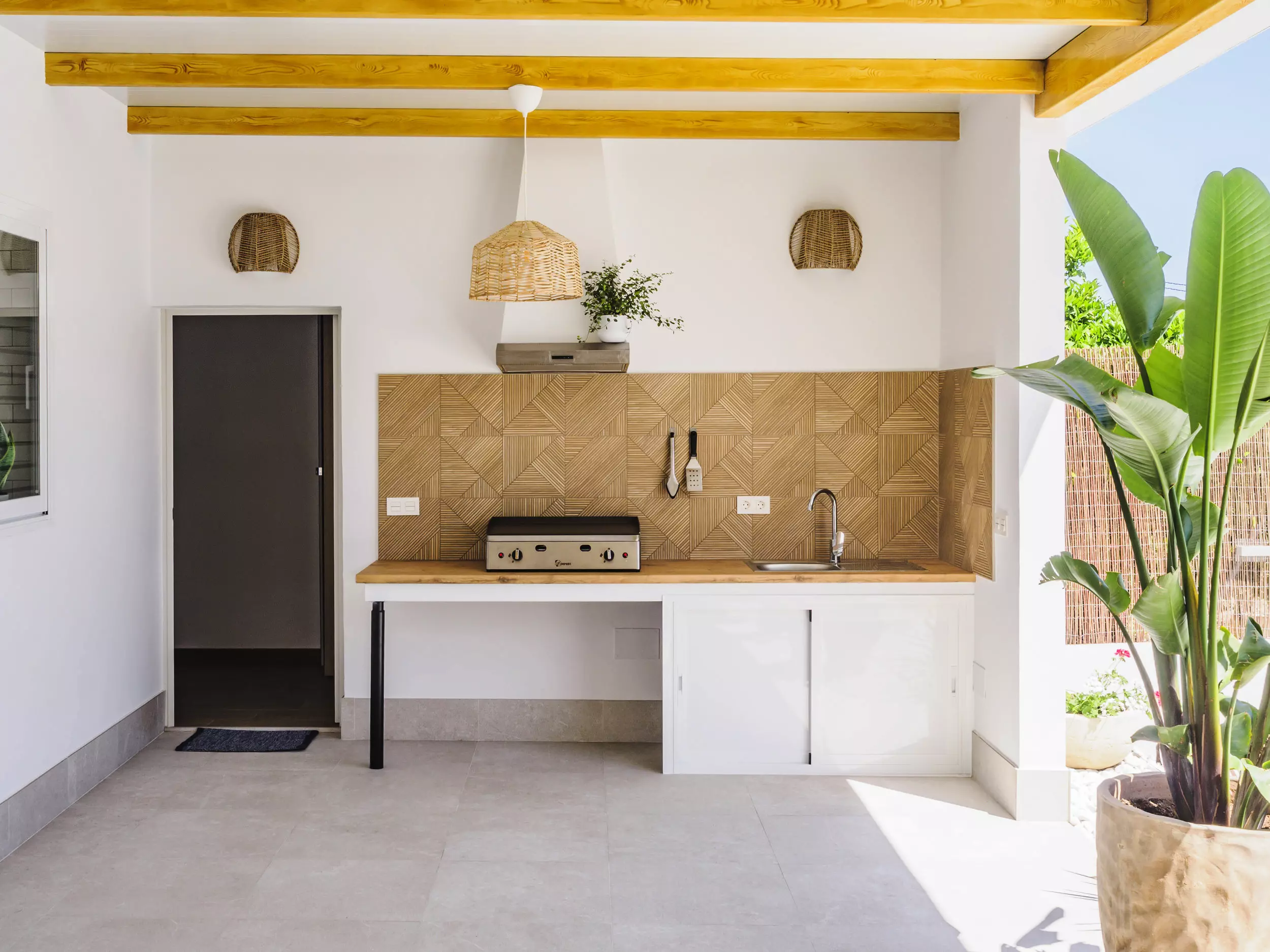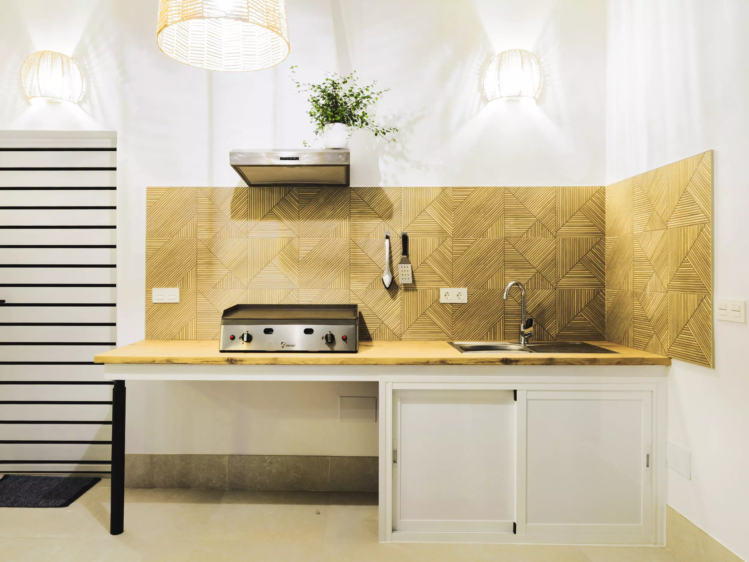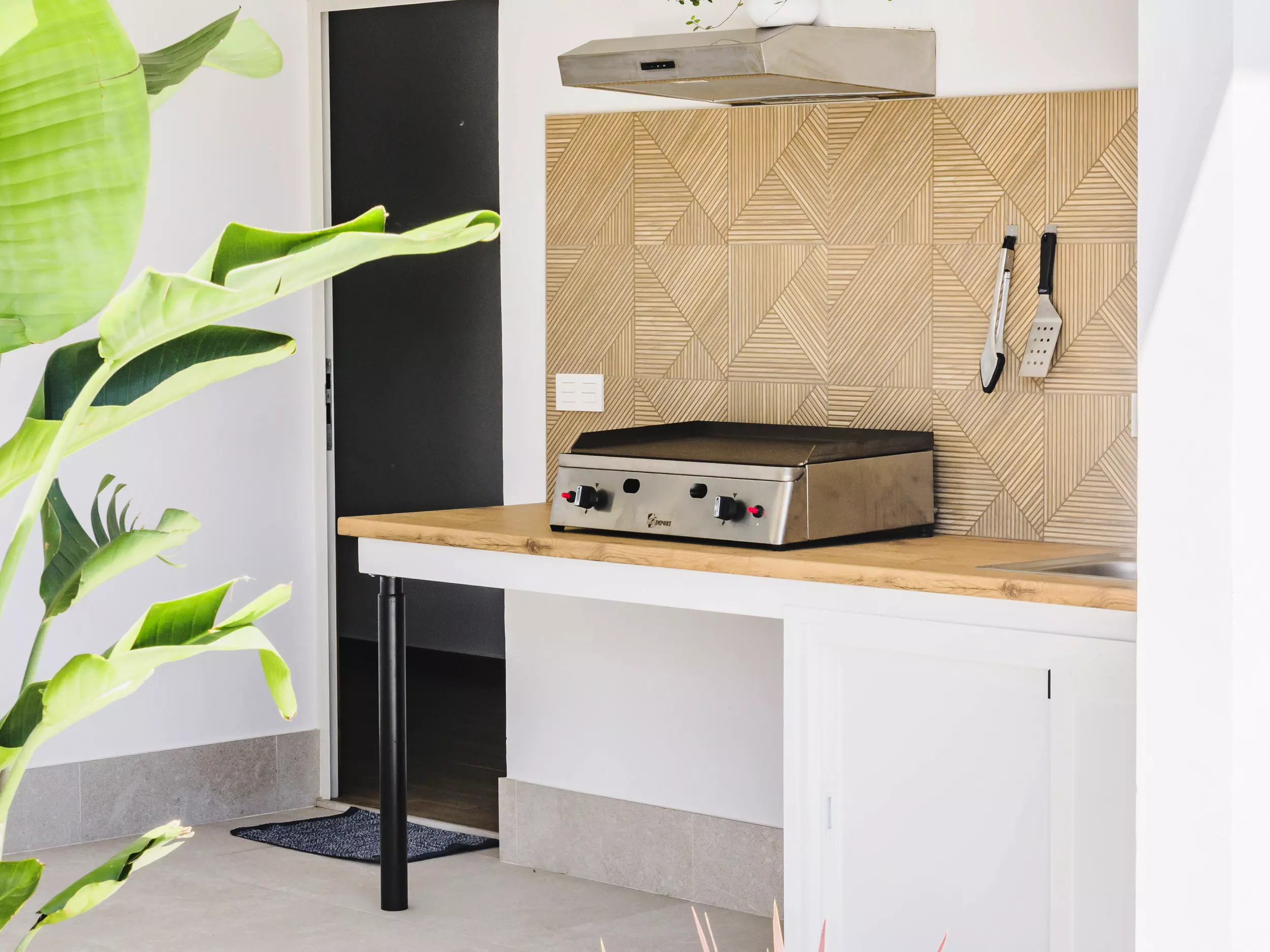 - Cuisine extérieure avec plaque de cuisson à gaz.