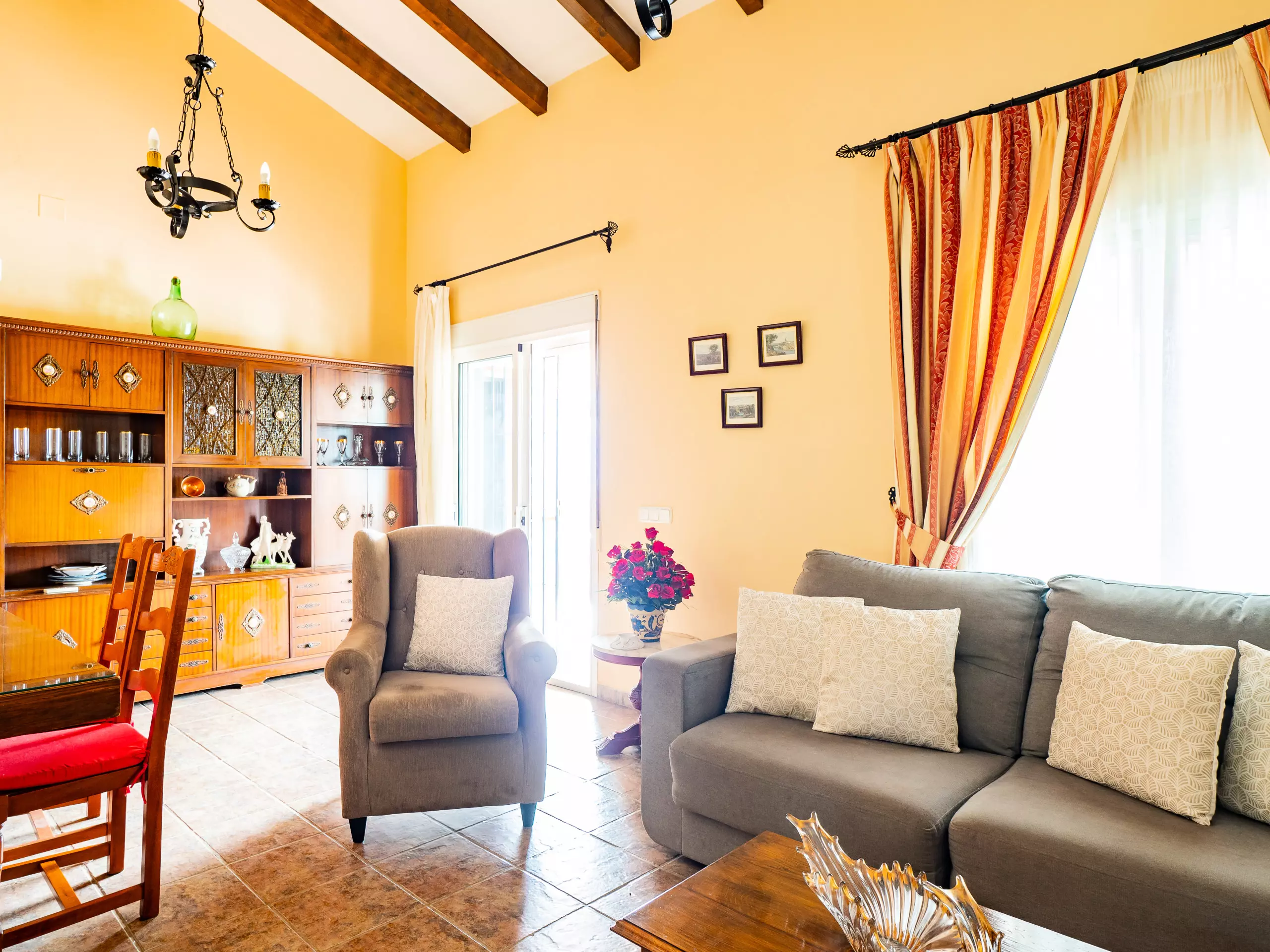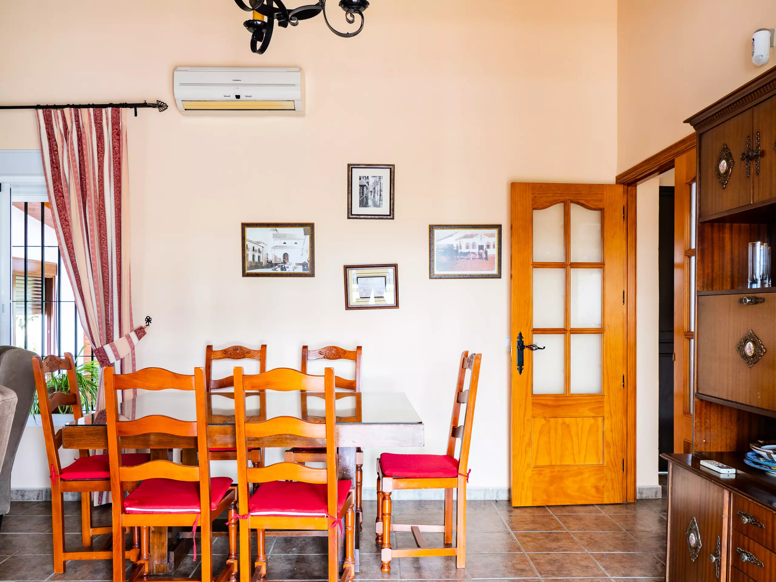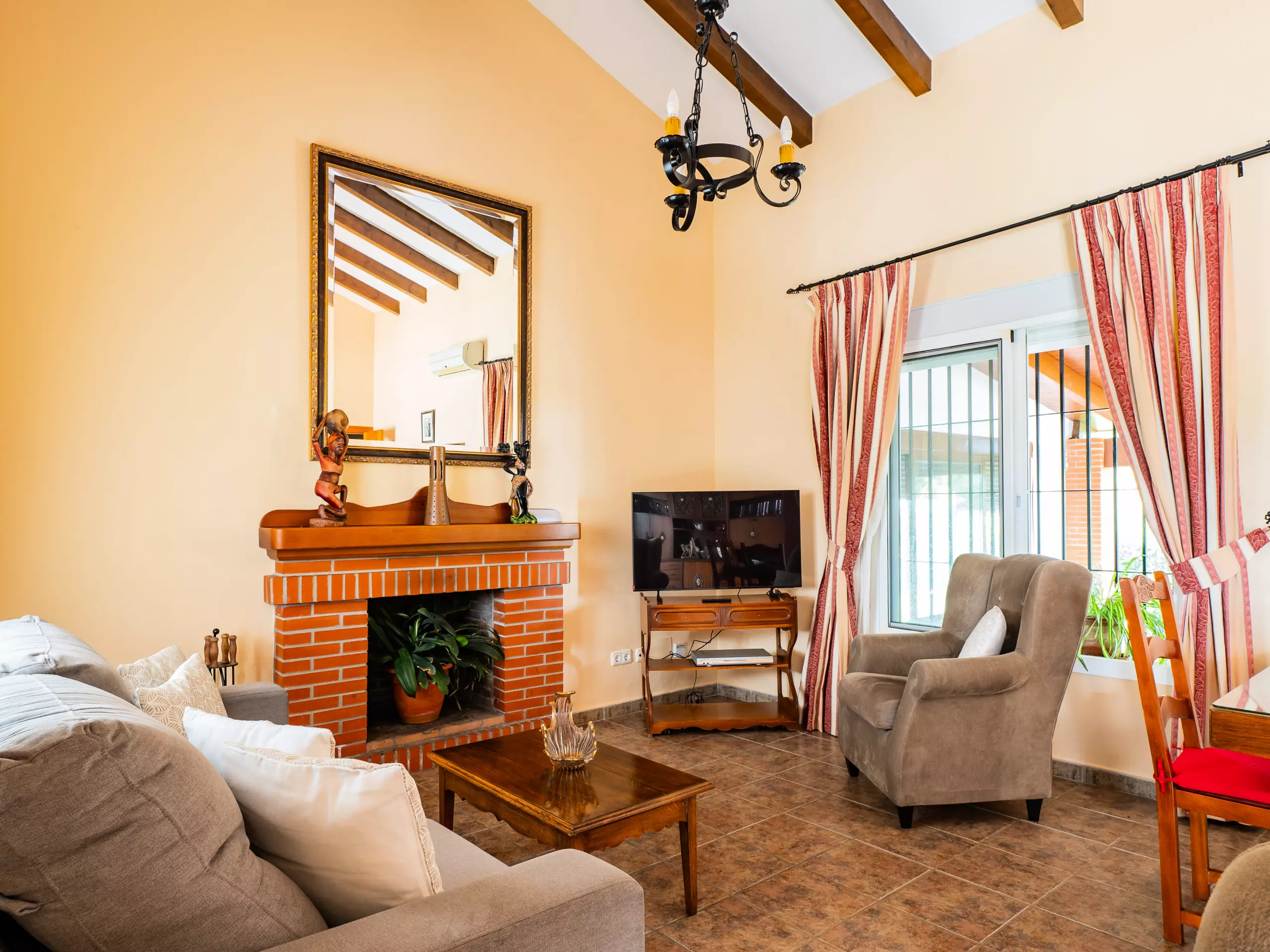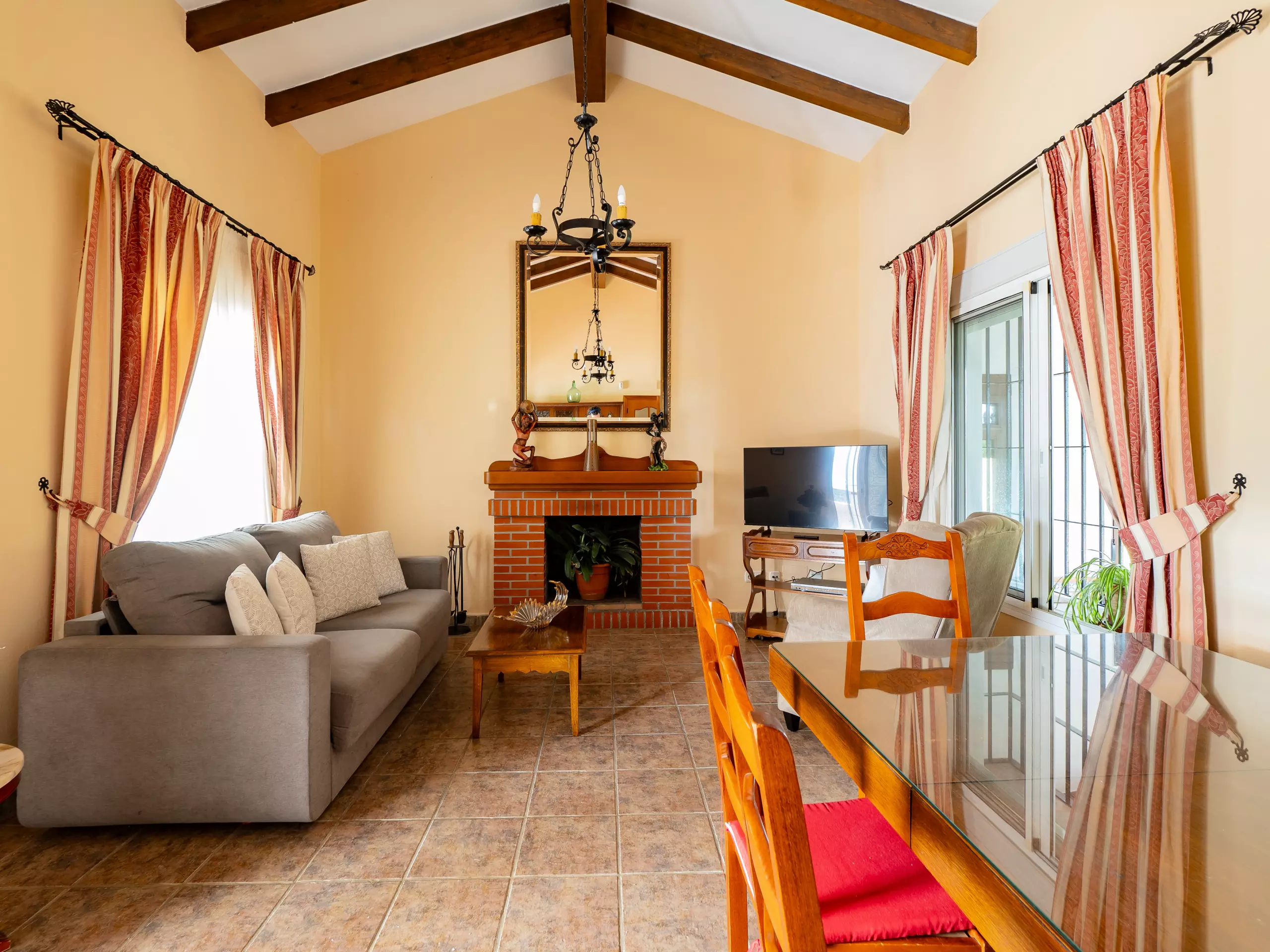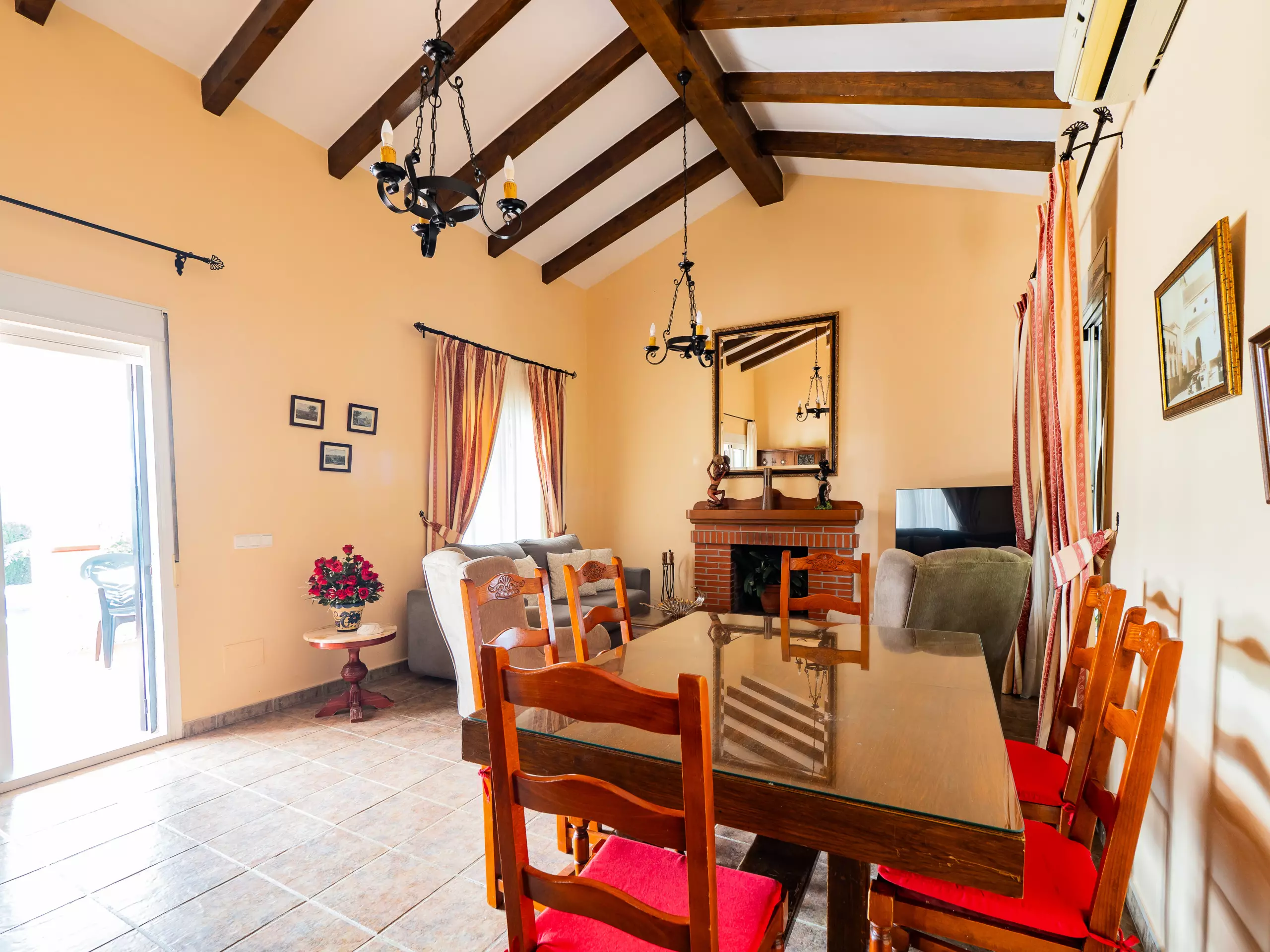 Le salon-salle à manger est accueillant et fonctionnel, équipé d'un canapé, de fauteuils, d'une table de salle à manger et d'une Smart TV pour des moments de détente en famille. Bien que la cheminée ne soit pas habilitée à l'usage, la maison dispose d'un climatiseur avec pompe à chaleur pour maintenir une température agréable dans toutes les saisons. ???