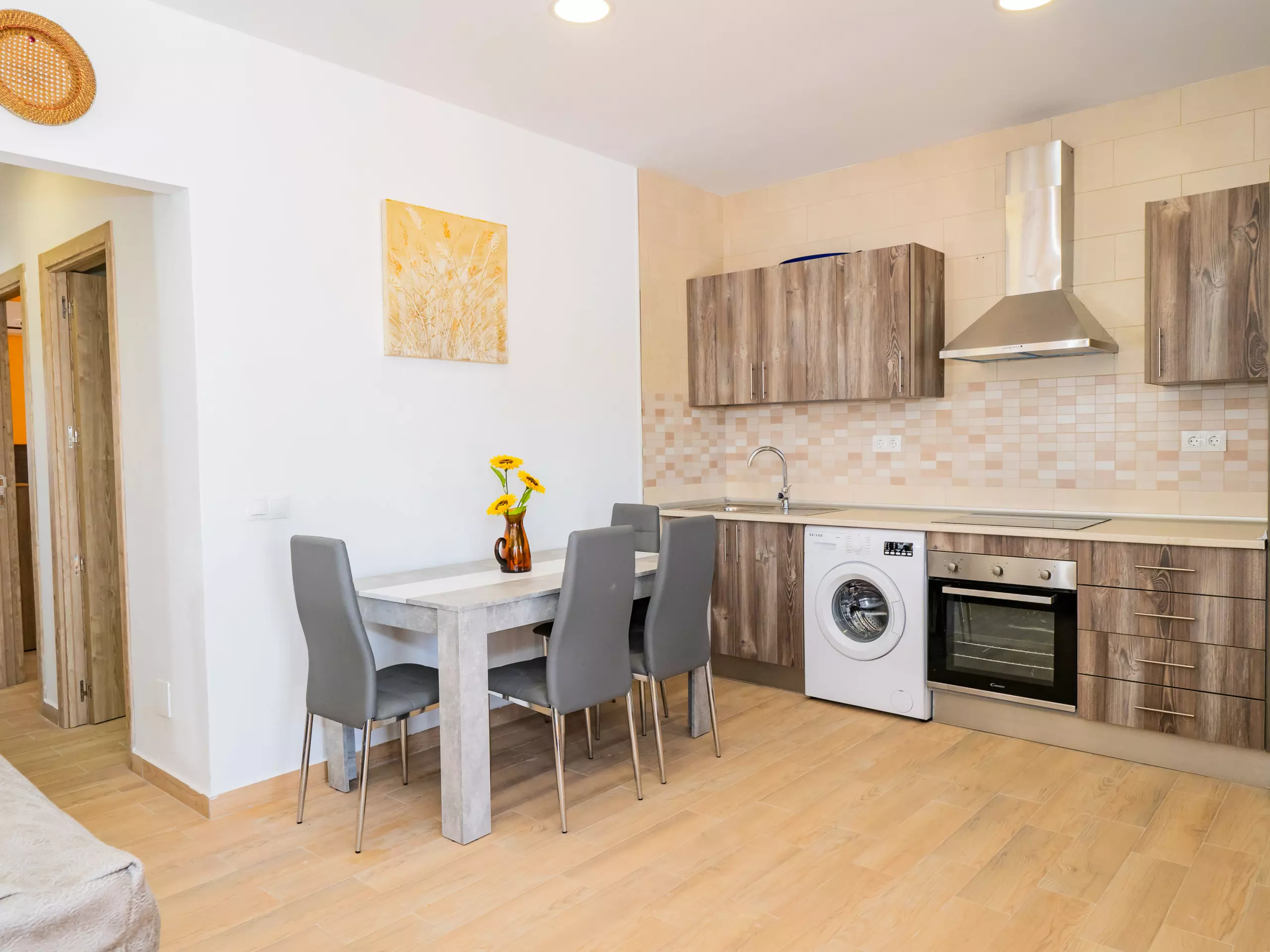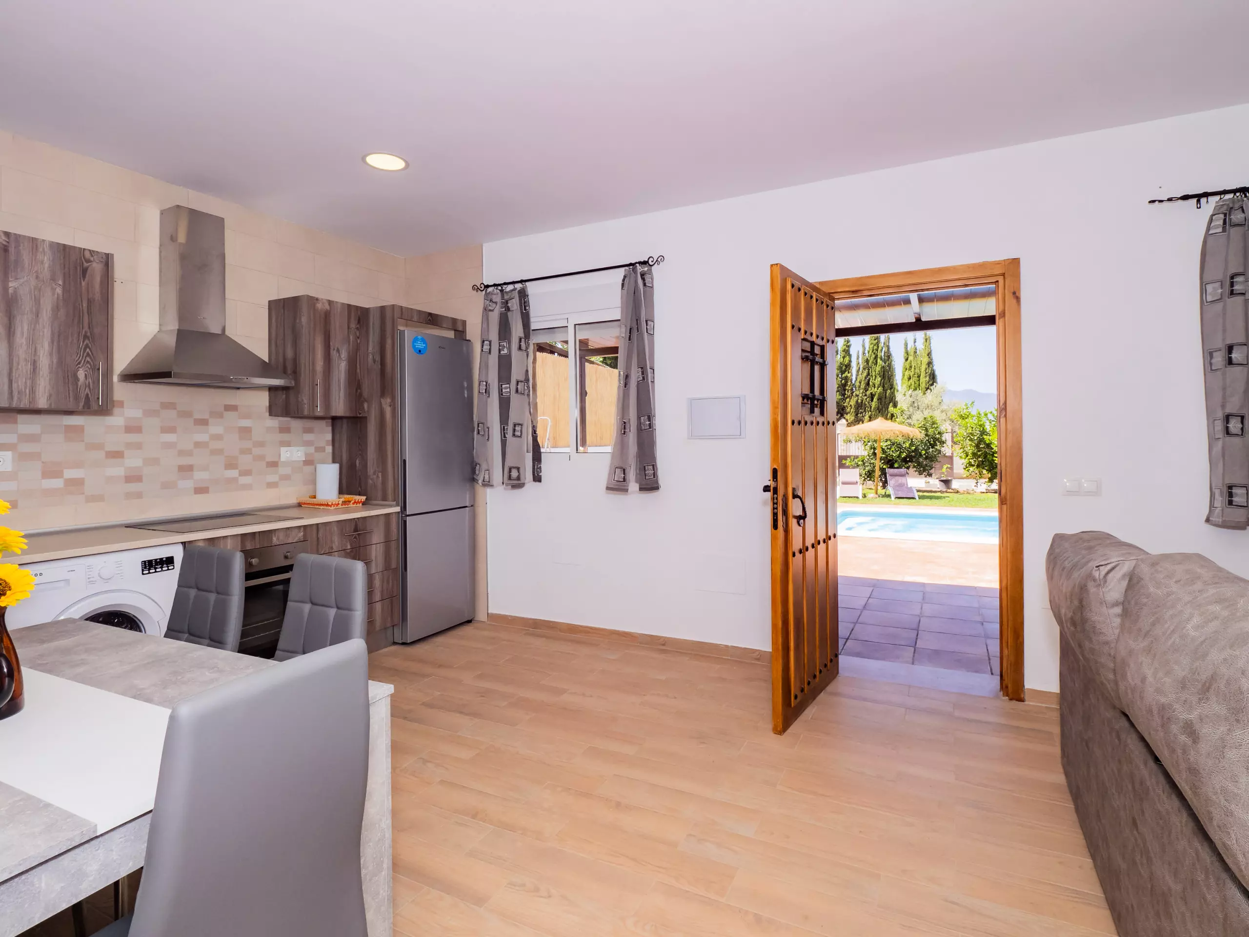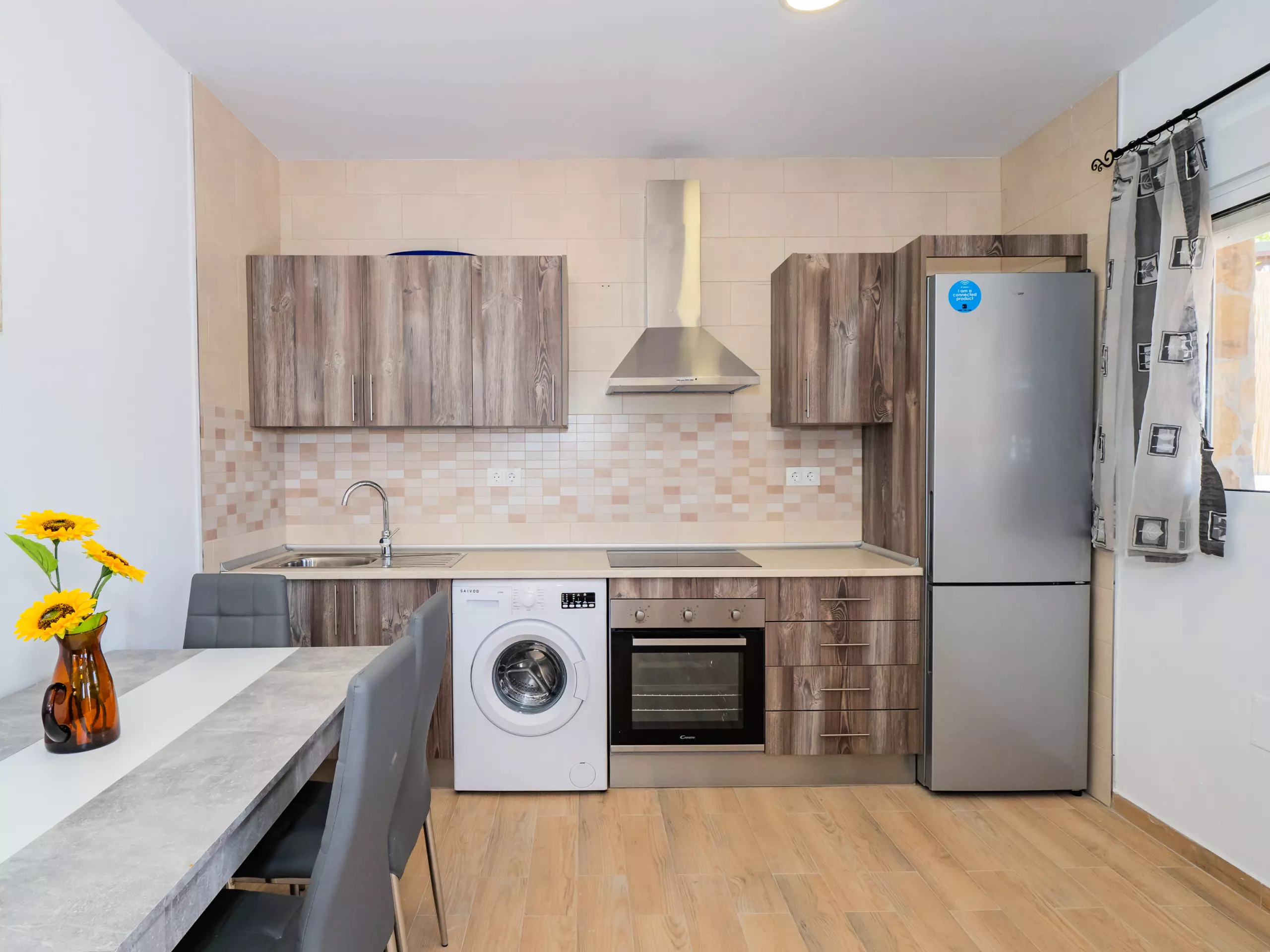 À l'intérieur, vous trouverez un salon-salle à manger moderne avec une cuisine américaine entièrement équipée : plaque vitrocéramique, réfrigérateur, four, micro-ondes, congélateur, machine à laver et tous les ustensiles nécessaires pour cuisiner confortablement. Profitez de vos repas à l'intérieur ou sur la terrasse extérieure. Le salon est un espace accueillant avec des canapés confortables, une Smart TV et une connexion internet pour votre divertissement en famille. ??