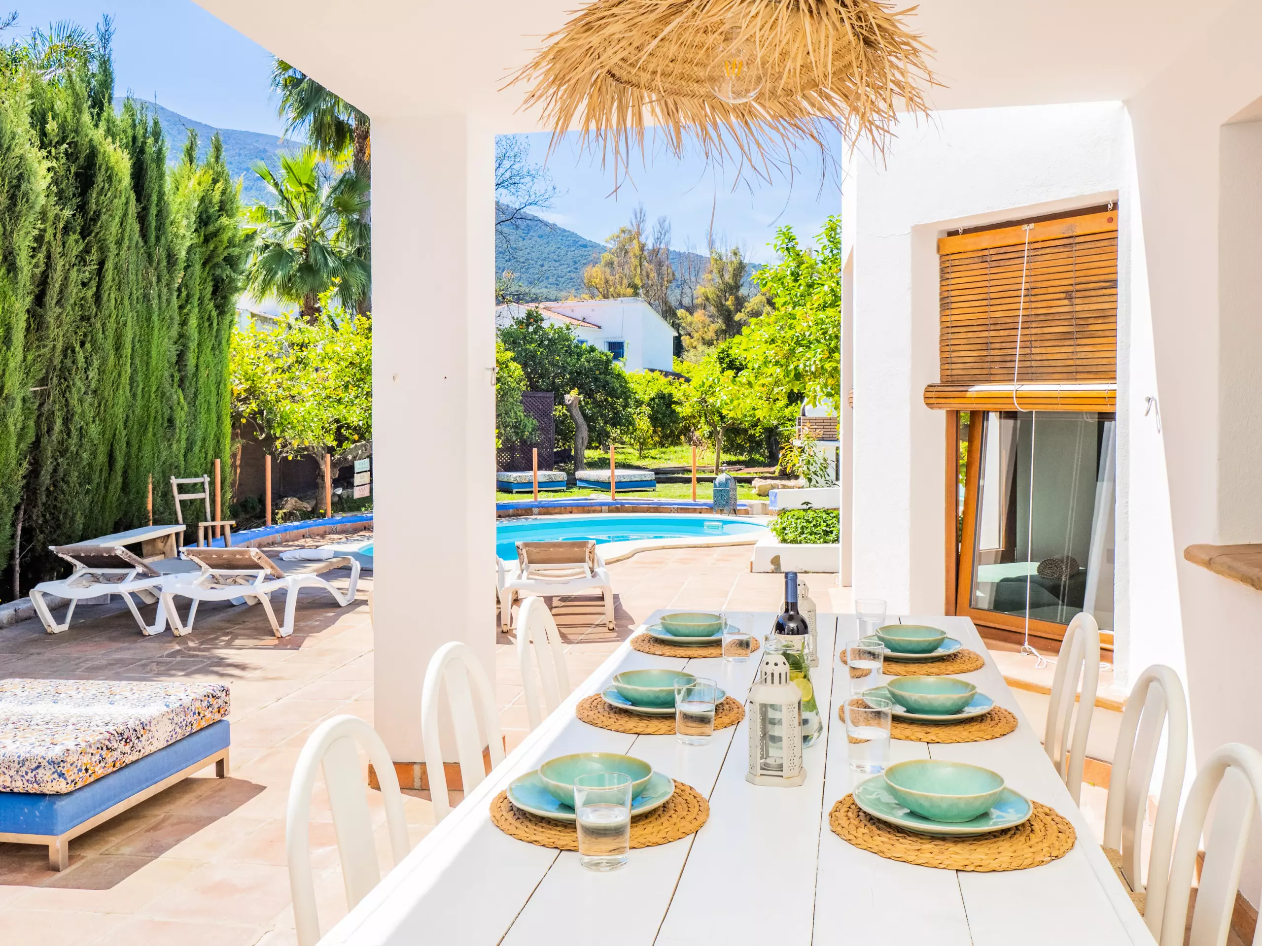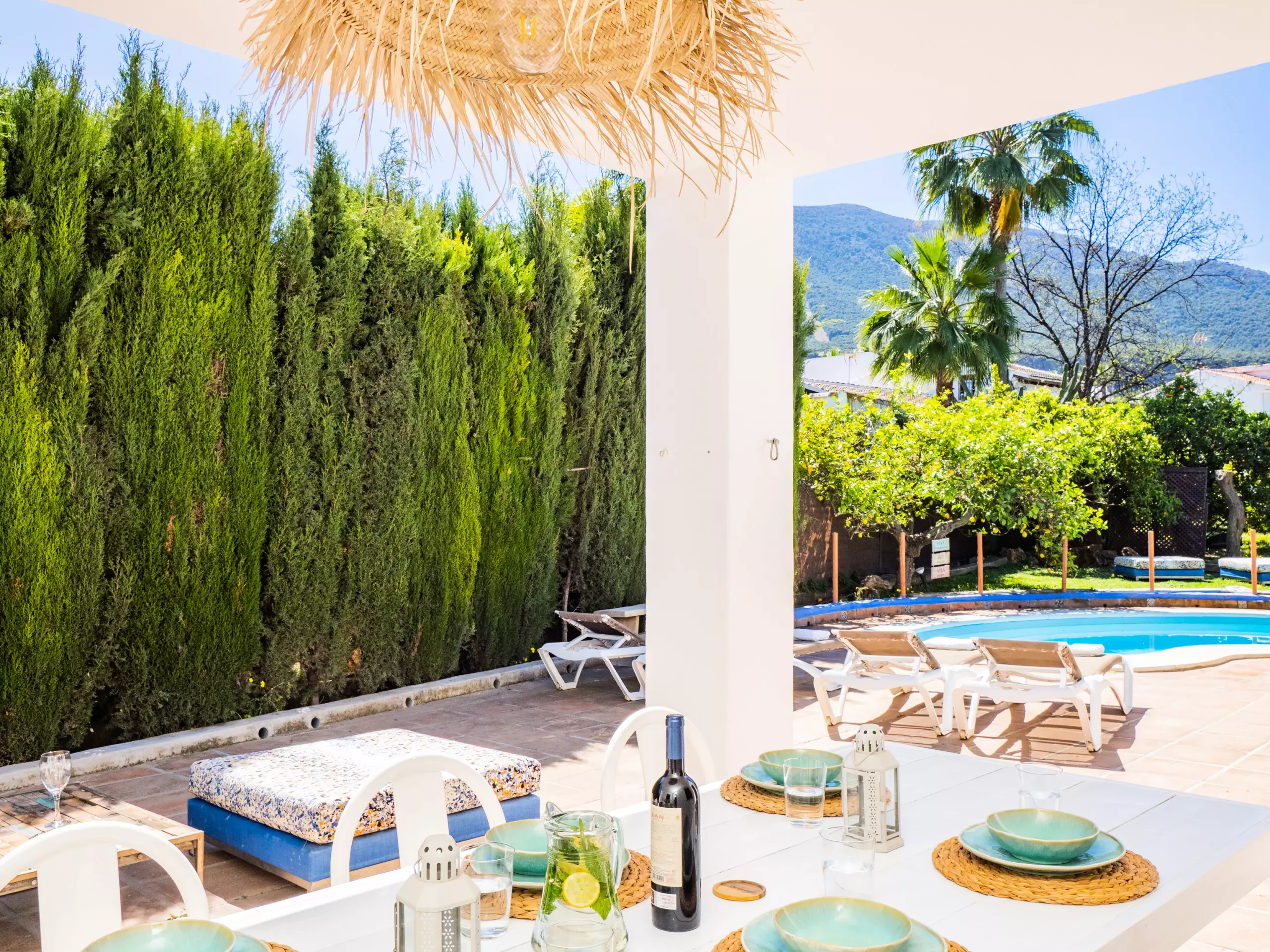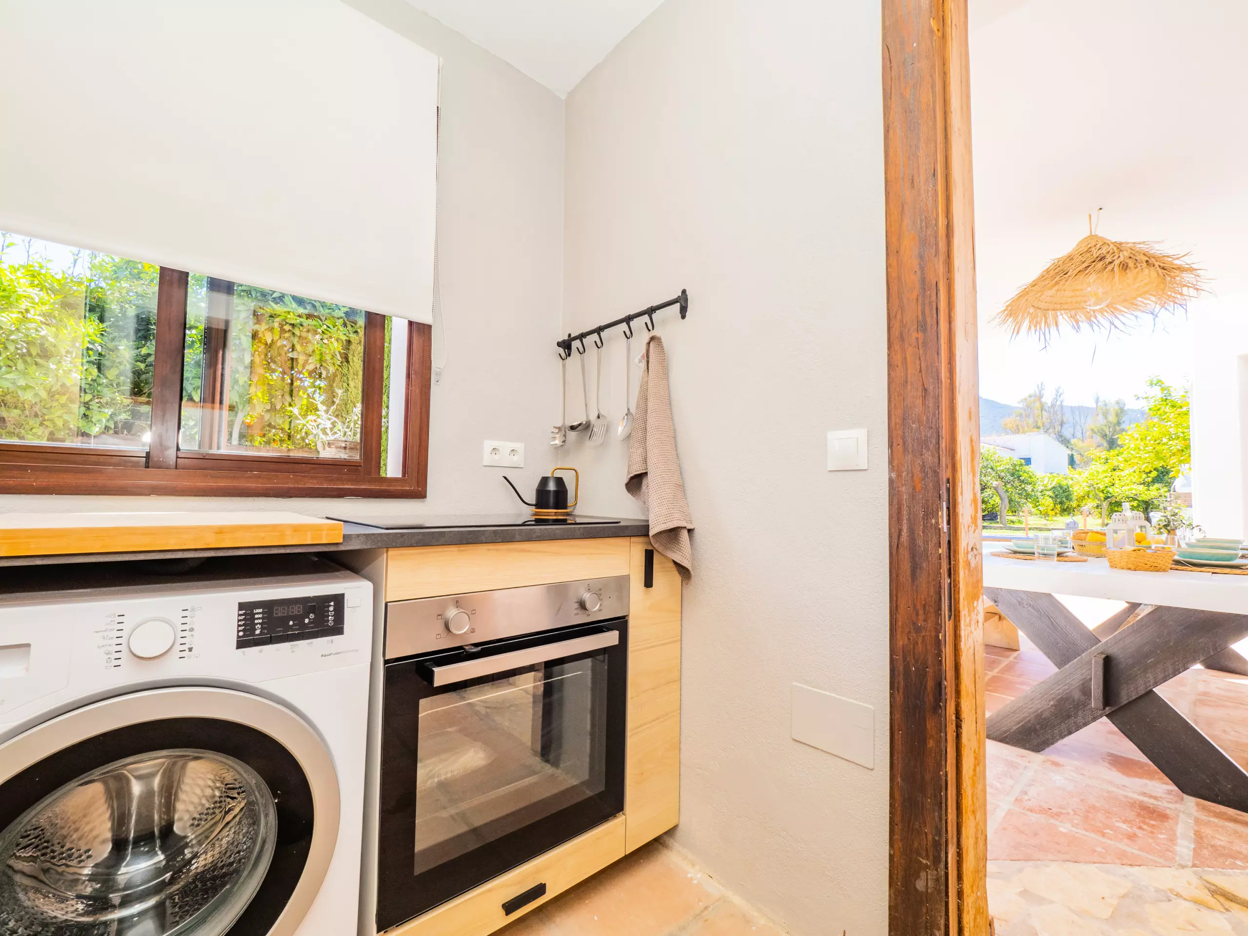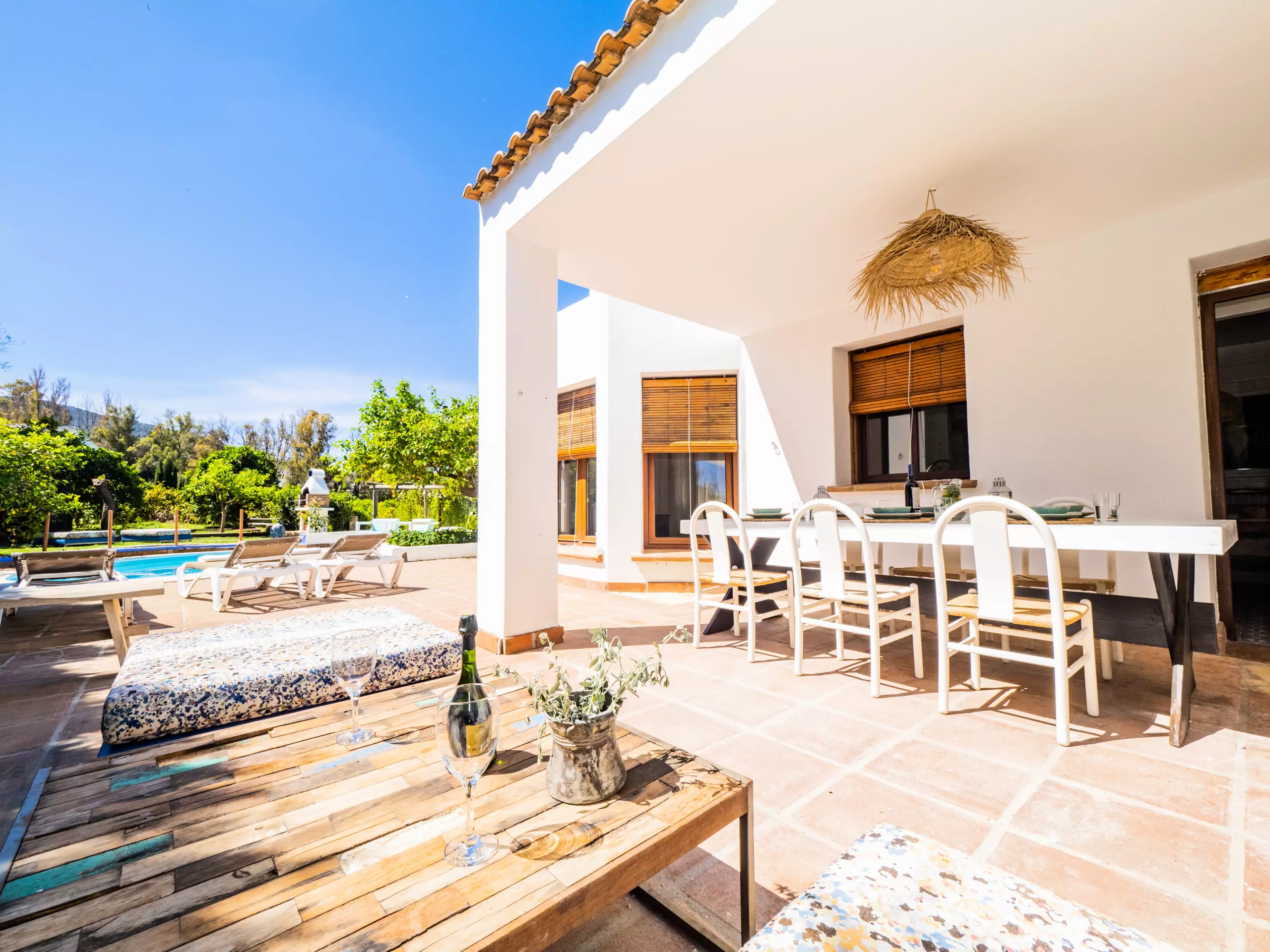 À l'extérieur, vous profiterez d'une élégante zone paysagée avec piscine, barbecue et porche, idéale pour des déjeuners ensoleillés en plein air tout en surveillant les plus petits qui jouent dans la piscine. De plus, une petite cuisine auxiliaire facilite l'organisation des repas et le rangement des ustensiles.