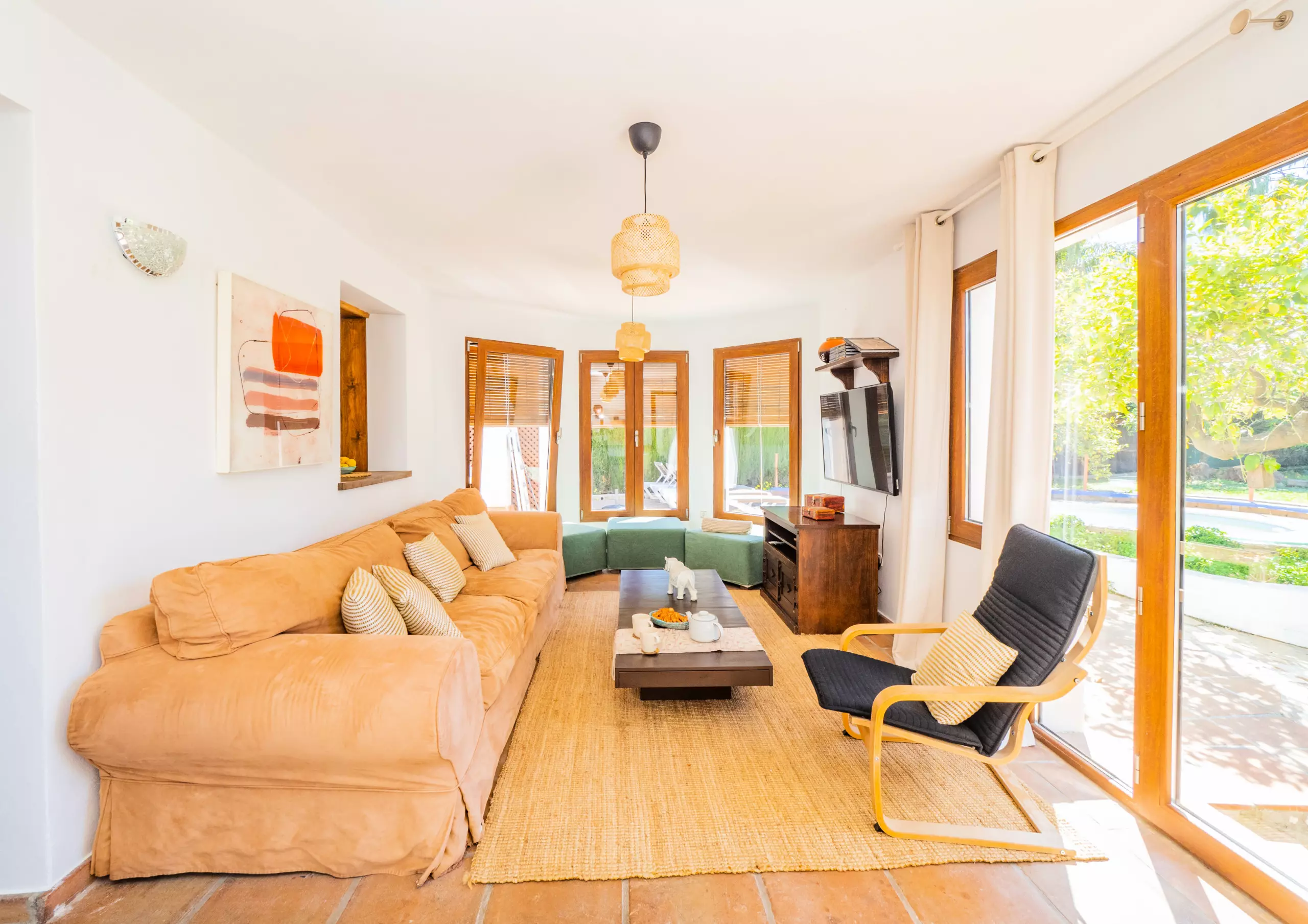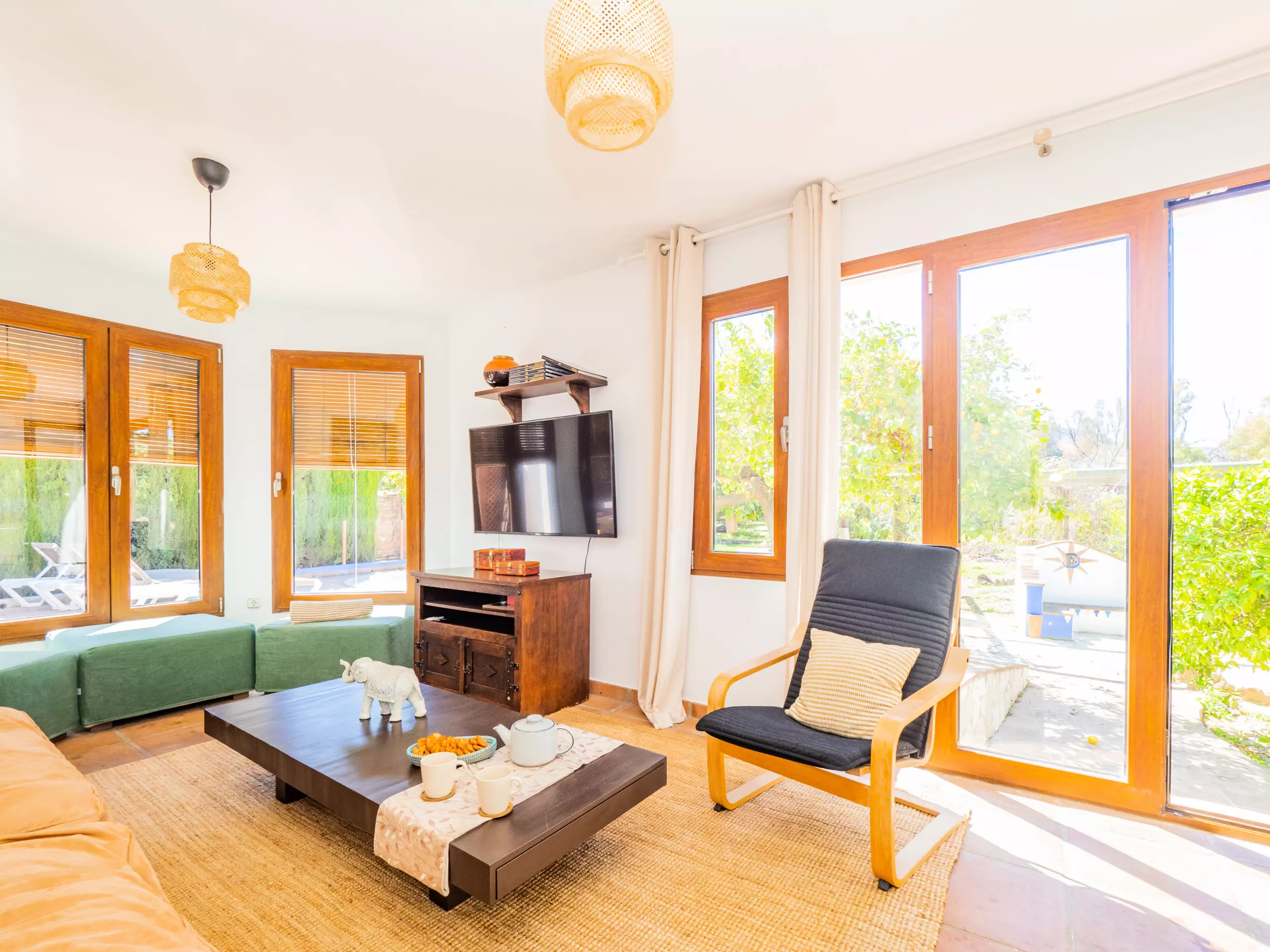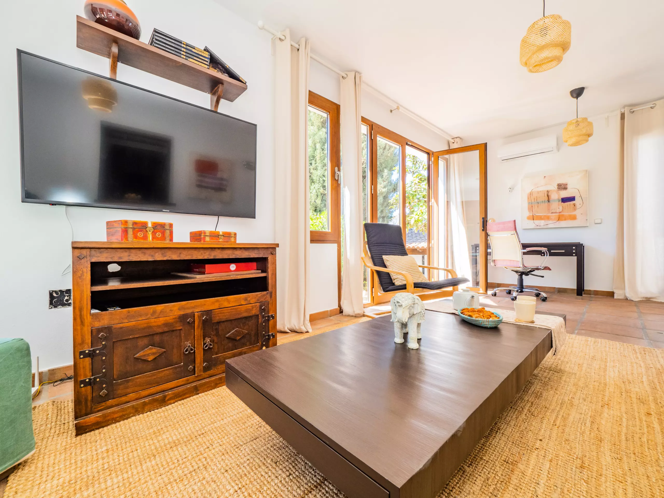 À l'intérieur de la maison, le rez-de-chaussée abrite une grande cuisine-salle à manger entièrement équipée, qui se connecte au salon lumineux avec Smart TV et vue sur le jardin et la piscine. Cet espace comprend également une zone de télétravail pour ceux qui ont besoin de maintenir leur concentration pendant leur séjour. À cet étage, il y a une chambre avec un lit de matrimoniale, des armoires et un accès à une terrasse privée, ainsi qu'une salle de bain avec une douche.