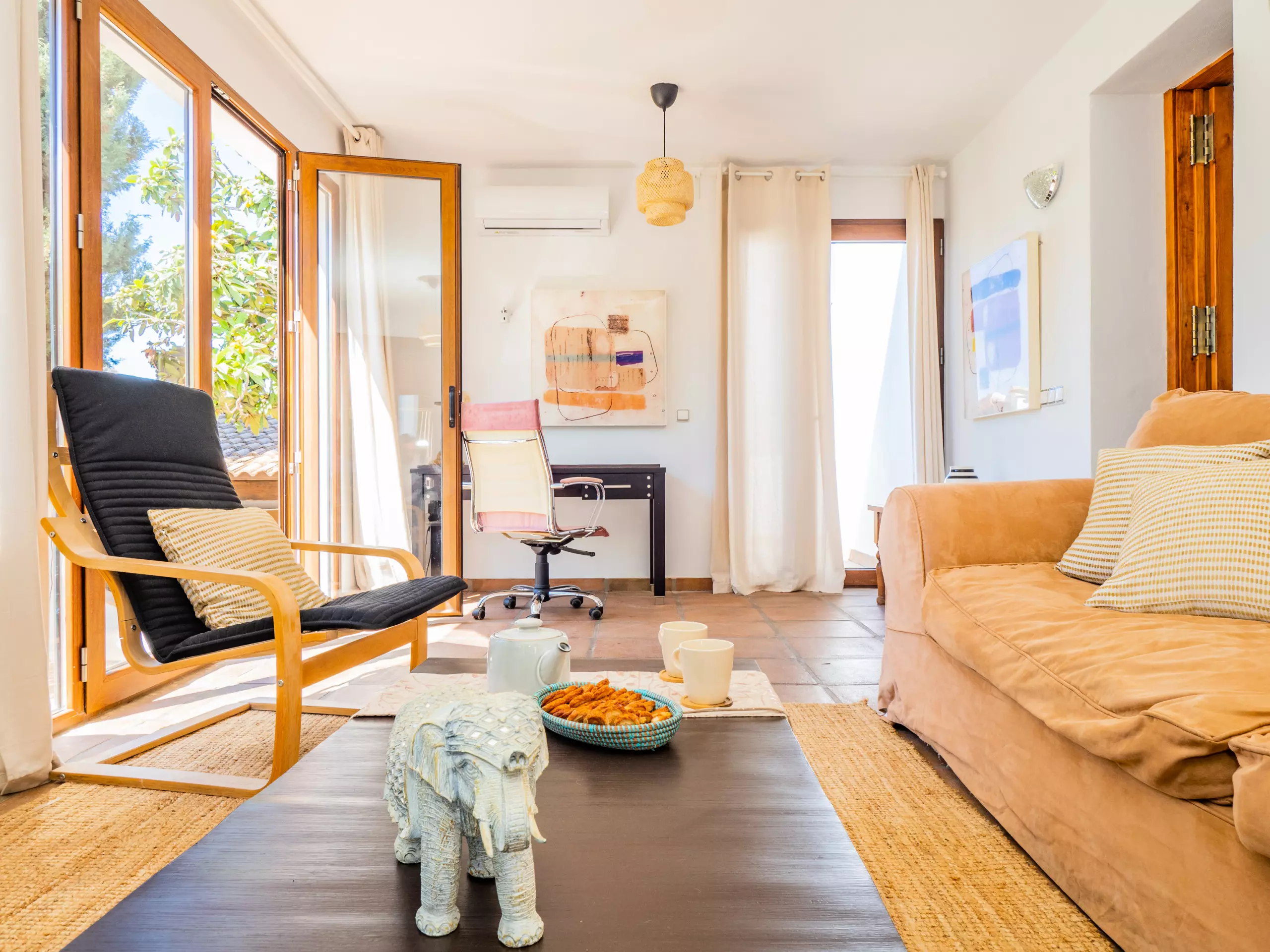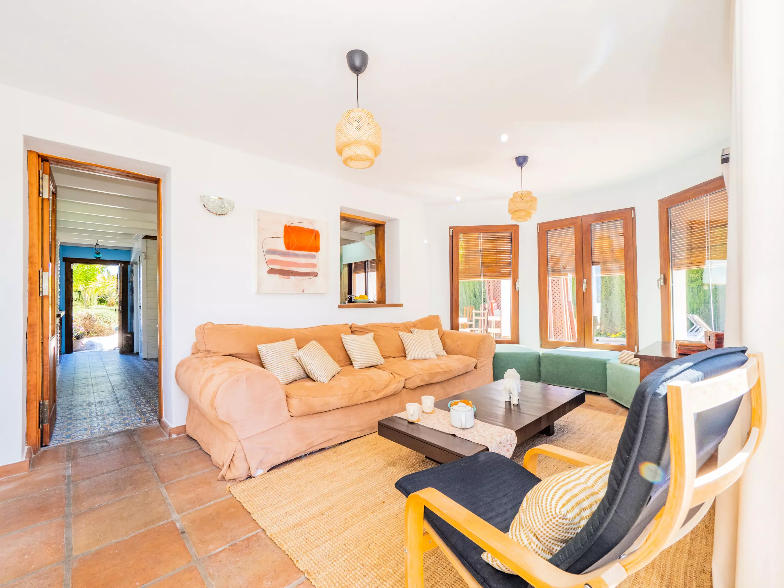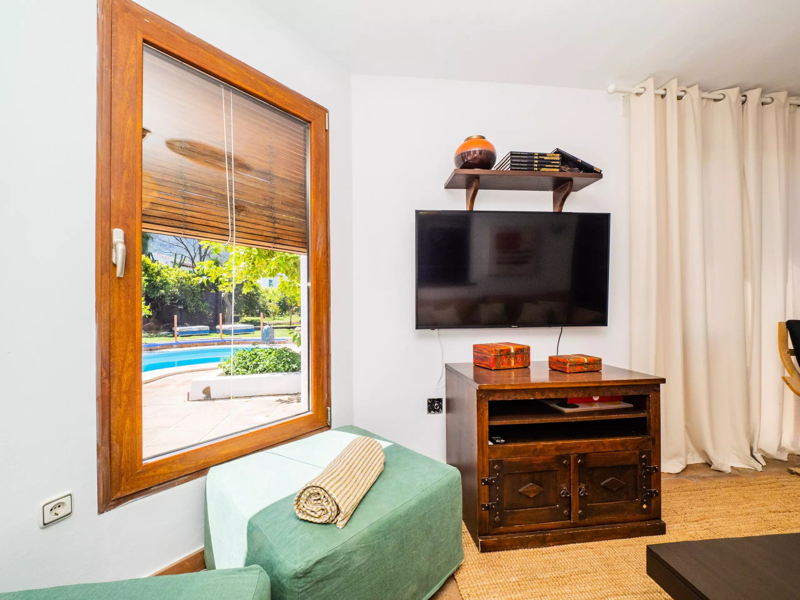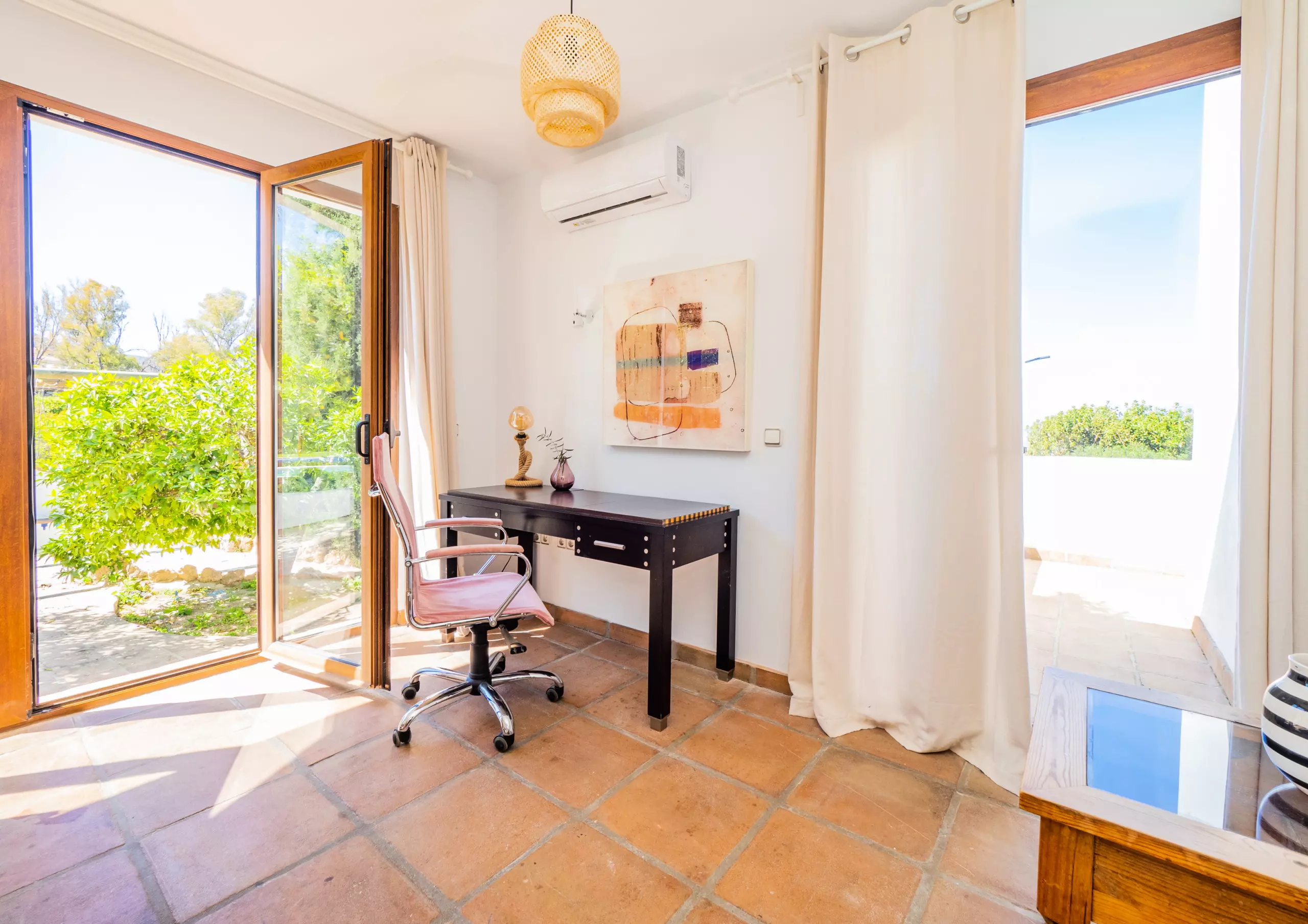 À l'intérieur de la maison, le rez-de-chaussée abrite une grande cuisine-salle à manger entièrement équipée, qui se connecte au salon lumineux avec Smart TV et vue sur le jardin et la piscine. Cet espace comprend également une zone de télétravail pour ceux qui ont besoin de maintenir leur concentration pendant leur séjour. À cet étage, il y a une chambre avec un lit de matrimoniale, des armoires et un accès à une terrasse privée, ainsi qu'une salle de bain avec une douche.