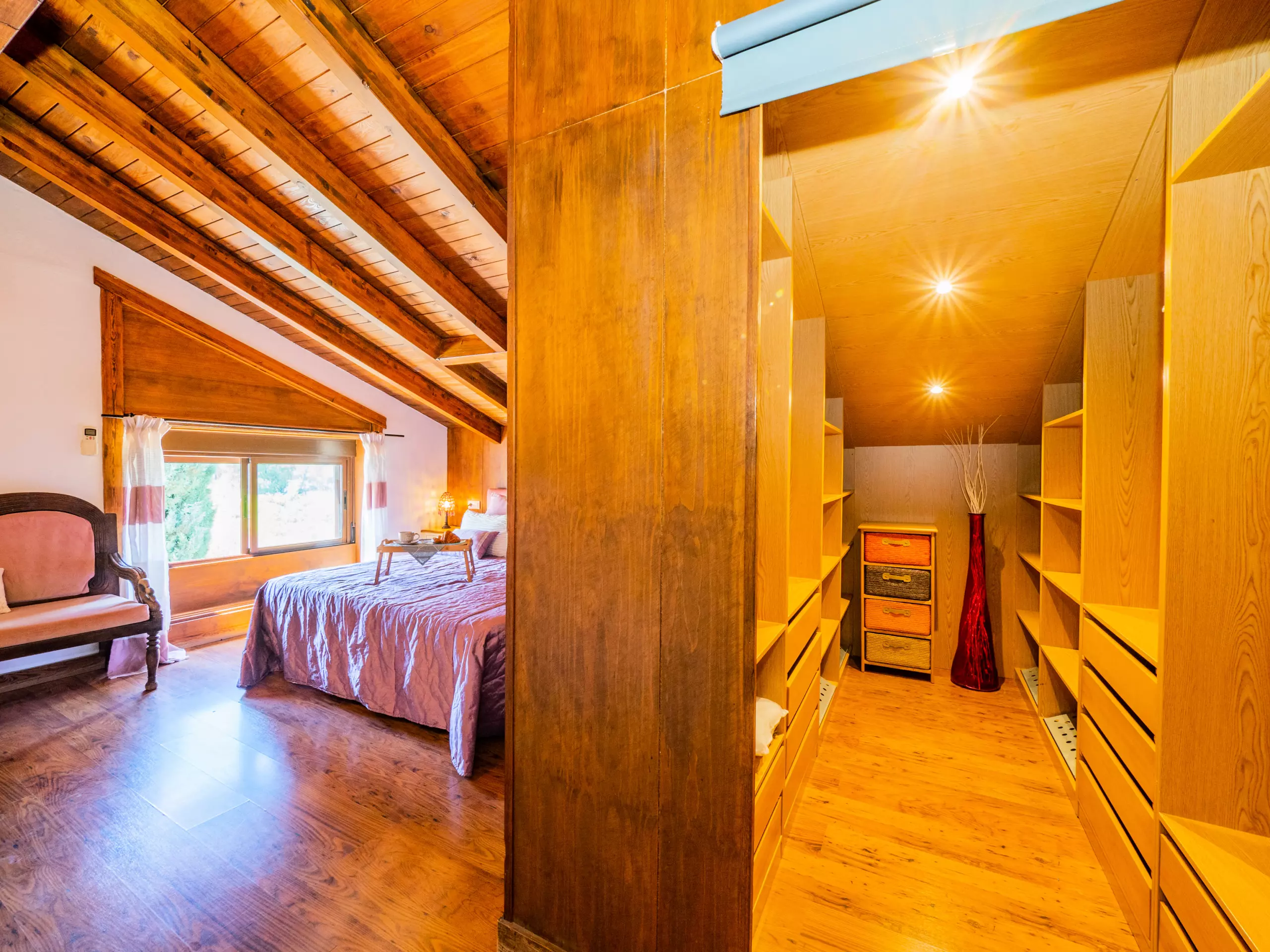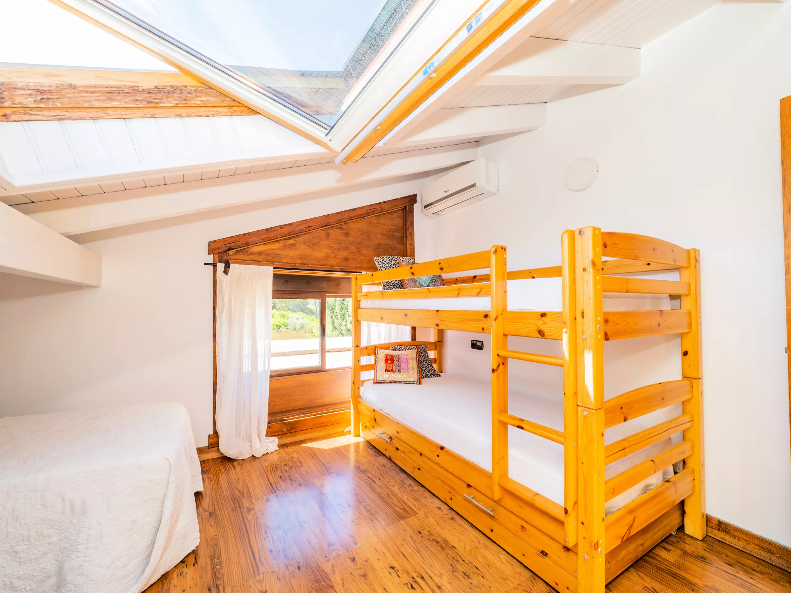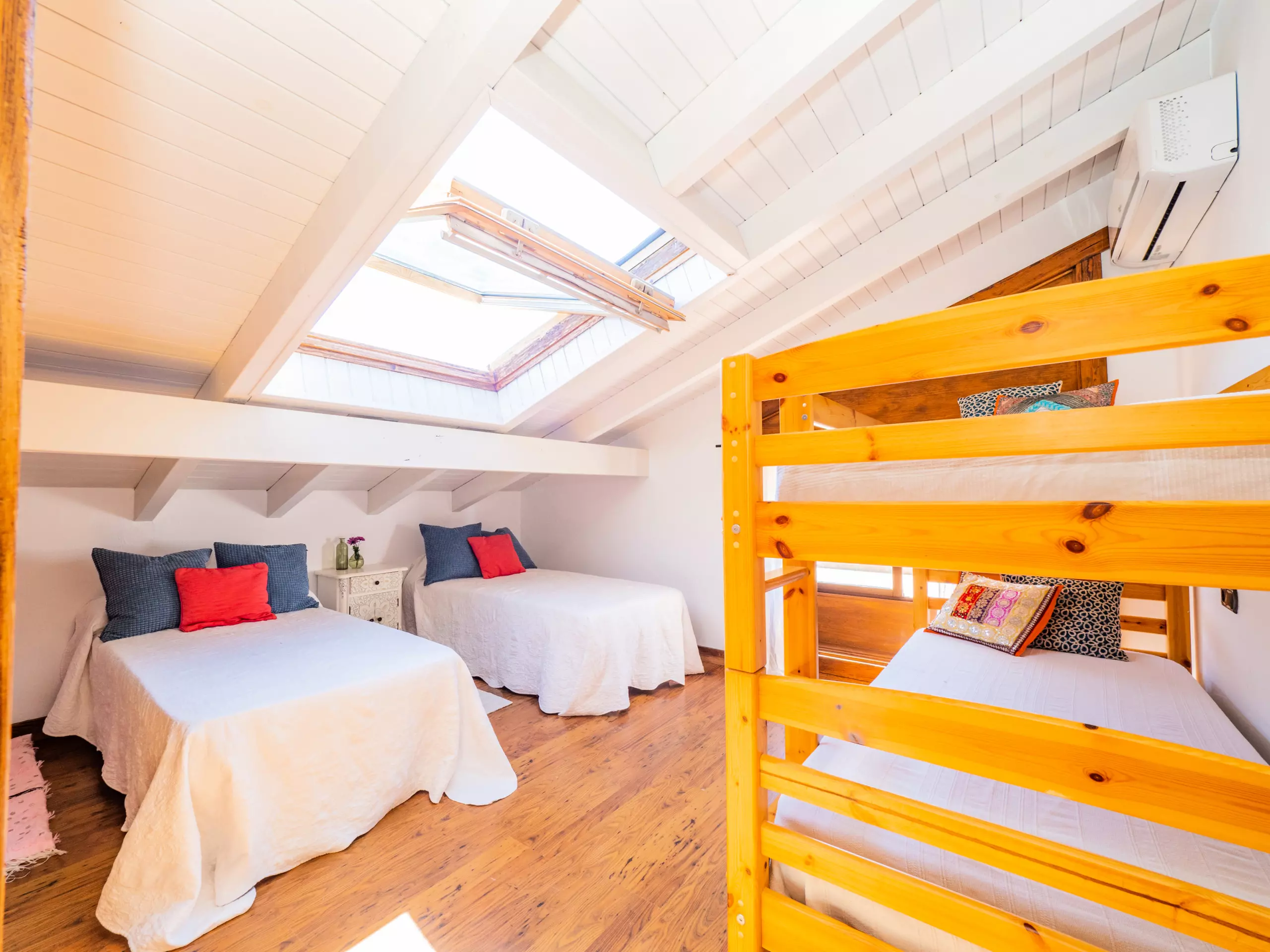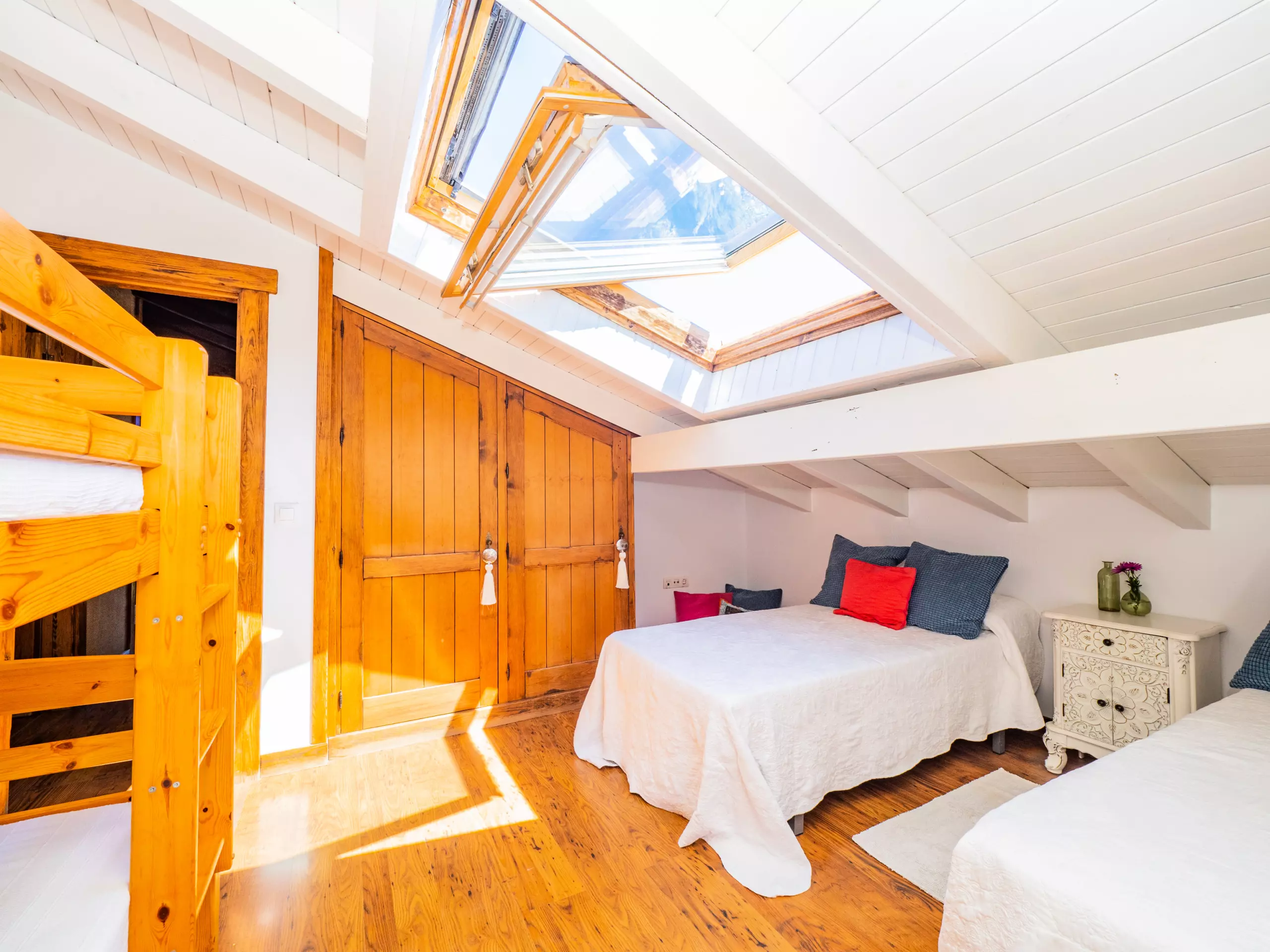 À l'étage supérieur, avec des plafonds mansardés, vous trouverez deux chambres : l'une avec un lit de couple et un dressing, et l'autre idéale pour les enfants avec deux lits individuels et un lit superposé. Ici, vous disposez également d'une deuxième salle de bain avec une douche. La maison est équipée d'une connexion wifi gratuite pour vous maintenir toujours connecté.