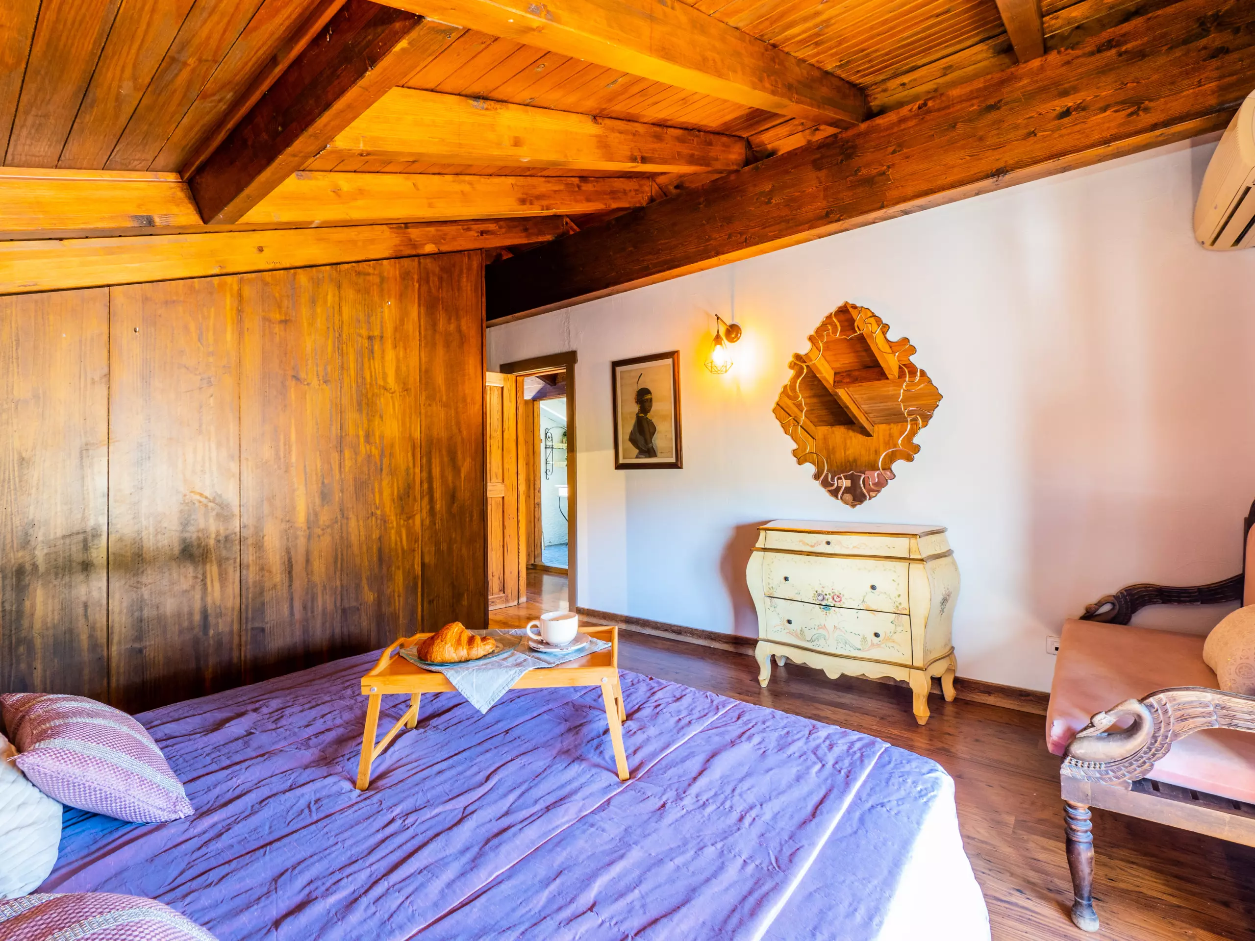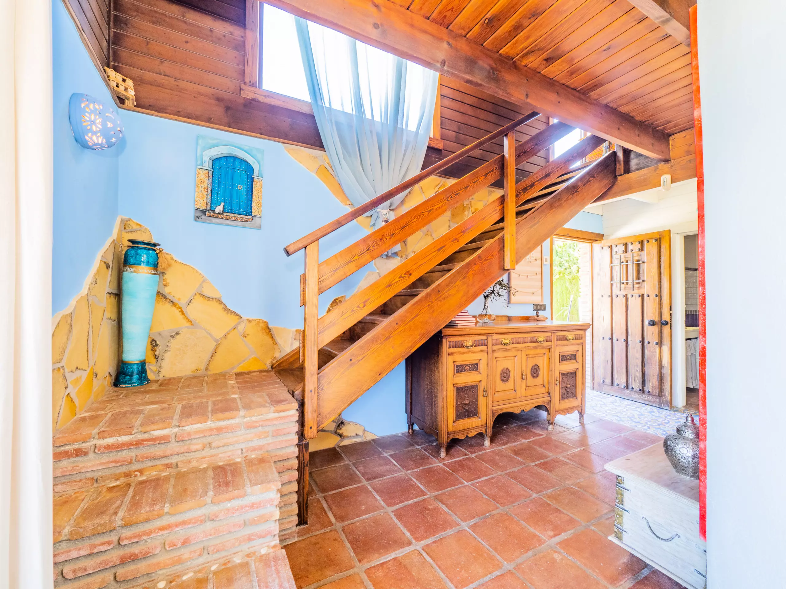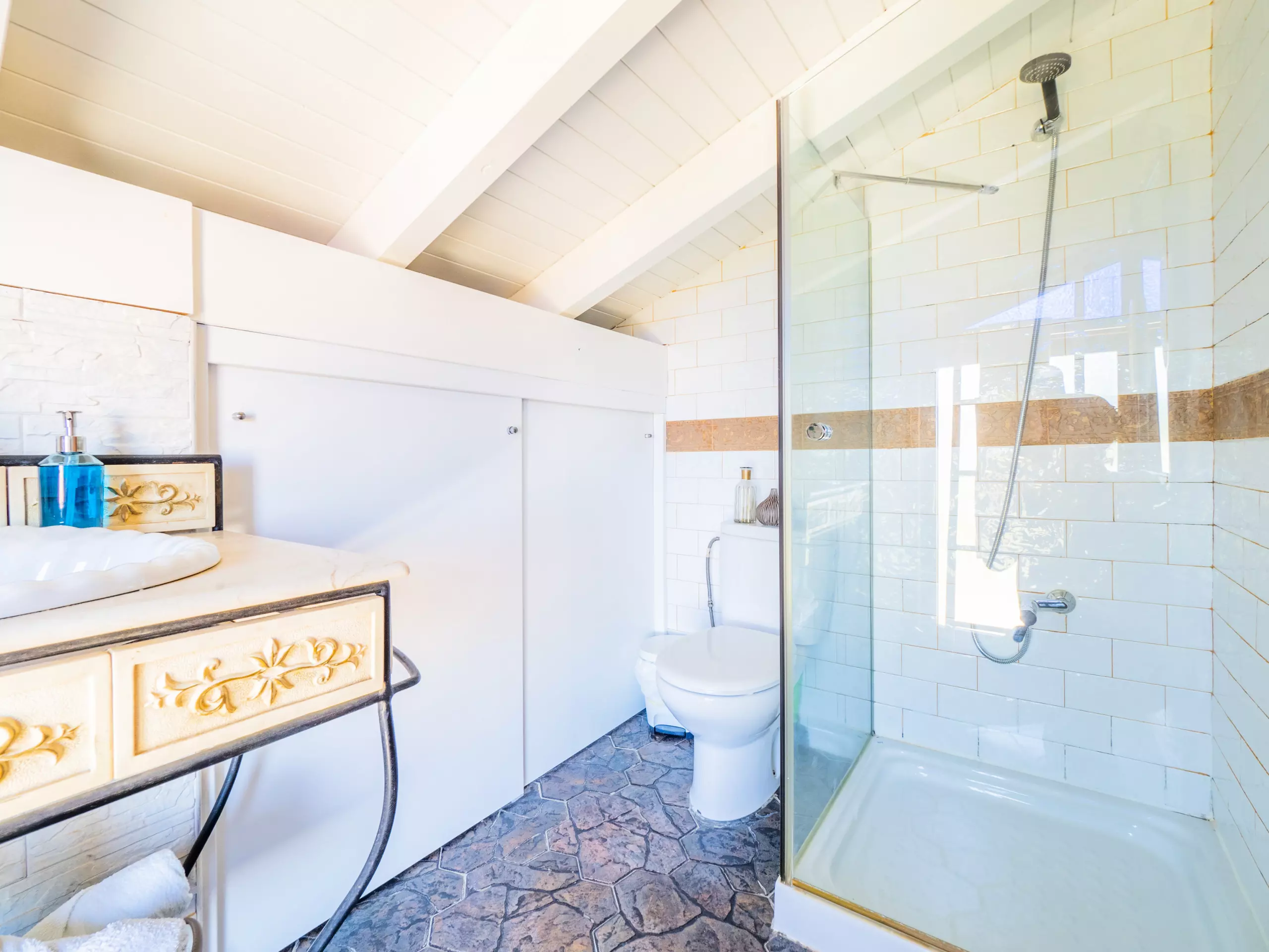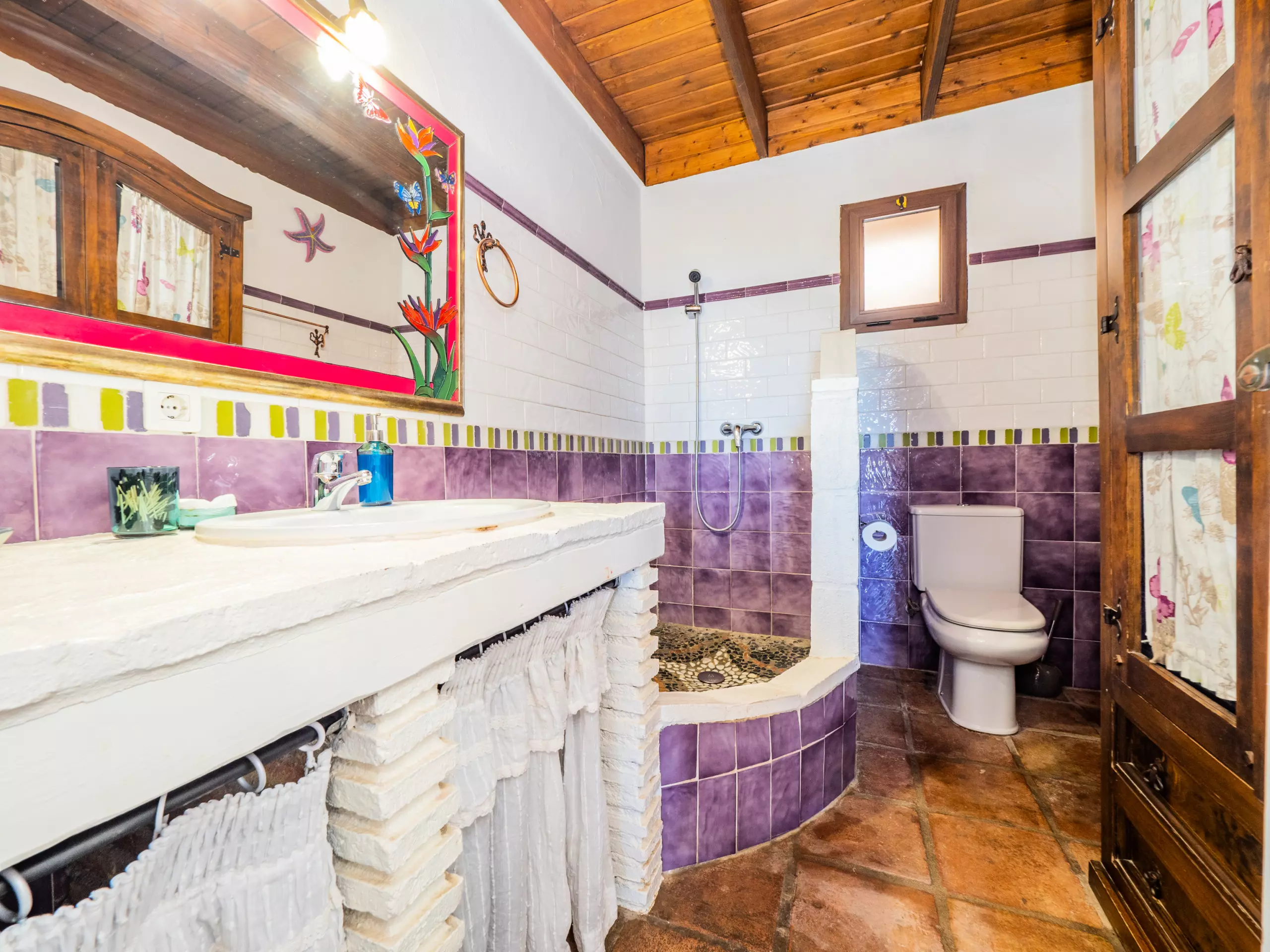 À l'étage supérieur, avec des plafonds mansardés, vous trouverez deux chambres : l'une avec un lit de couple et un dressing, et l'autre idéale pour les enfants avec deux lits individuels et un lit superposé. Ici, vous disposez également d'une deuxième salle de bain avec une douche. La maison est équipée d'une connexion wifi gratuite pour vous maintenir toujours connecté.