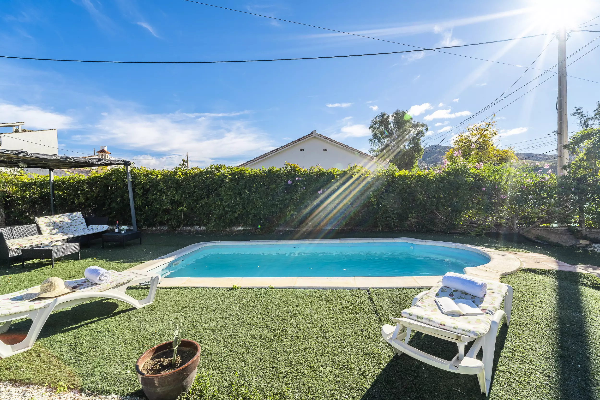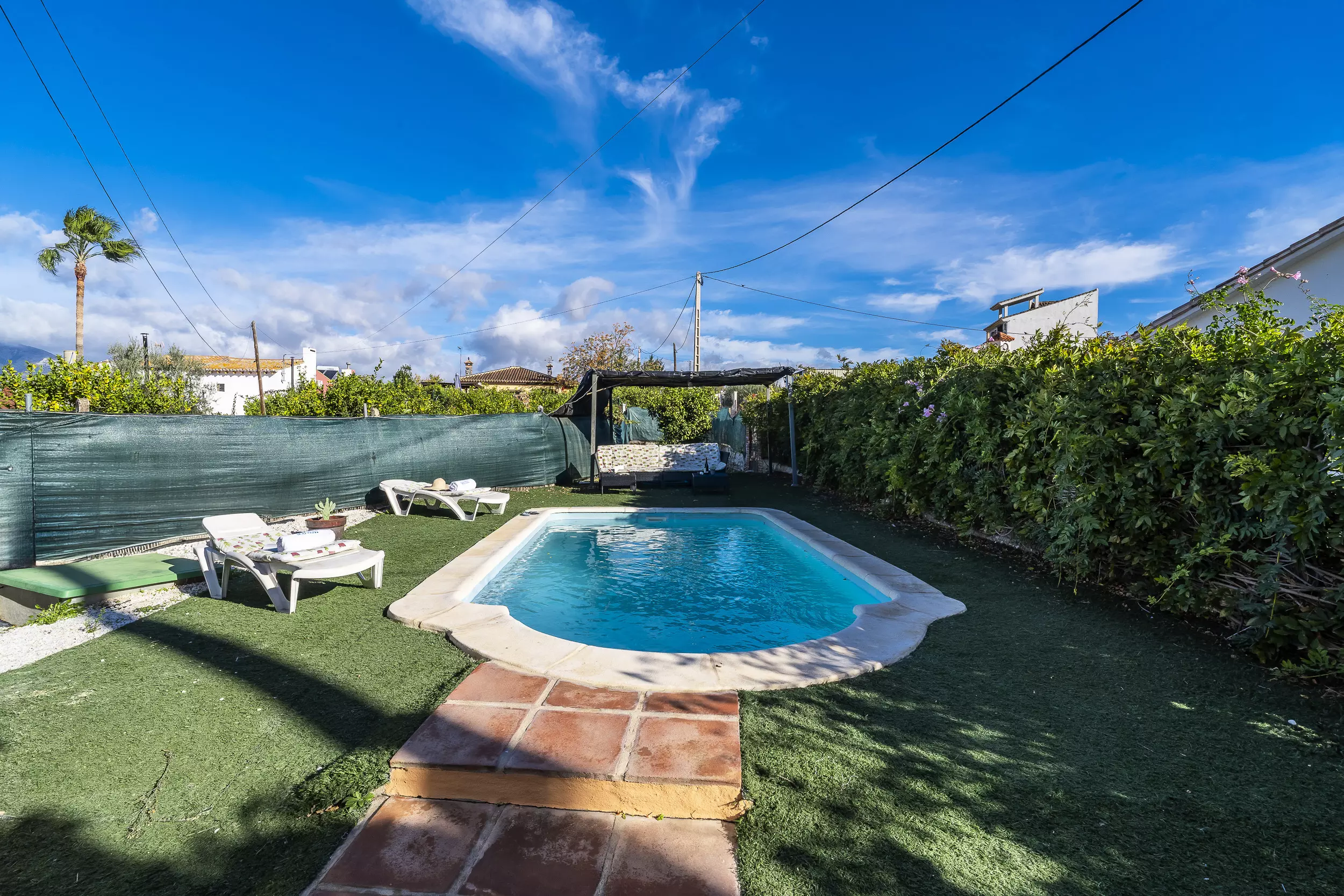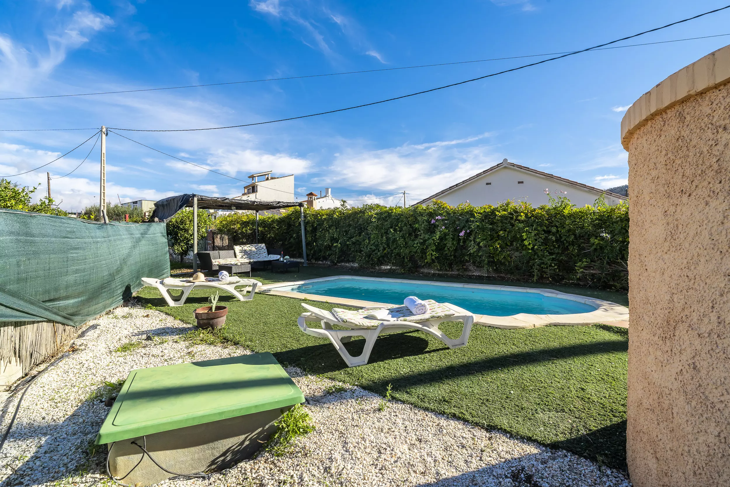 ? Piscine privée clôturée avec chaises longues et grande terrasse meublée pour manger en plein air.