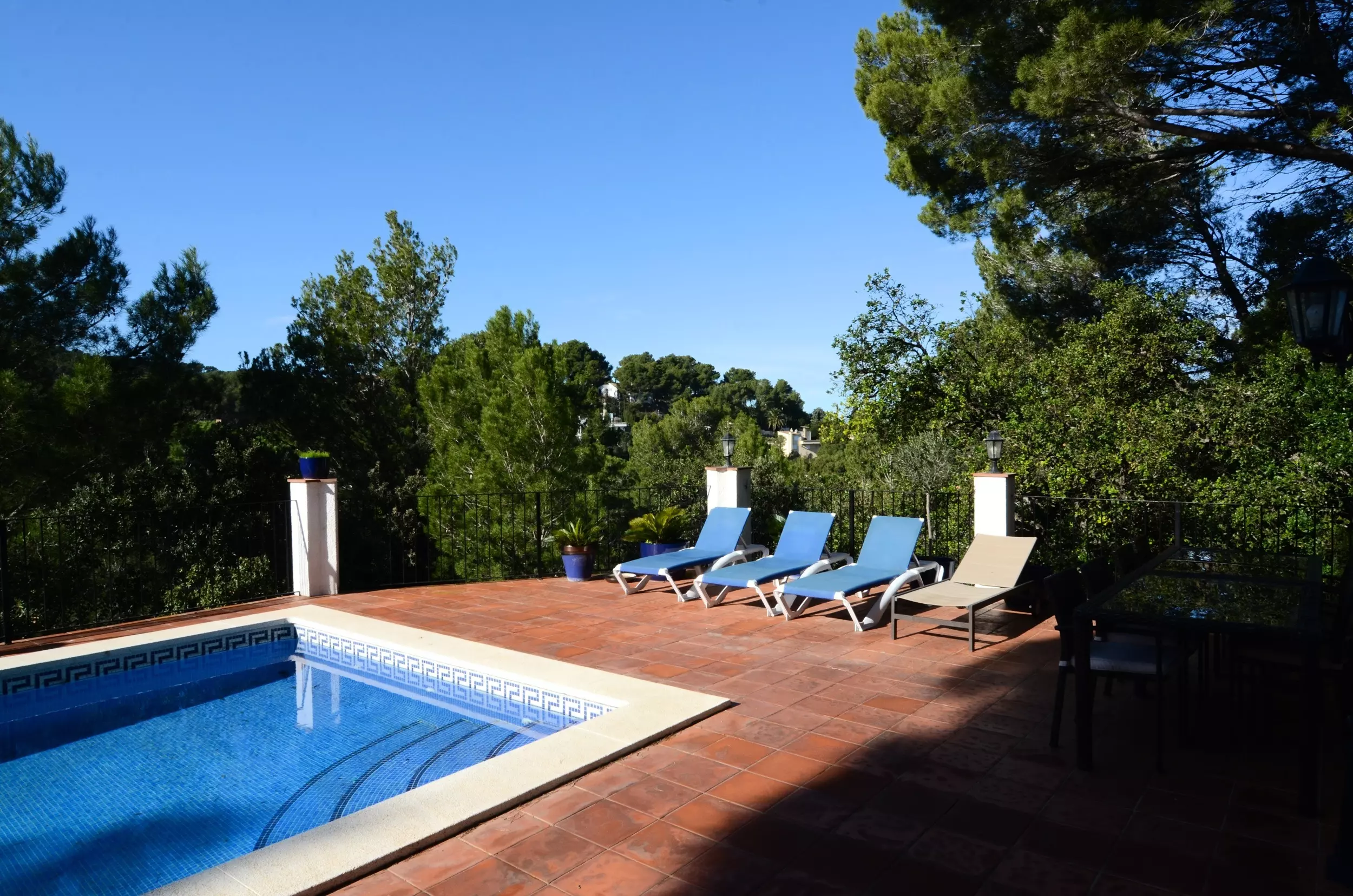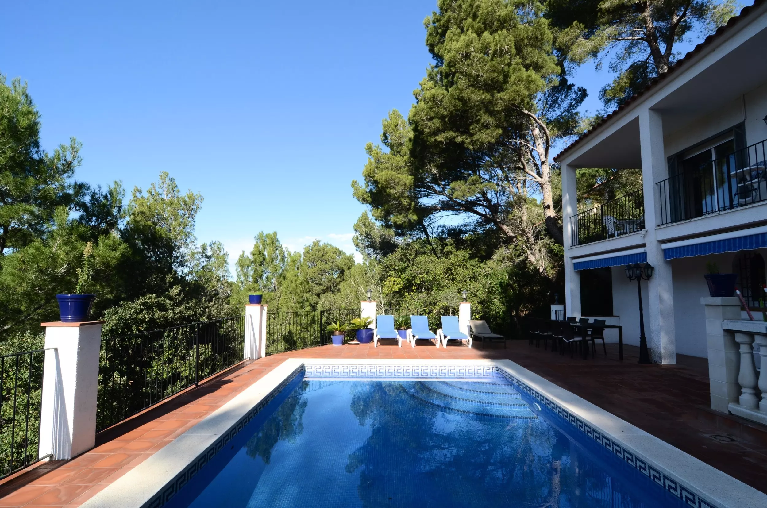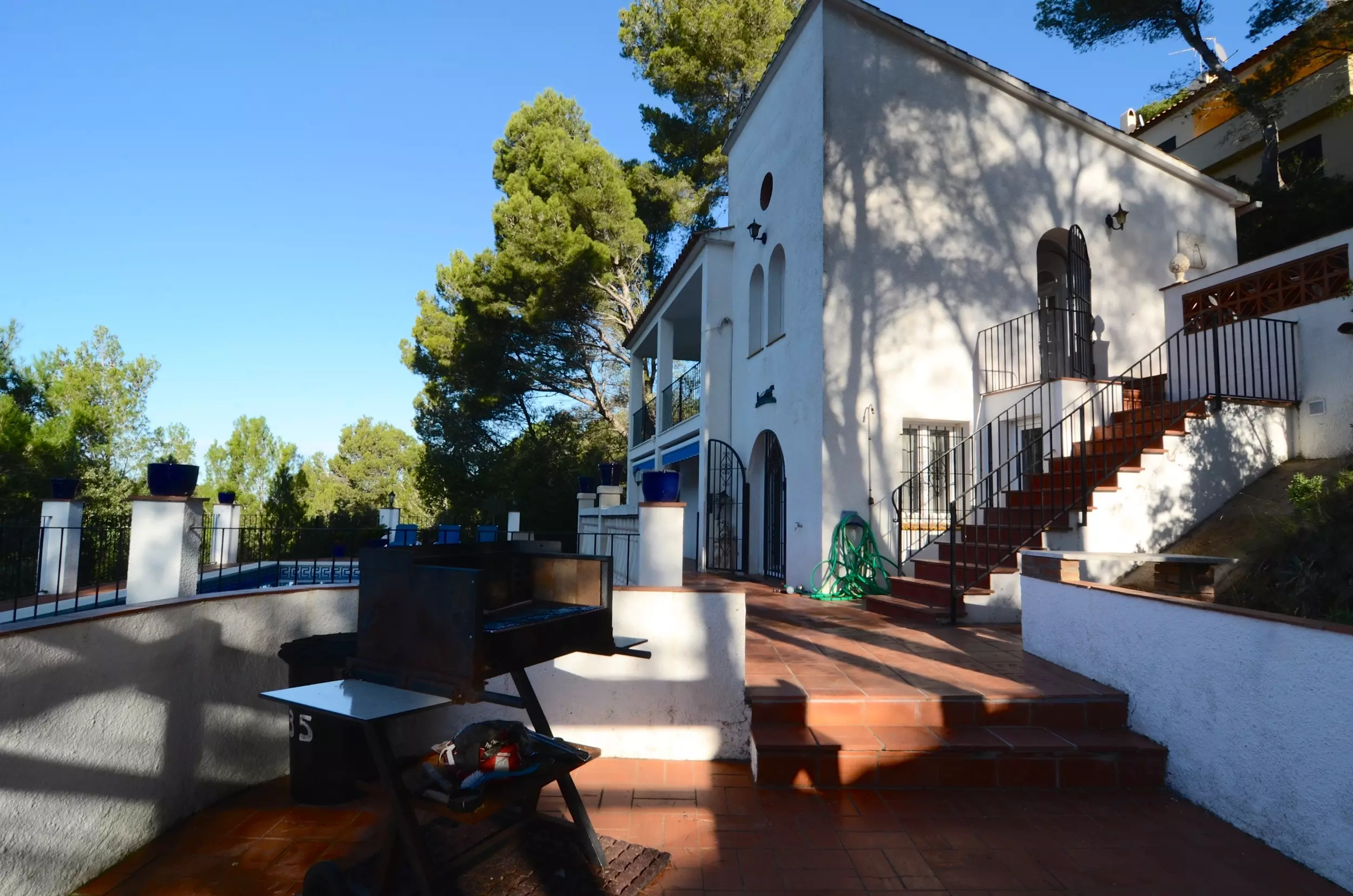 Zone extérieure fantastique avec piscine privée, chaises longues, table pour manger en plein air, zone chill out et barbecue.