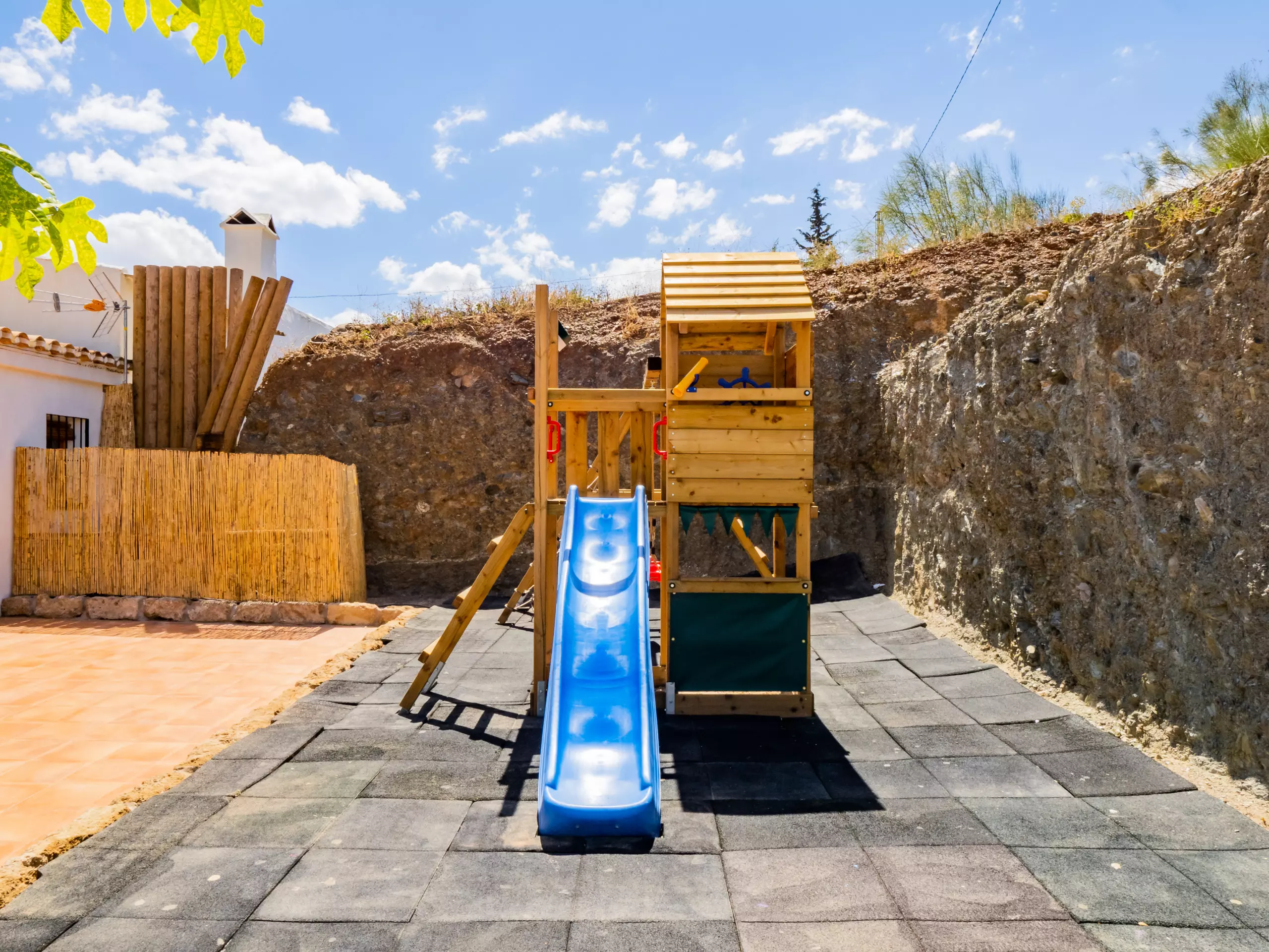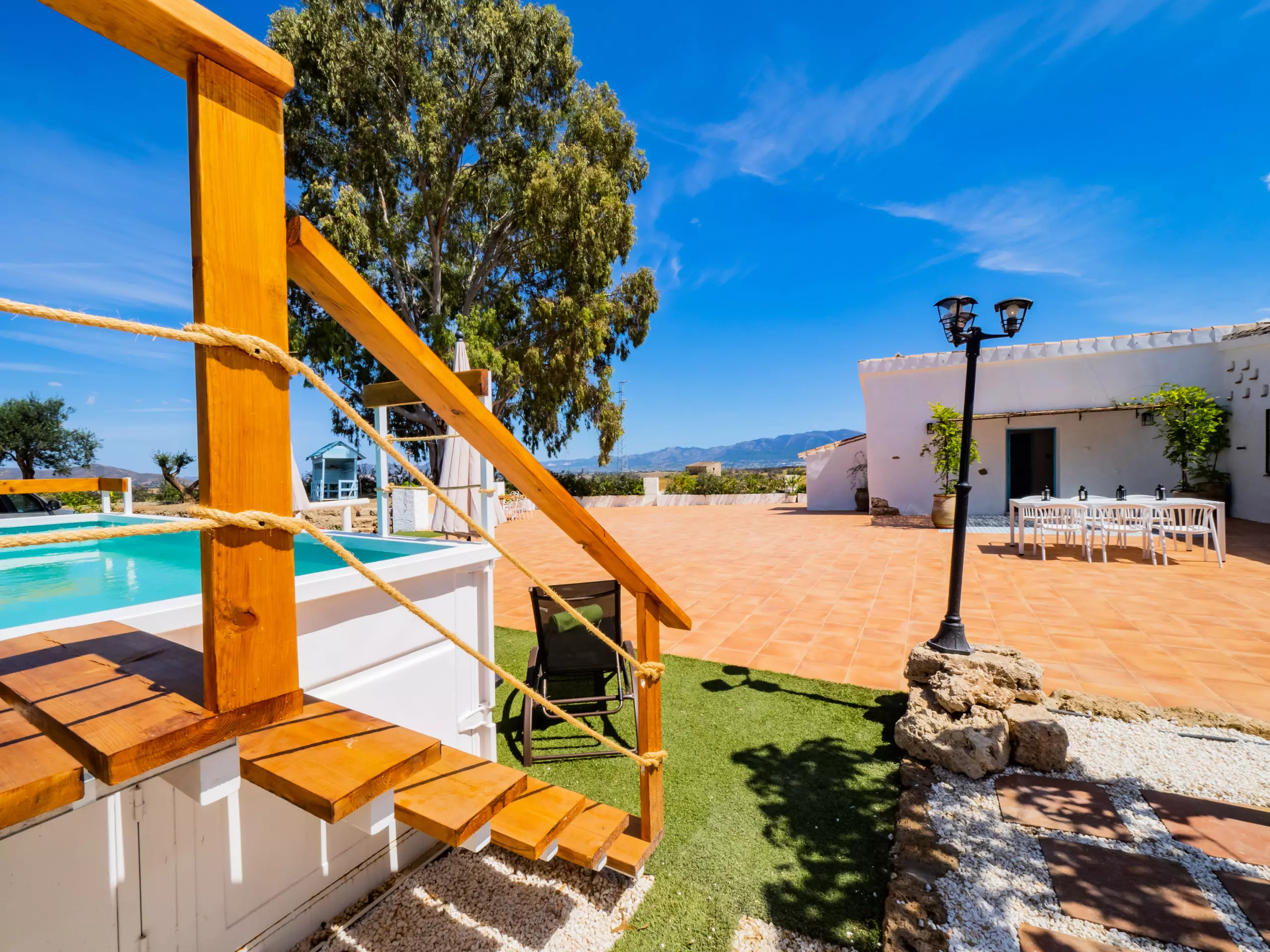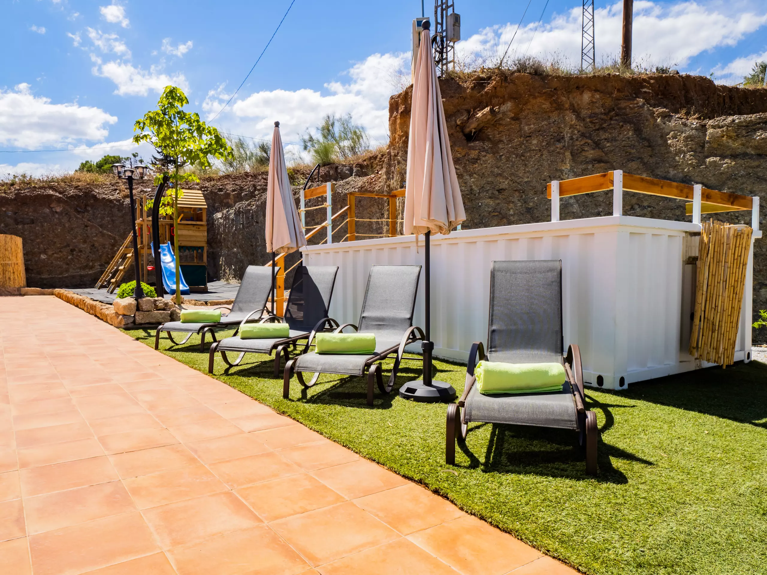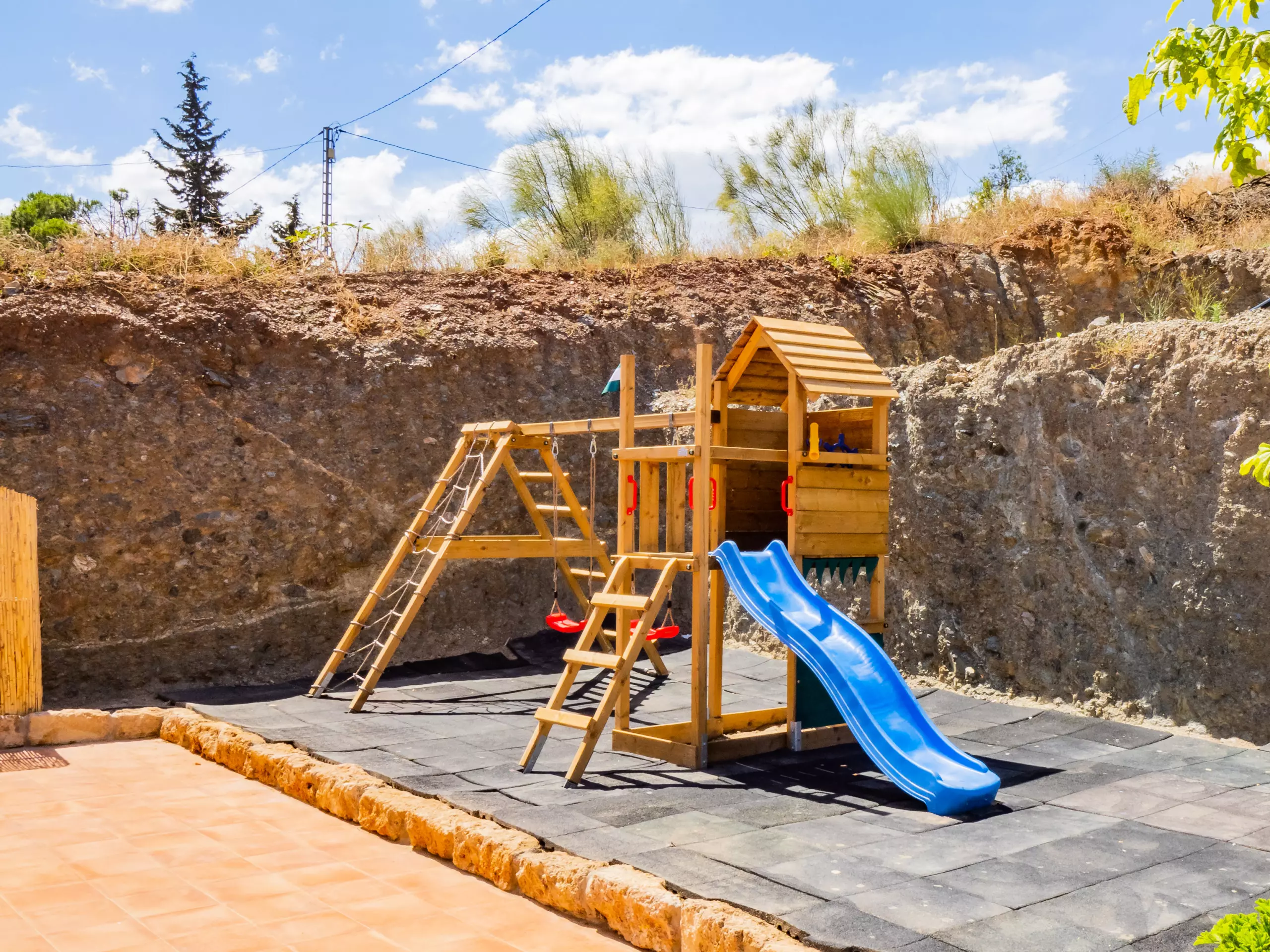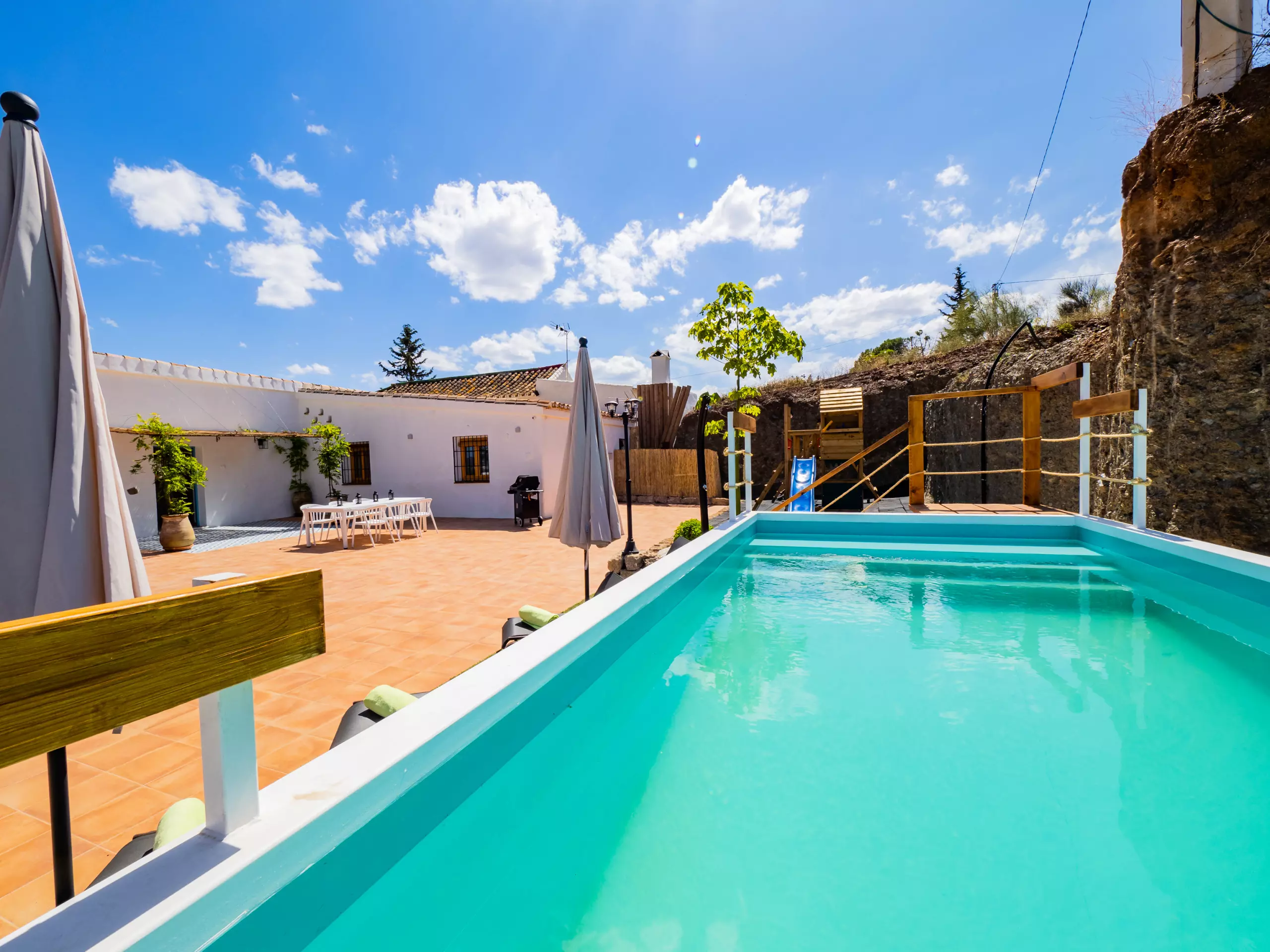 Les extérieurs sont un grand attrait : une piscine recyclée peu profonde (moins de 90 cm) avec un accès sécurisé par un escalier en bois, idéale pour les enfants et se rafraîchir en famille. L'aire de jeux est de haute qualité, avec un sol rembourré et plusieurs attractions, visible depuis presque toute la zone extérieure pour la tranquillité des parents. La nuit, la faible pollution lumineuse permet de profiter d'une vue étoilée merveilleuse, créant une ambiance unique pour les retrouvailles familiales.