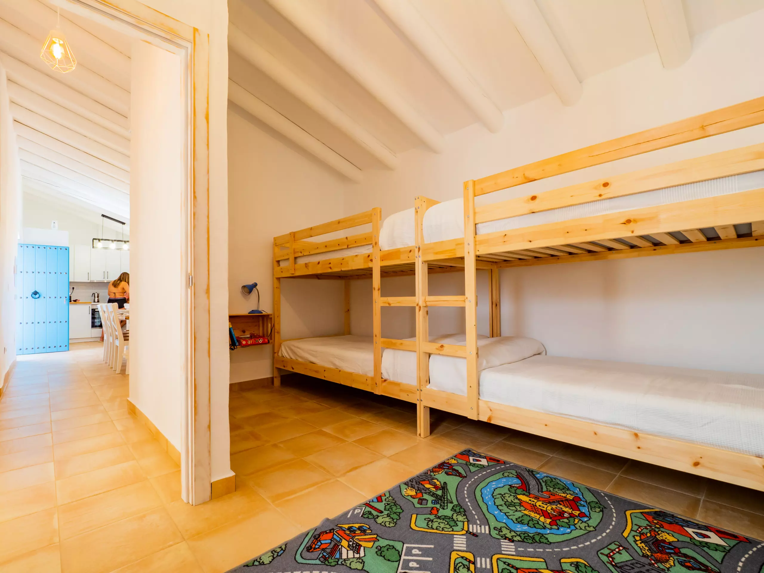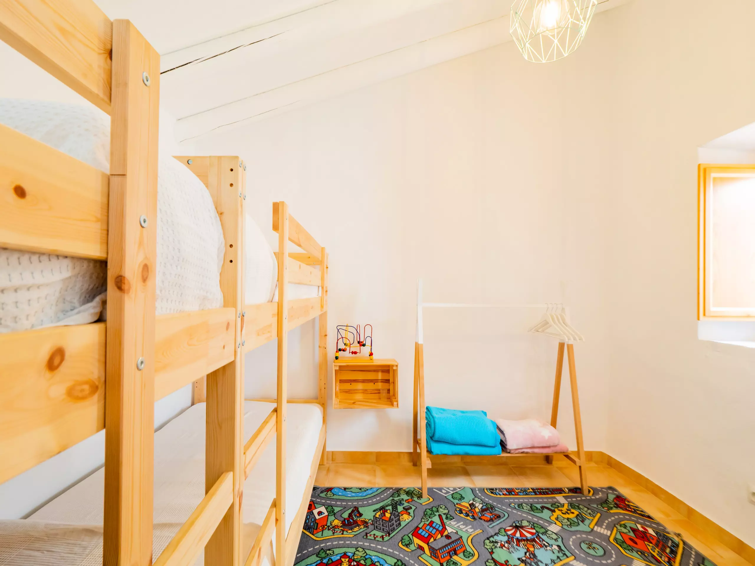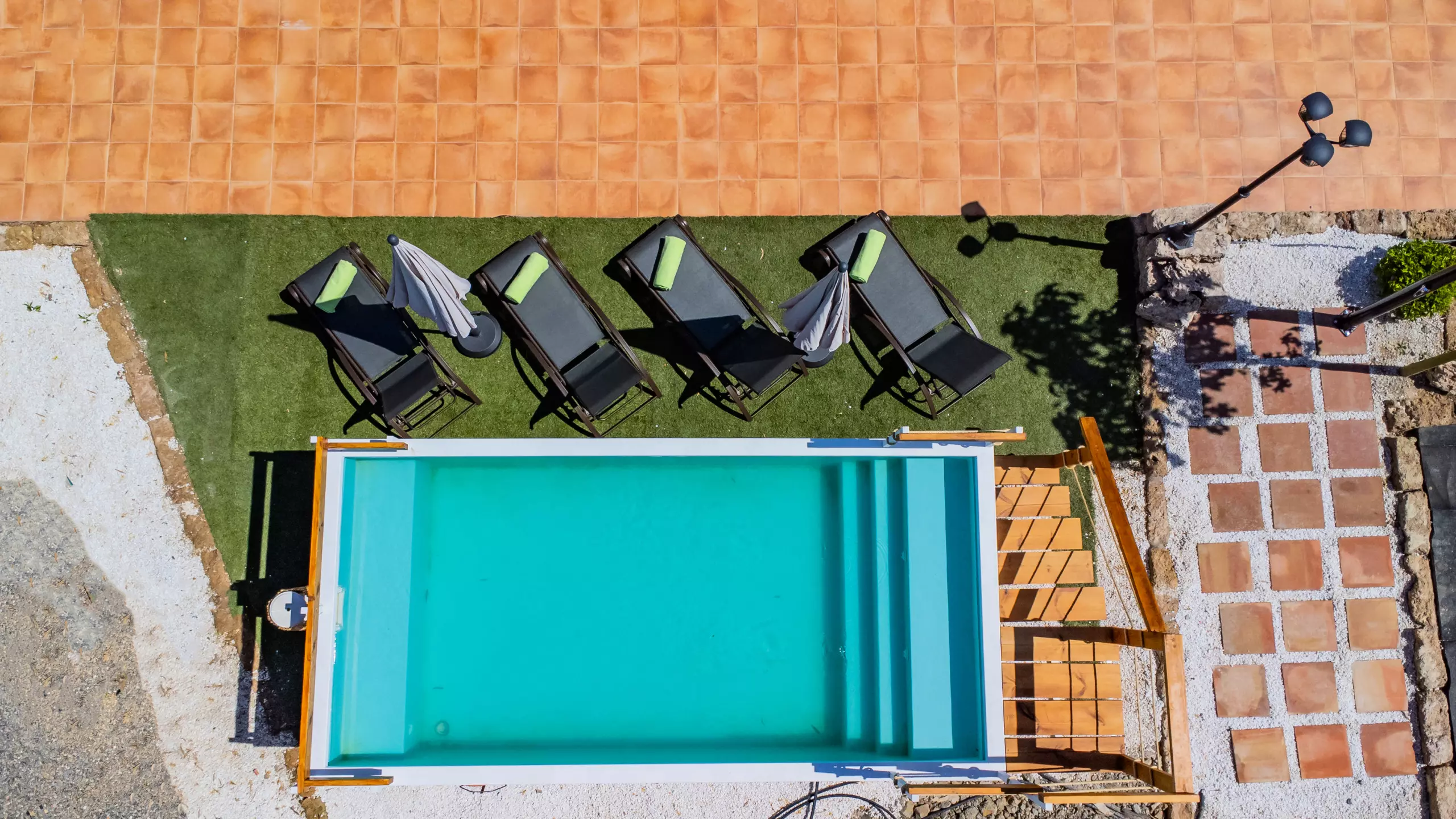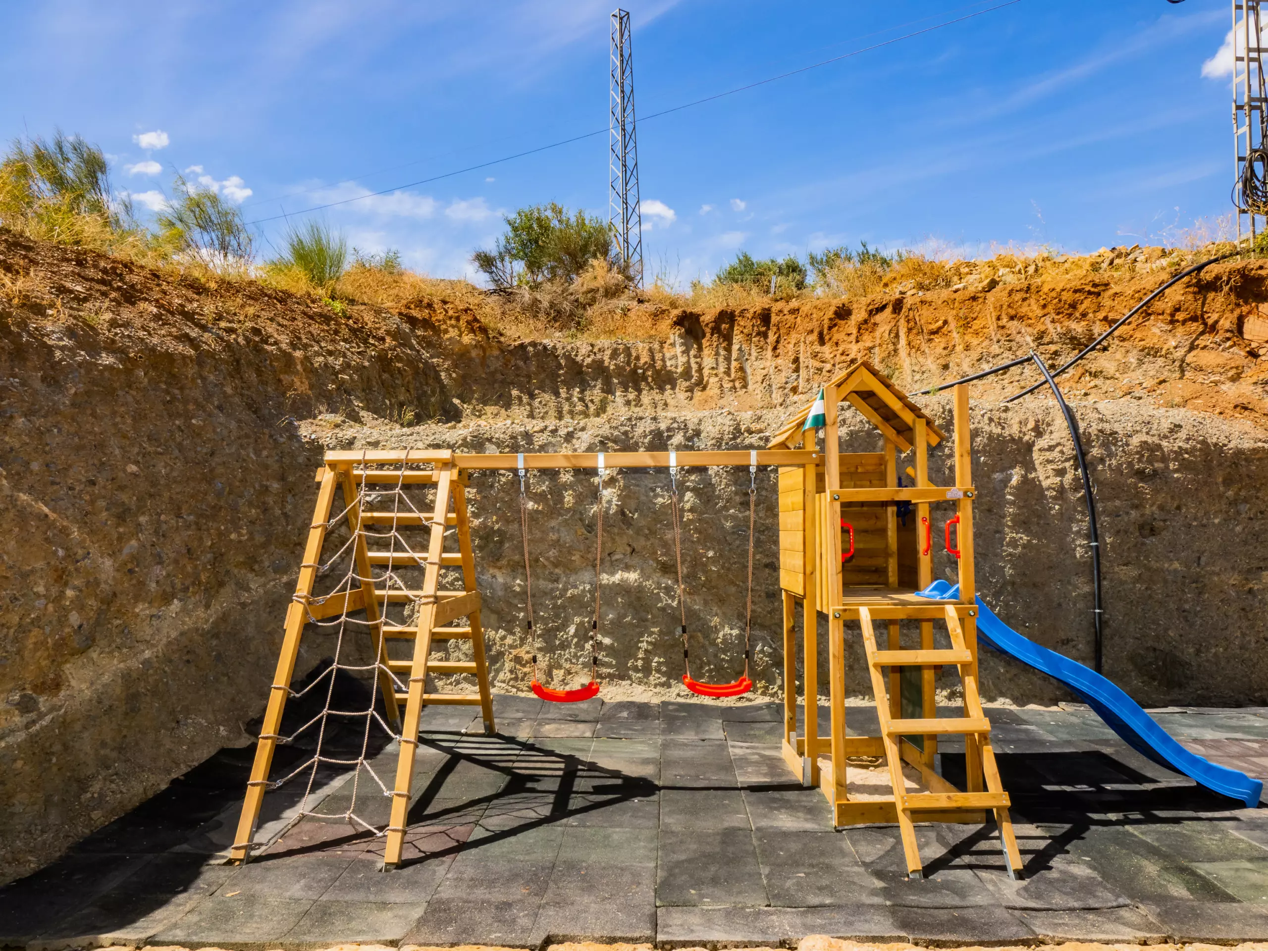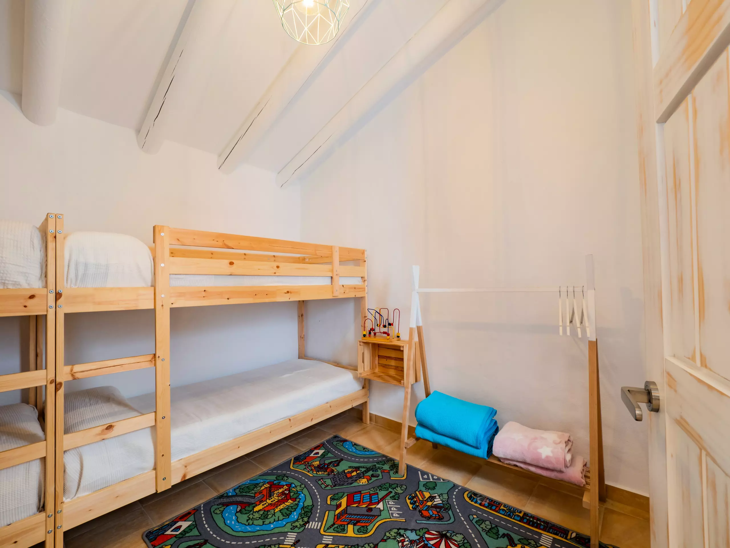 Les extérieurs sont un grand attrait : une piscine recyclée peu profonde (moins de 90 cm) avec un accès sécurisé par un escalier en bois, idéale pour les enfants et se rafraîchir en famille. L'aire de jeux est de haute qualité, avec un sol rembourré et plusieurs attractions, visible depuis presque toute la zone extérieure pour la tranquillité des parents. La nuit, la faible pollution lumineuse permet de profiter d'une vue étoilée merveilleuse, créant une ambiance unique pour les retrouvailles familiales.