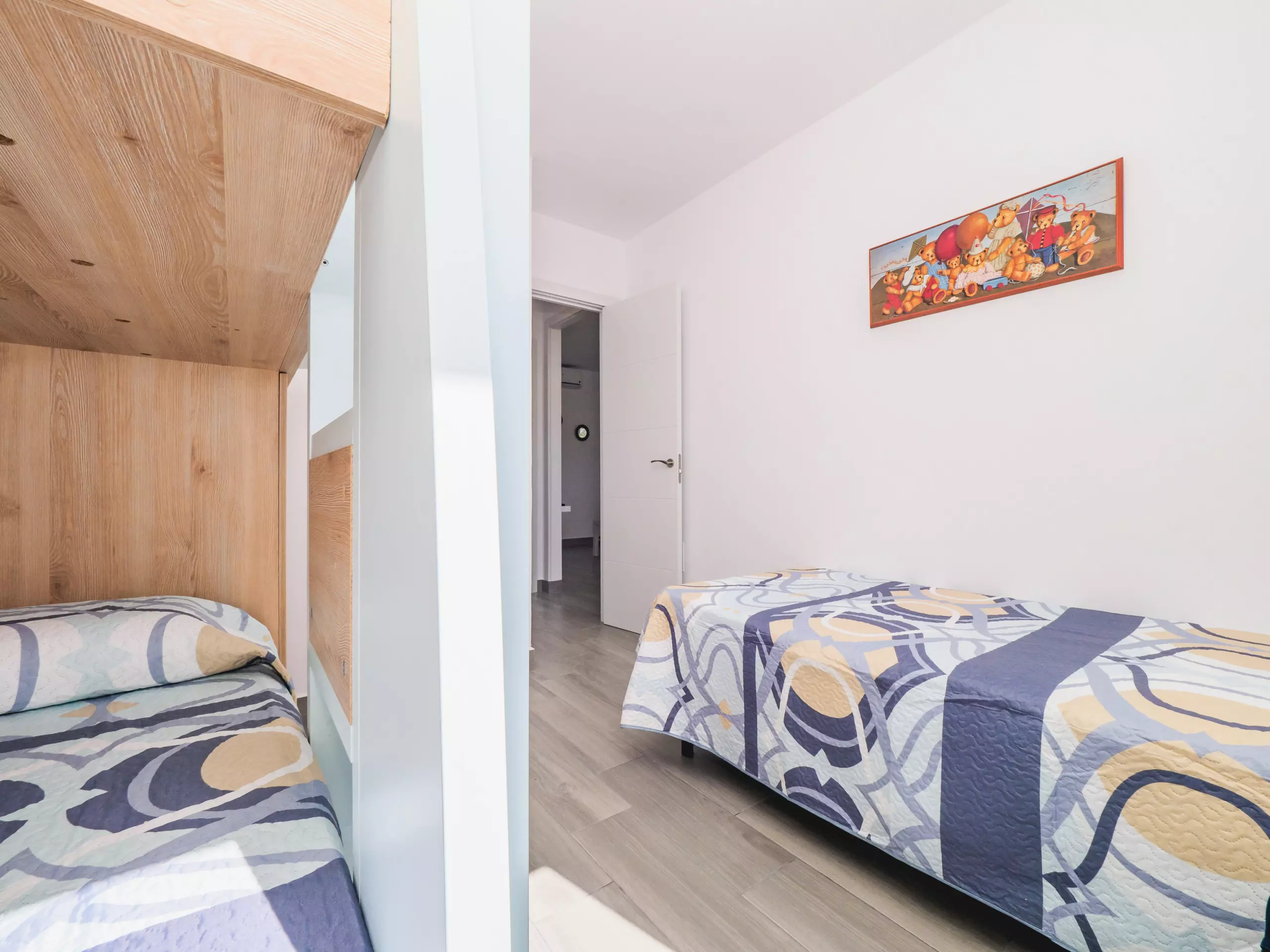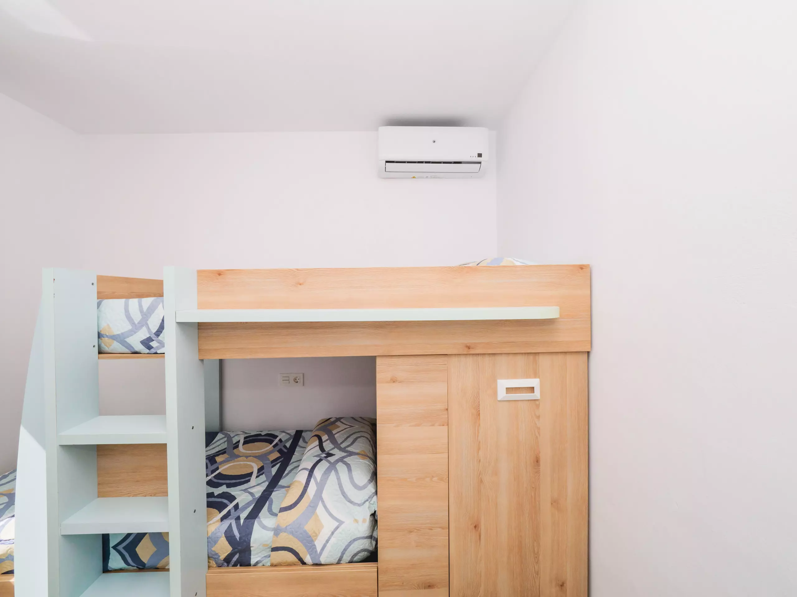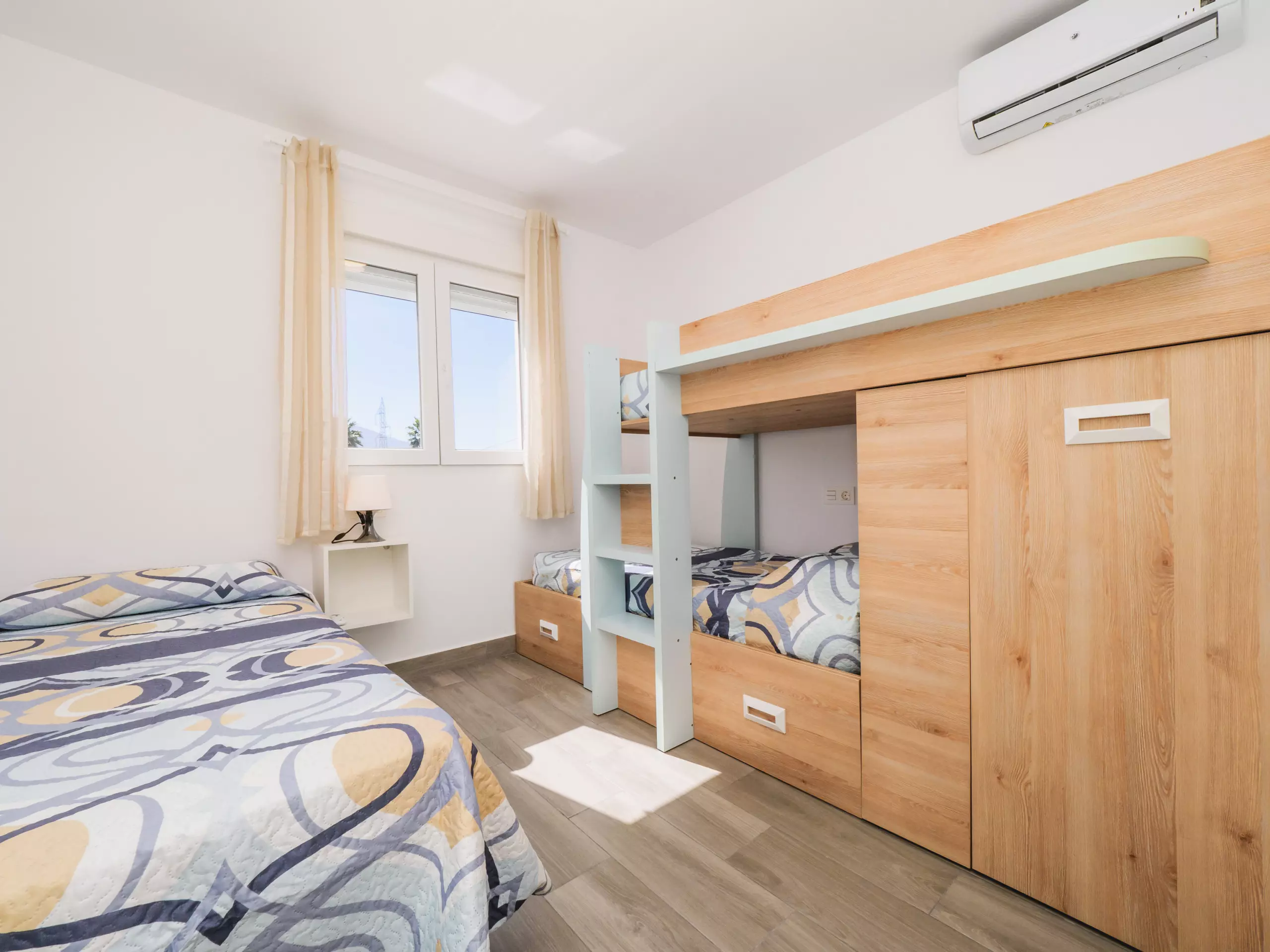 La distribution du logement comprend deux chambres avec climatisation, fenêtres donnant sur l'extérieur et espace de rangement pour les bagages : une avec un lit double et l'autre avec un lit simple et un lit superposé, parfait pour les familles ou les groupes d'amis. La salle de bain dispose d'une douche et se trouve dans une zone commune pour un accès facile.