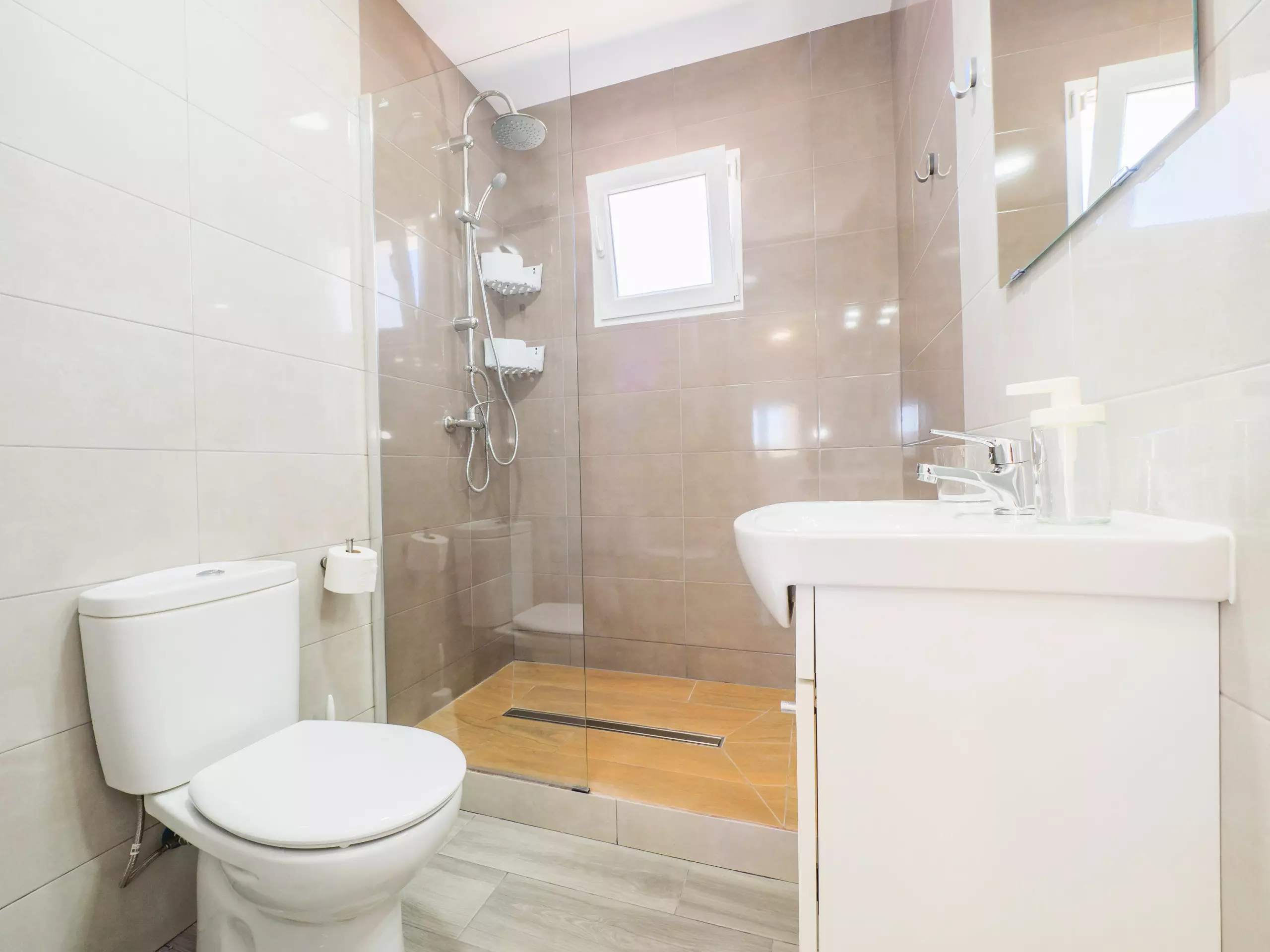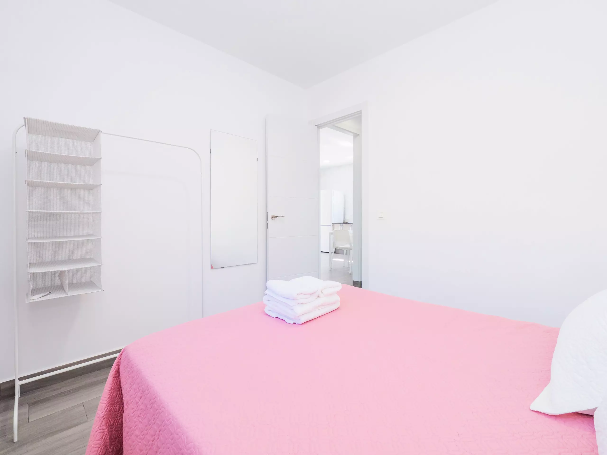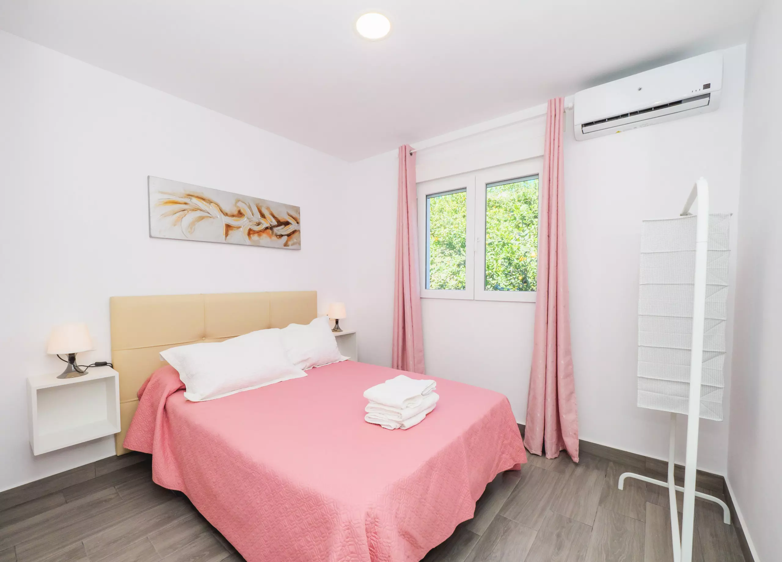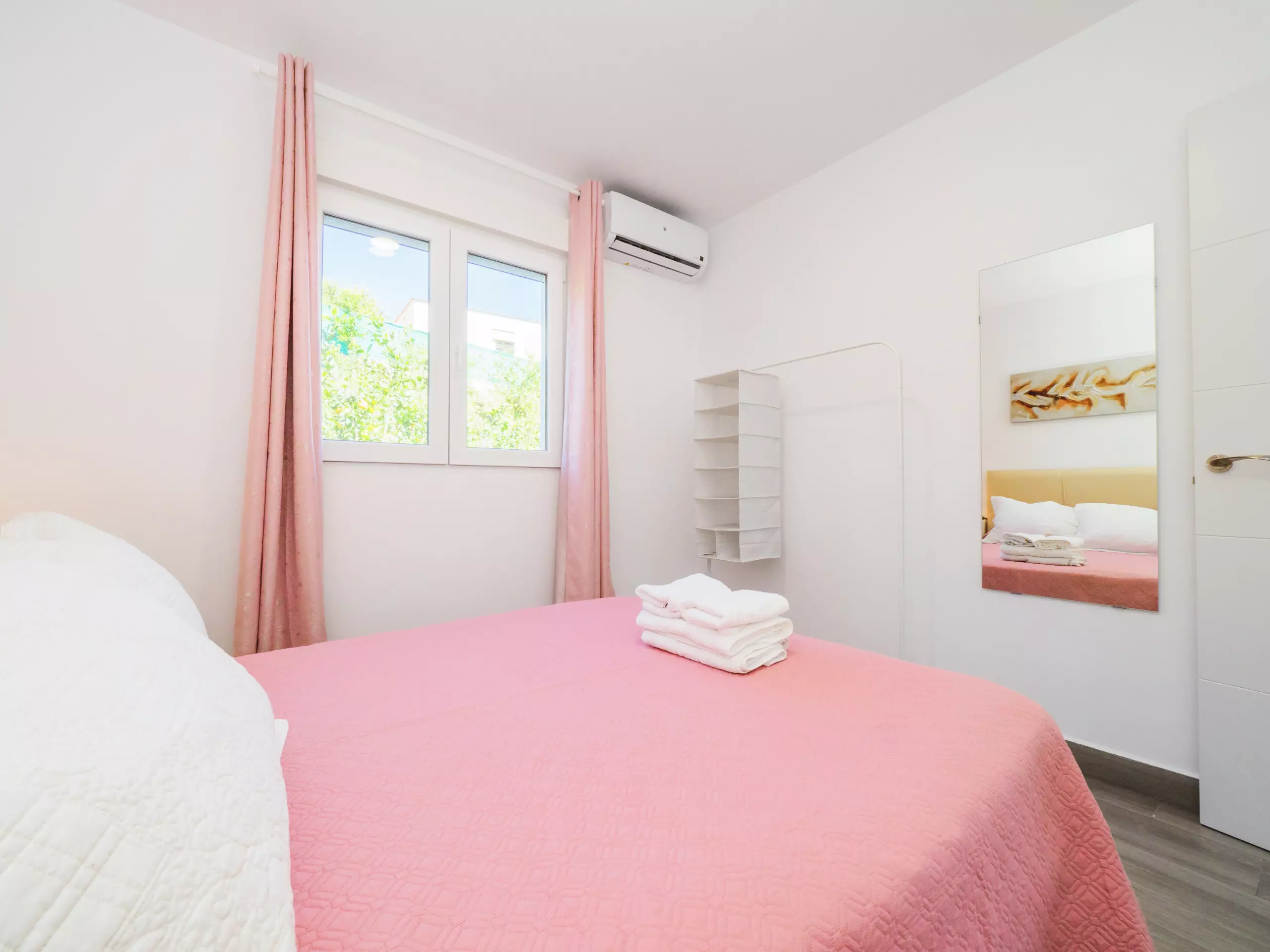 La distribution du logement comprend deux chambres avec climatisation, fenêtres donnant sur l'extérieur et espace de rangement pour les bagages : une avec un lit double et l'autre avec un lit simple et un lit superposé, parfait pour les familles ou les groupes d'amis. La salle de bain dispose d'une douche et se trouve dans une zone commune pour un accès facile.