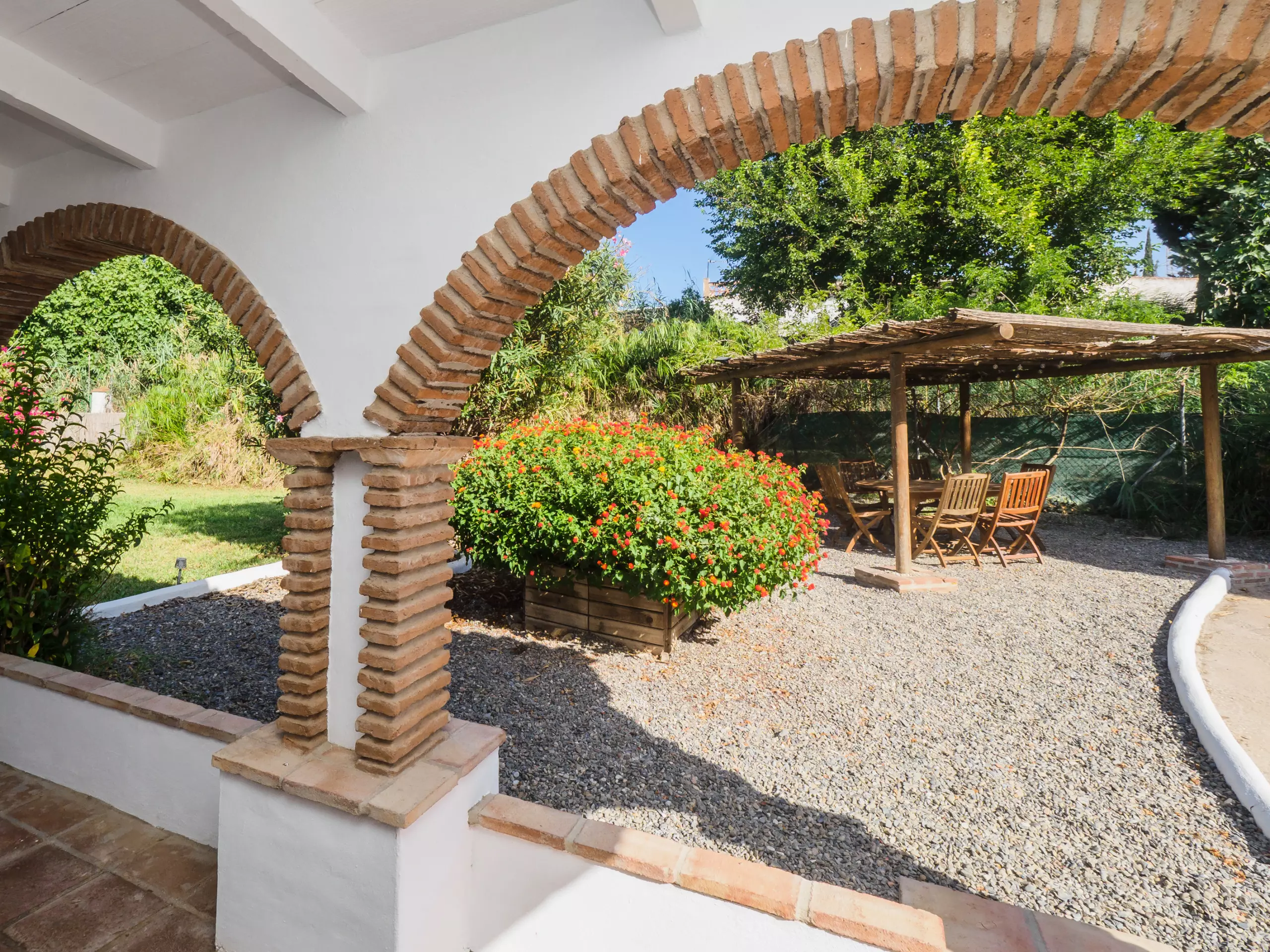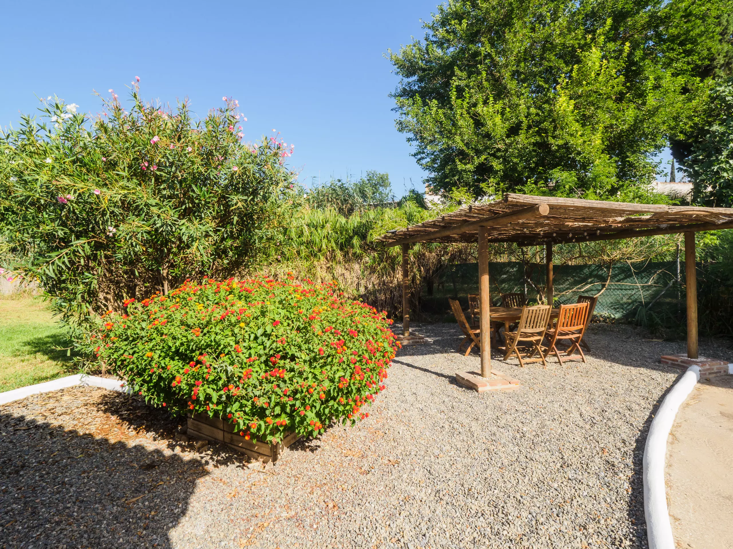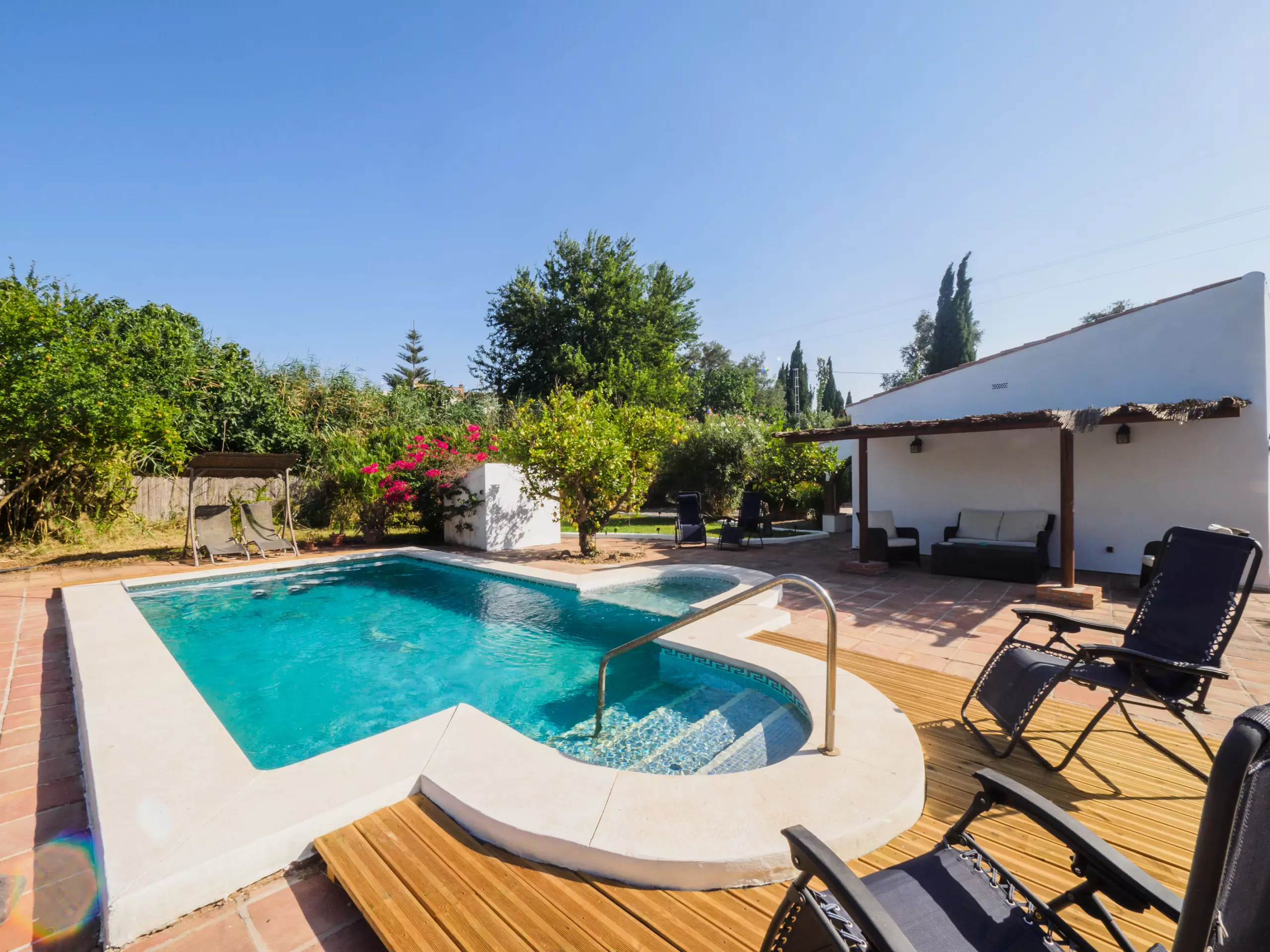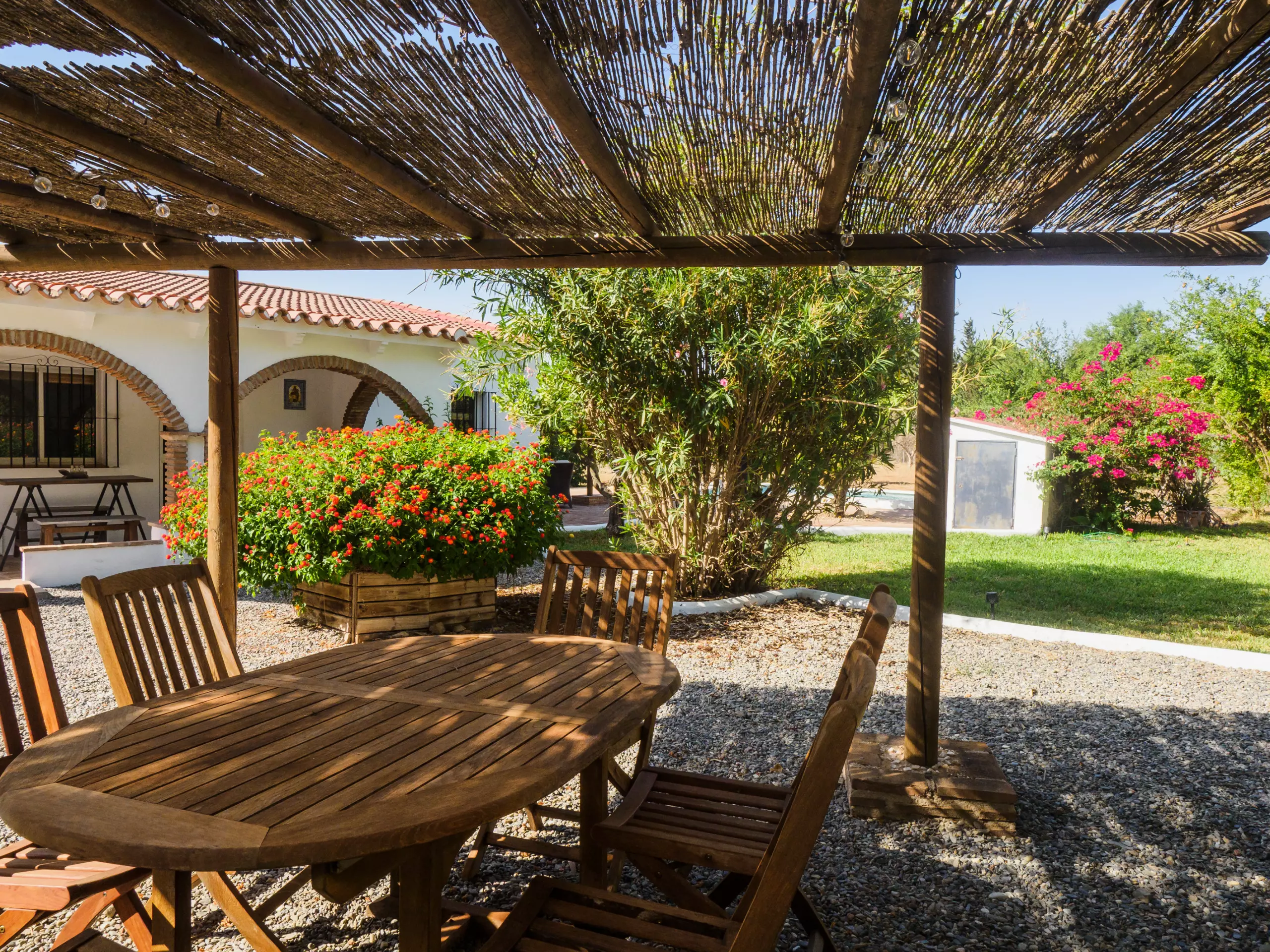 Les extérieurs sont un véritable oasis, divisés en deux zones : l'une avec une piscine et l'autre avec une pergola équipée d'une table à manger, parfaite pour les déjeuners et les réunions familiales en plein air sous le soleil. De plus, le mobilier de jardin et les chaises longues invitent à se détendre et à profiter du beau temps.