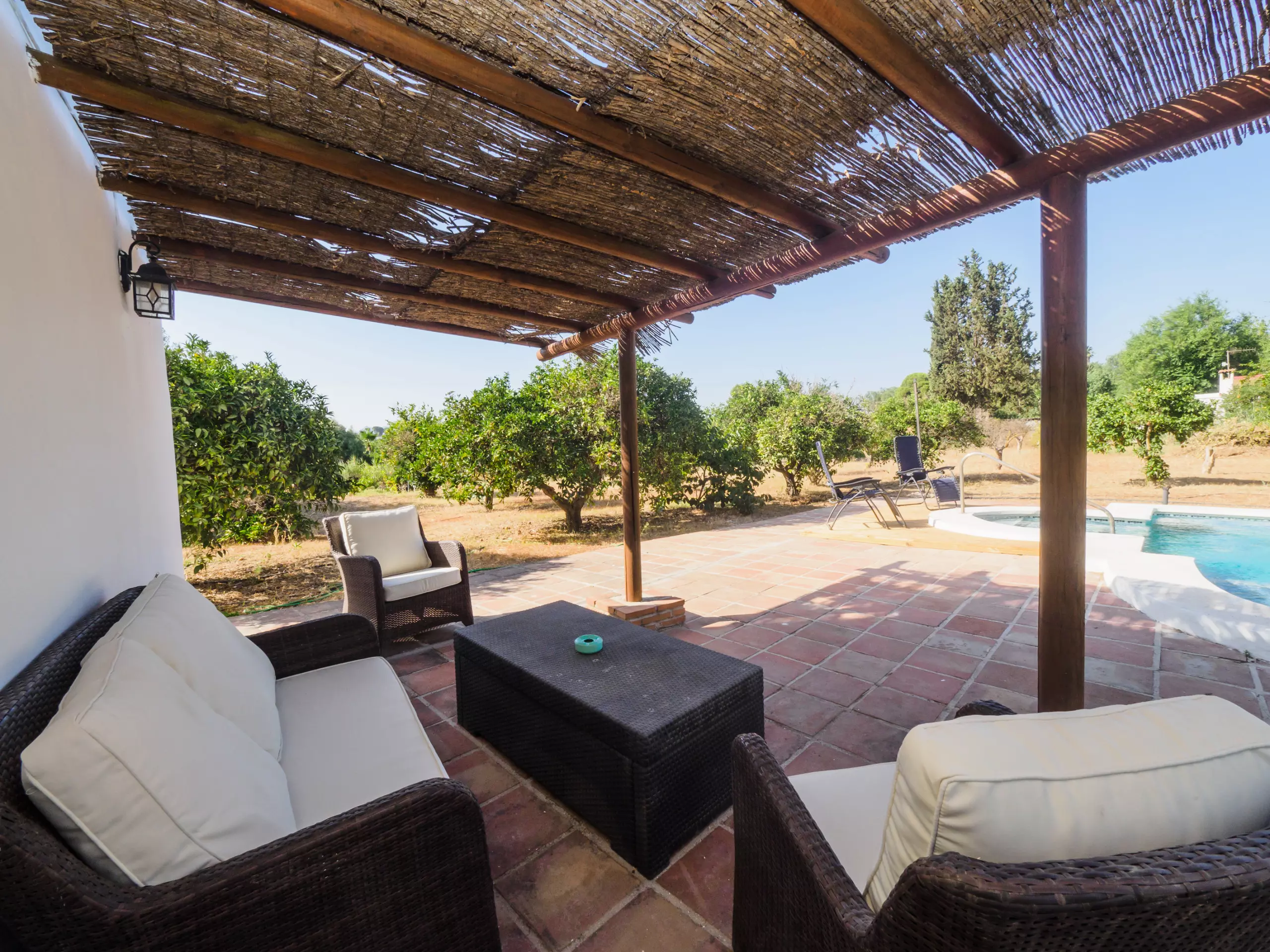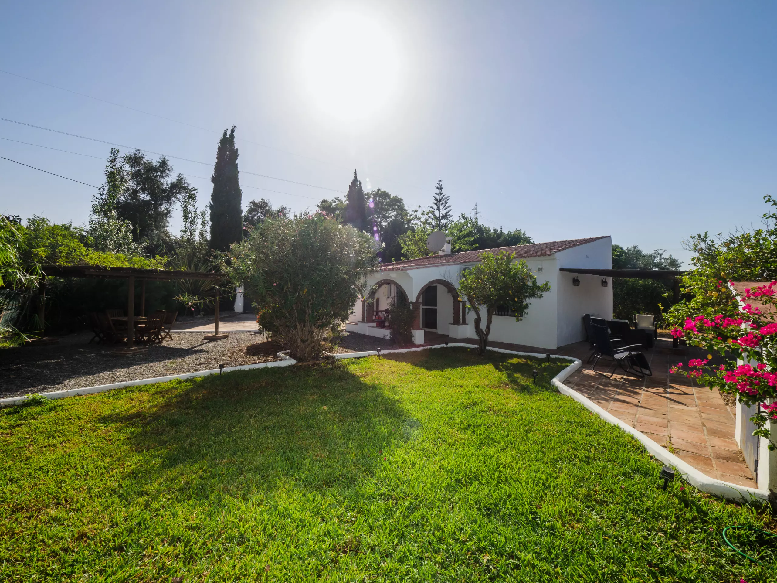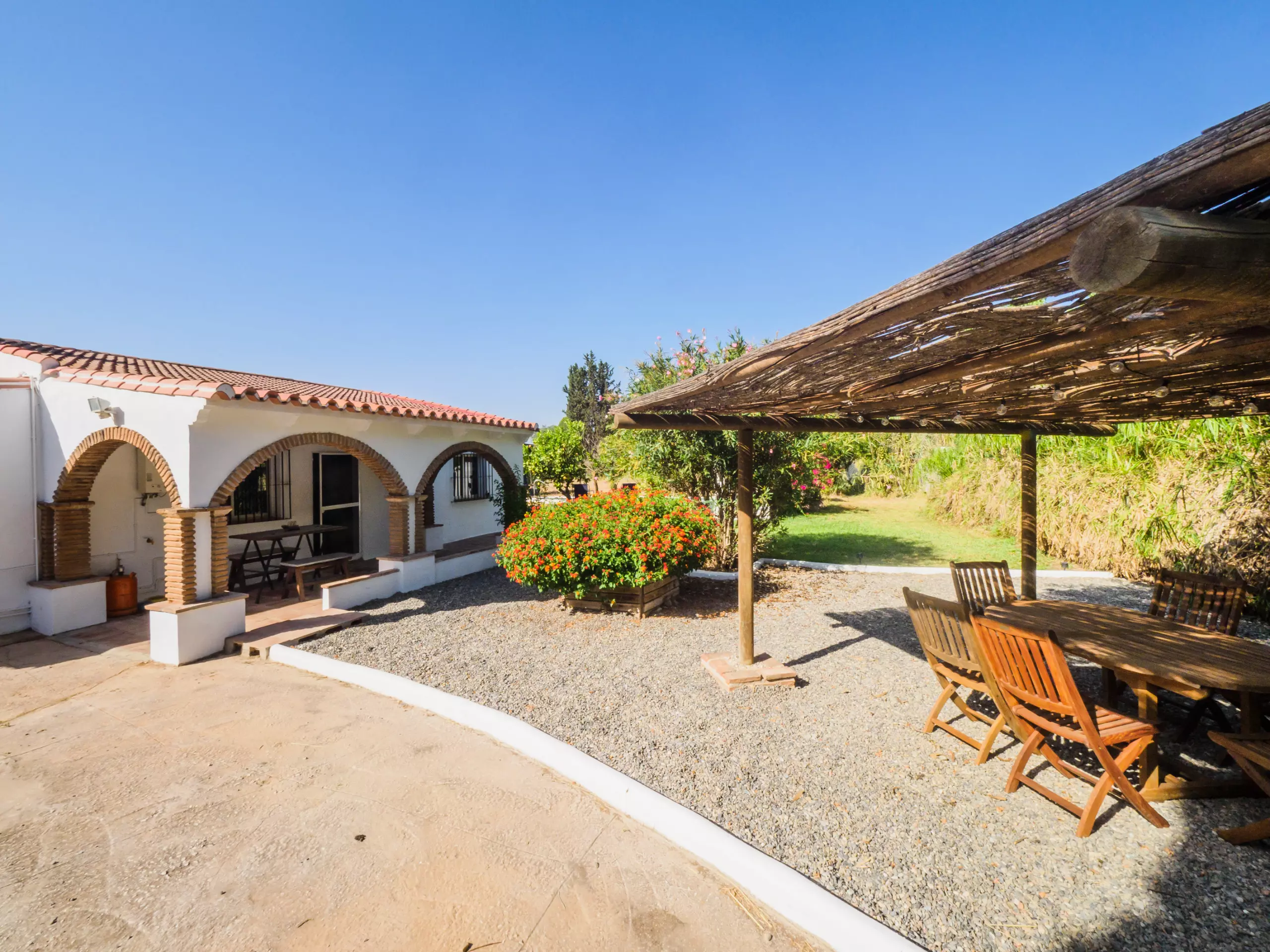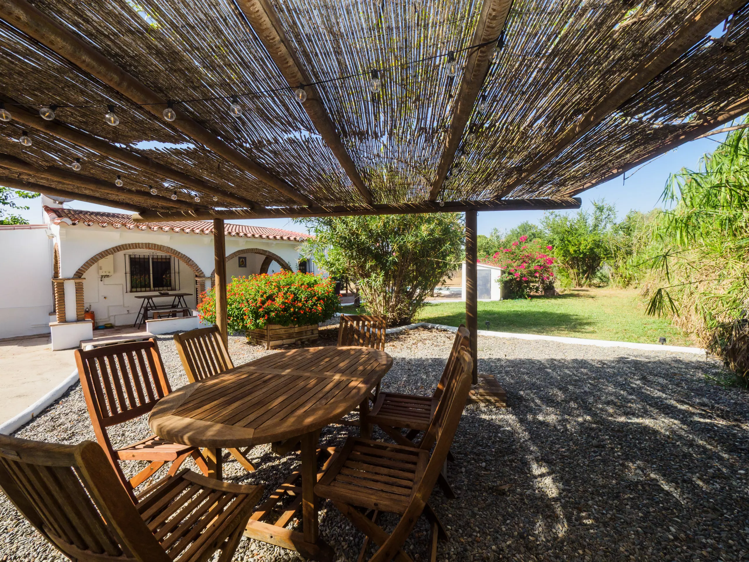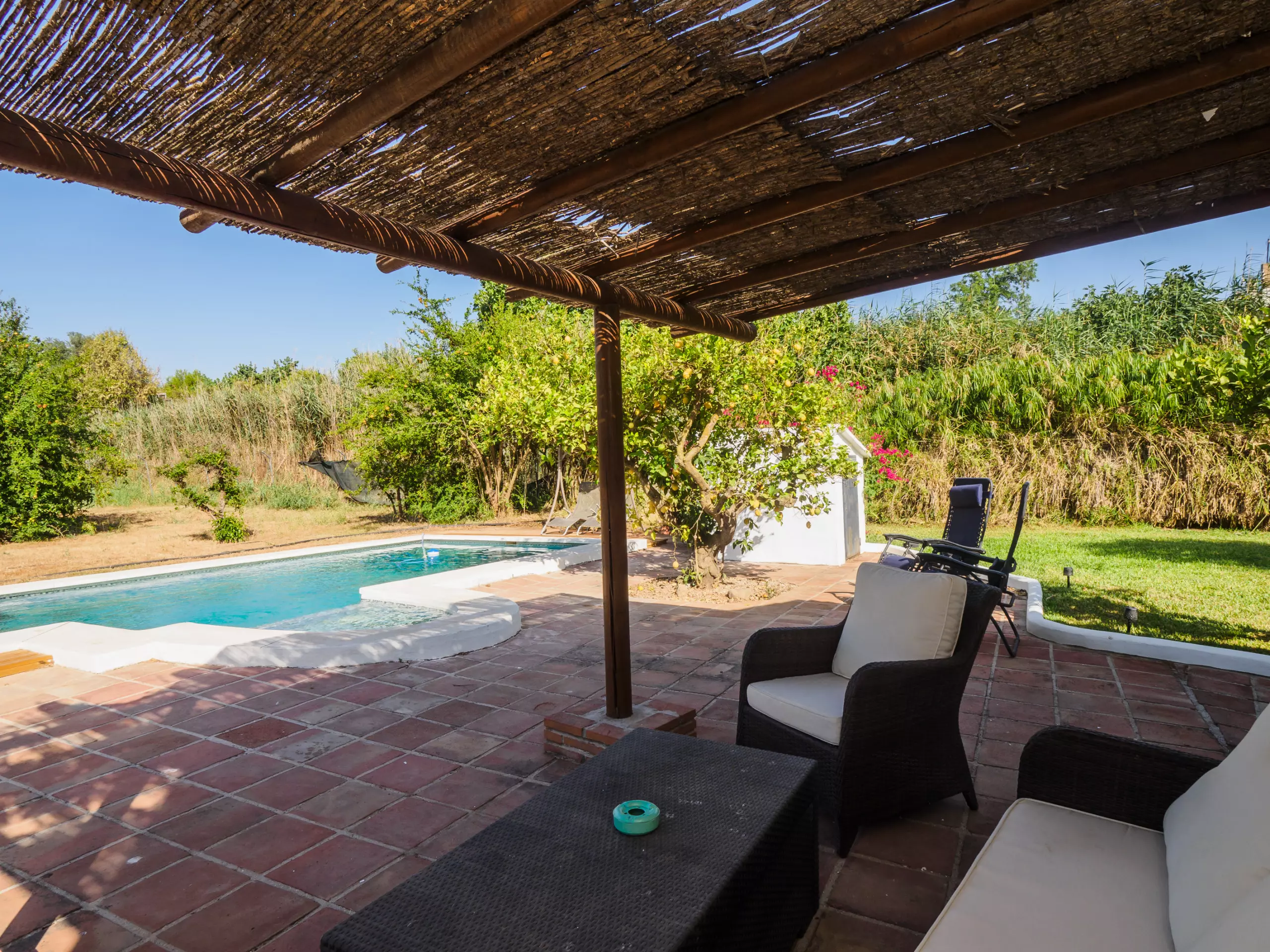 Les extérieurs sont un véritable oasis, divisés en deux zones : l'une avec une piscine et l'autre avec une pergola équipée d'une table à manger, parfaite pour les déjeuners et les réunions familiales en plein air sous le soleil. De plus, le mobilier de jardin et les chaises longues invitent à se détendre et à profiter du beau temps.