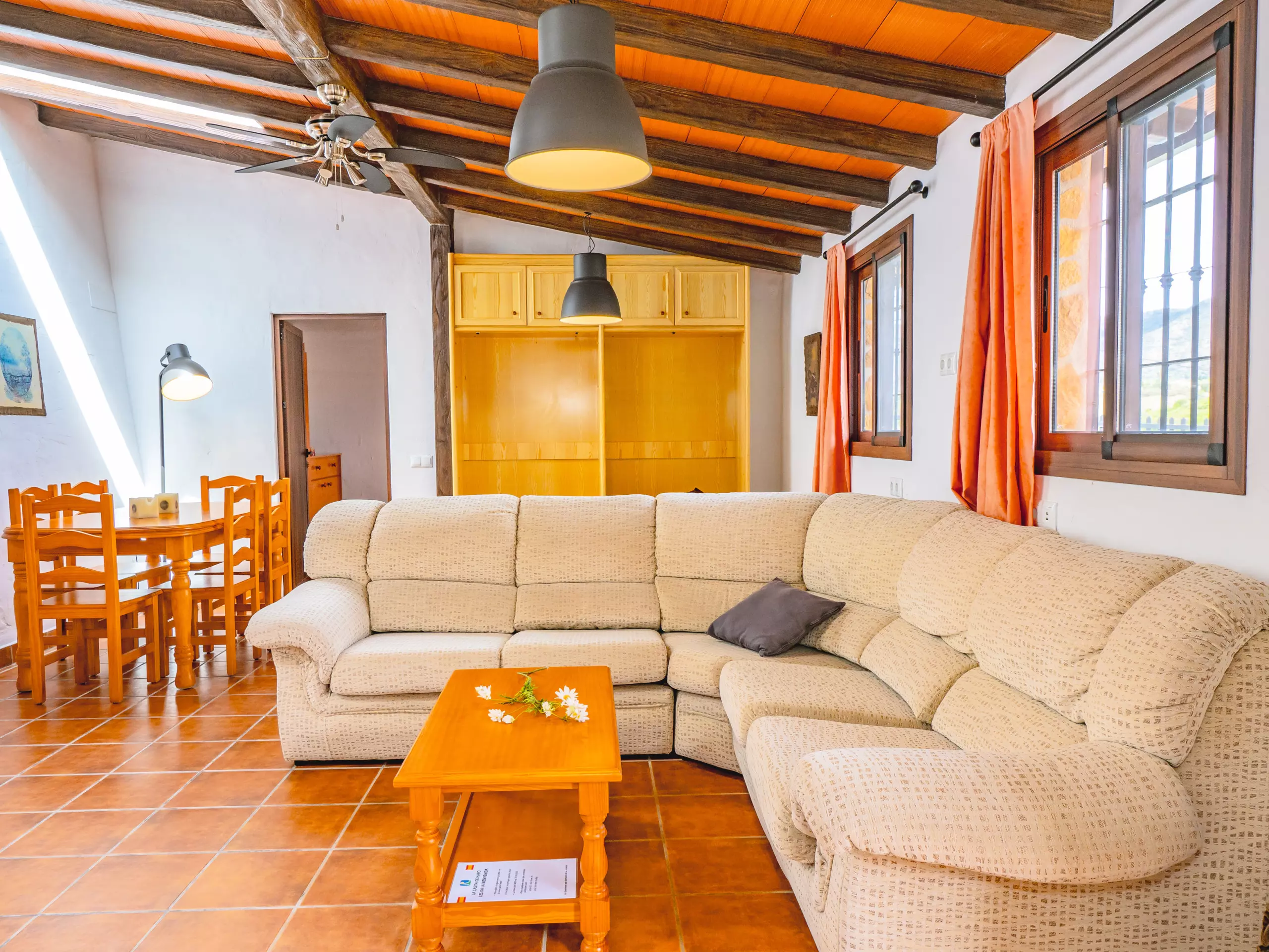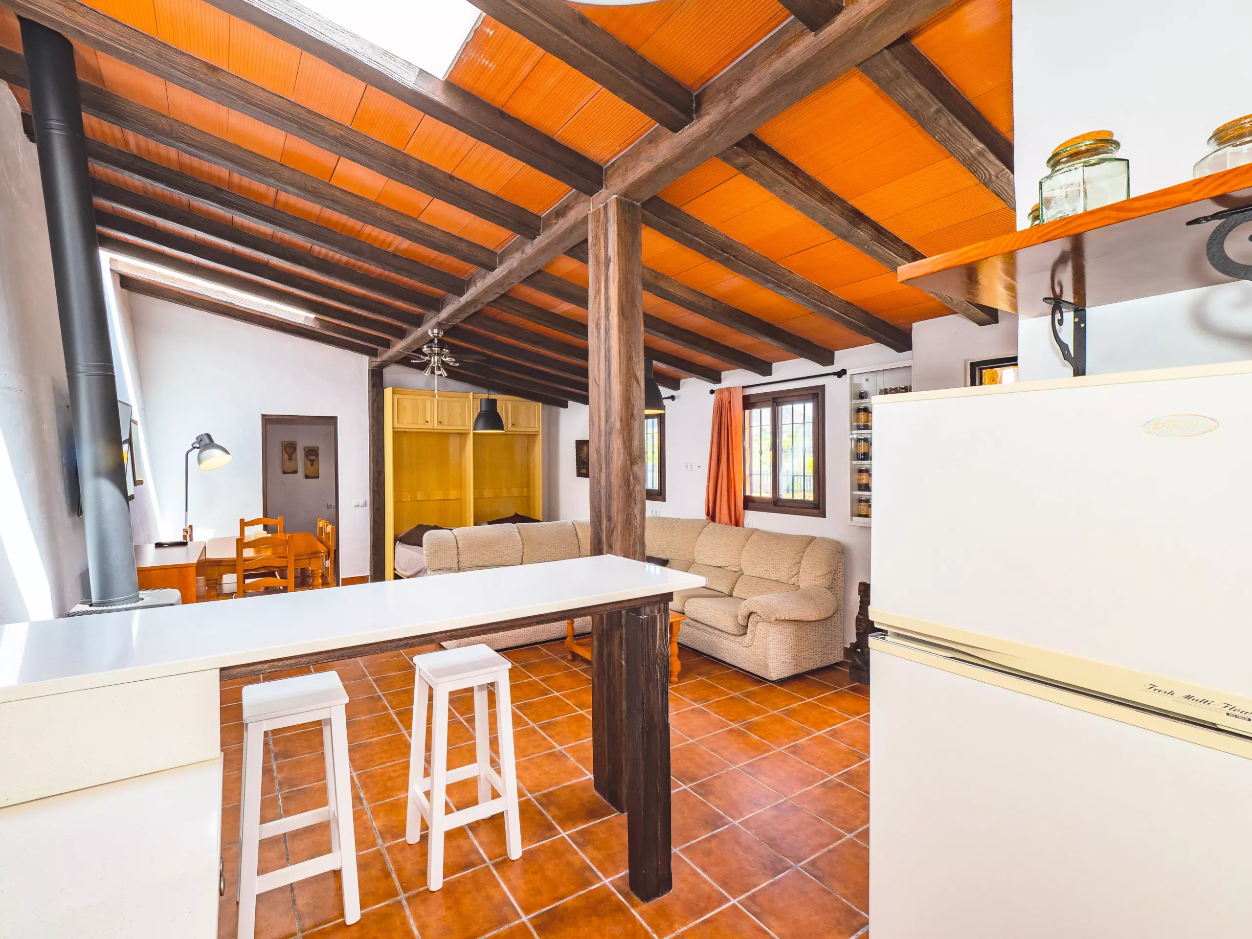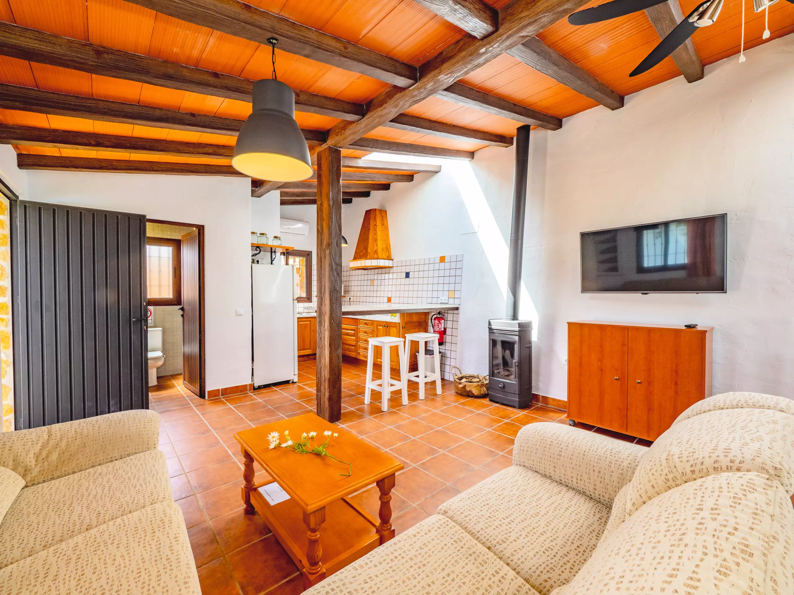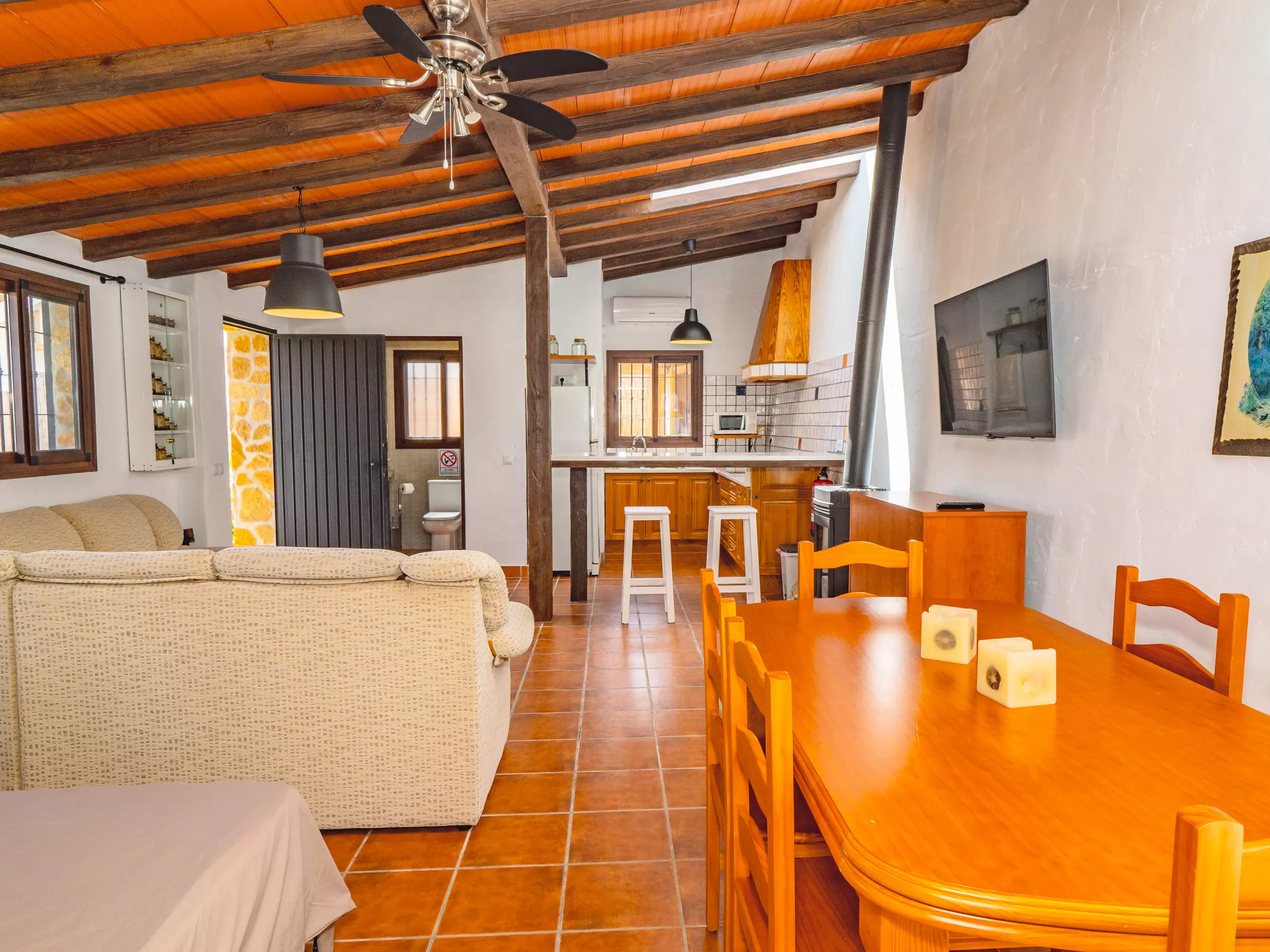 L'intérieur combine des plafonds inclinés et une décoration rustique pour créer une ambiance chaleureuse et fonctionnelle. Le salon-salle à manger, ouvert sur la cuisine américaine, est le cœur de la maison, équipé d'un canapé confortable, d'une télévision et d'une table pour les réunions familiales. La cuisine dispose de tout l'essentiel, y compris une plaque de cuisson à induction, un micro-ondes, un réfrigérateur, un congélateur, une cafetière, un grille-pain, un bouilloire et un presse-agrumes, facilitant la préparation de tous les repas. ??