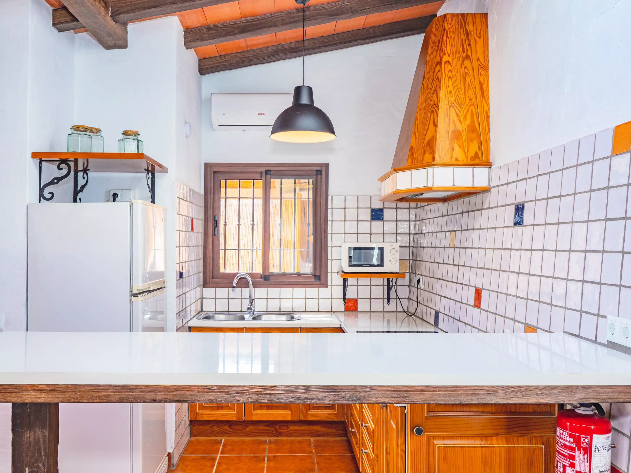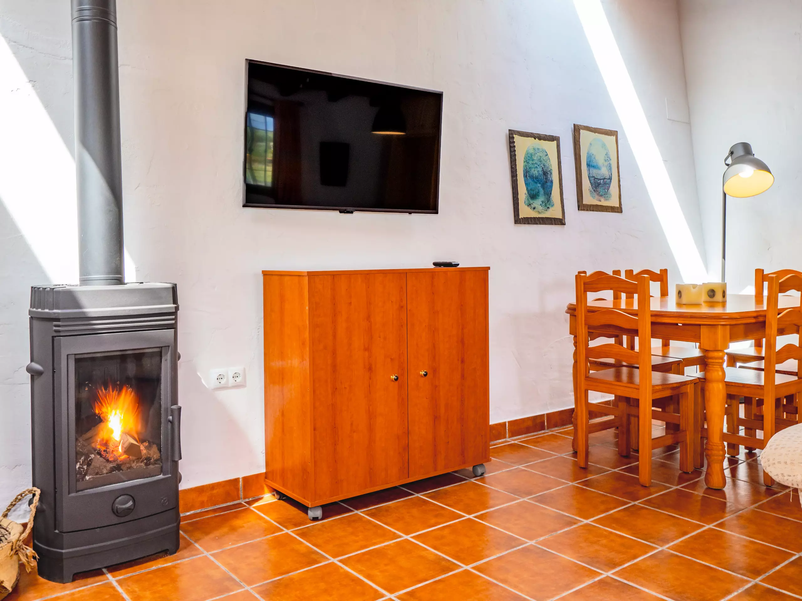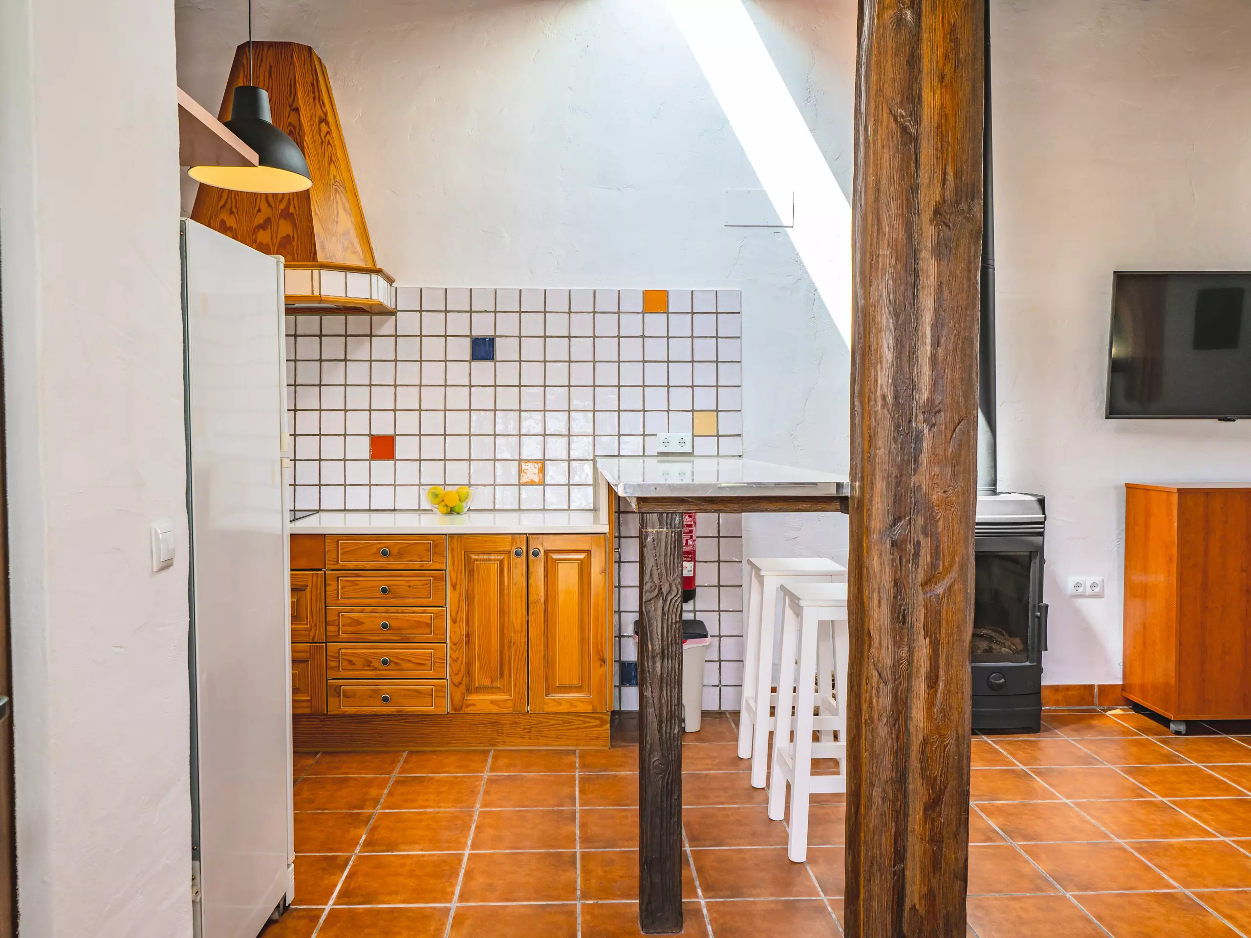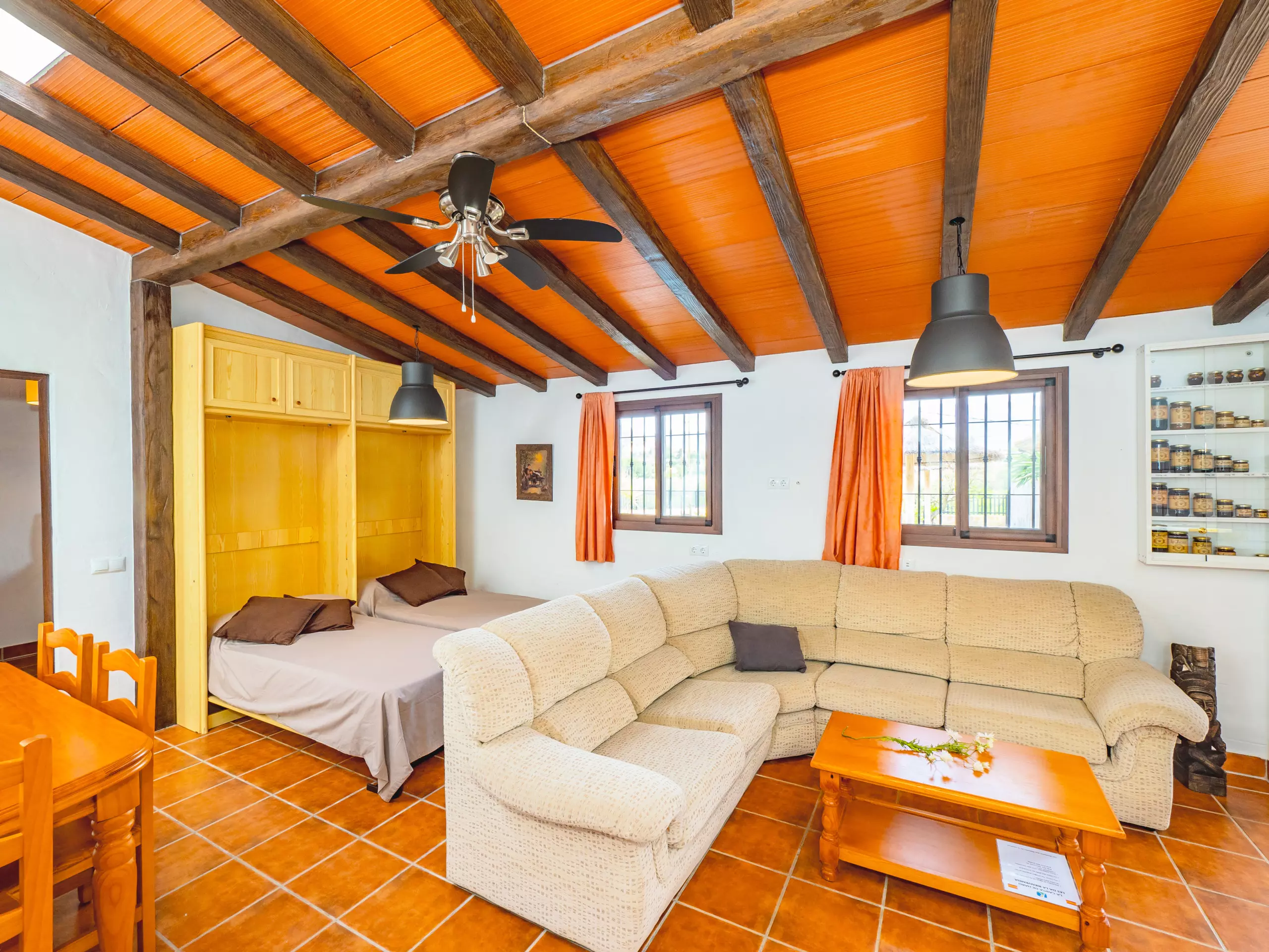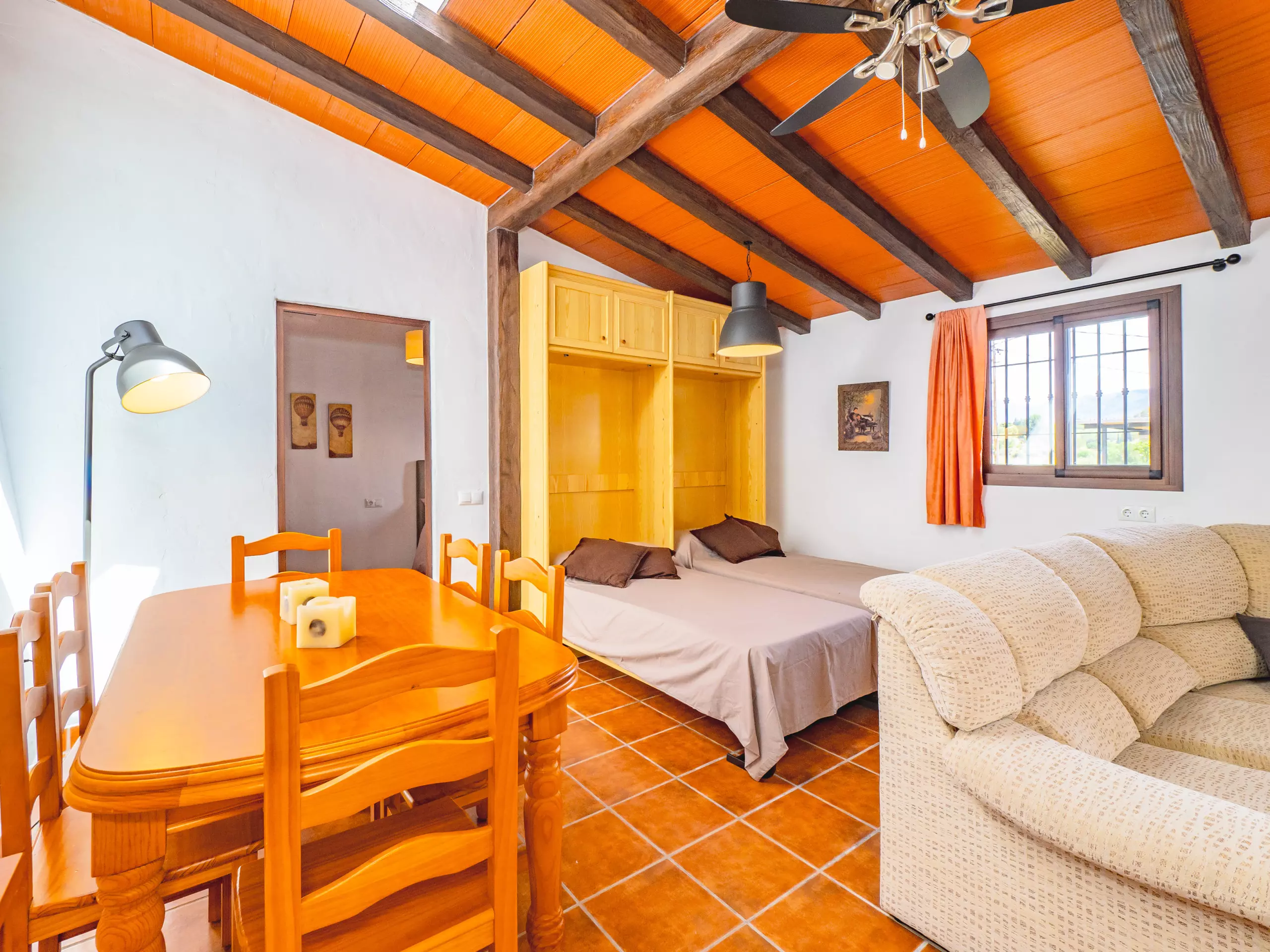 L'intérieur combine des plafonds inclinés et une décoration rustique pour créer une ambiance chaleureuse et fonctionnelle. Le salon-salle à manger, ouvert sur la cuisine américaine, est le cœur de la maison, équipé d'un canapé confortable, d'une télévision et d'une table pour les réunions familiales. La cuisine dispose de tout l'essentiel, y compris une plaque de cuisson à induction, un micro-ondes, un réfrigérateur, un congélateur, une cafetière, un grille-pain, un bouilloire et un presse-agrumes, facilitant la préparation de tous les repas. ??