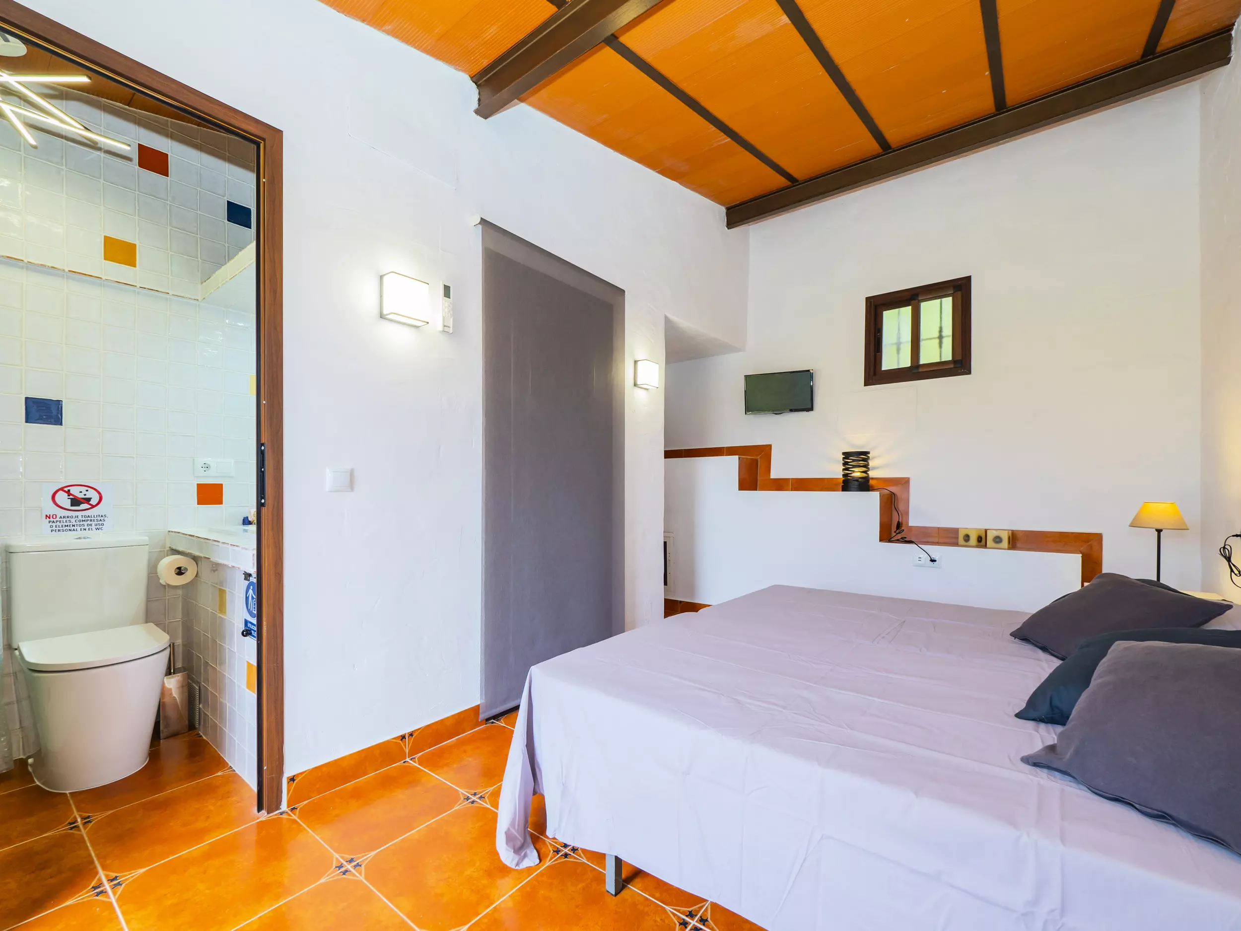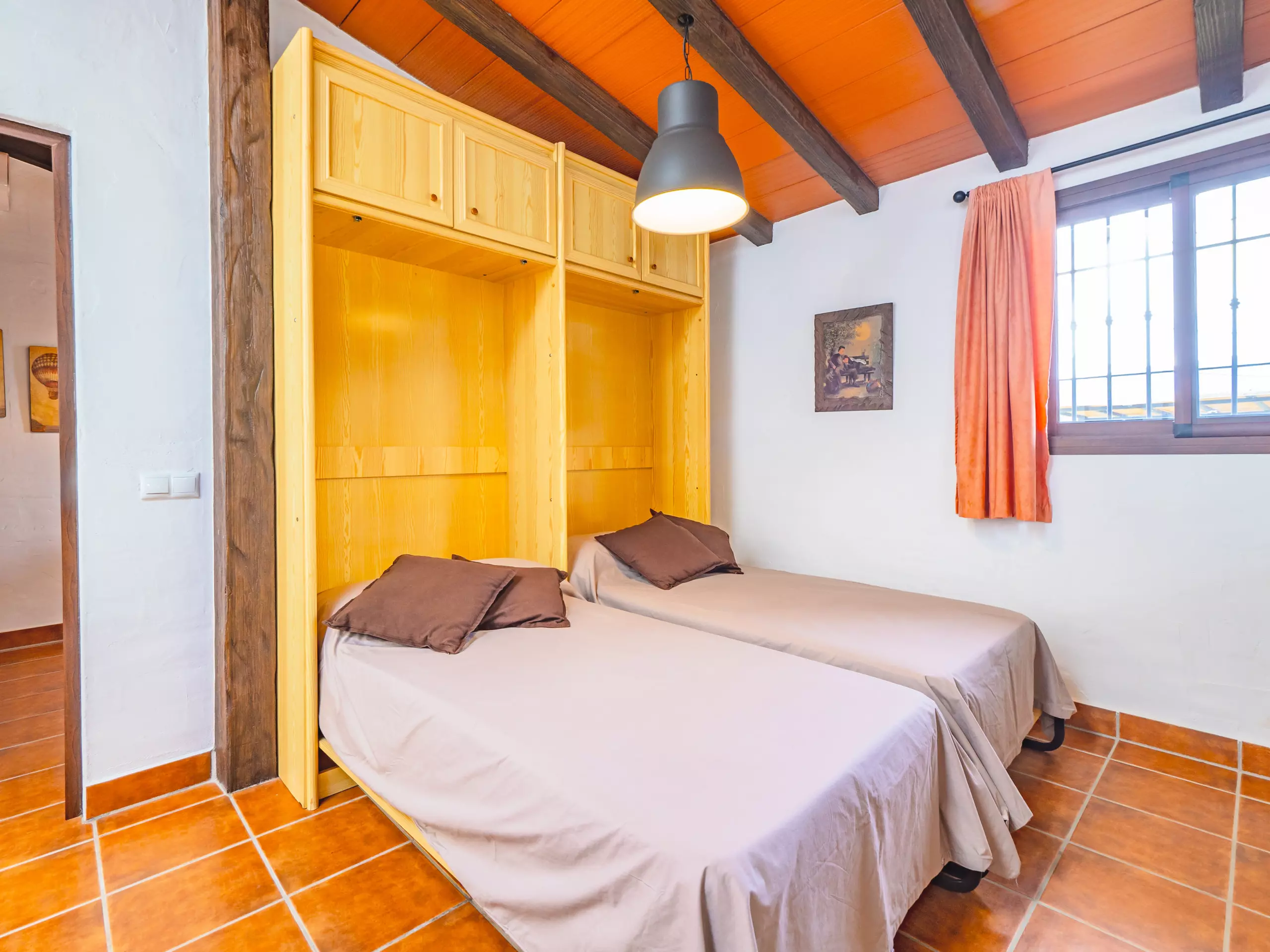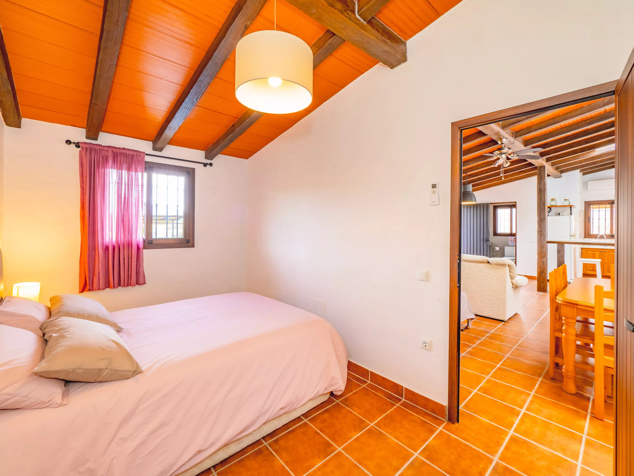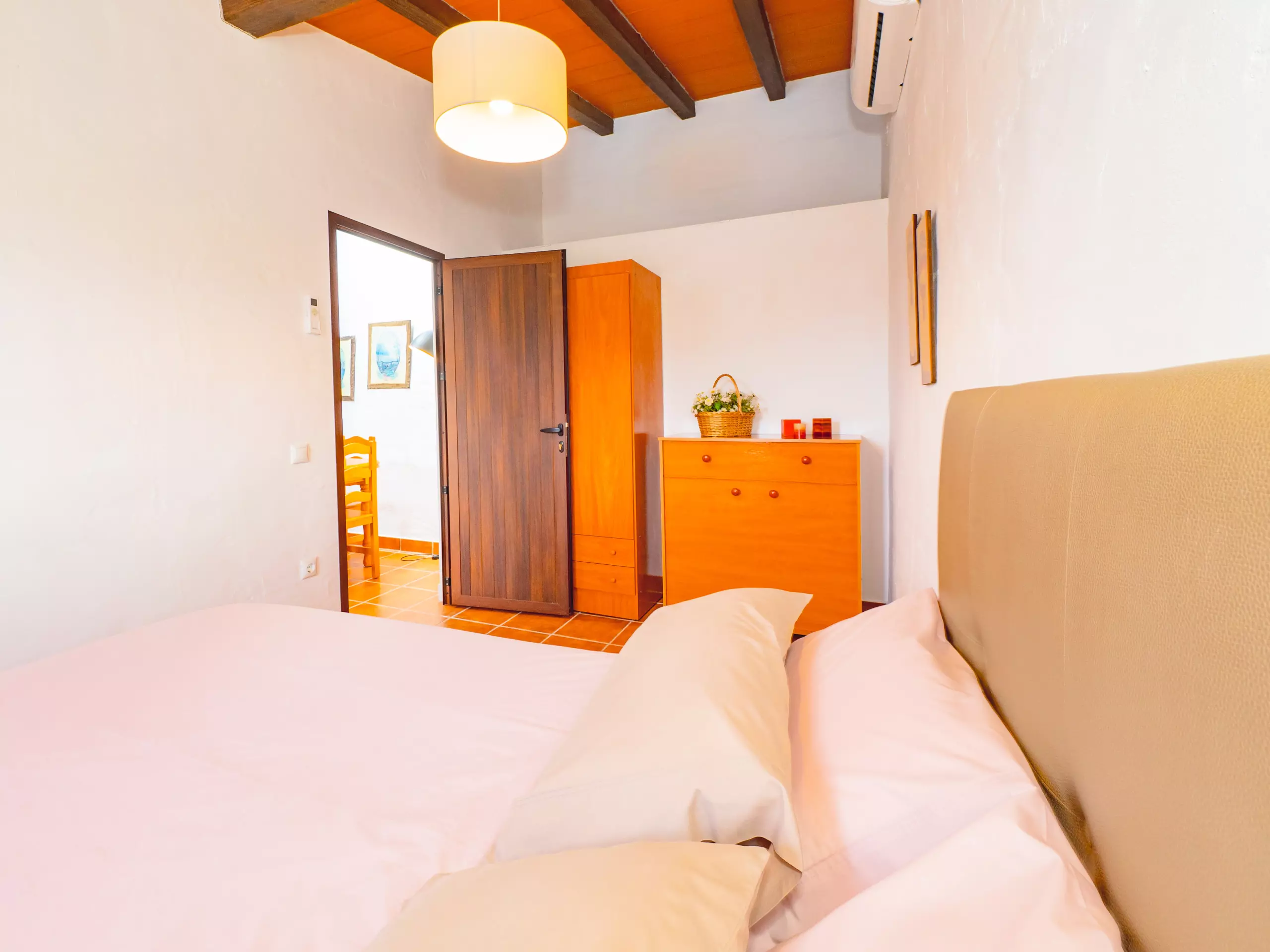 La maison dispose de deux chambres principales : une spacieuse avec un lit de couple et un espace pour ranger les bagages, et une autre chambre privée avec salle de bain attenante et climatisation, parfaite pour plus d'intimité. Cette chambre supplémentaire comprend deux lits individuels et un climat contrôlé pour un repos optimal. De plus, le salon offre un meuble avec deux lits individuels dépliables, augmentant la capacité jusqu'à 8 personnes avec deux lits d'appoint disponibles. ??