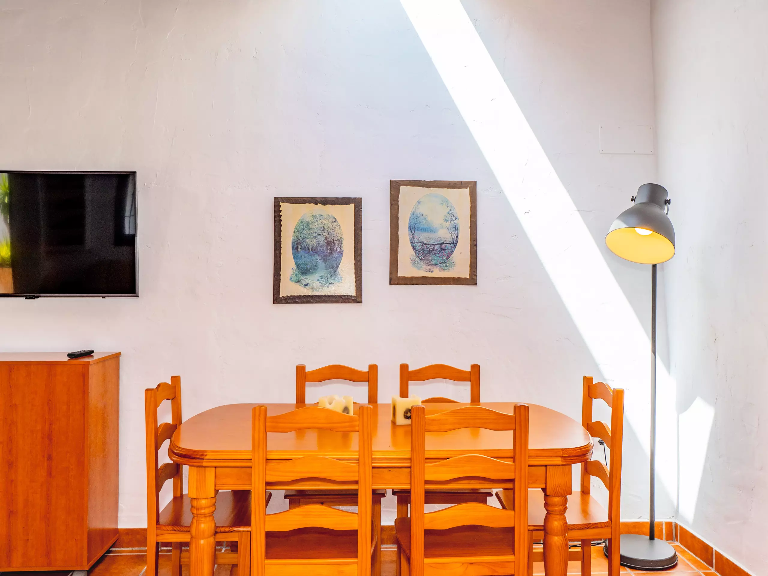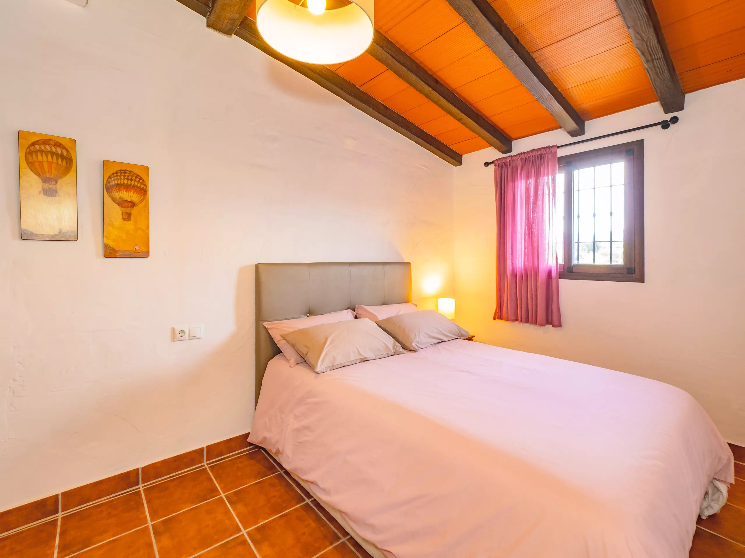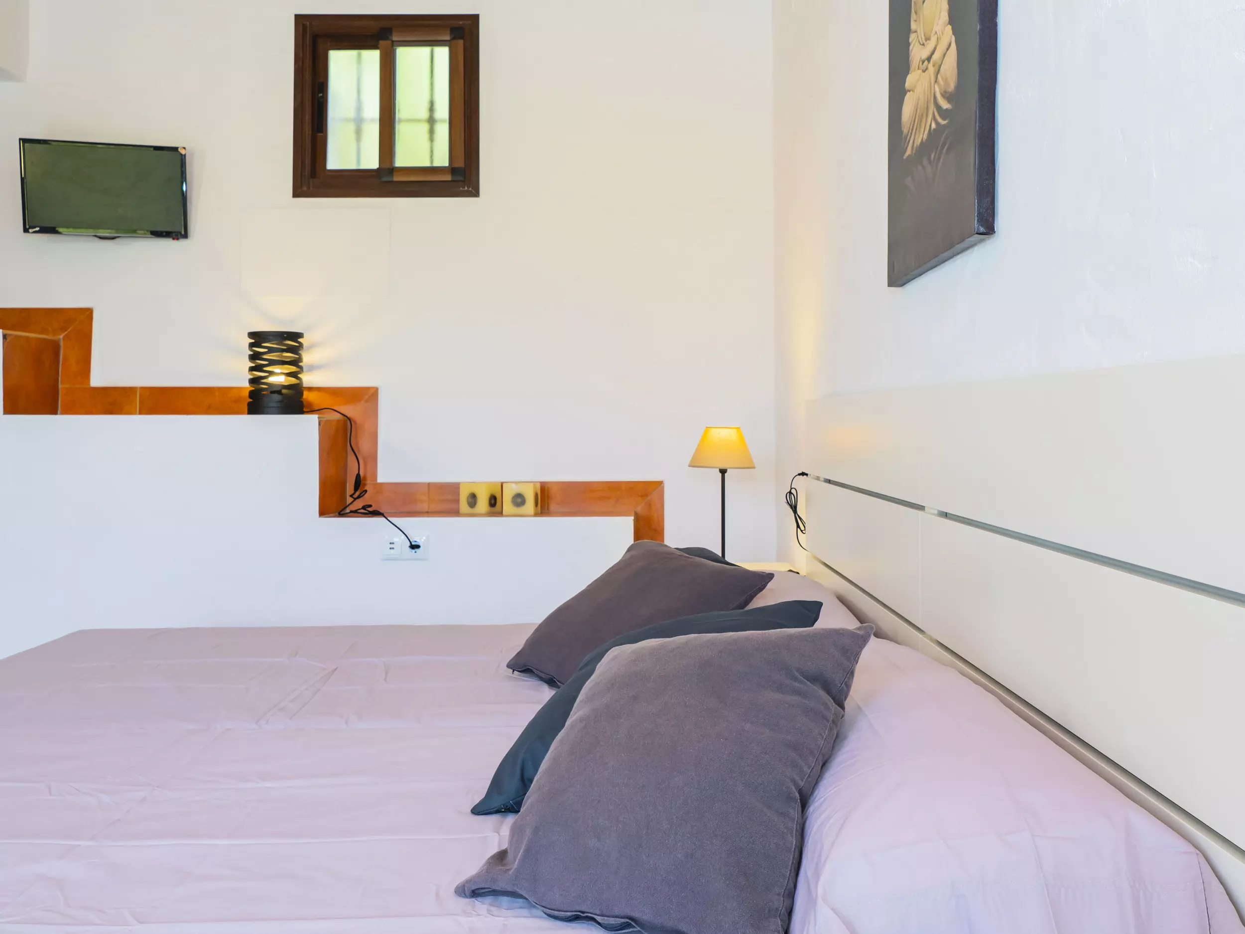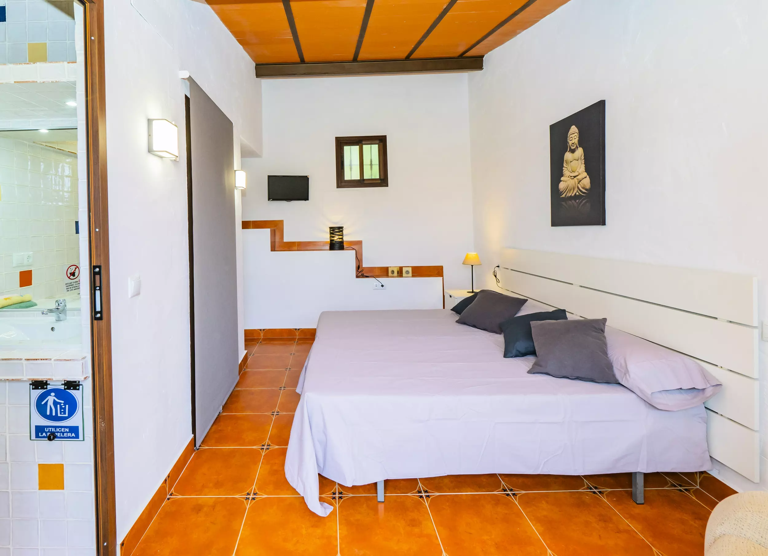 La maison dispose de deux chambres principales : une spacieuse avec un lit de couple et un espace pour ranger les bagages, et une autre chambre privée avec salle de bain attenante et climatisation, parfaite pour plus d'intimité. Cette chambre supplémentaire comprend deux lits individuels et un climat contrôlé pour un repos optimal. De plus, le salon offre un meuble avec deux lits individuels dépliables, augmentant la capacité jusqu'à 8 personnes avec deux lits d'appoint disponibles. ??