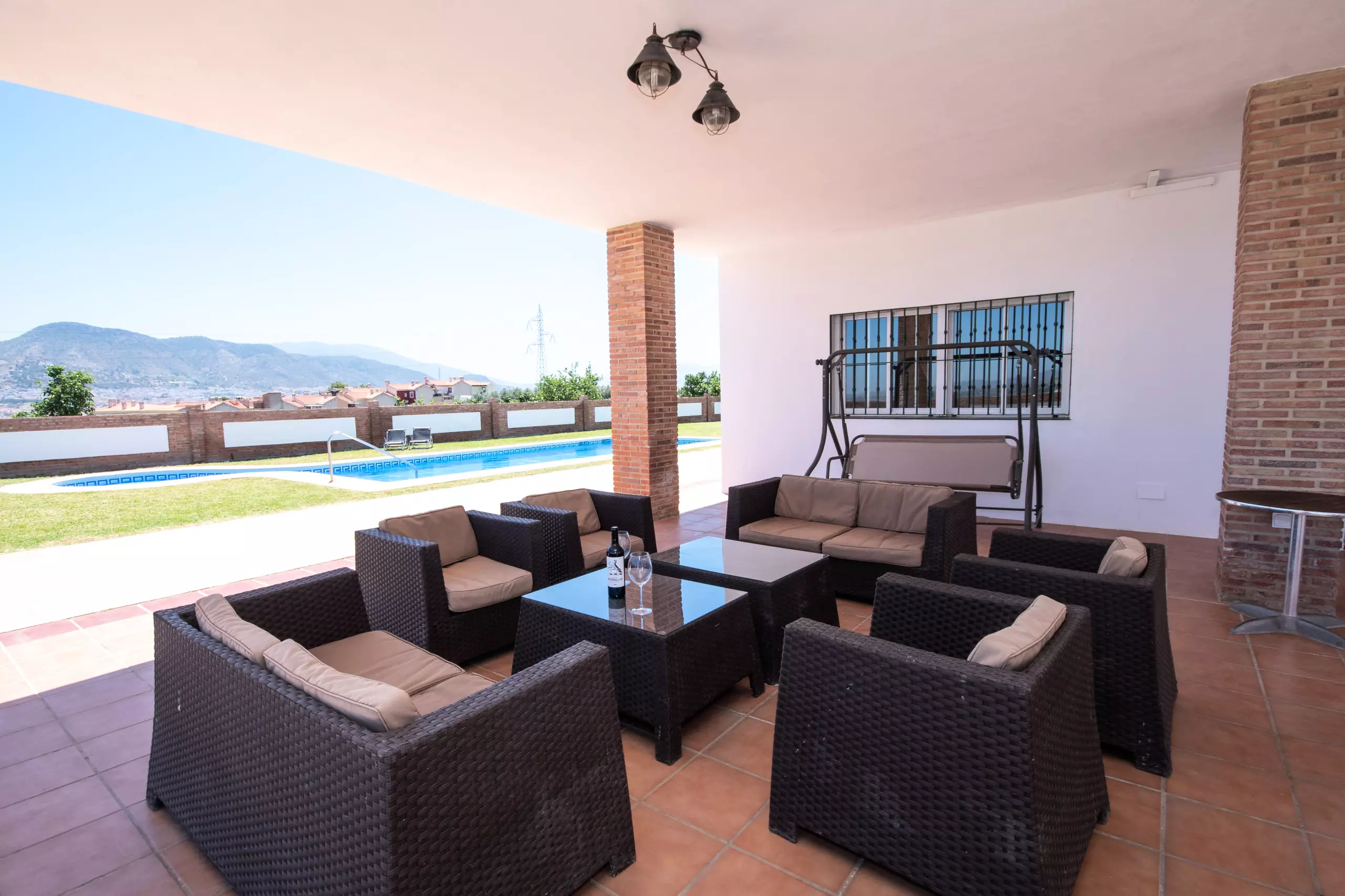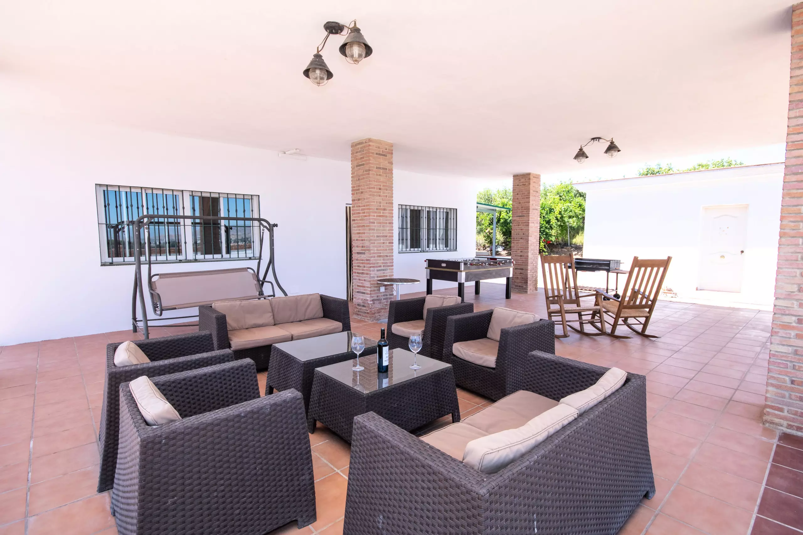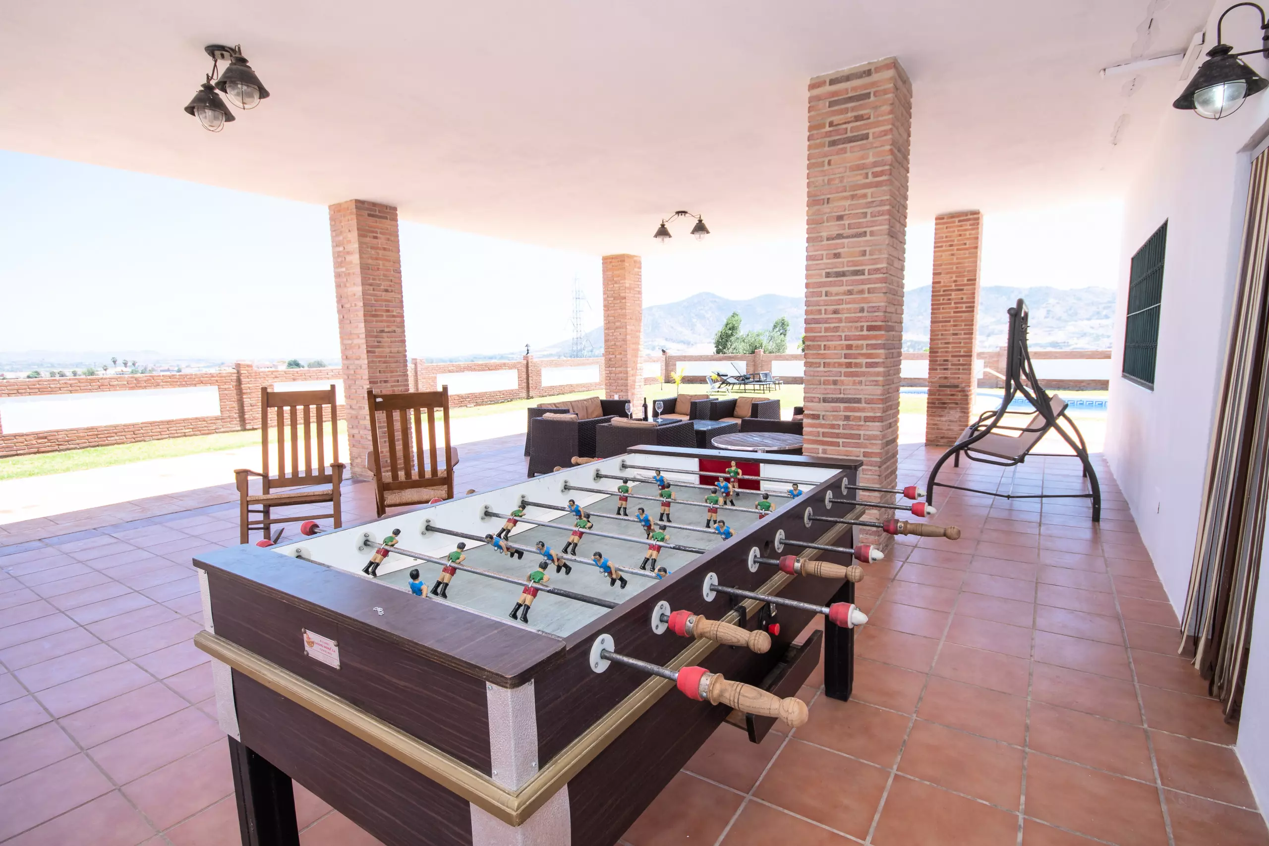 L'extérieur de la villa vous surprendra avec un grand jardin et une piscine privée d'environ 9 x 3,5 mètres, entourée de chaises longues et de parasols pour un repos total sous le soleil. La grande terrasse couverte dispose de multiples espaces pour se détendre, comprenant un canapé balançoire, une table de pique-nique et un barbecue pour profiter de délicieux repas en plein air. Les enfants ont leur espace avec un baby-foot et une zone de basket pour s'amuser sans s'arrêter.