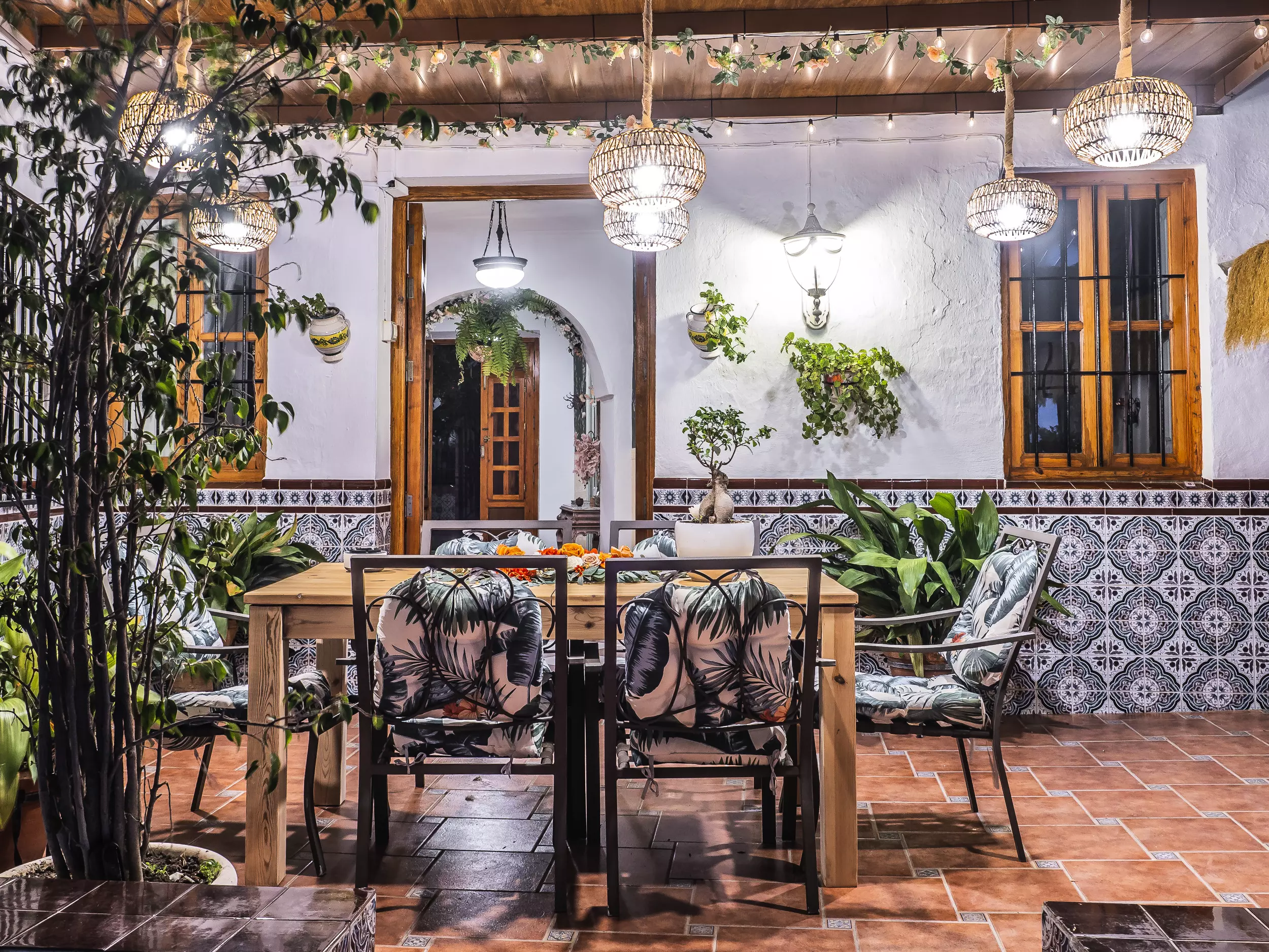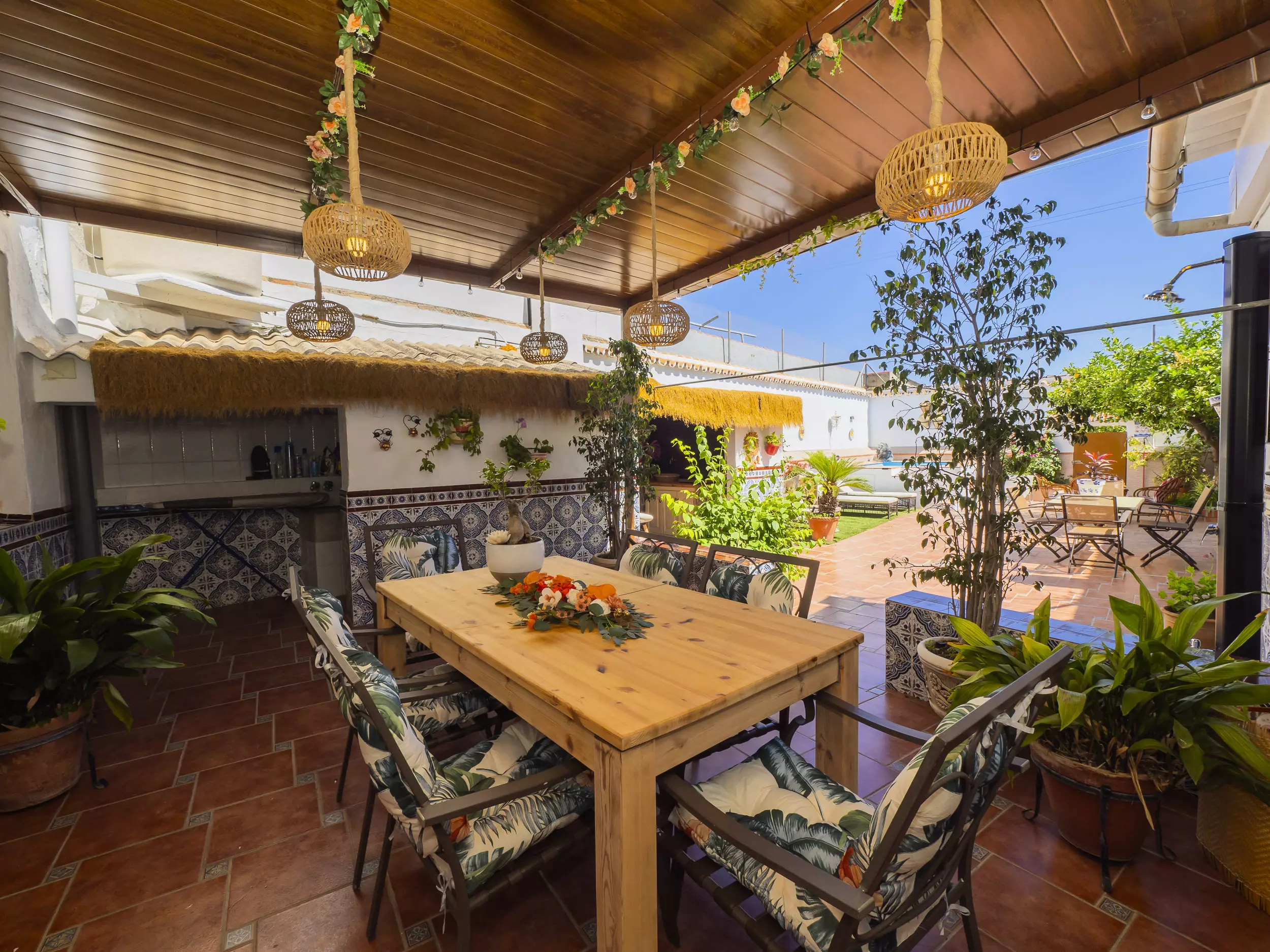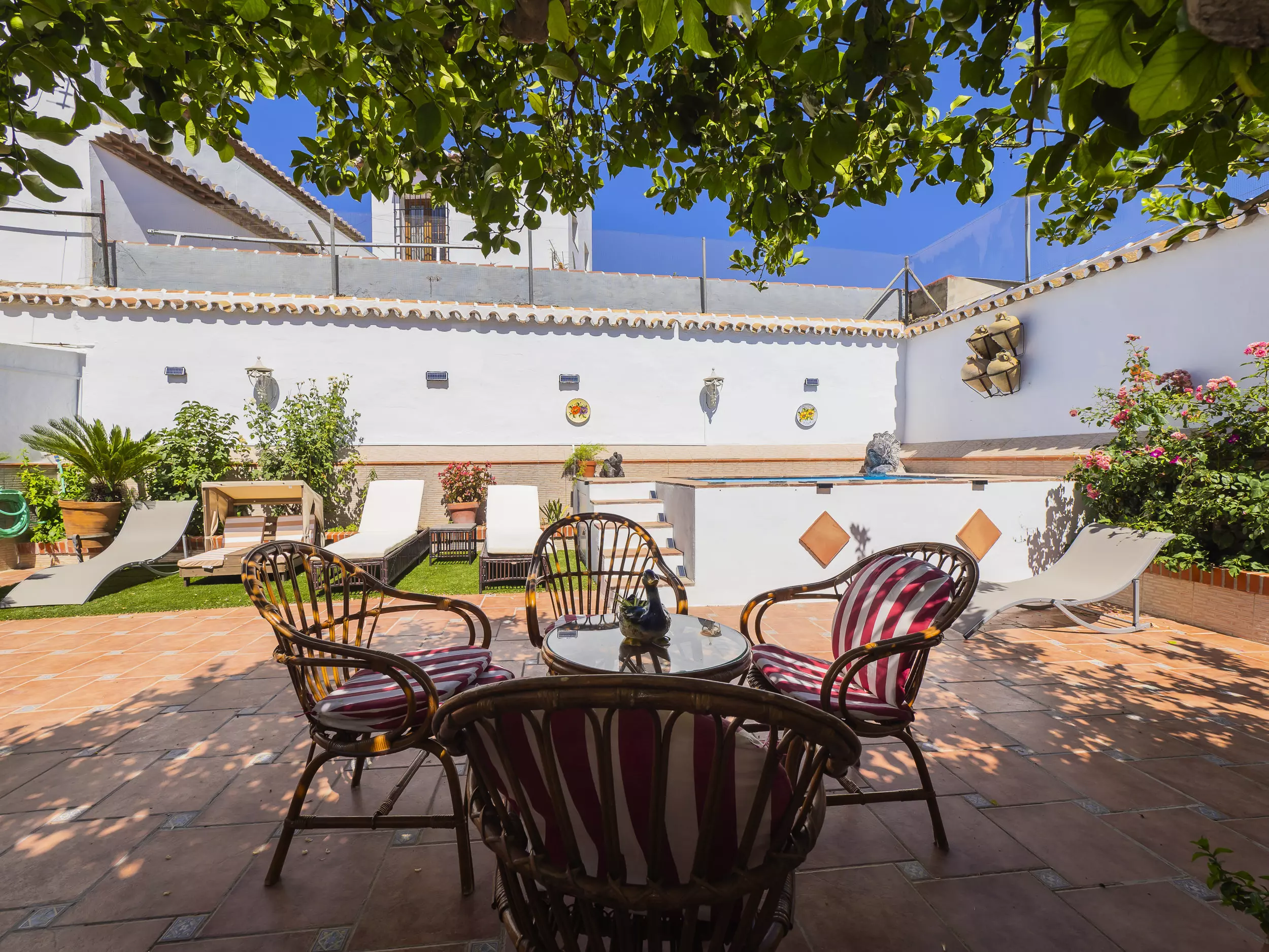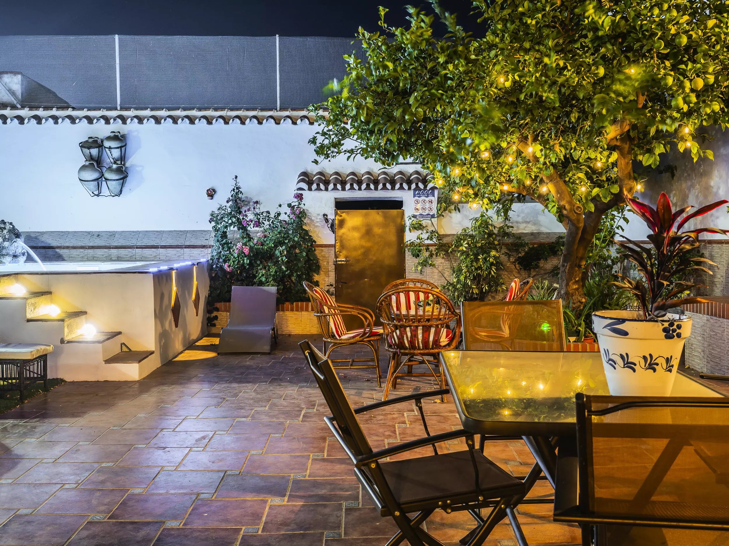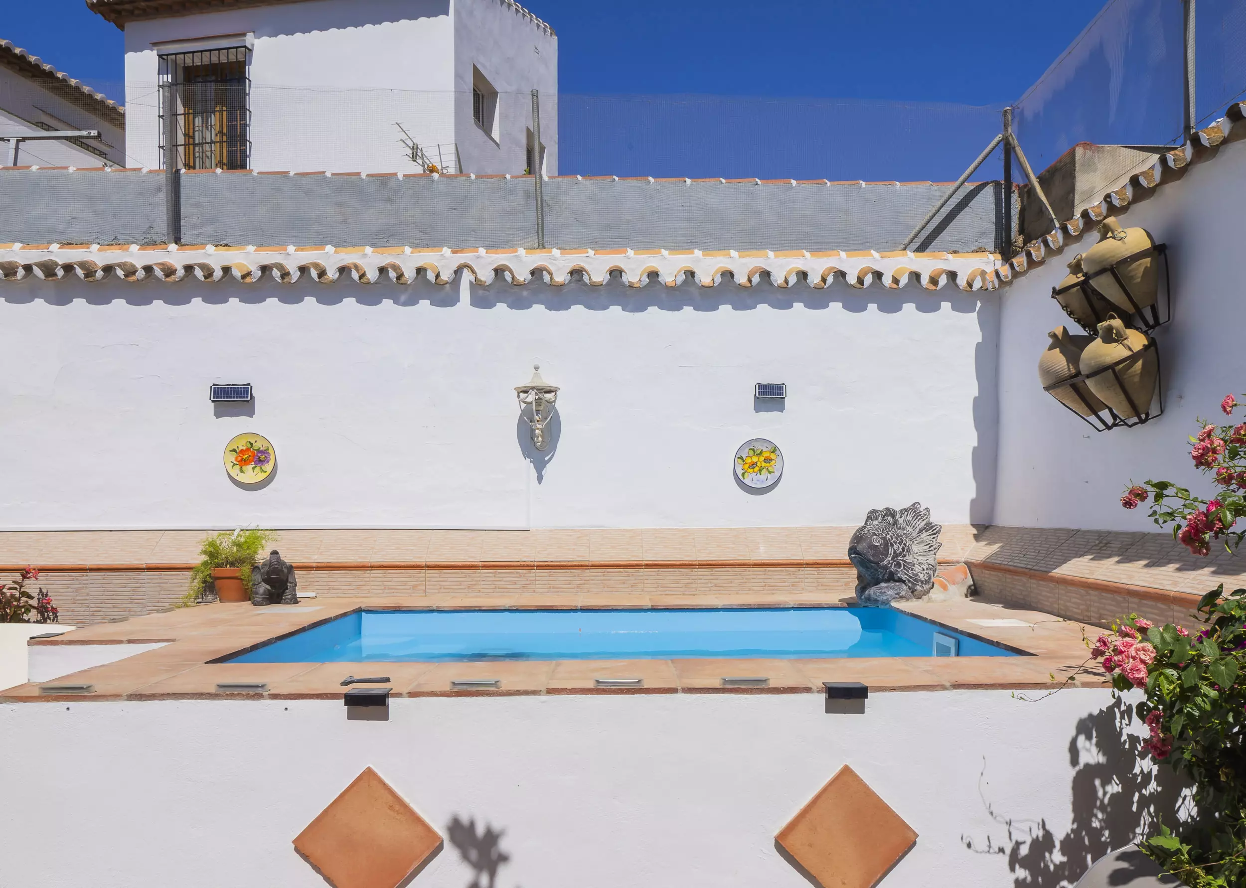 Au cœur du logement, vous trouverez une belle cour intérieure avec piscine privée, des zones d'ombre naturelle et du mobilier extérieur, avec des hamacs pour les plus petits. L'accès à la piscine se fait par des escaliers en maçonnerie ; une supervision est recommandée avec les enfants. À côté de la terrasse, la zone de barbecue et la grande table familiale invitent à des repas en plein air ; pour les soirées fraîches, la terrasse dispose d'un chauffage de plafond.