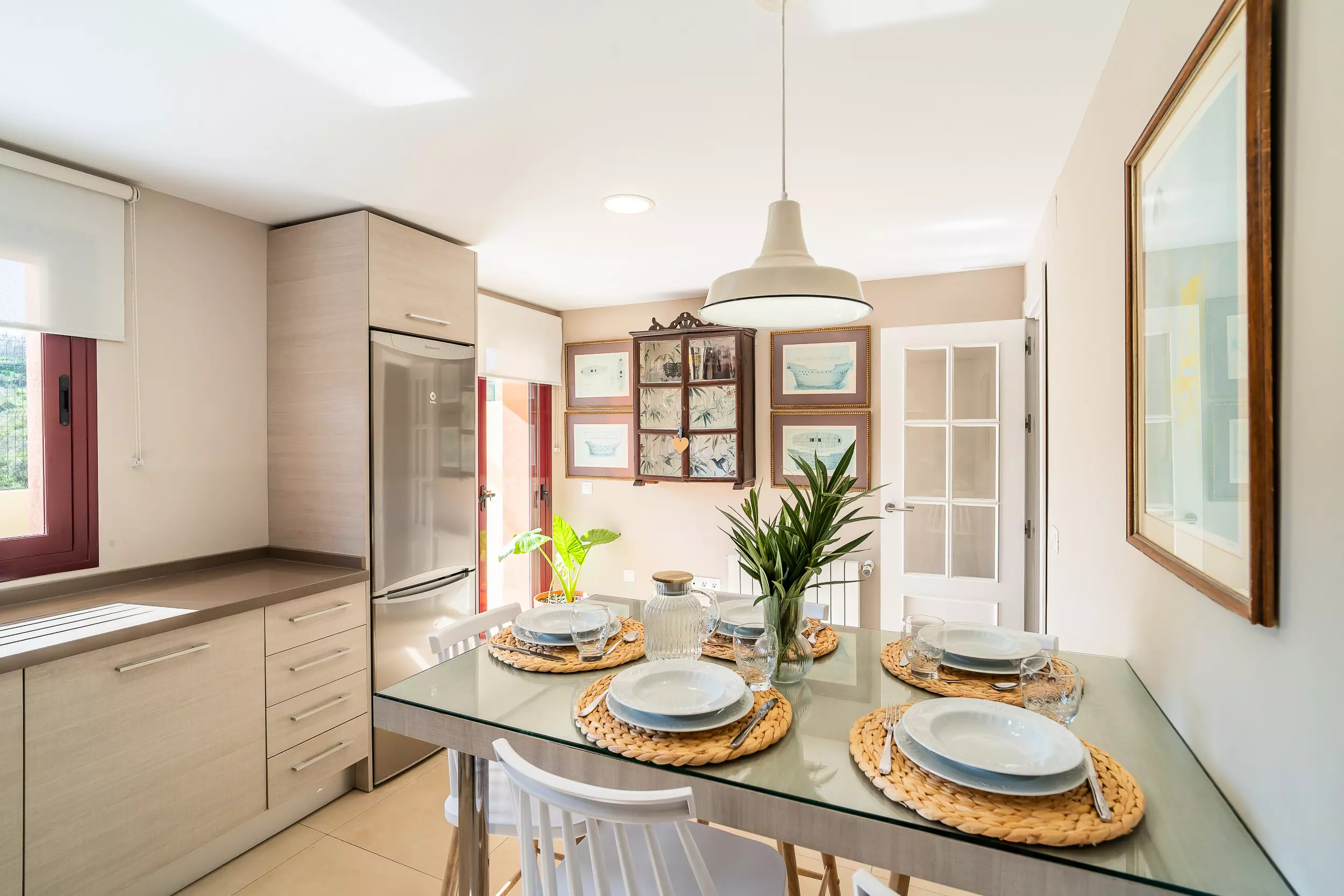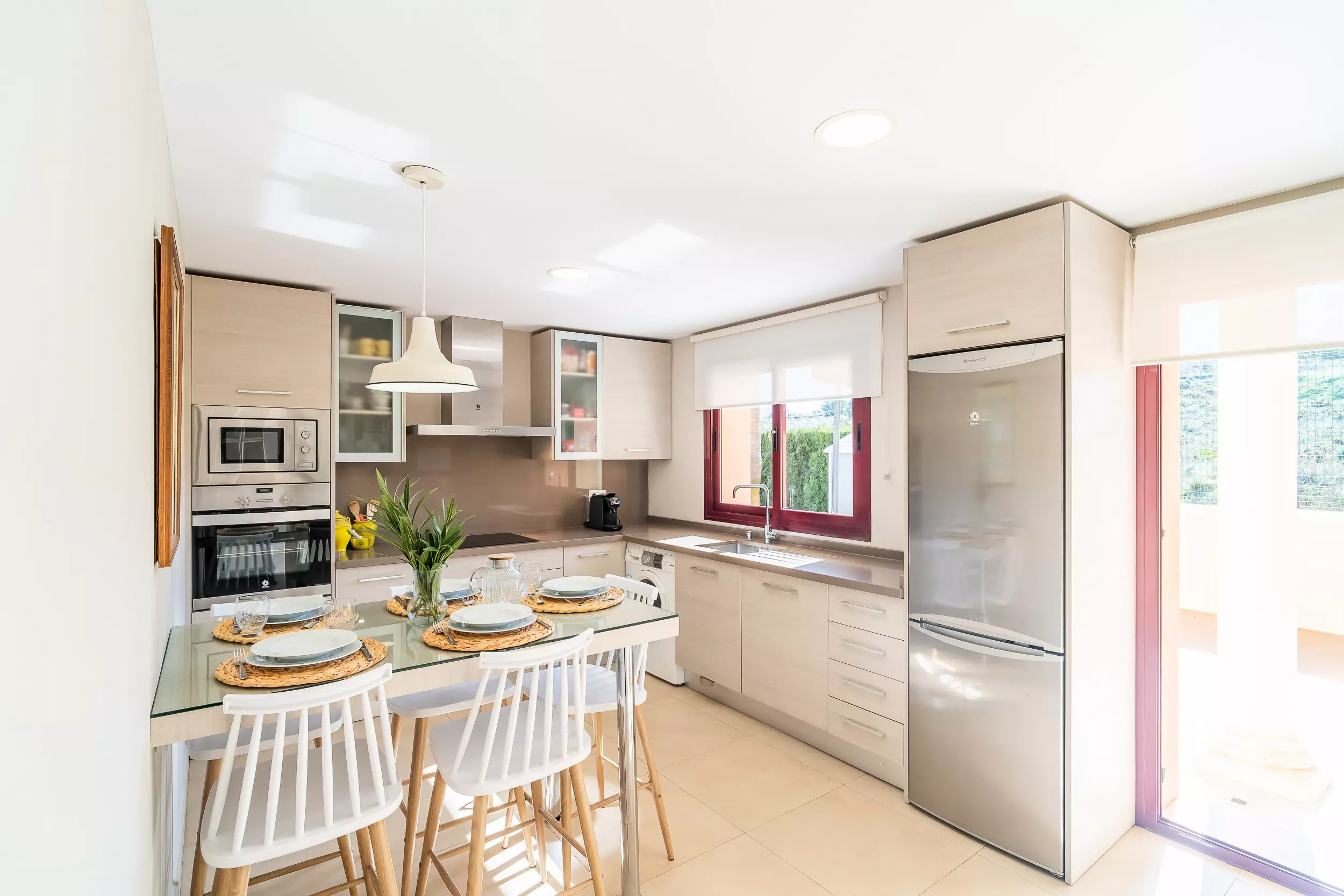 La cuisine indépendante, équipée avec une plaque à induction, un four, un lave-vaisselle, un micro-ondes et une machine à café Nespresso, est conçue pour des séjours prolongés ou des escapades en groupe. Elle dispose également d'une cheminée, d'un lave-linge, d'un balcon, d'un lit de bébé et d'une chaise haute sur demande.