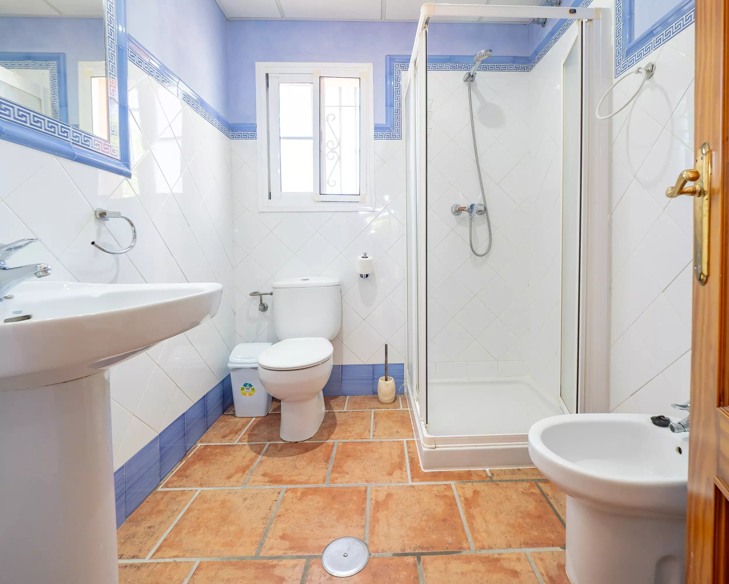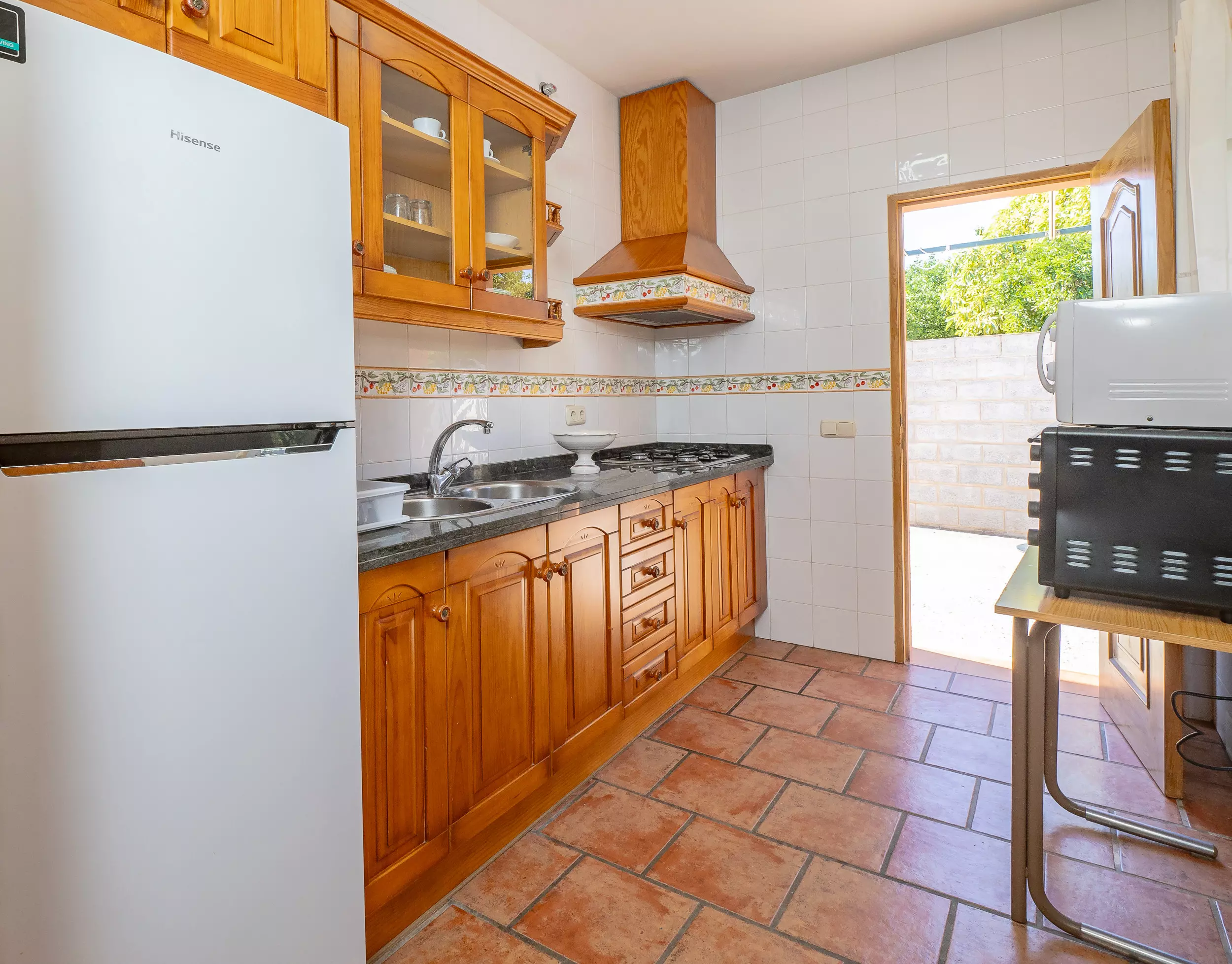 L'intérieur de la maison dispose de 3 chambres : deux avec des lits individuels et une avec un lit de couple, toutes avec des fenêtres donnant sur l'extérieur et des espaces pour ranger les bagages confortablement. La salle de bain commune dispose d'une douche. L'entrée principale mène à une cuisine indépendante et équipée, connectée à un grand salon-salle à manger qui donne accès à la terrasse avec du mobilier extérieur, créant un espace parfait pour vivre et profiter de l'environnement naturel.