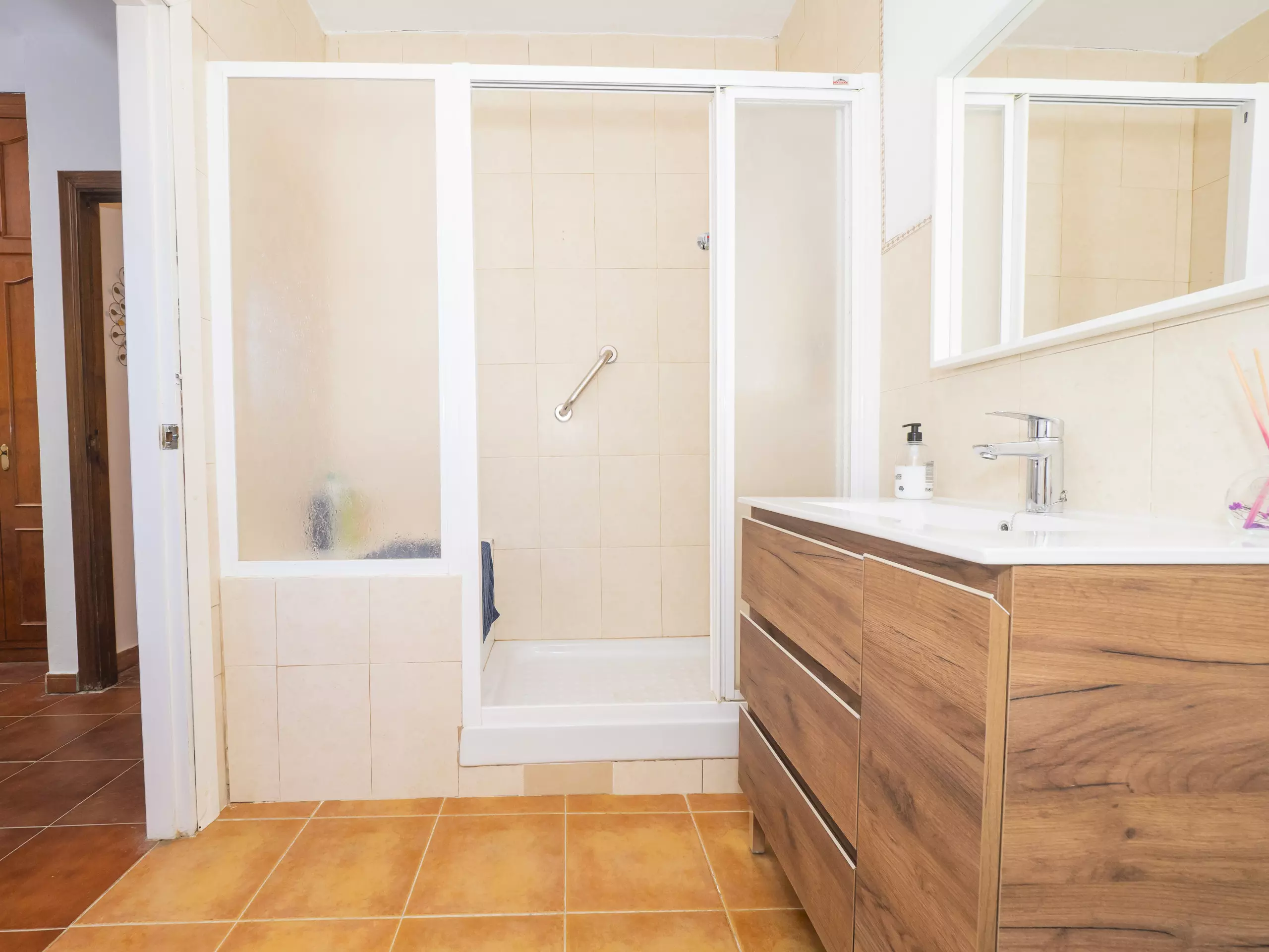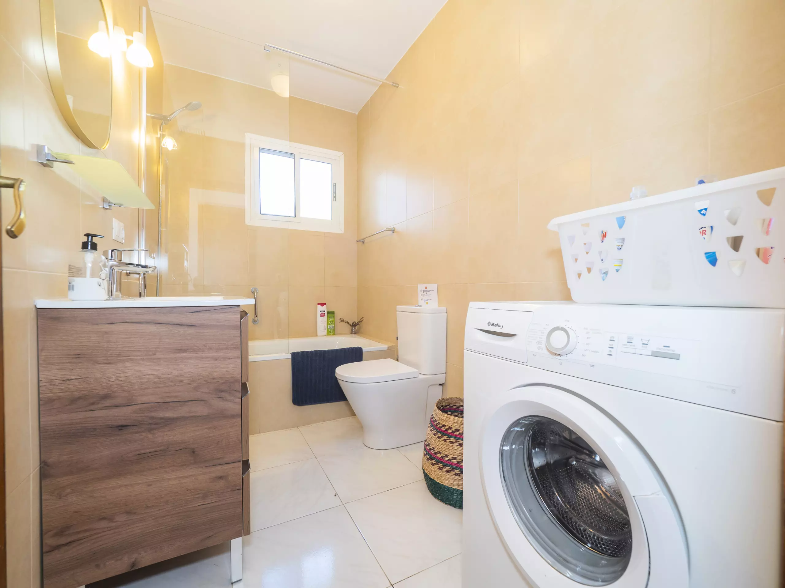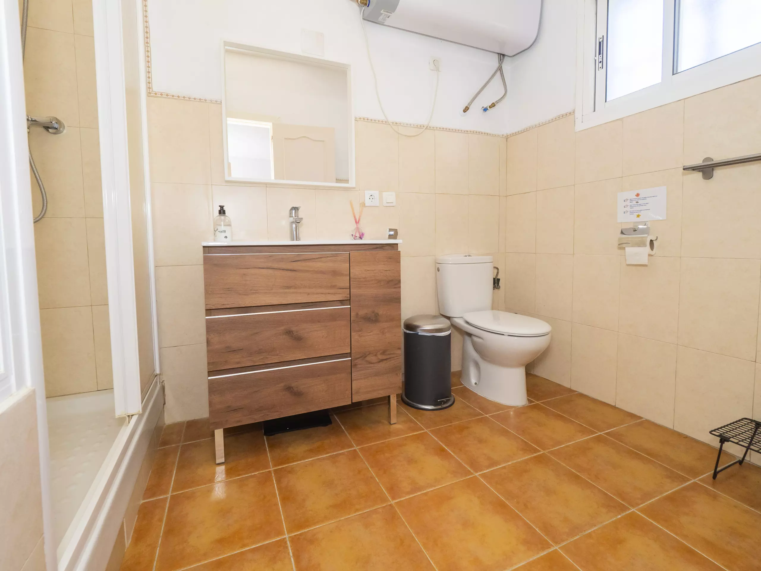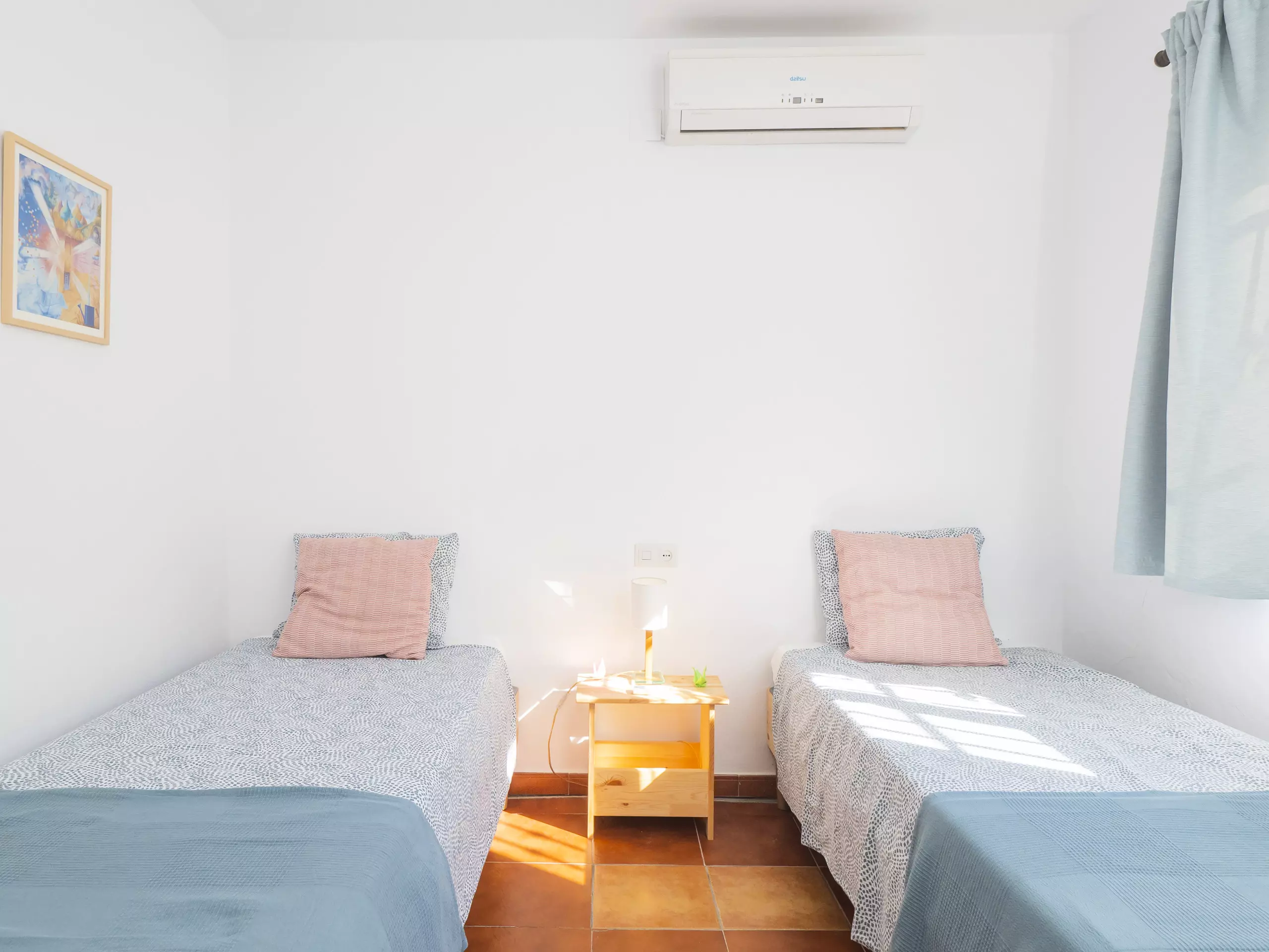 La maison dispose de deux chambres, toutes deux extérieures et offrant de l'espace pour ranger les bagages de manière organisée. L'une dispose d'un lit matrimonial et d'une salle de bain attenante avec une douche, tandis que la seconde propose deux lits individuels. Dans le couloir reliant les chambres se trouve une deuxième salle de bain, équipée également d'un lave-linge pour plus de commodité durant votre séjour. ??