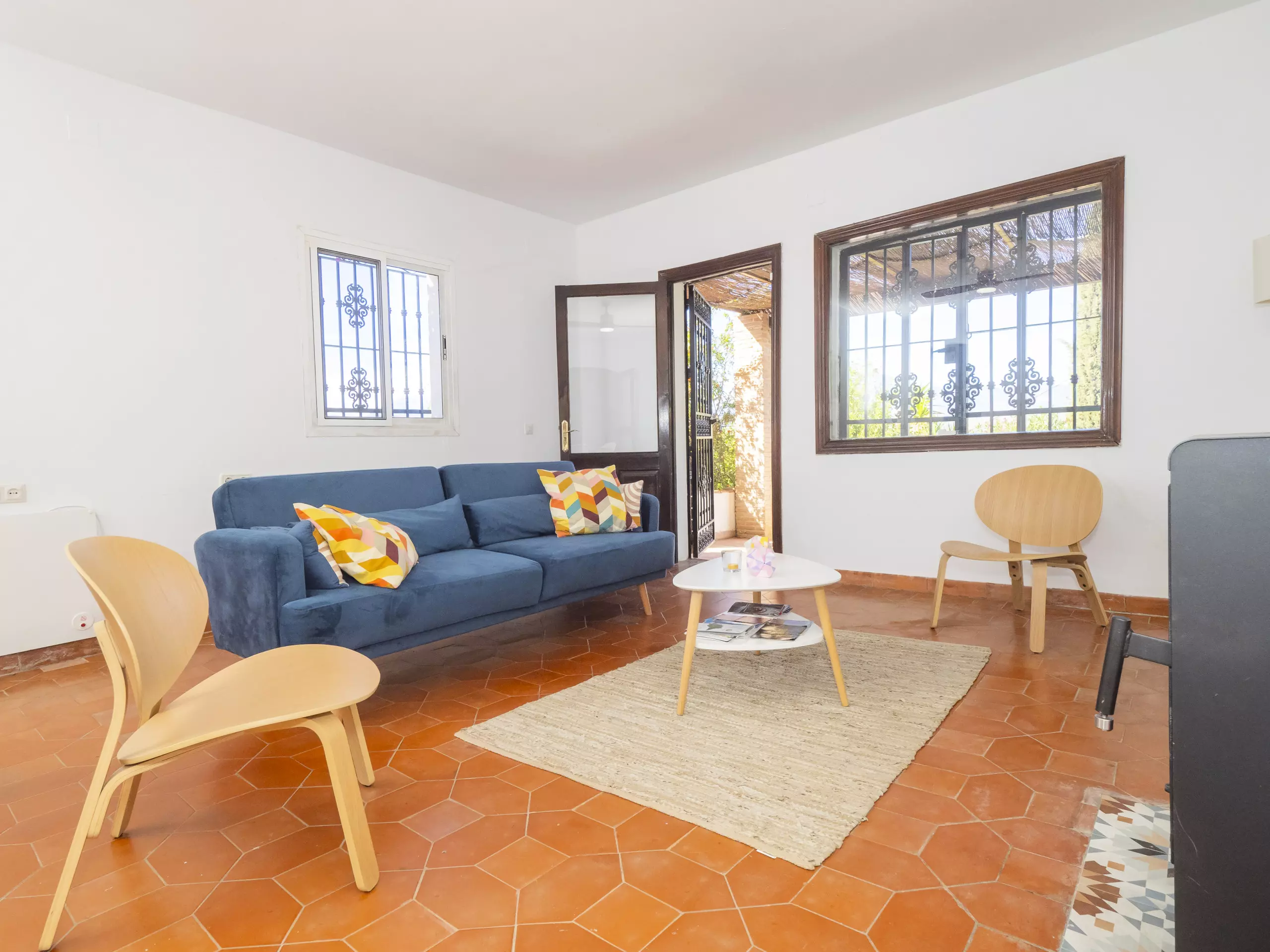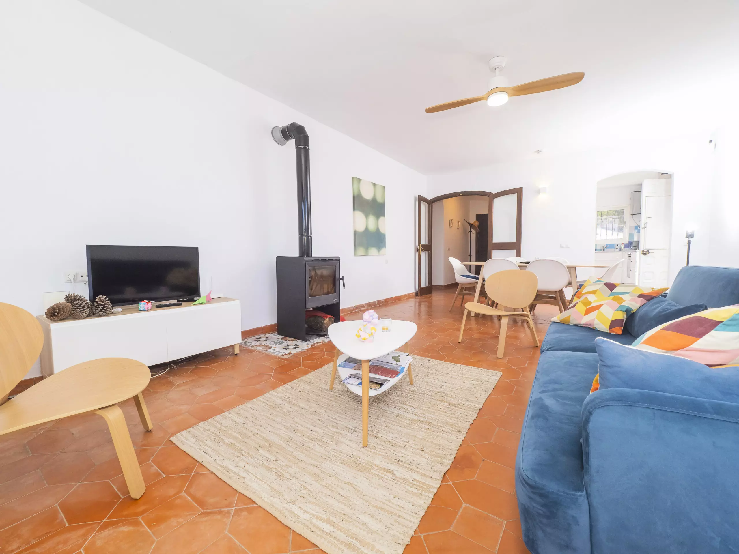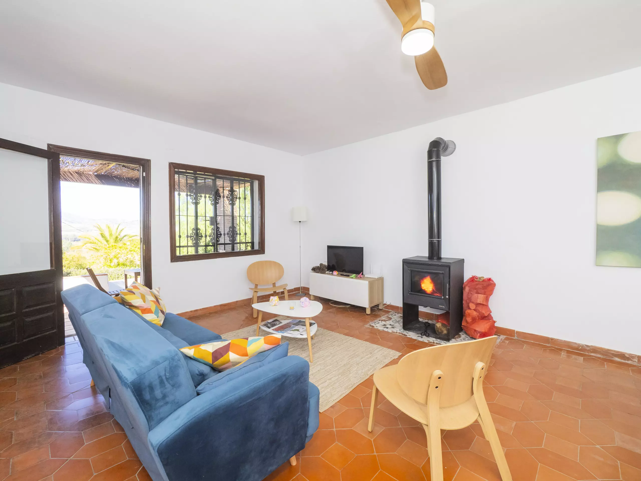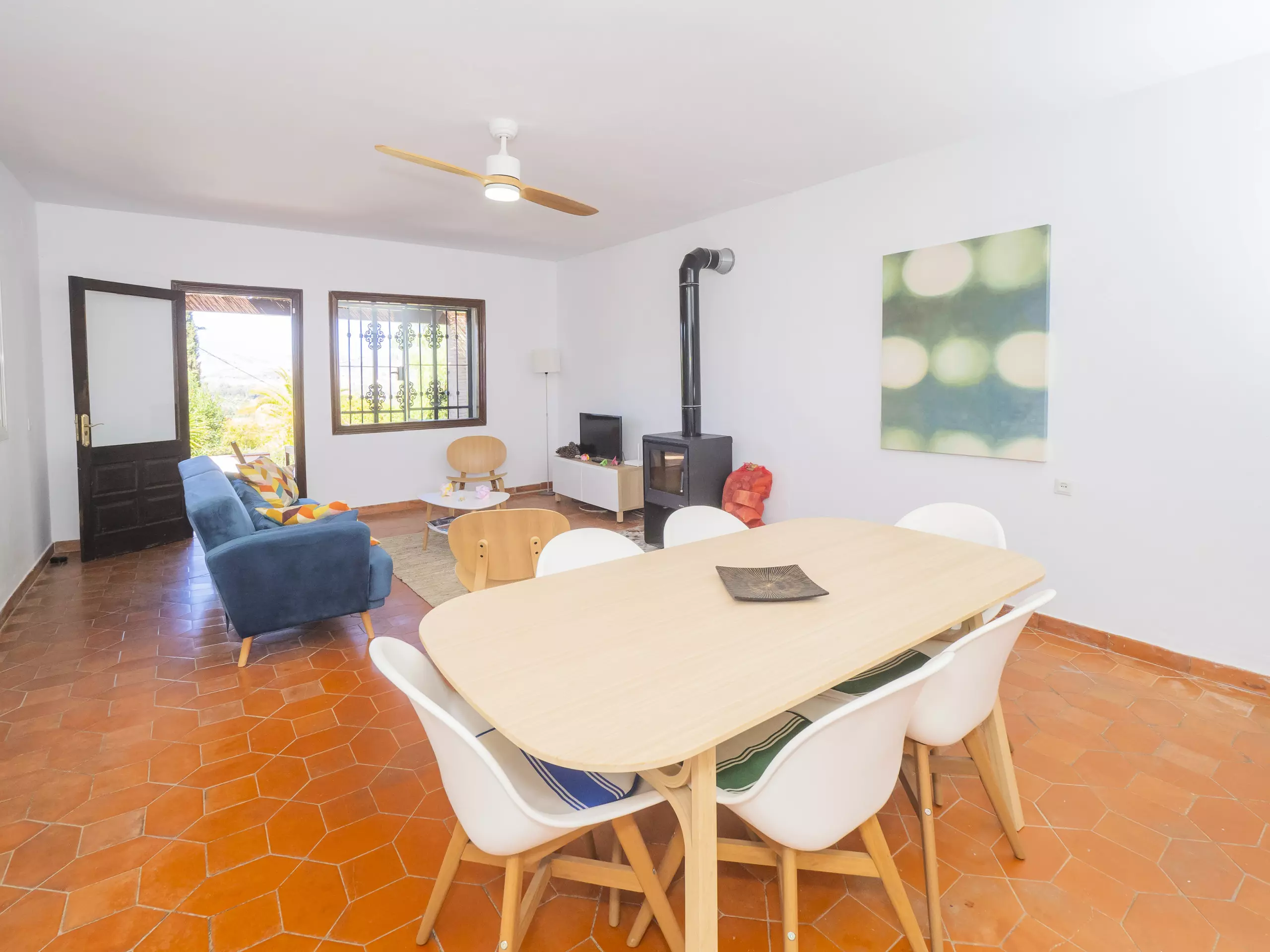 La salle à manger est un espace chaleureux où une cheminée en acier avec verre apporte de la chaleur pendant les périodes froides, parfaite pour de longues conversations ou regarder la télévision. Par temps chaud, un ventilateur de plafond offre une fraîcheur naturelle agréable. D'ici, vous aurez un accès direct à la terrasse couverte et au jardin. ???