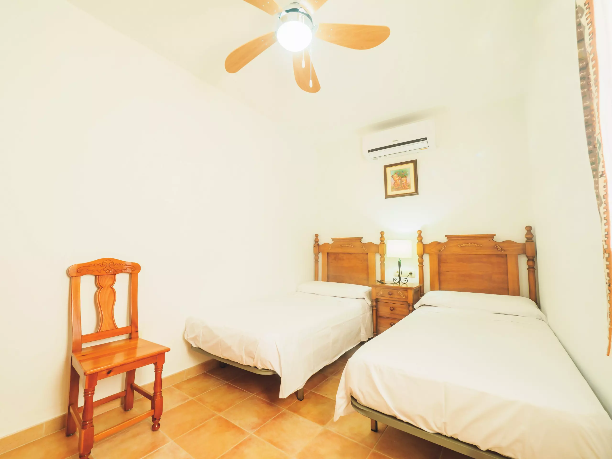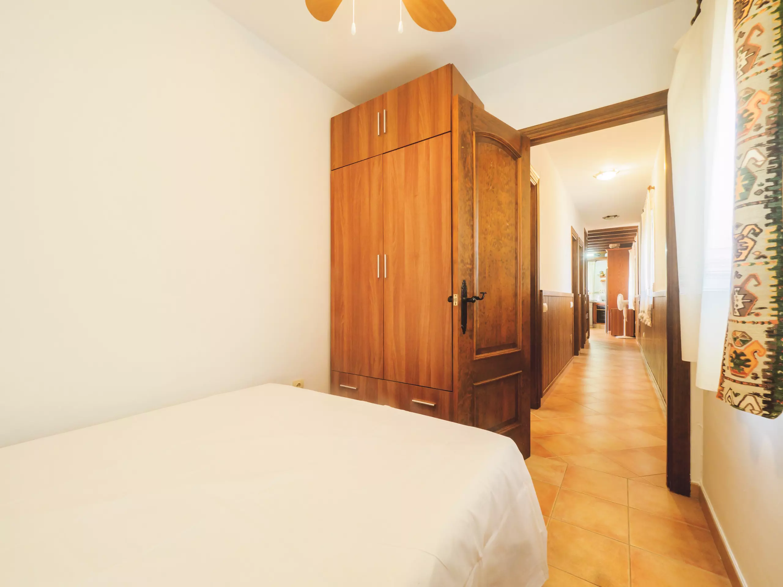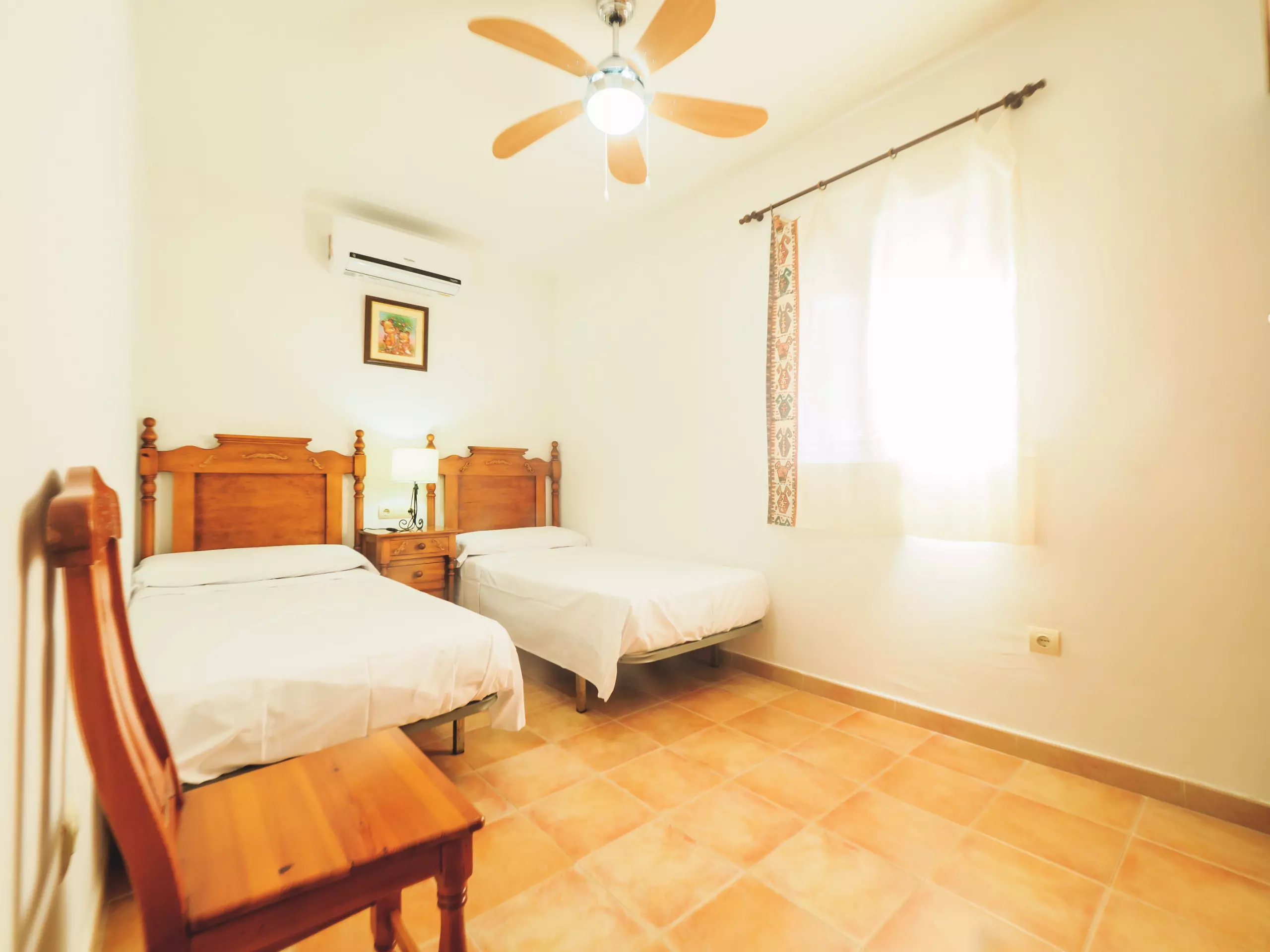 La distribution comprend trois chambres au rez-de-chaussée : une avec un lit matrimonial, une autre avec deux lits individuels et une troisième avec un lit individuel. Toutes sont équipées de la climatisation, d'une fenêtre extérieure et d'un espace pour ranger vos bagages de manière organisée. Une salle de bain complète à proximité complète l'espace de repos. De plus, en montant l'escalier depuis le salon, vous trouverez un espace semi-ouvert où les plus jeunes pourront se divertir et profiter de leur temps. ??