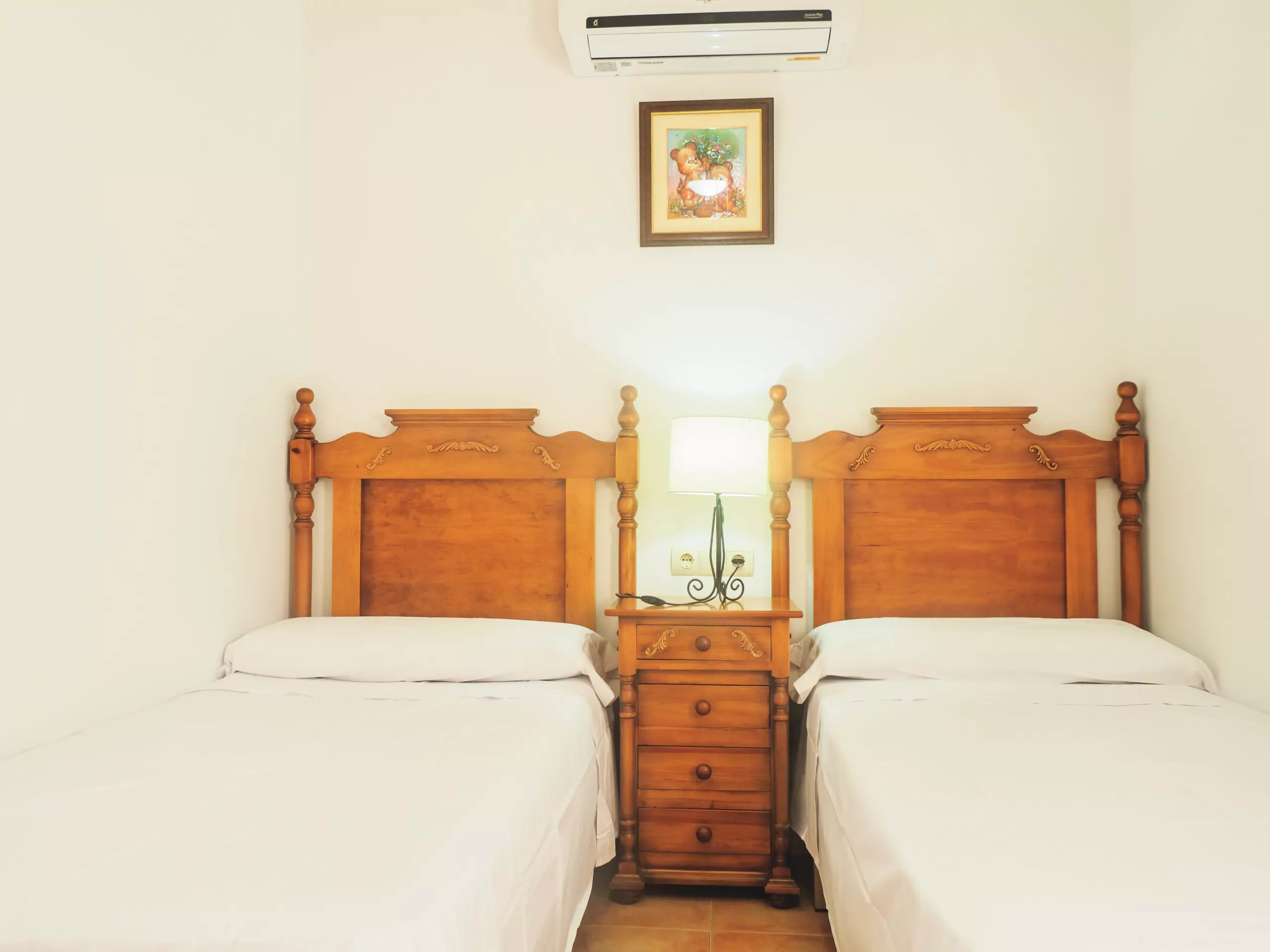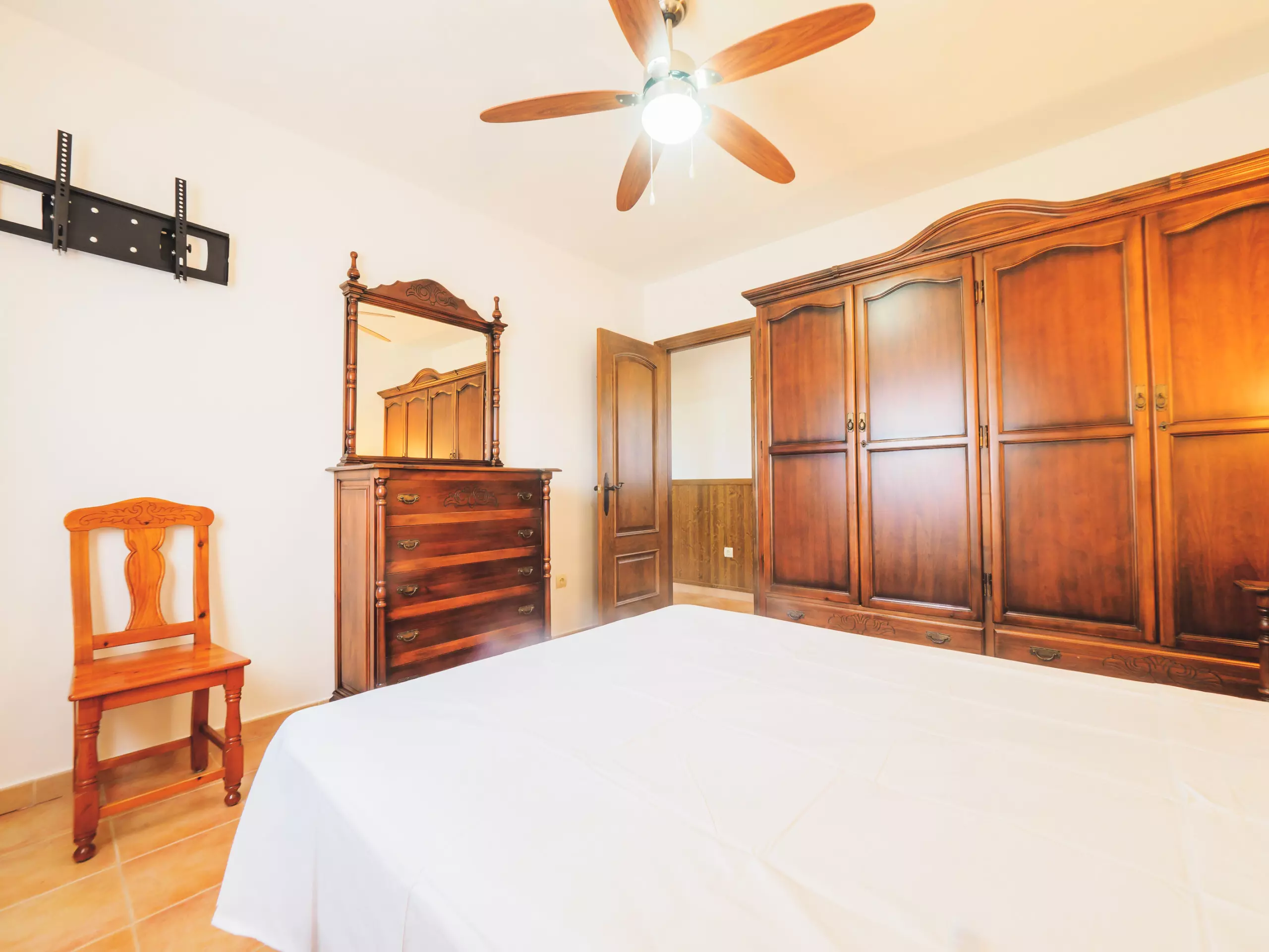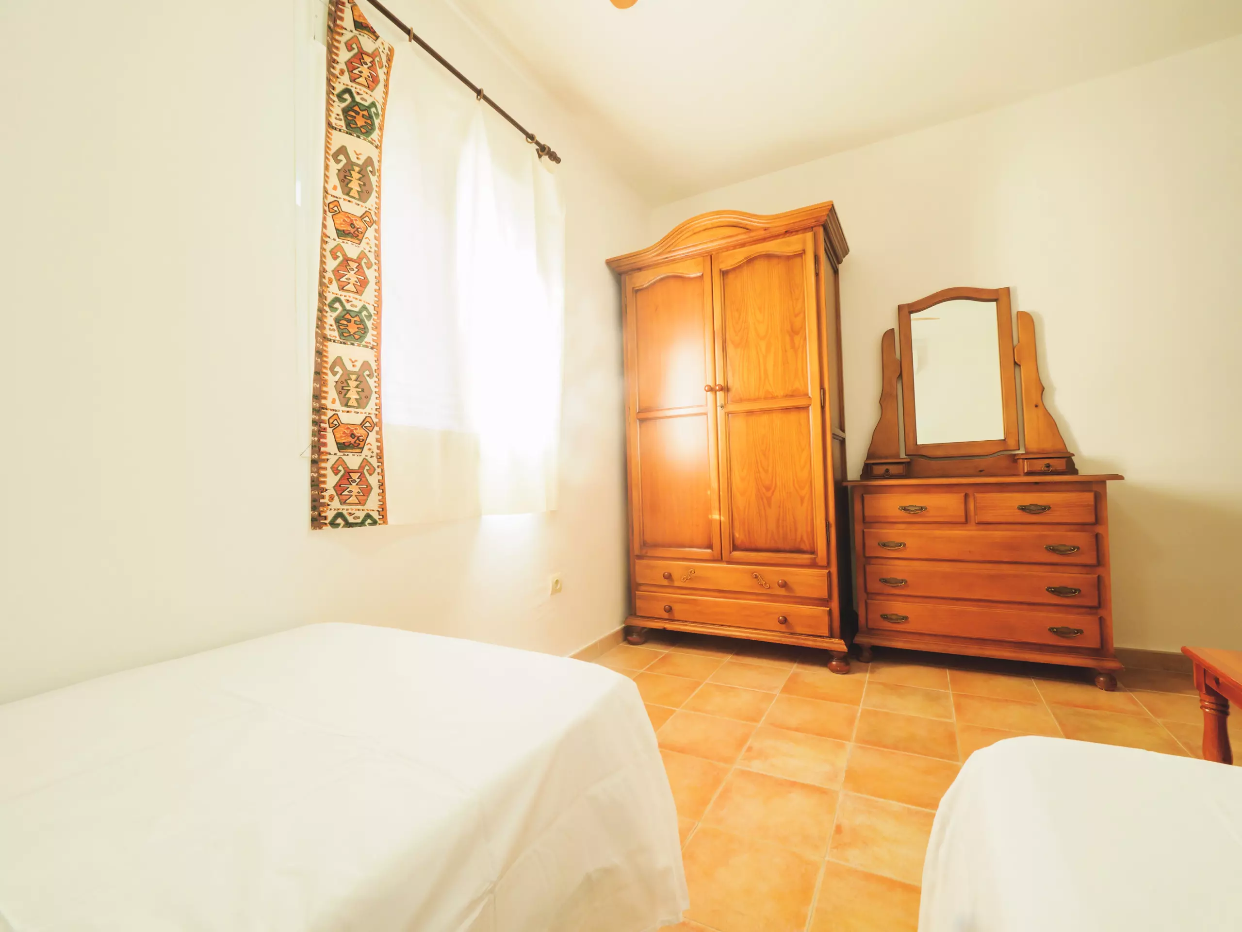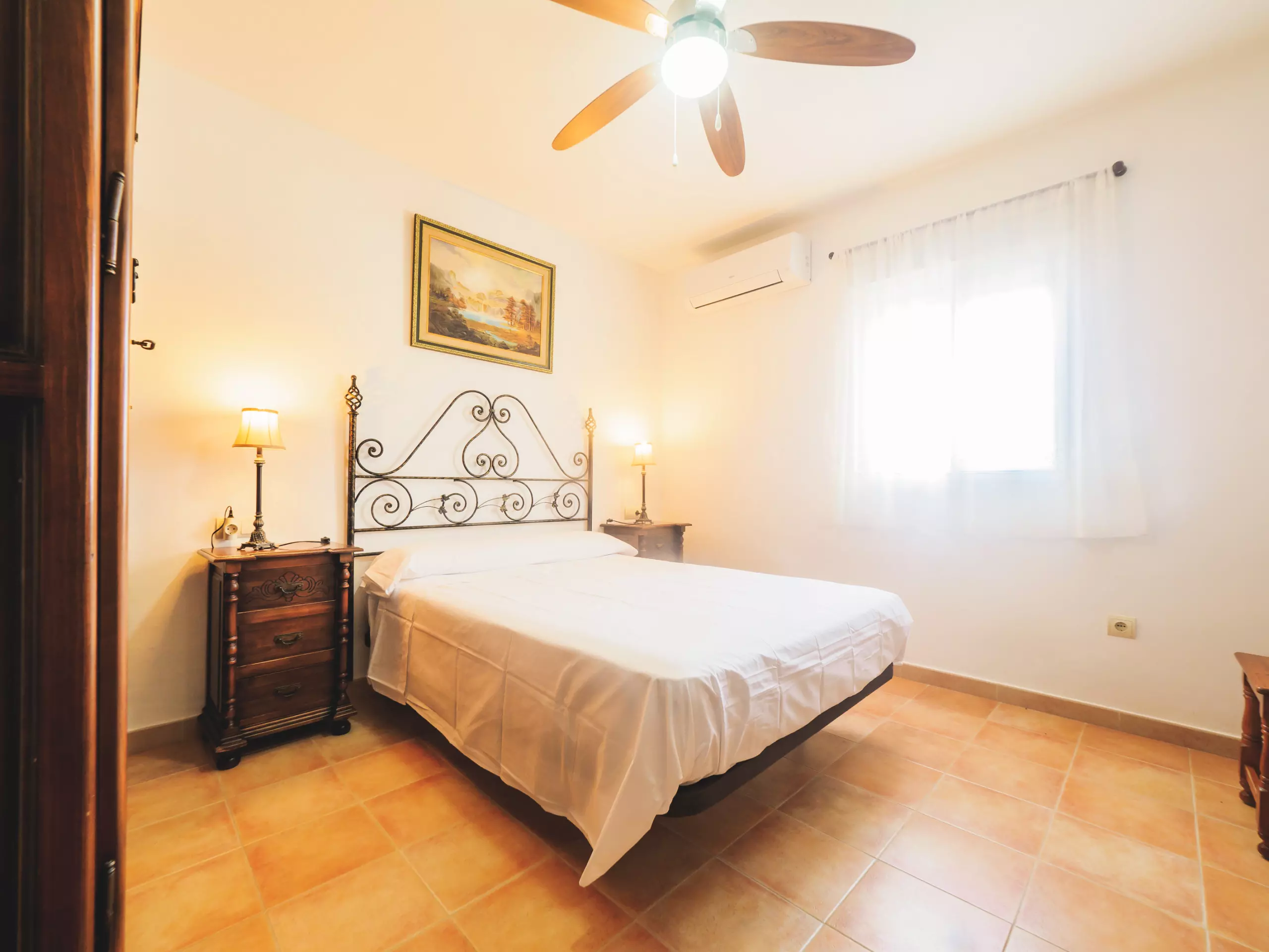 La distribution comprend trois chambres au rez-de-chaussée : une avec un lit matrimonial, une autre avec deux lits individuels et une troisième avec un lit individuel. Toutes sont équipées de la climatisation, d'une fenêtre extérieure et d'un espace pour ranger vos bagages de manière organisée. Une salle de bain complète à proximité complète l'espace de repos. De plus, en montant l'escalier depuis le salon, vous trouverez un espace semi-ouvert où les plus jeunes pourront se divertir et profiter de leur temps. ??