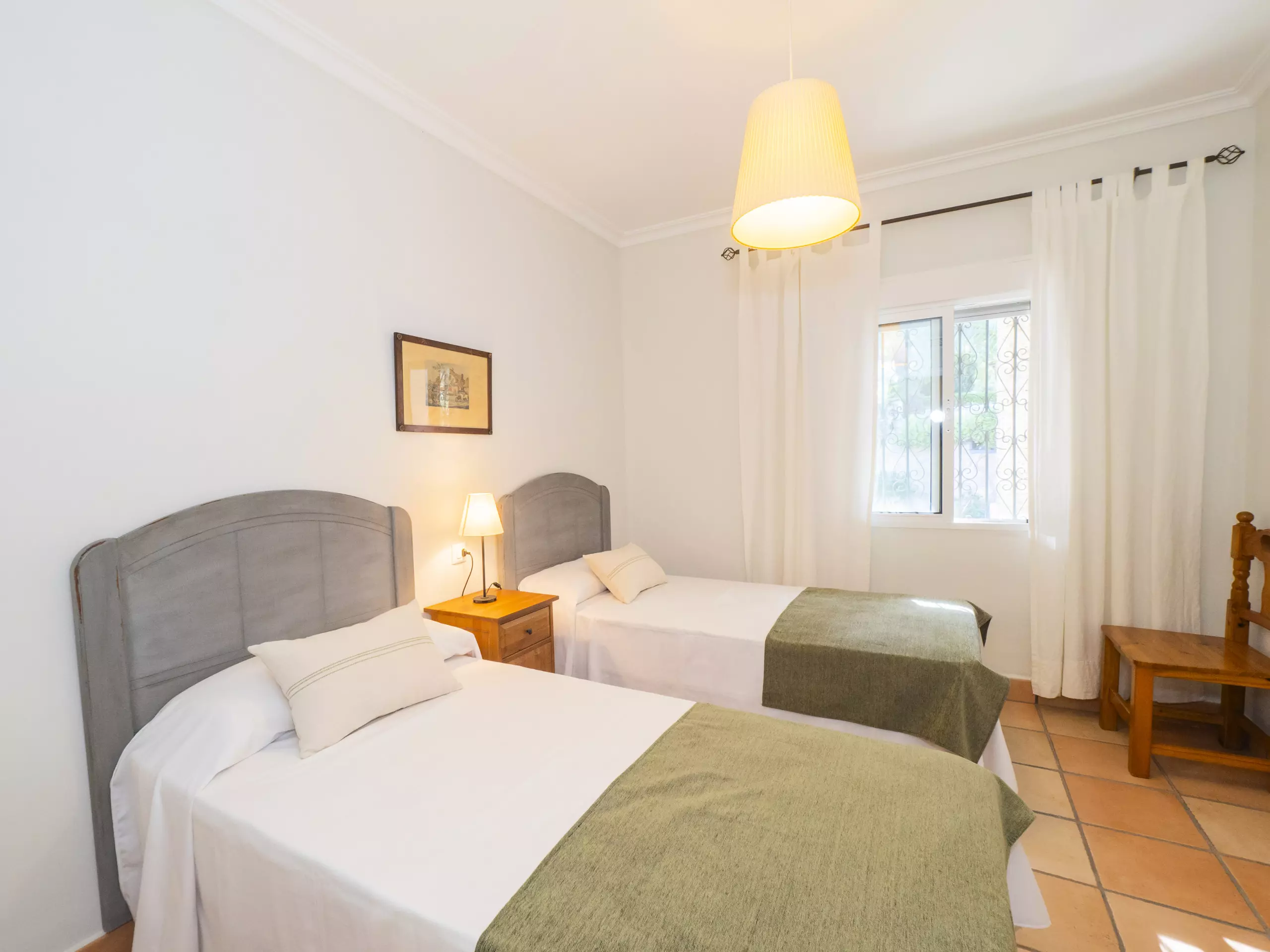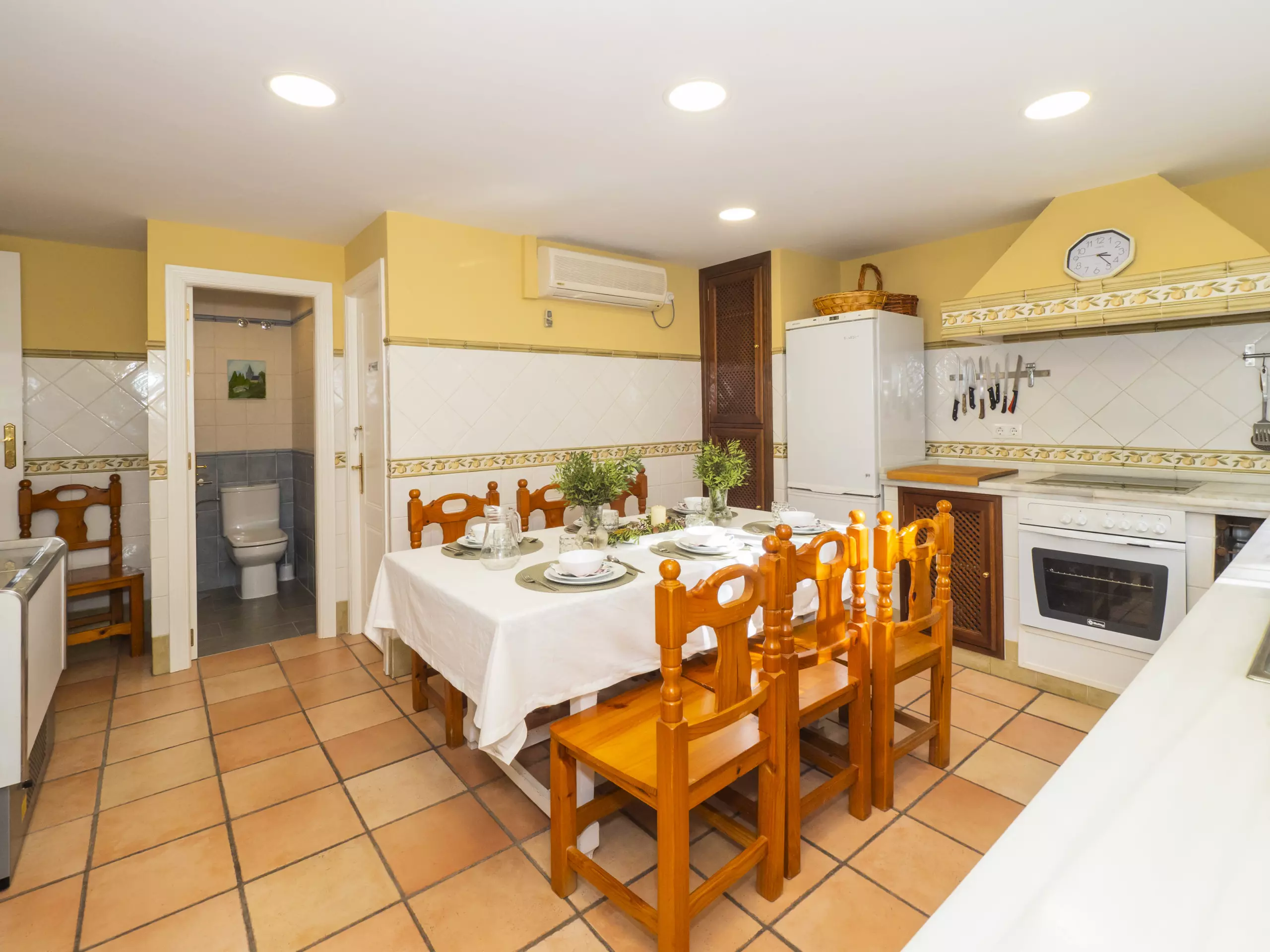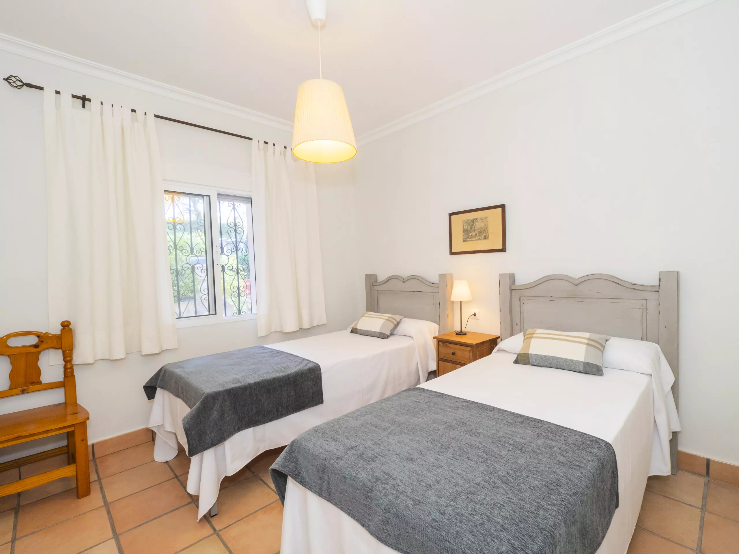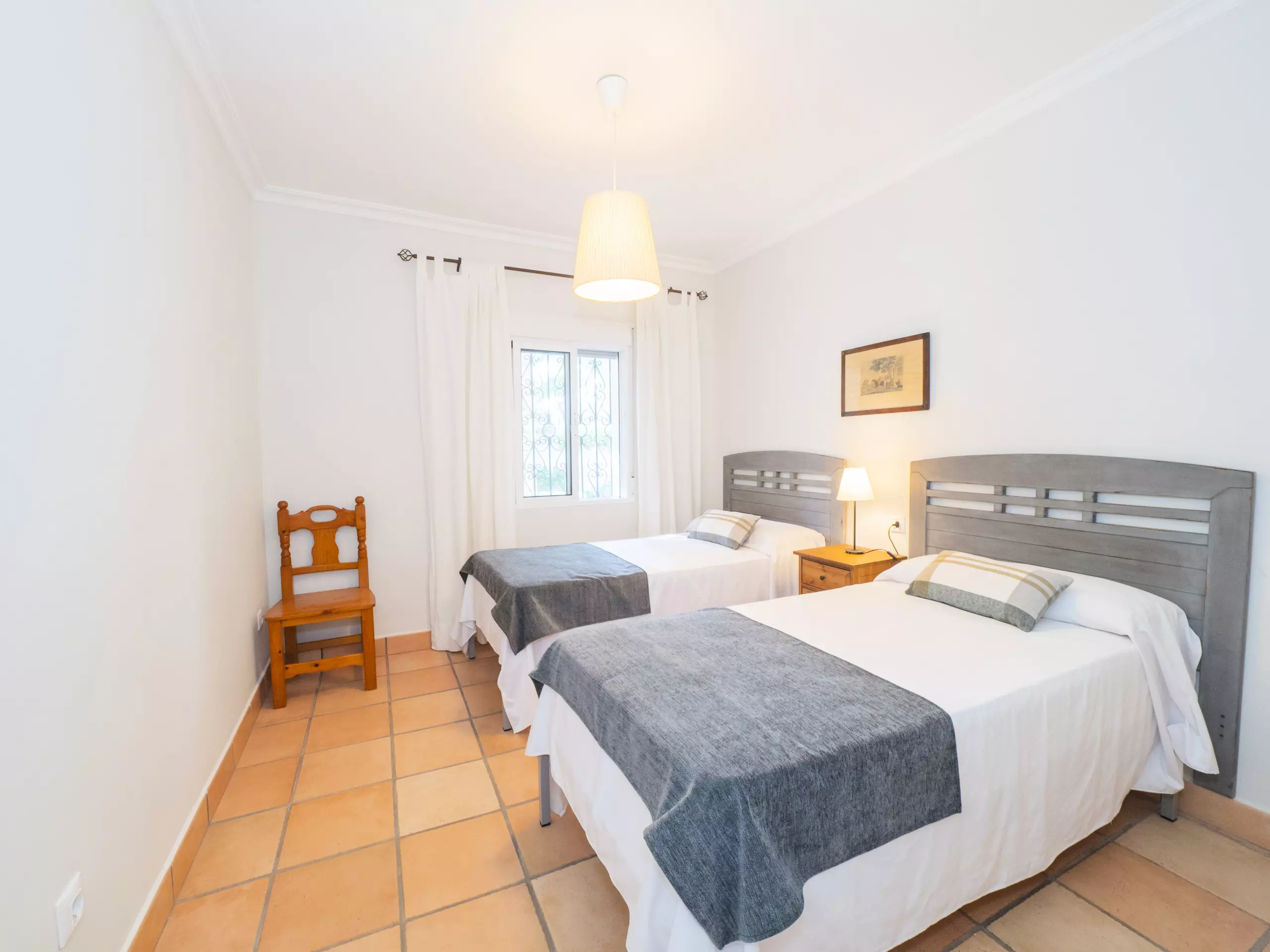 L'intérieur est confortable et fonctionnel, avec 194 m² répartis sur un seul niveau pour faciliter la mobilité. Vous trouverez cinq chambres avec des lits individuels, spacieuses et lumineuses, qui garantissent un repos pour tous. Il y a trois salles de bains, une près de la cuisine avec un receveur de douche, et deux autres accessibles depuis la zone des chambres.