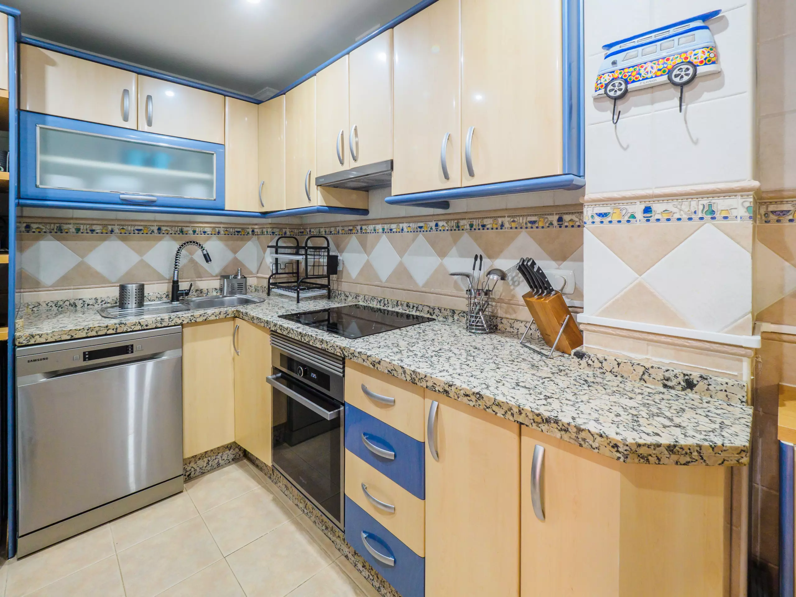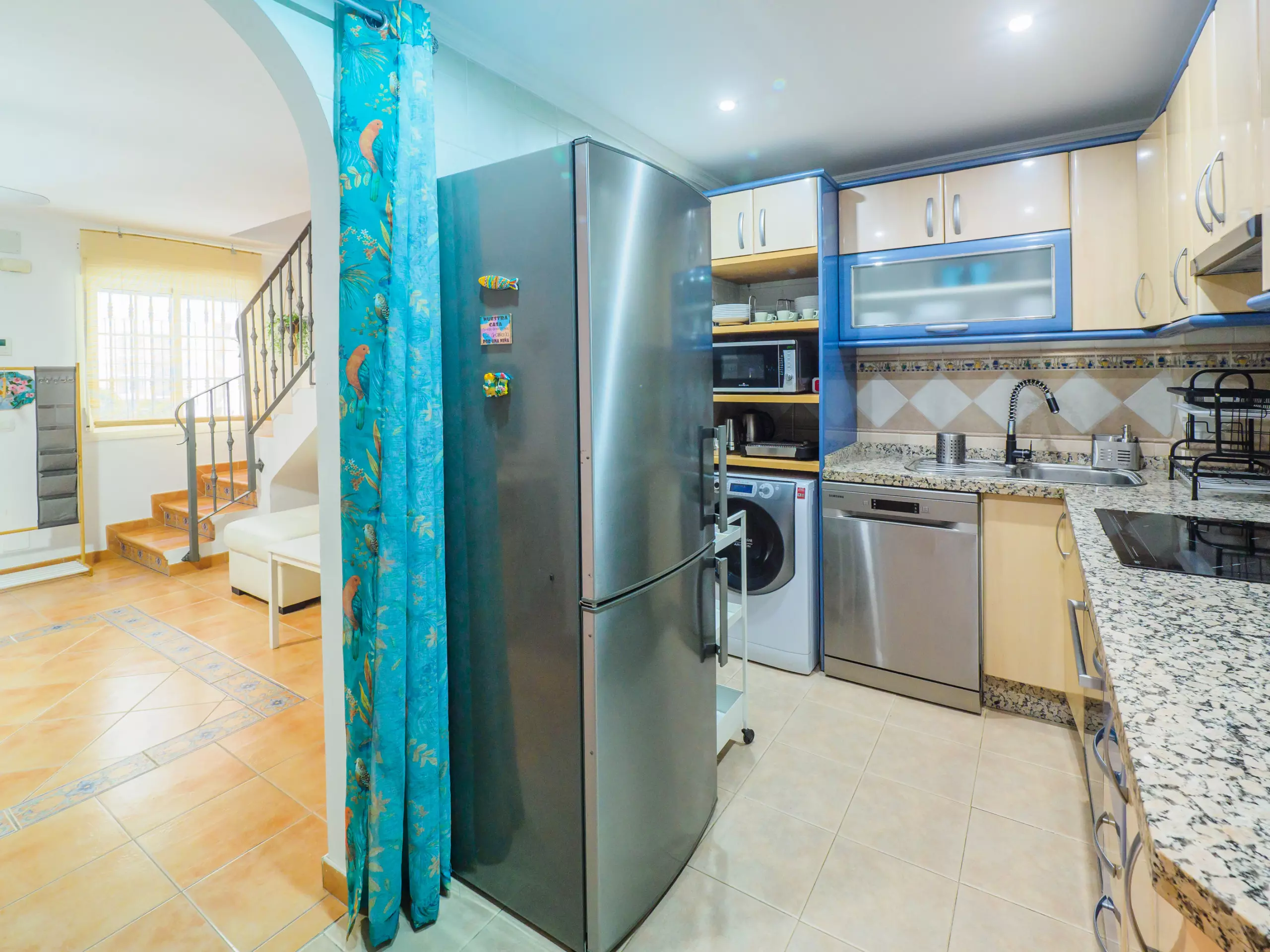 * Cuisine entièrement équipée avec des appareils électroménagers modernes et une petite cour intérieure avec toilettes.